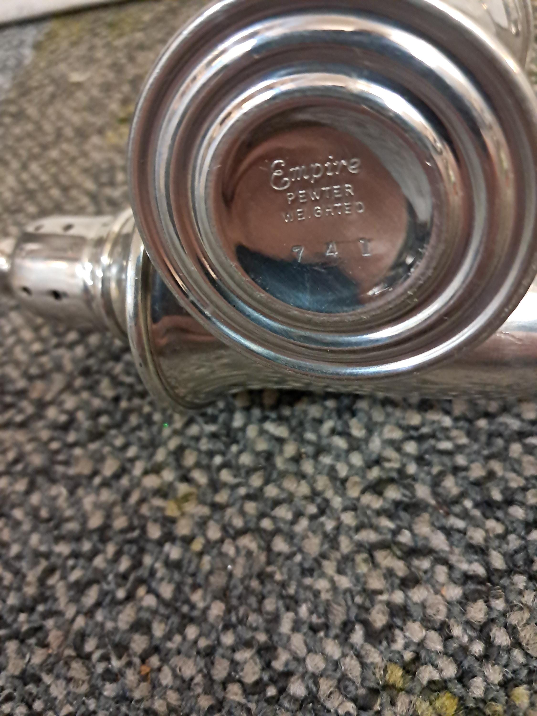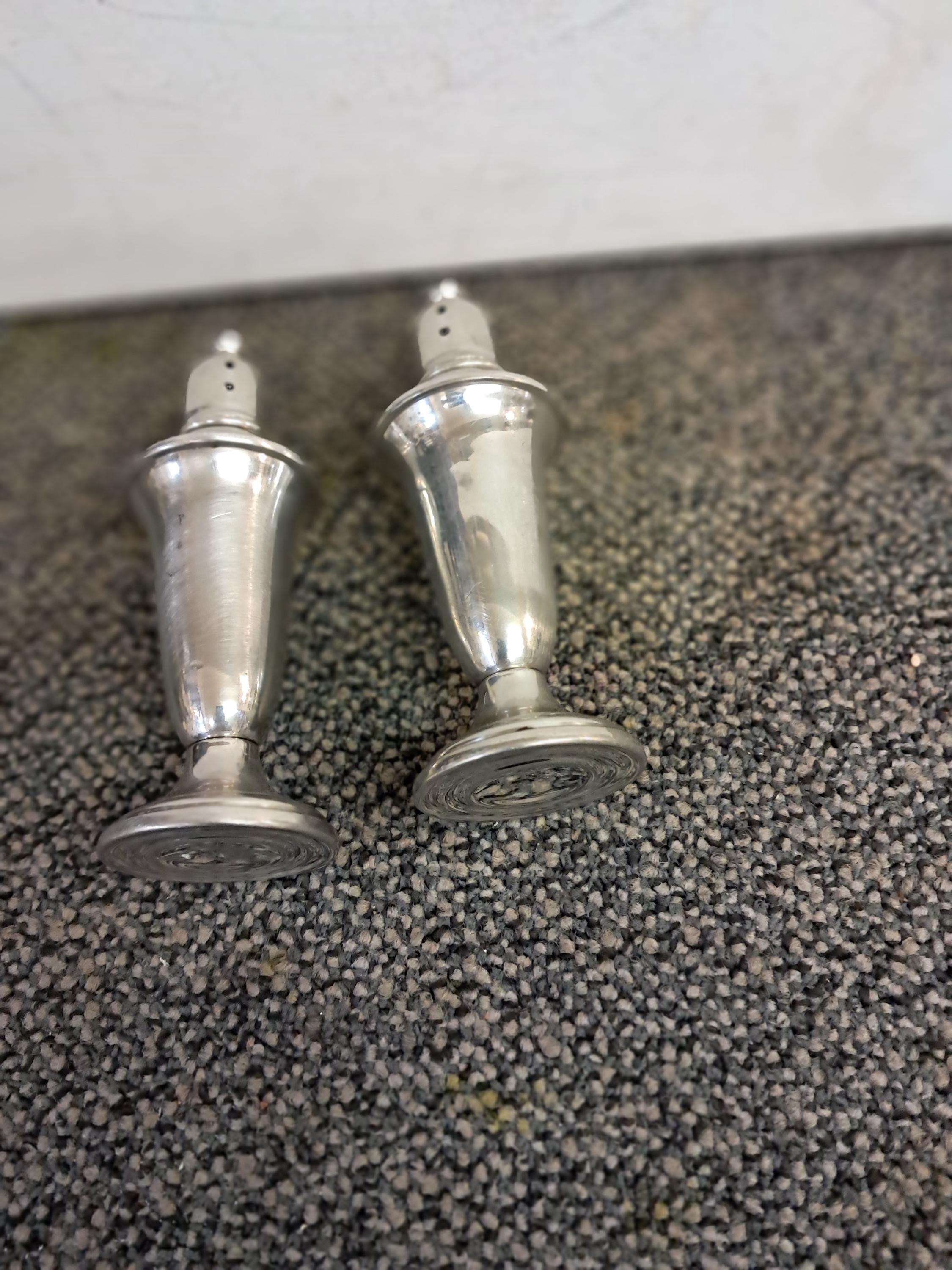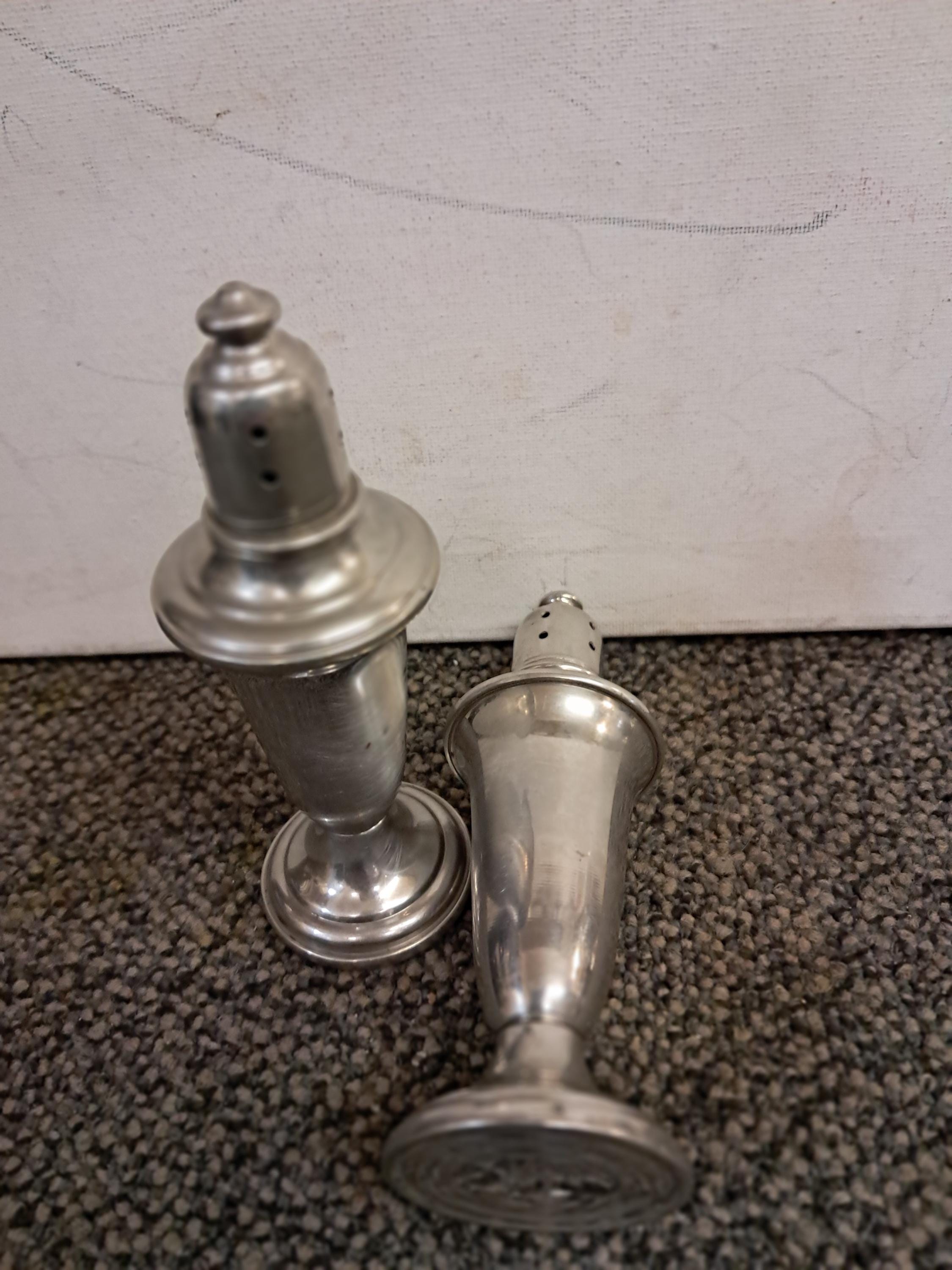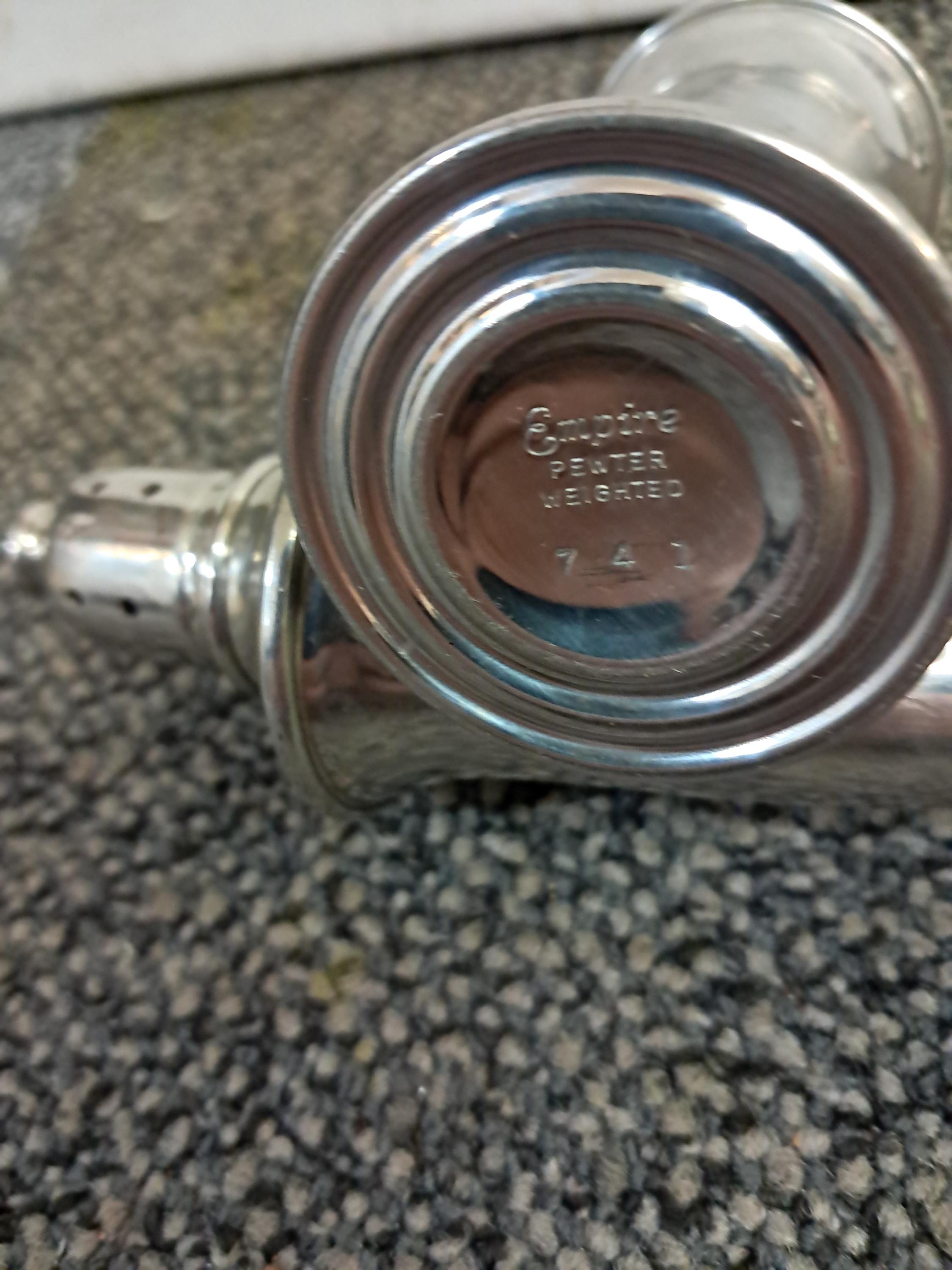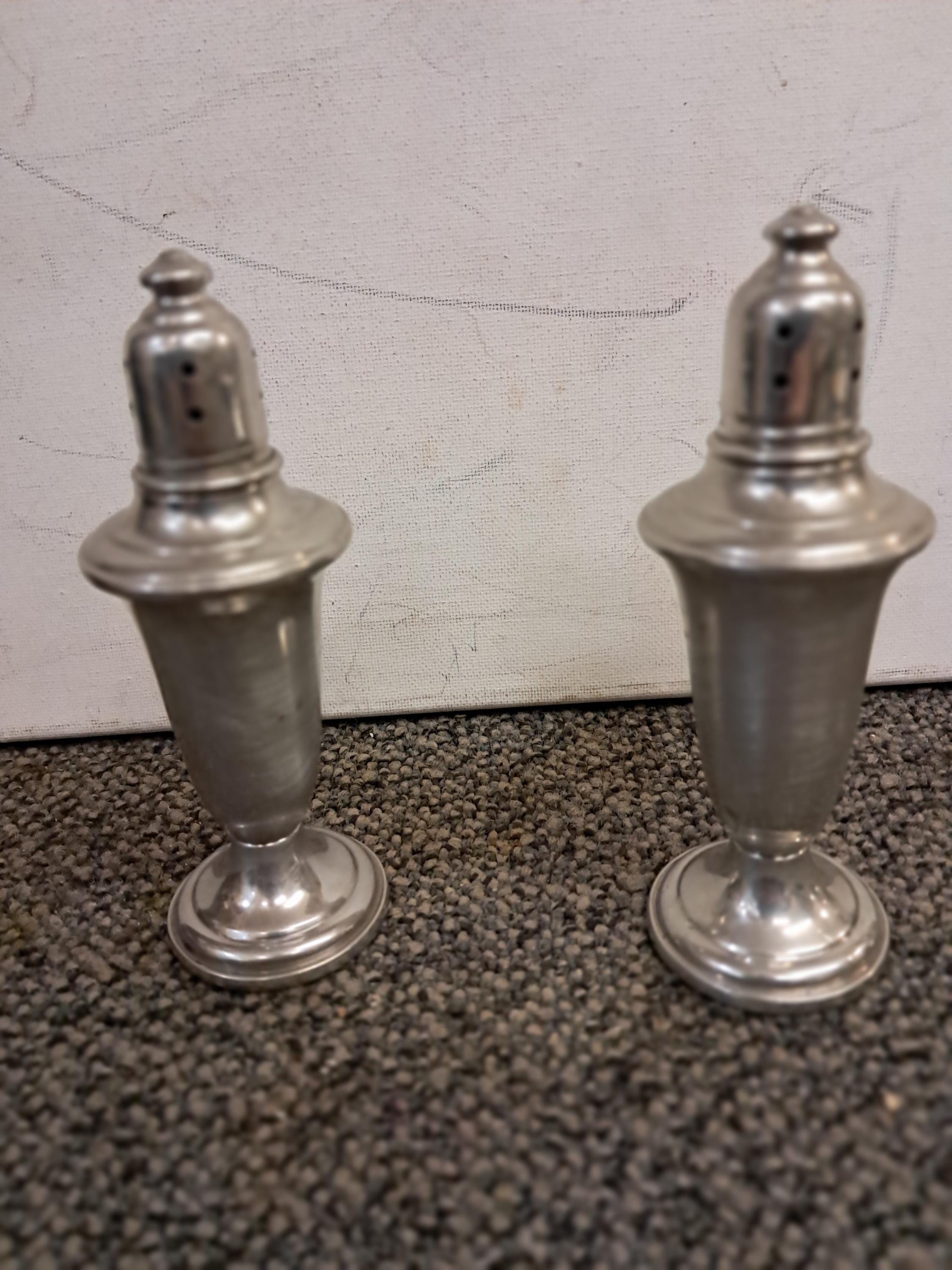 Empire Polished Pewter Weighted Glass Lined Footed Salt and Pepper Set5" tall x 1.75" wide x 1.75" baseExcellent Condition. Never Used, very clean