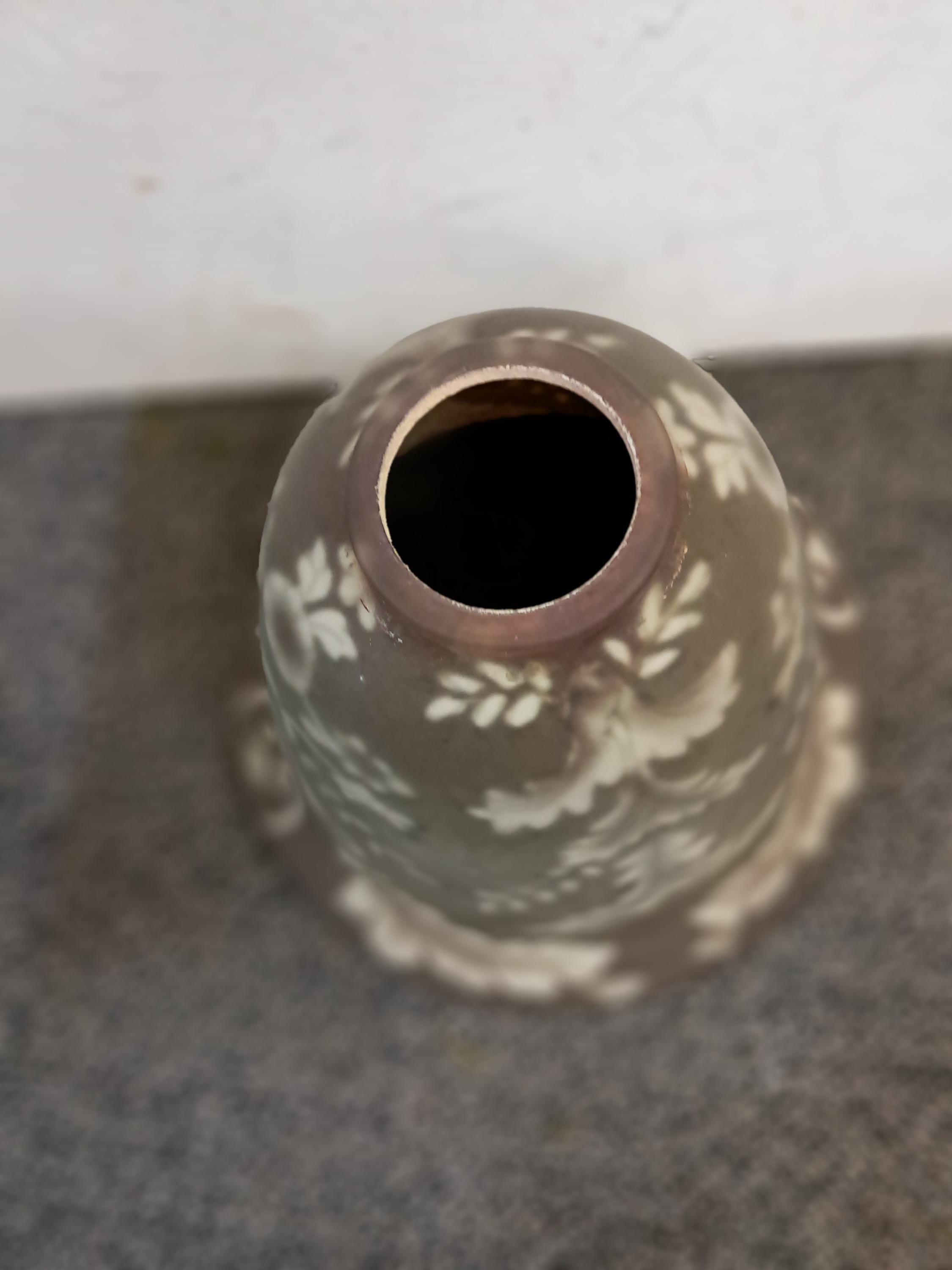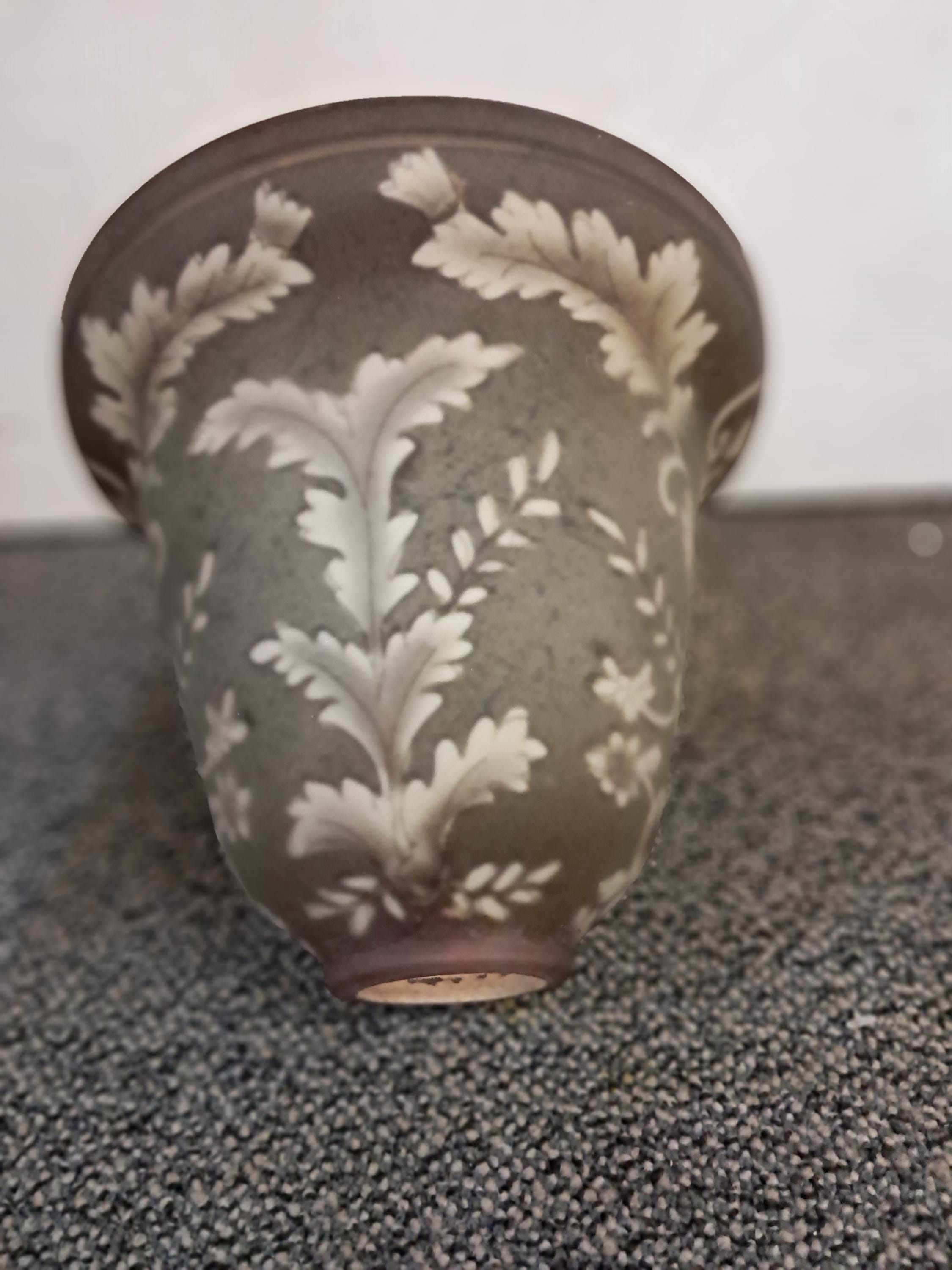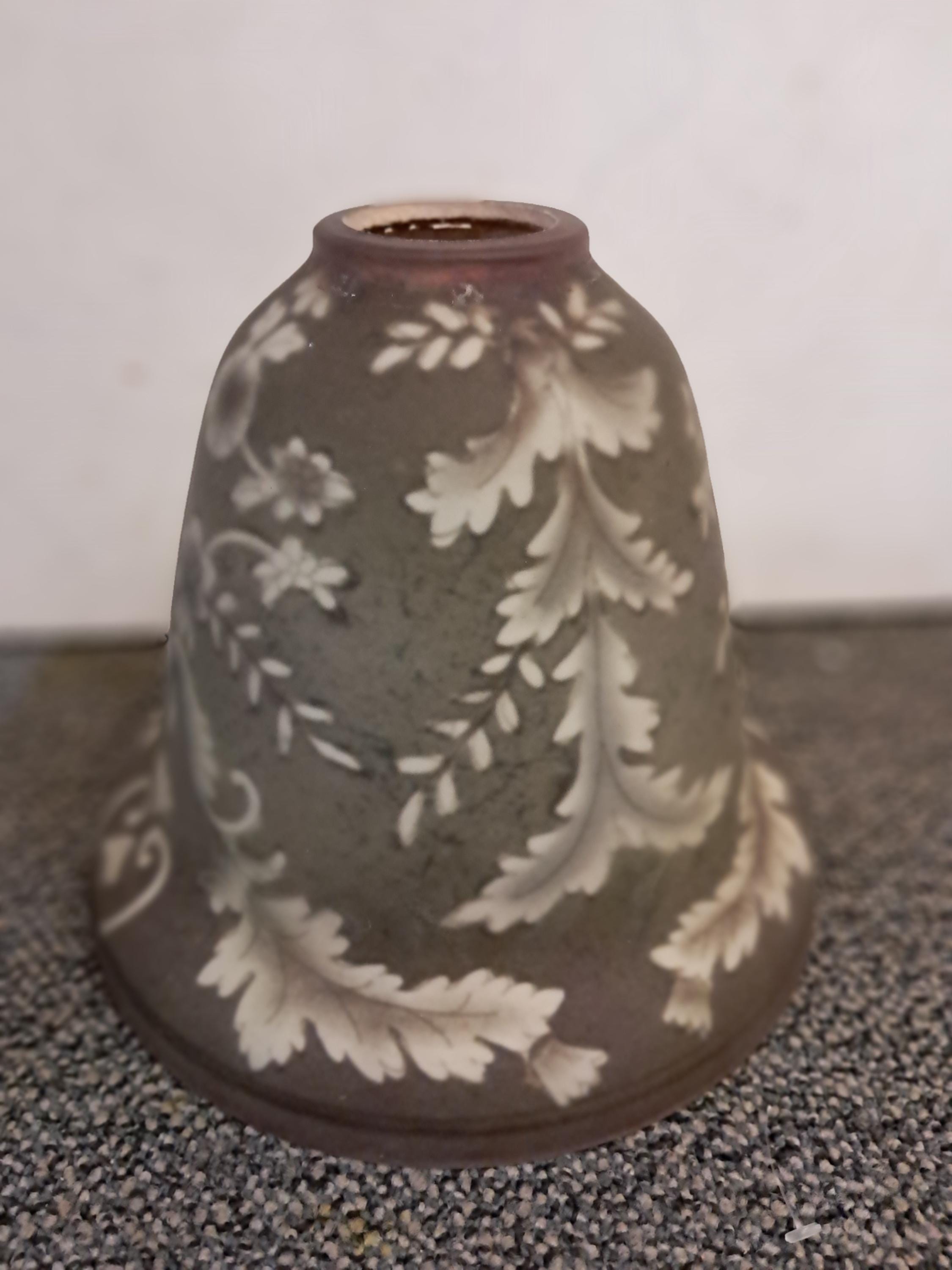 This sweet little blown glass shade has an all-over frosted Gray Background with white leaf design. A classic design from the Victorian through Edwardian periods.
