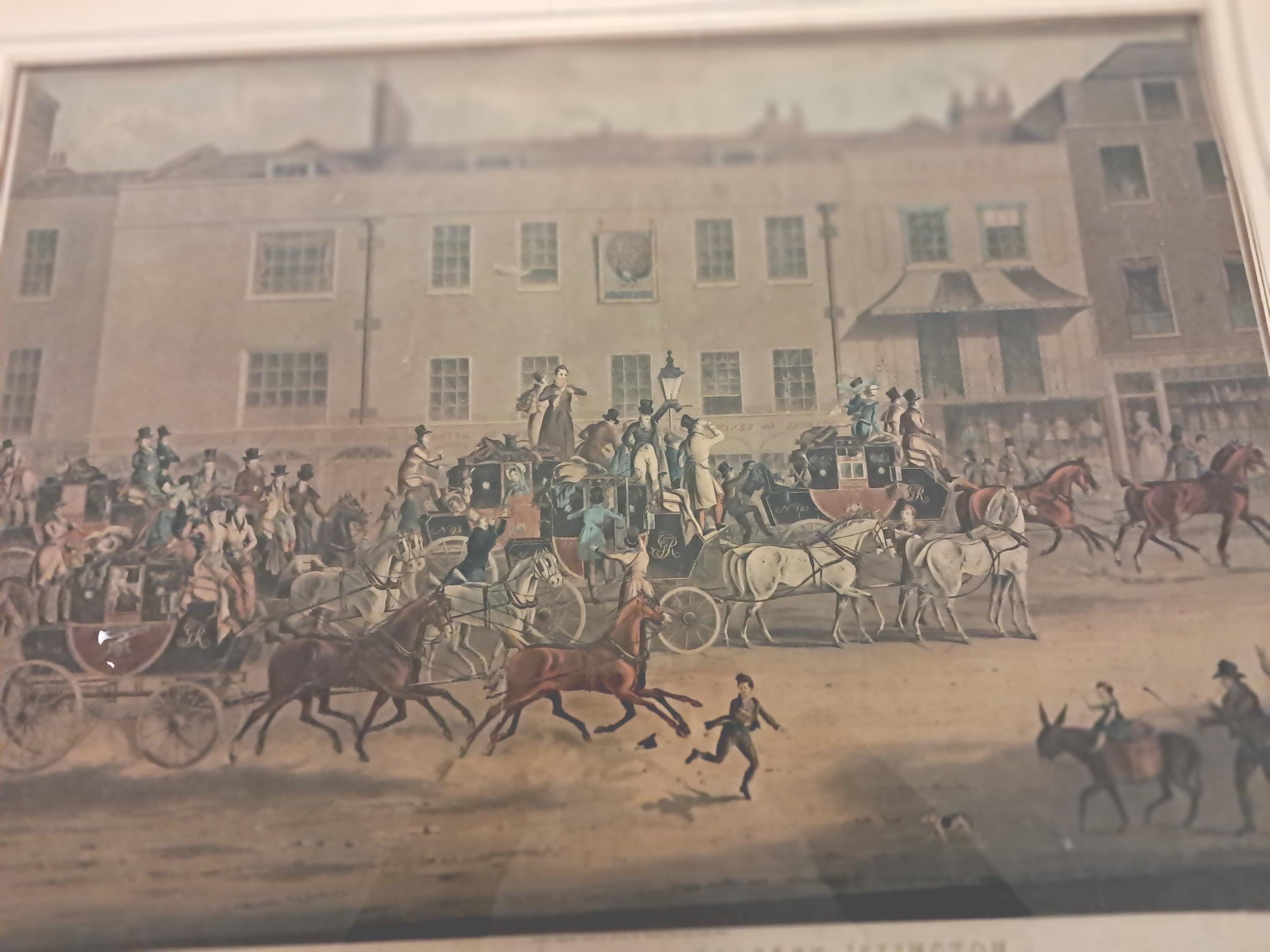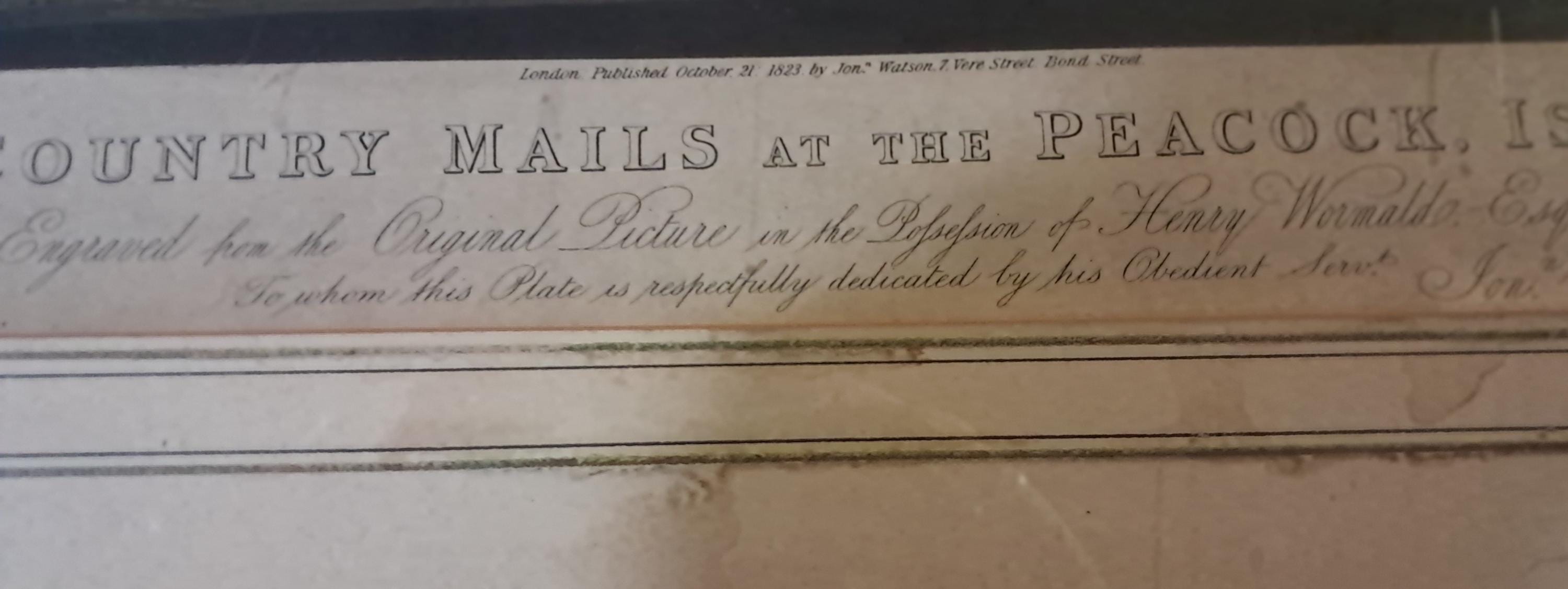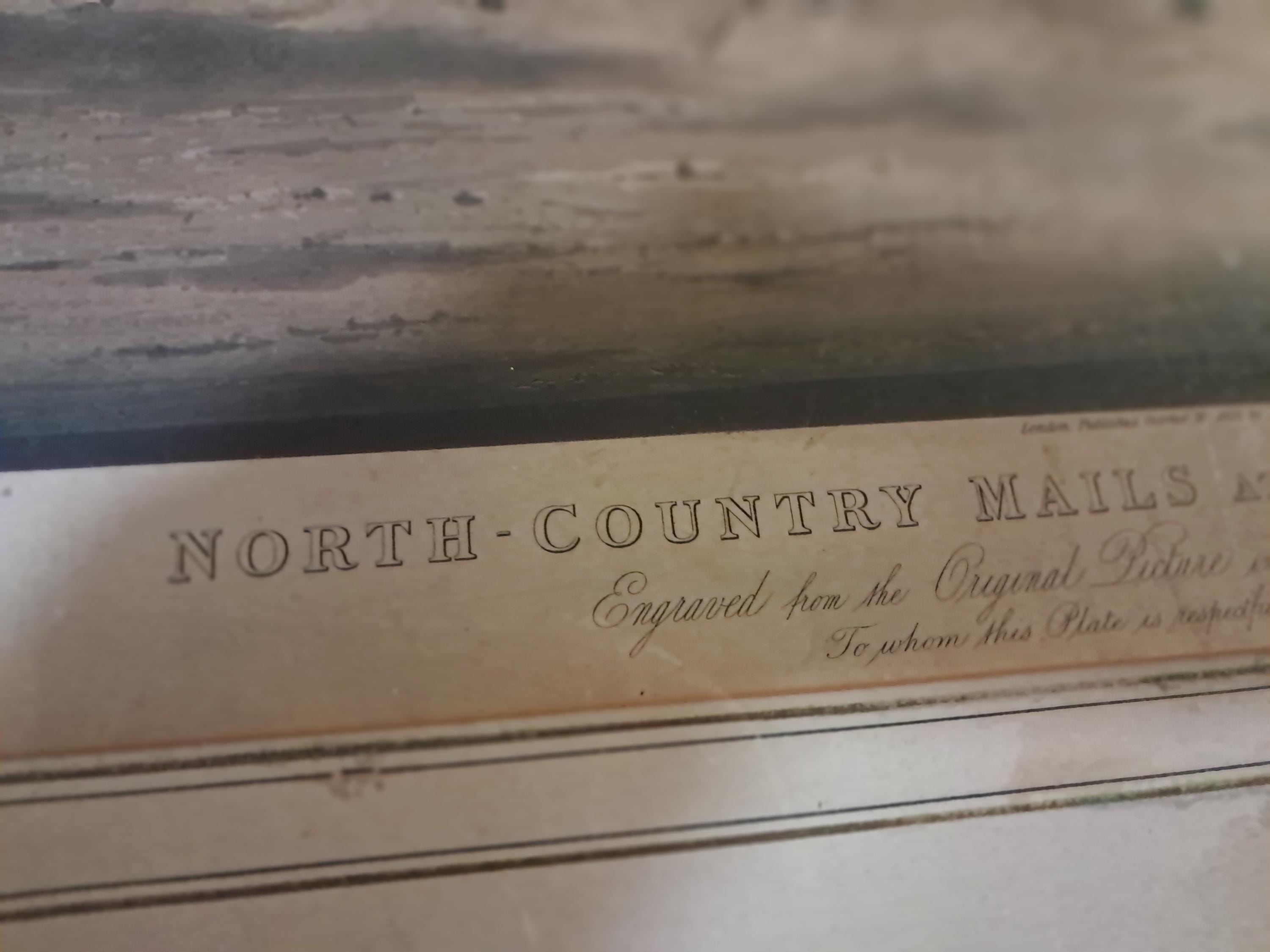 Fabulous RARE Antique Original English Engraving Lithograph , Artist James Pollard from Mail Series " North Country Mails at The Peacock , Islington " Framed and Purchased at Estate Sale