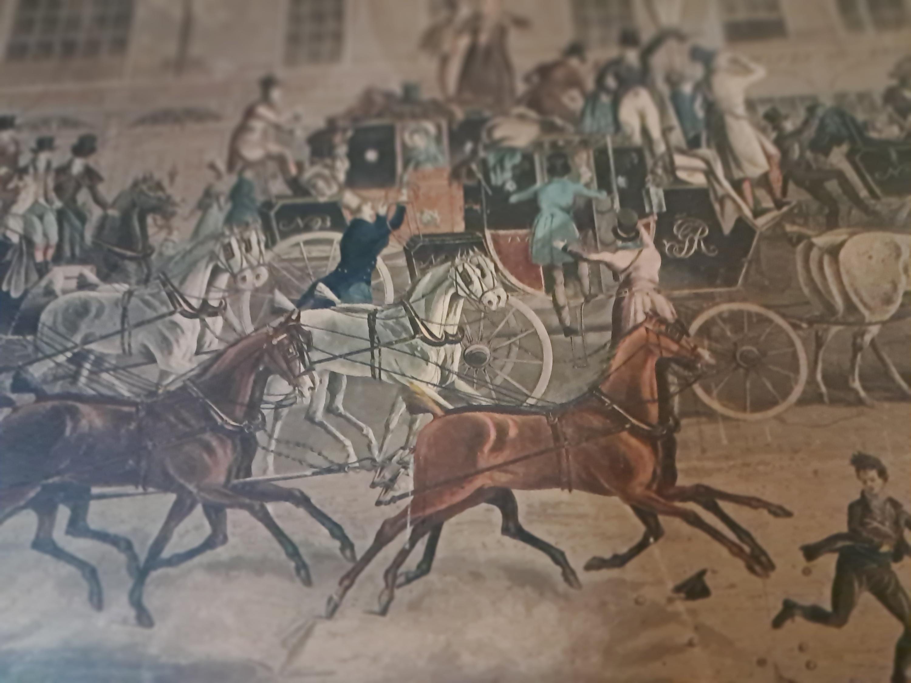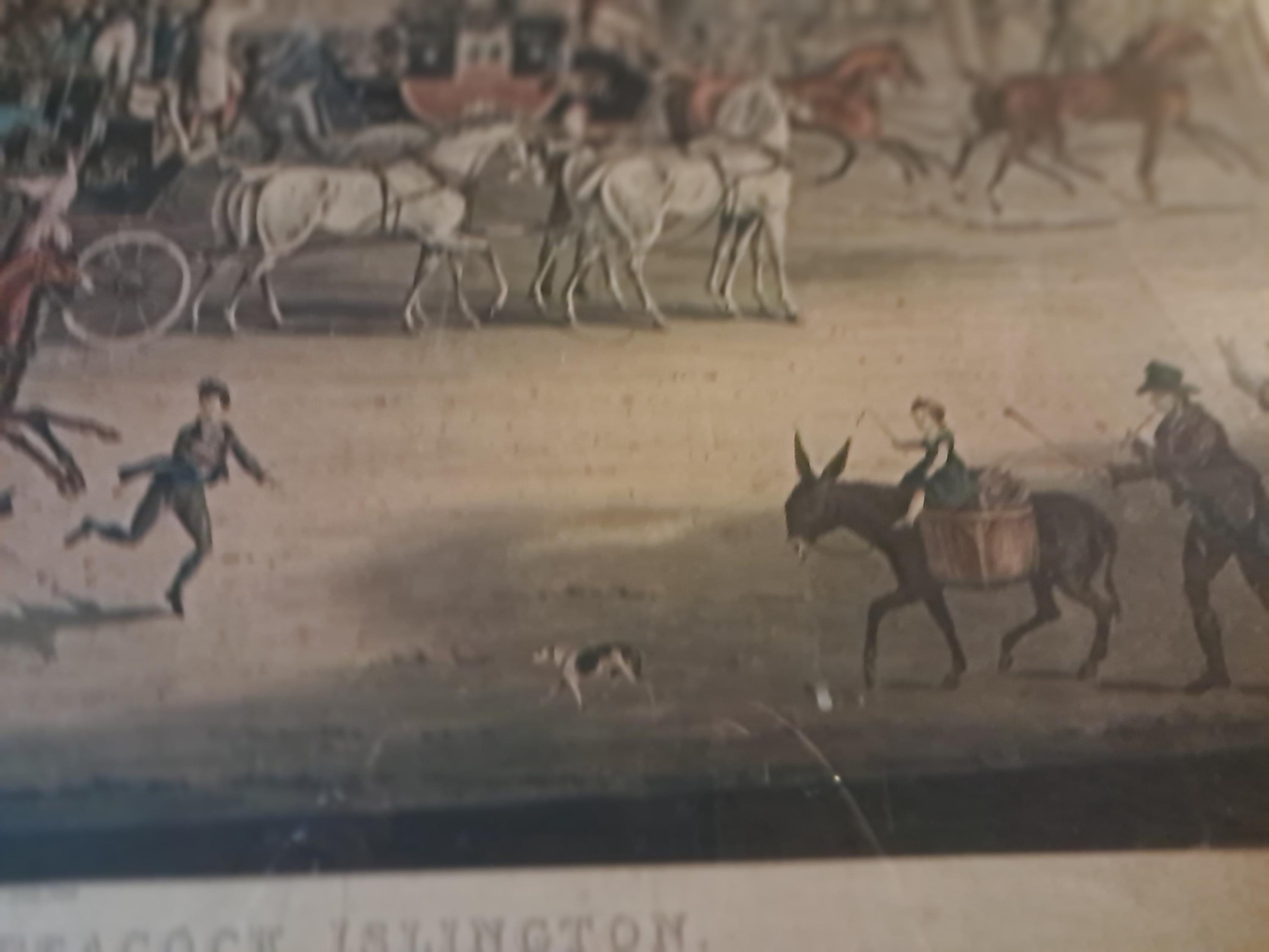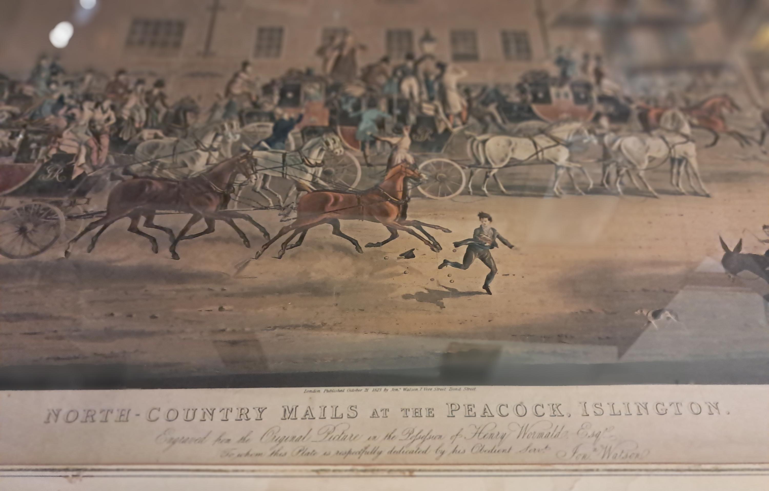 Fabulous RARE Antique Original English Engraving Lithograph , Artist James Pollard from Mail Series " North Country Mails at The Peacock , Islington " Framed and Purchased at Estate Sale