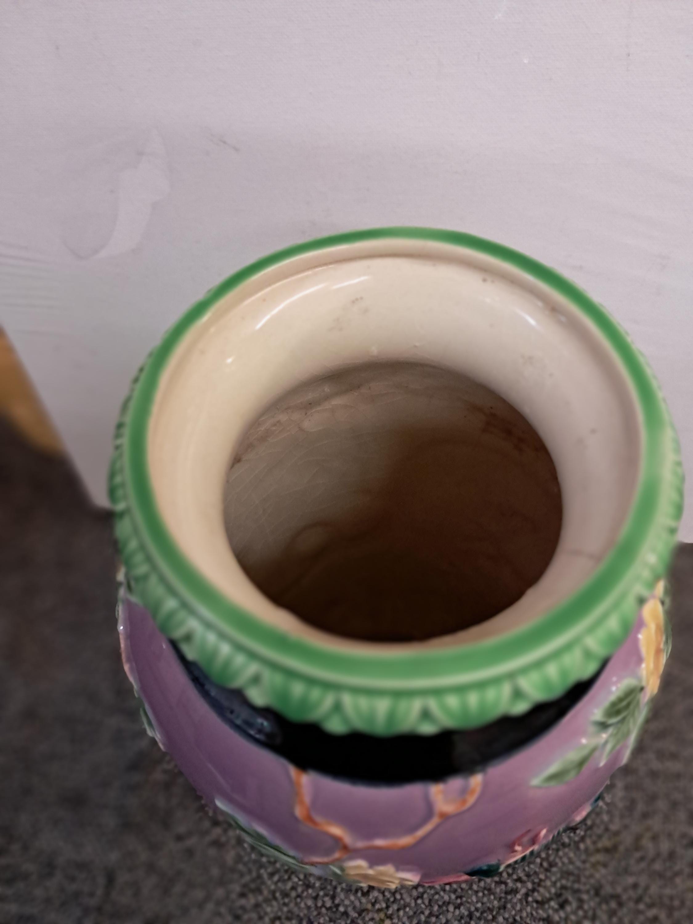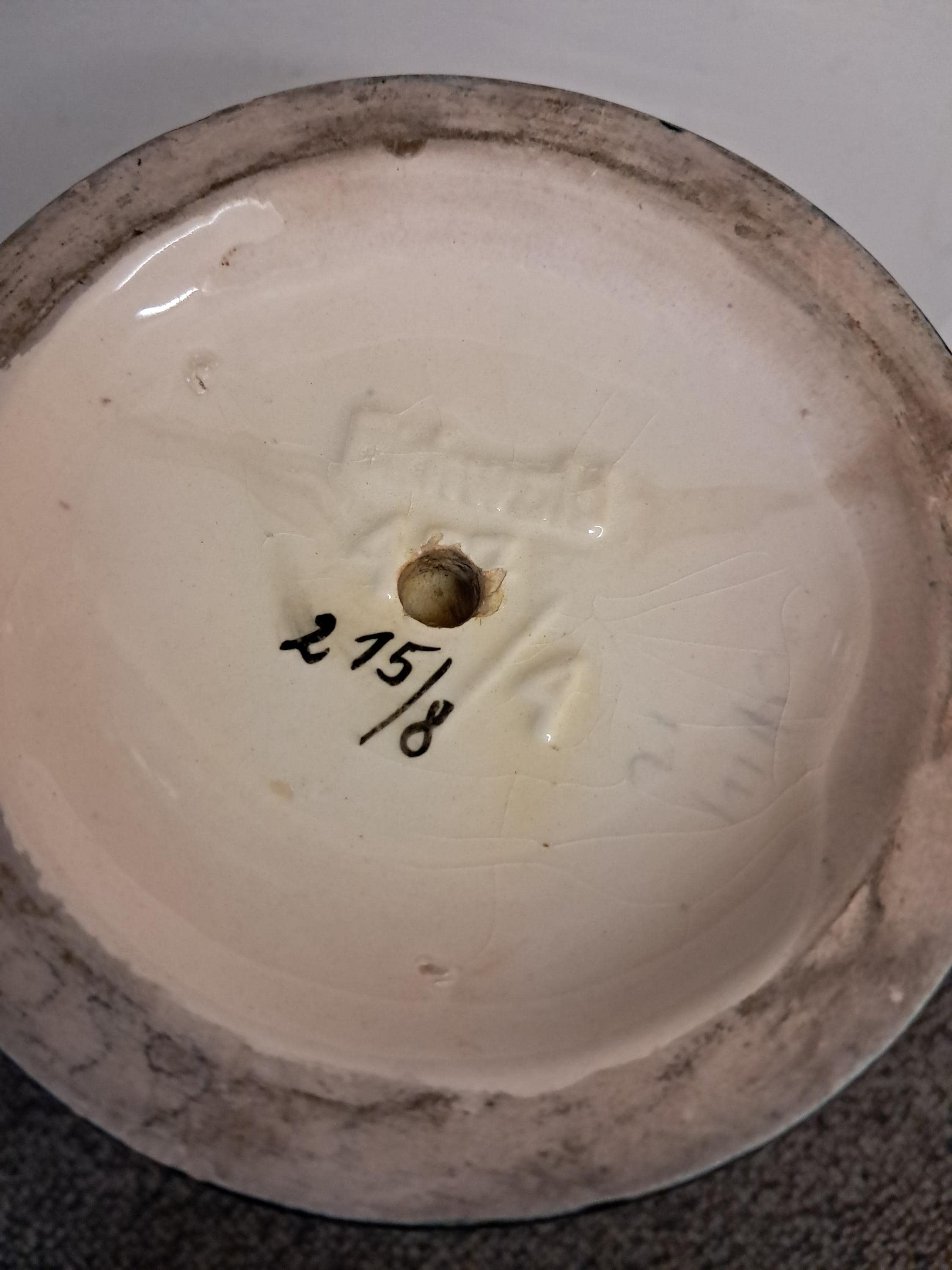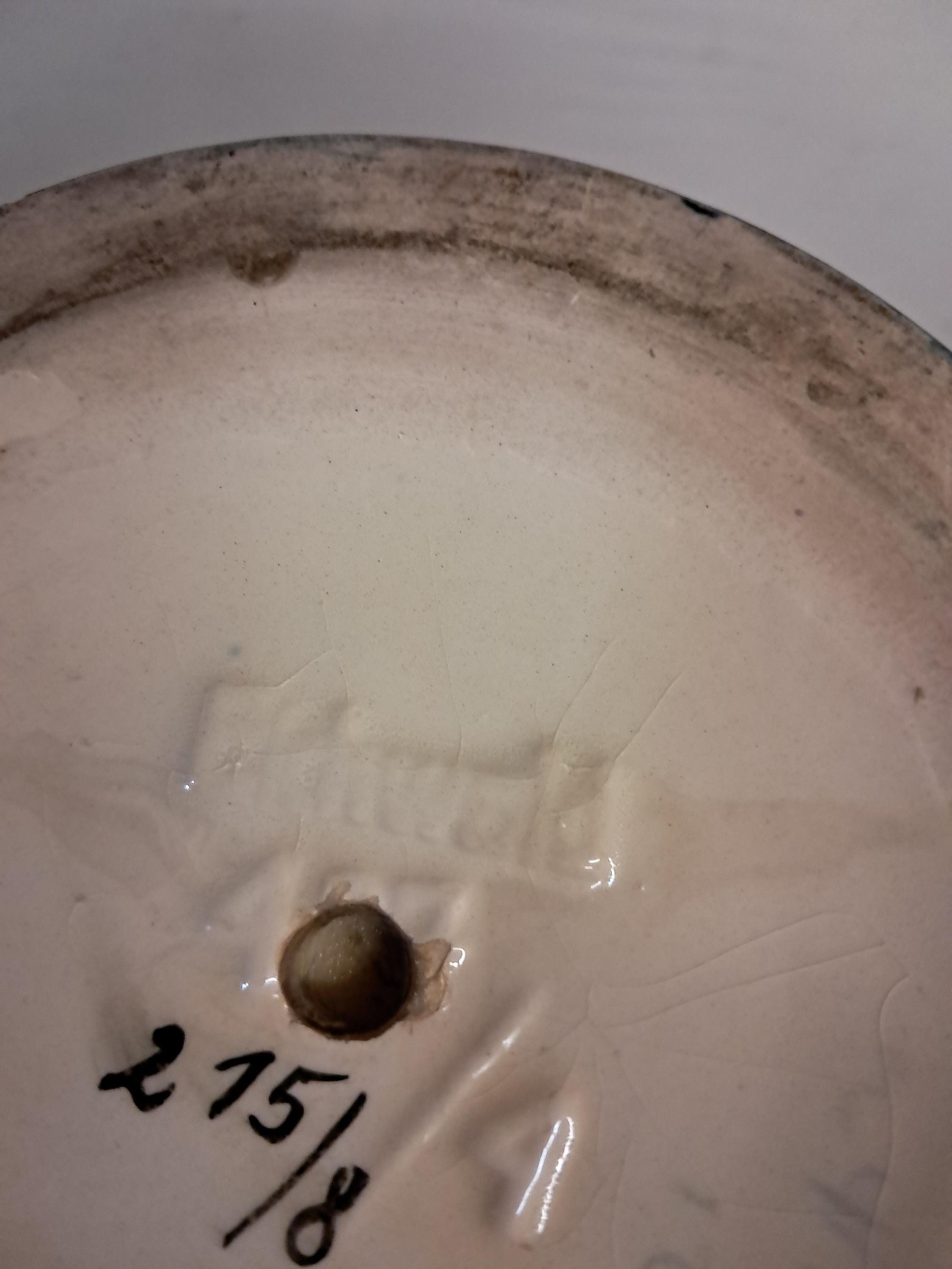 Bloch is recognized for production of a large variety of tobacco items known as smoker’s companions or smoke sets. These pieces had integral receptacles for cigars and matches, a roughened area to strike the match and often included an ash tray. Many of these pieces keenly captured the Victorian whimsical sense of humor. Bloch was also unique in producing a number of majolica dishes and wall plaques with erotic themes which was altogether unusual during the Victorian era.