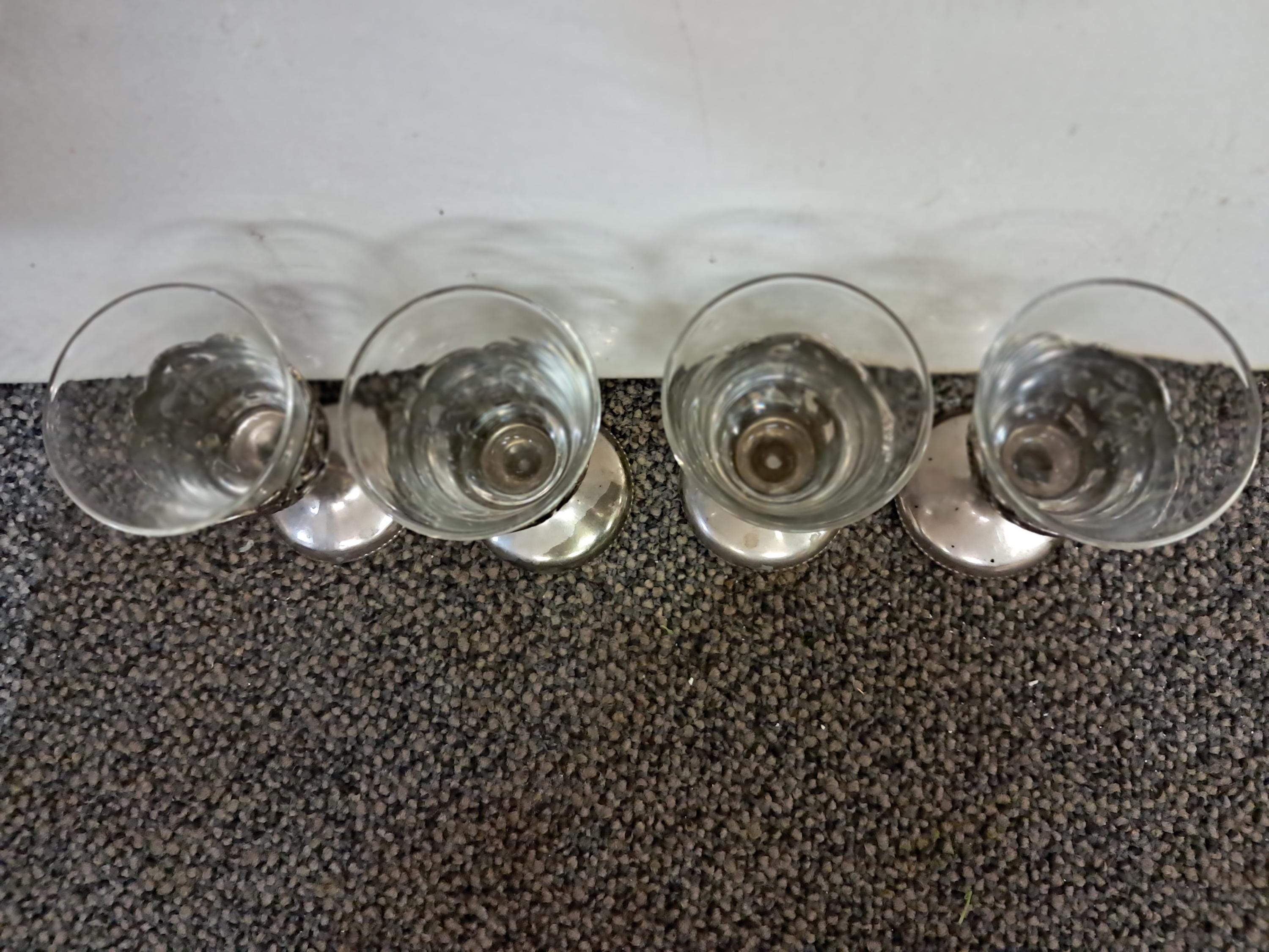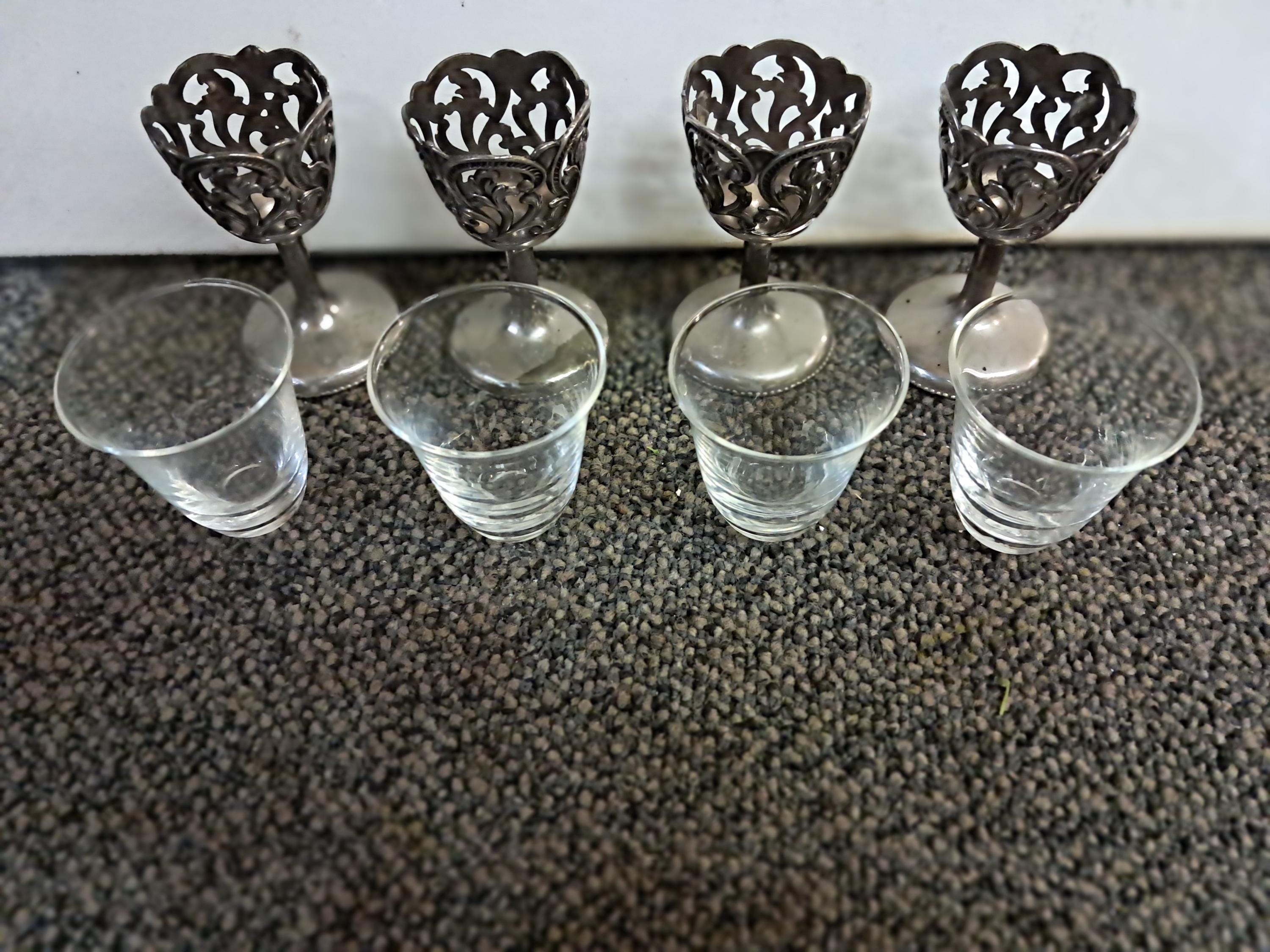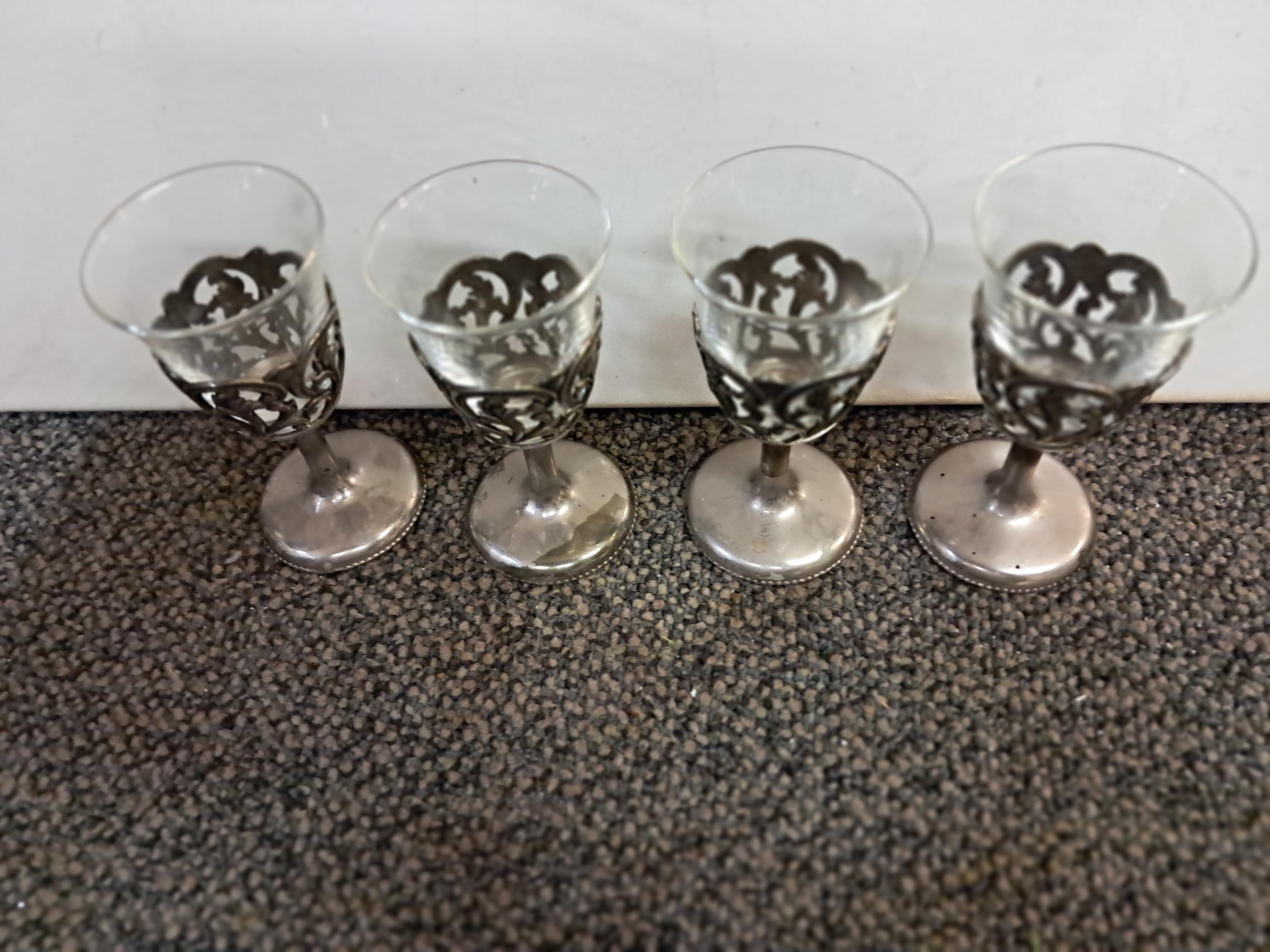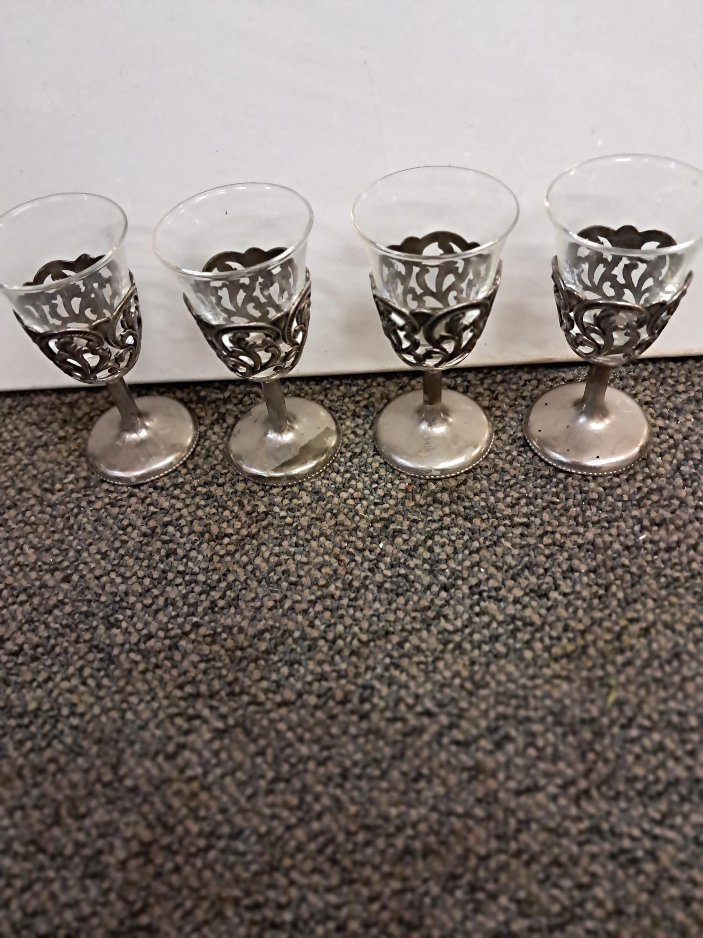 A set of four metal plated silver holders with cordial glasses. Great condition, no cracks or dents. 3" tall each, 1.5" diameter. Take a look at the pictures for the best description. A photo is as good as a thousand words and is the best description of cosmetic condition.