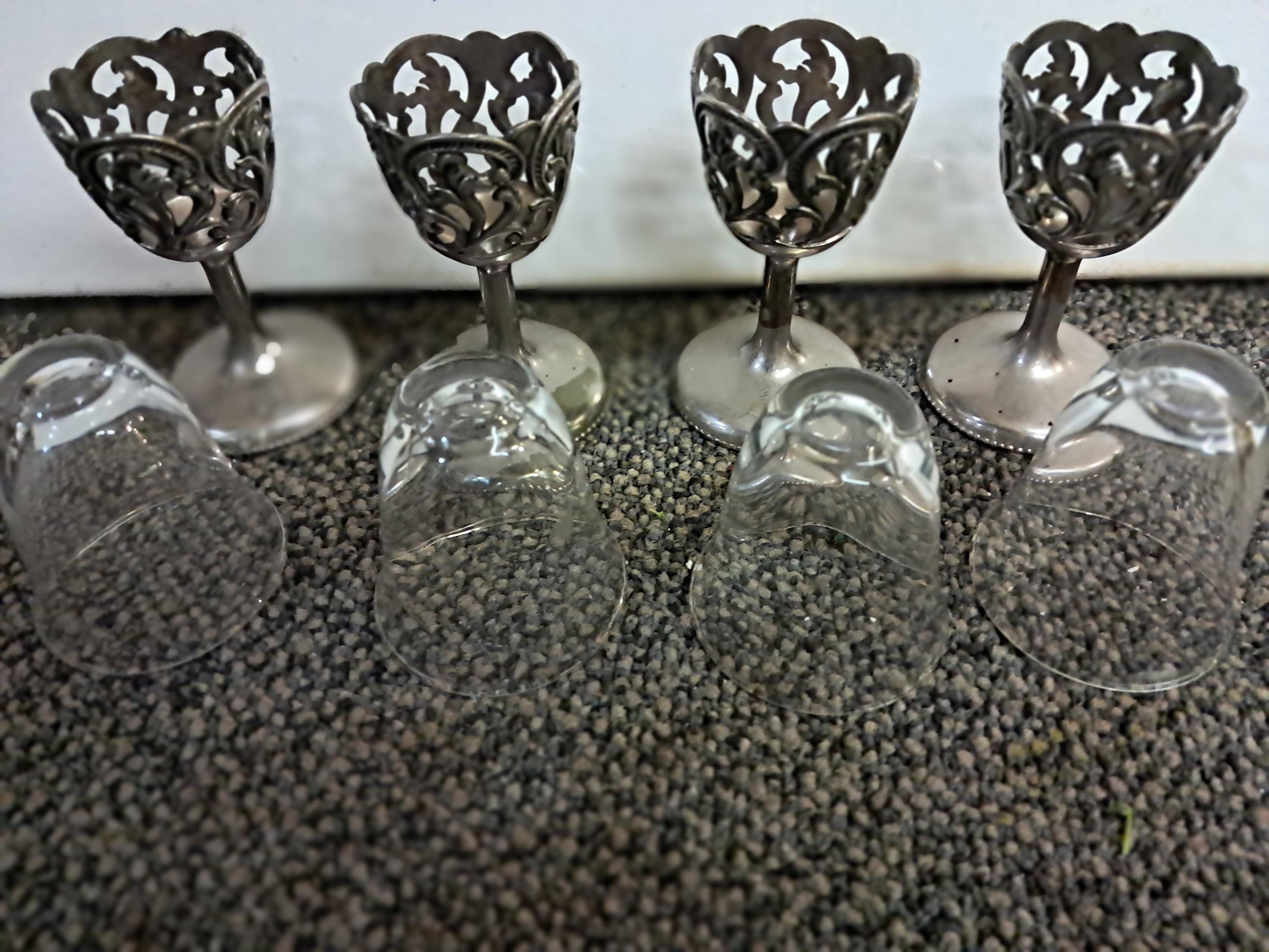 Vintage Antique Set of 4 Metal Silver Plated Tulip Cordial Glass Holders Cups with Glass Cups