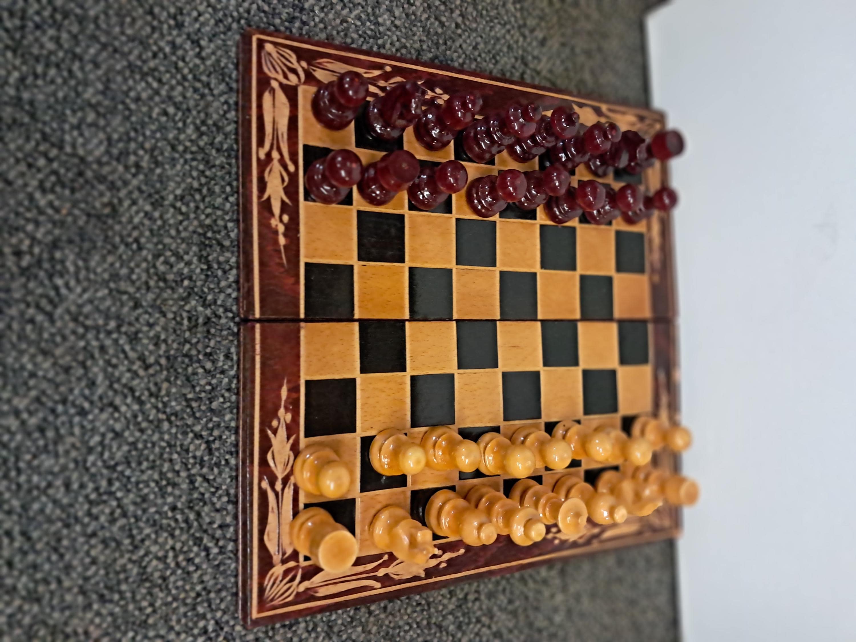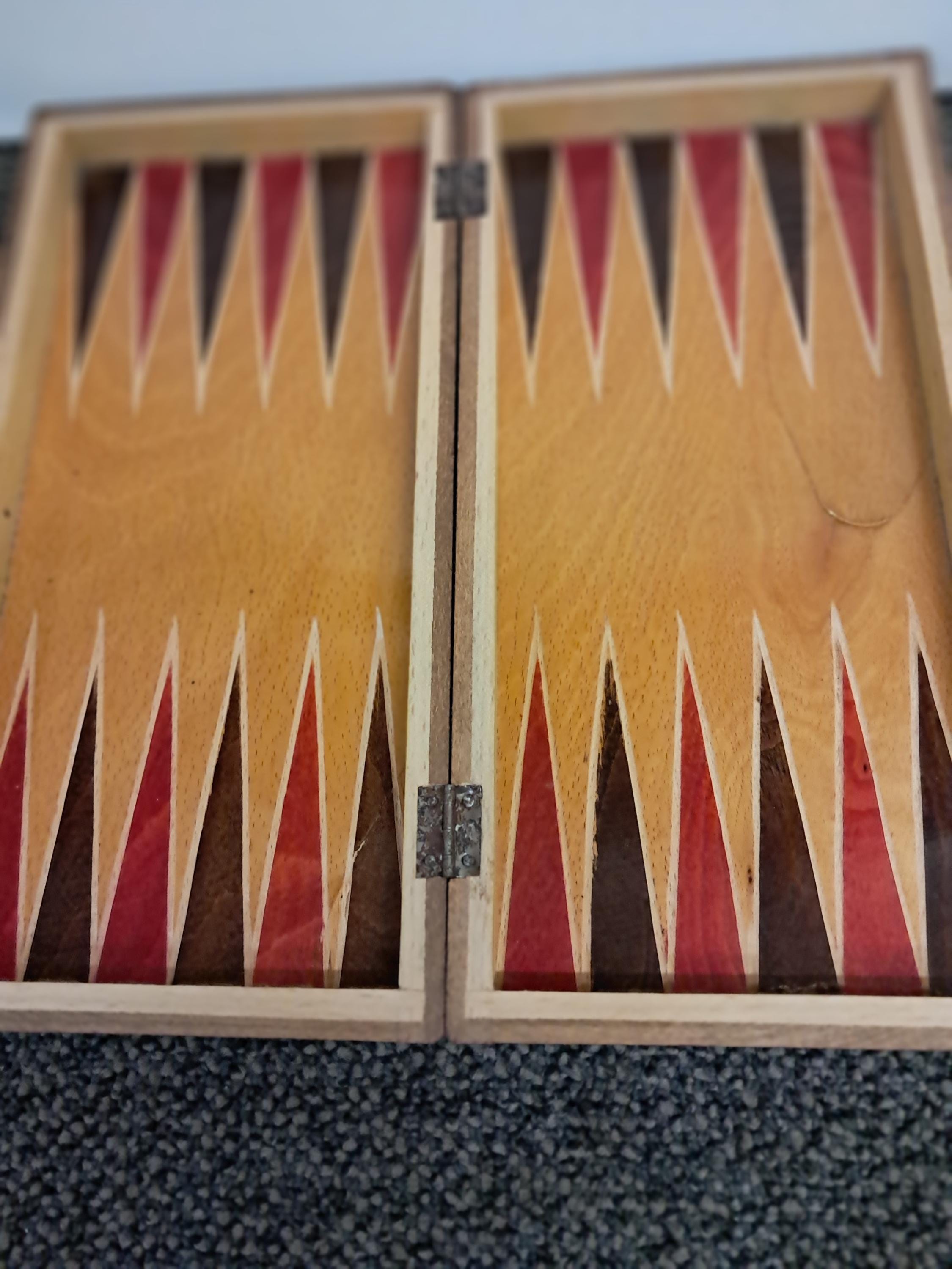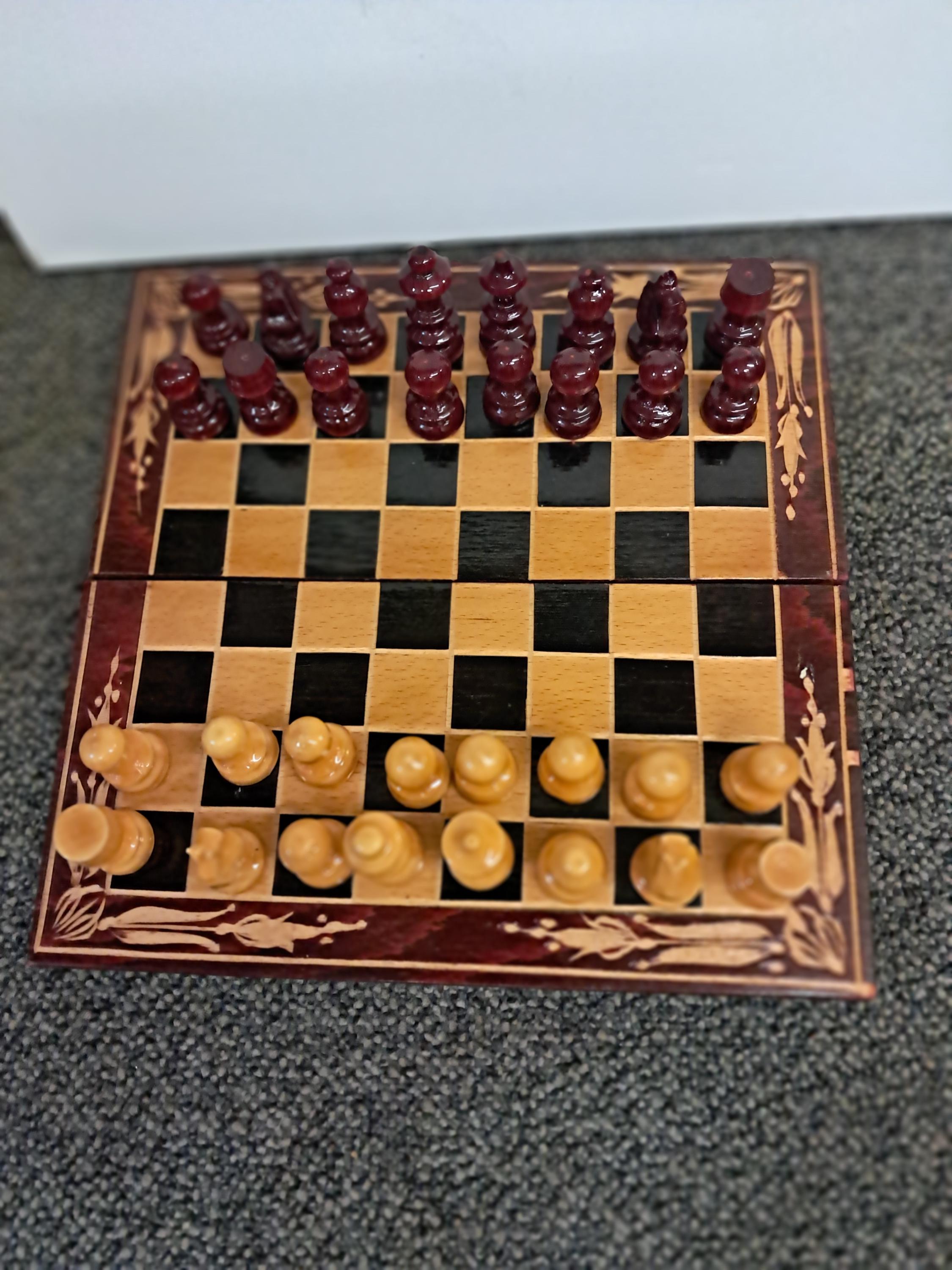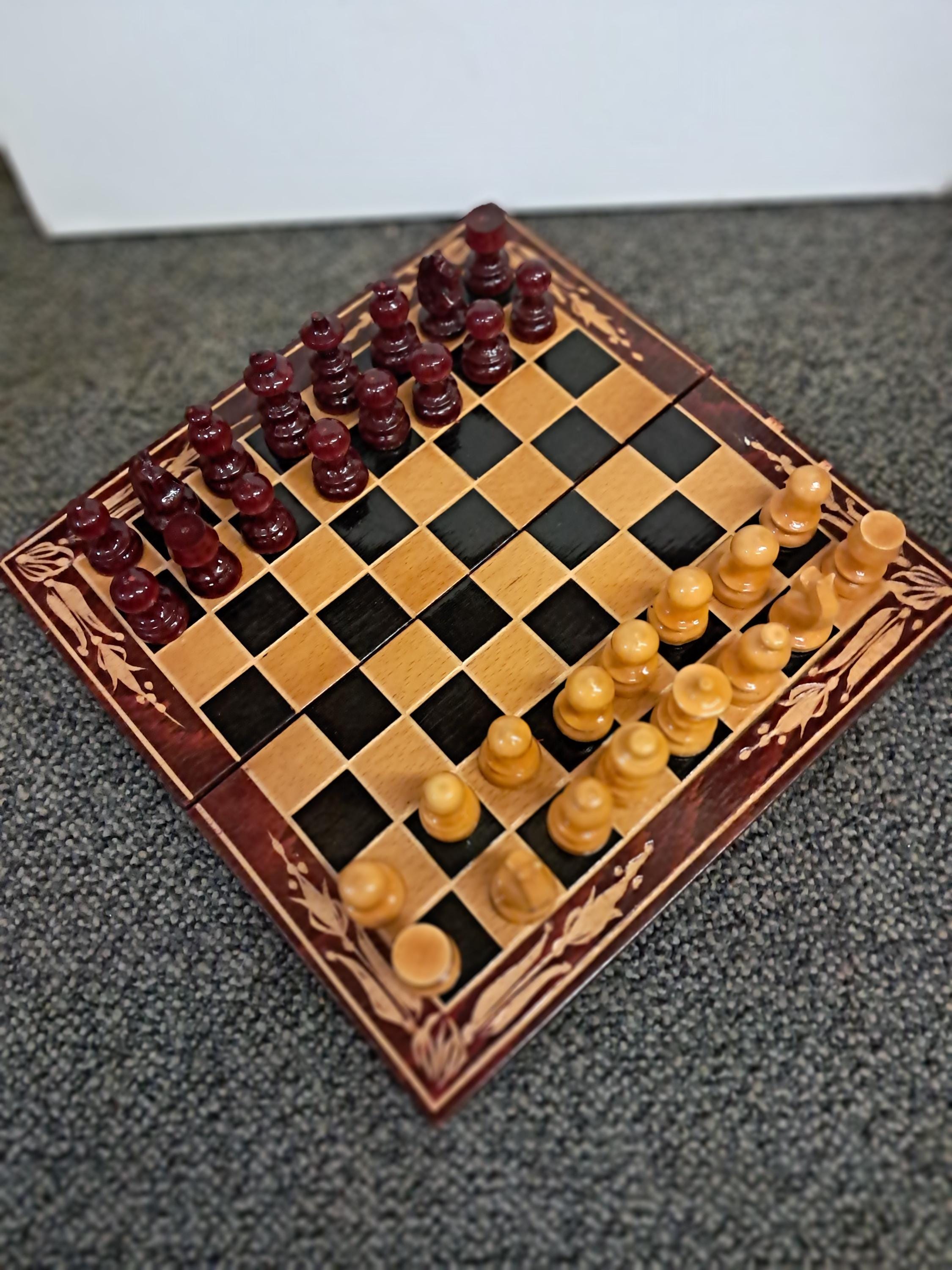 Hand carved and designed wooden chess set that can also be used for Backgamon.
