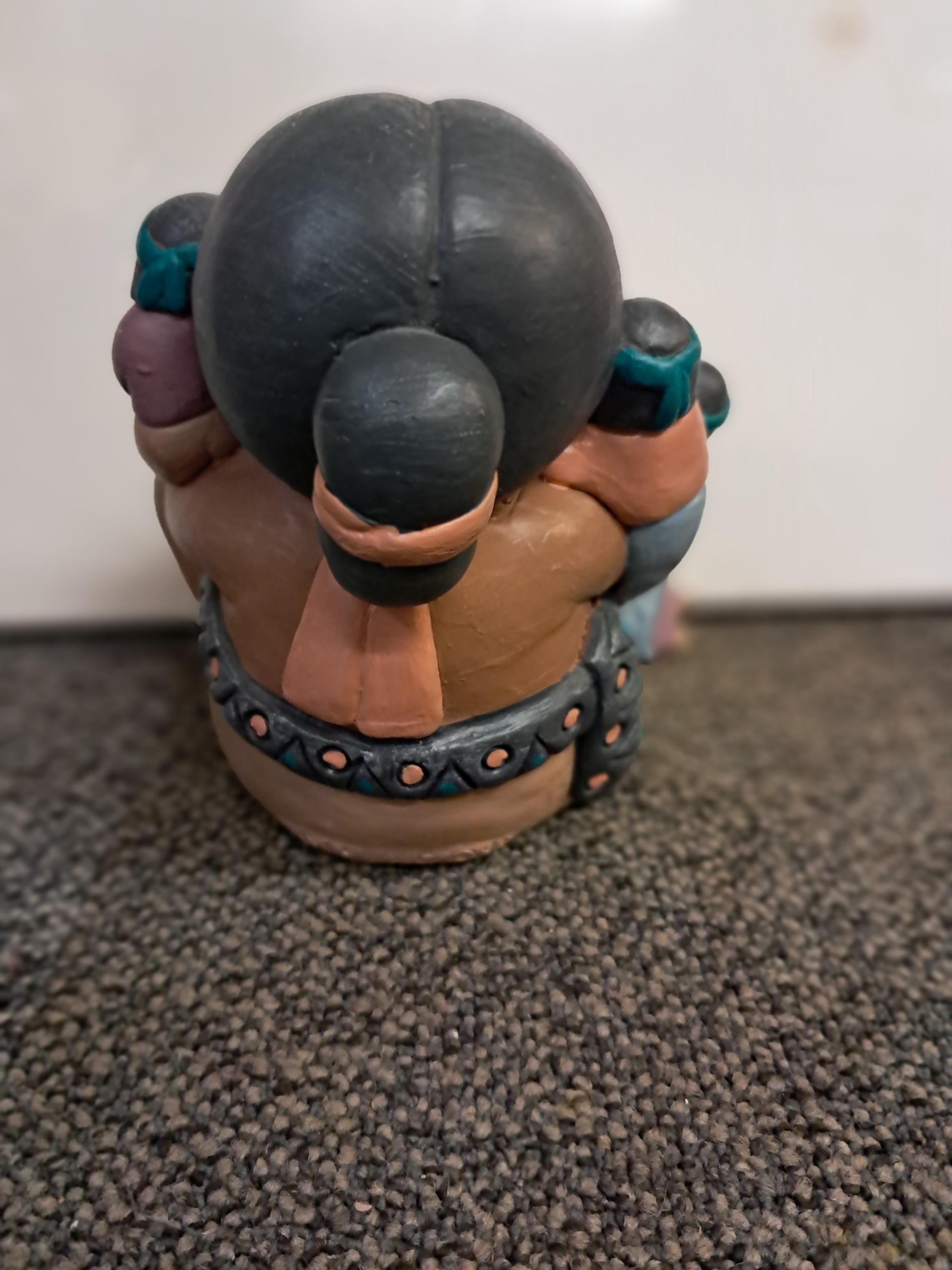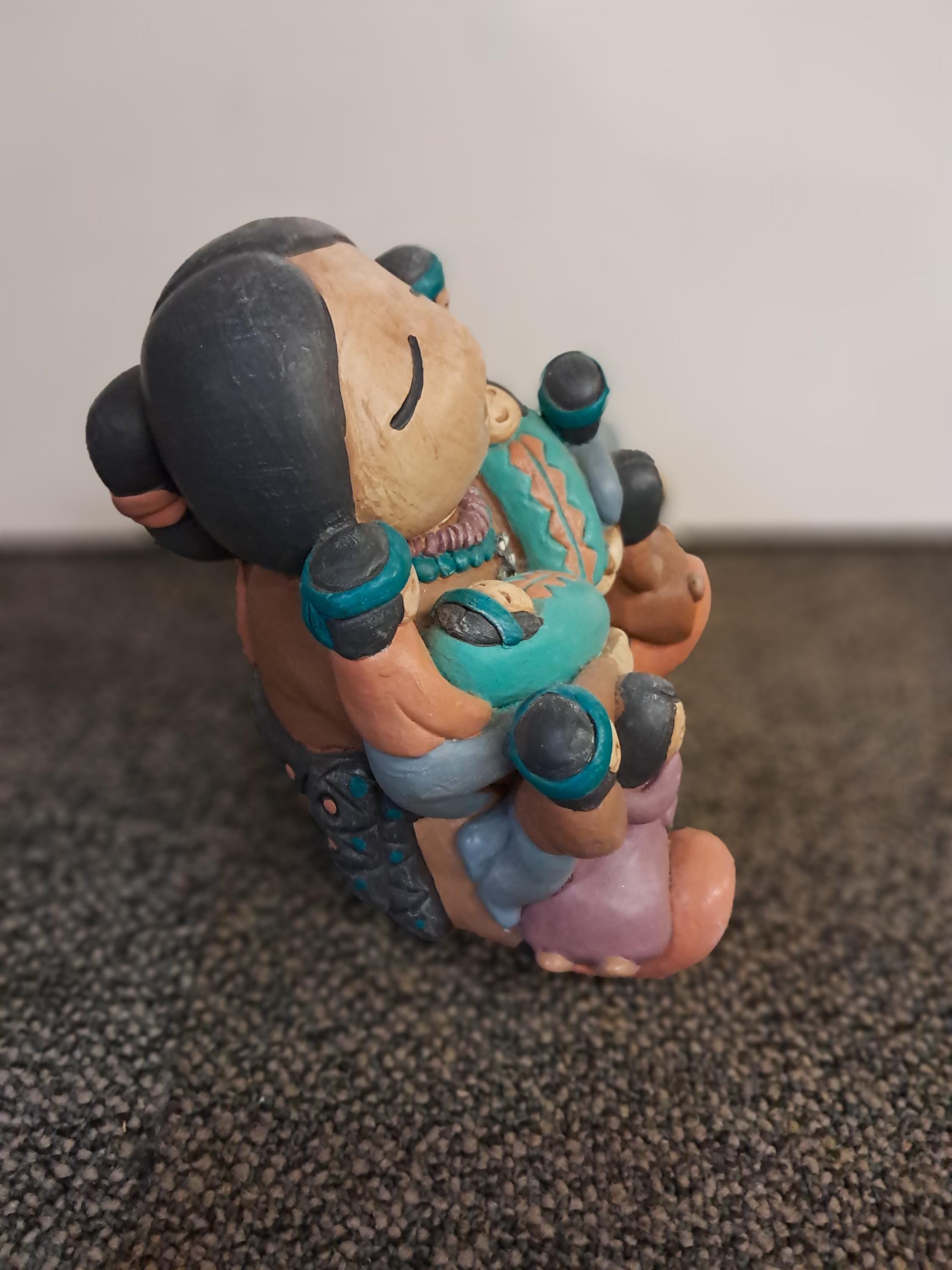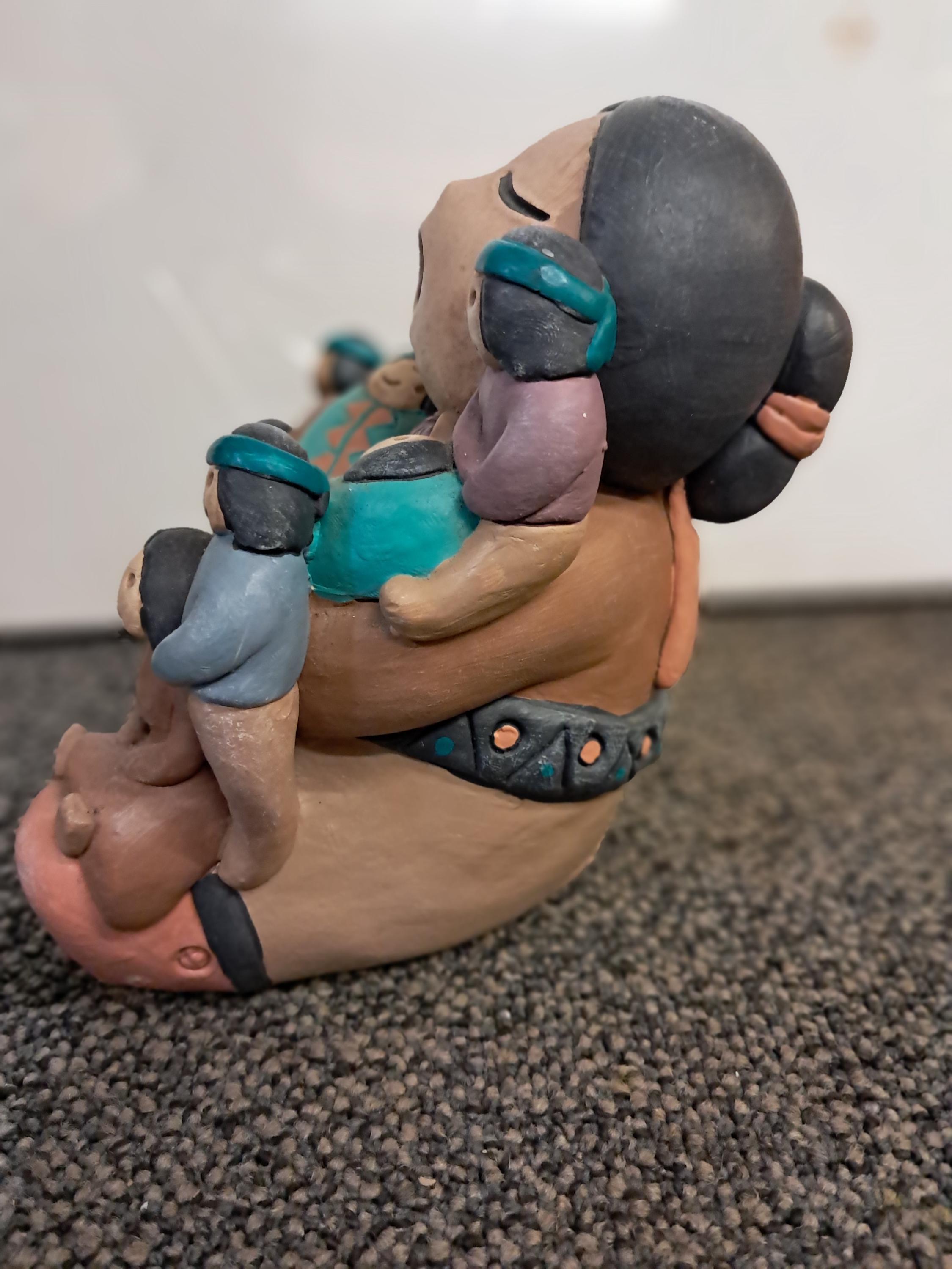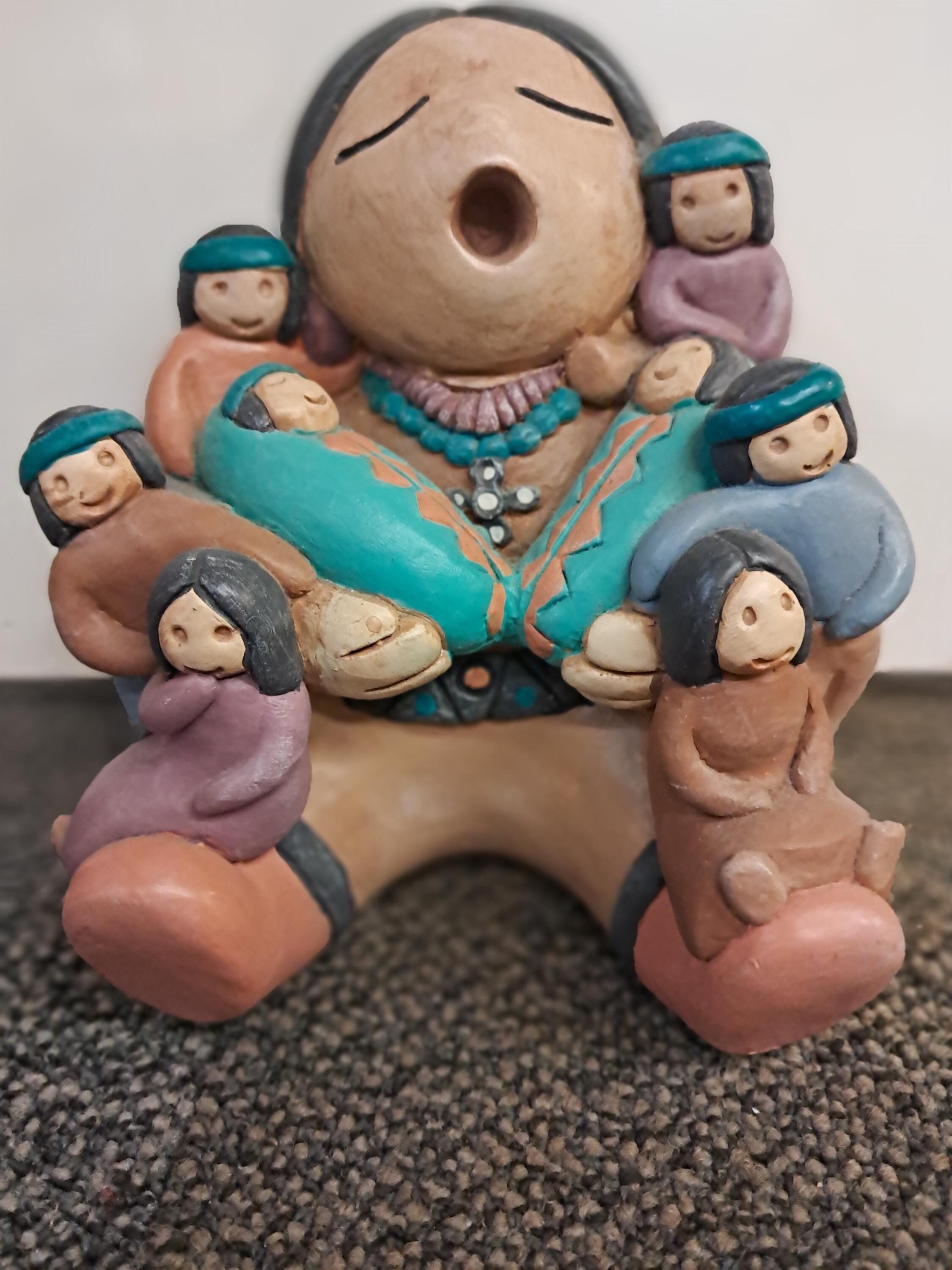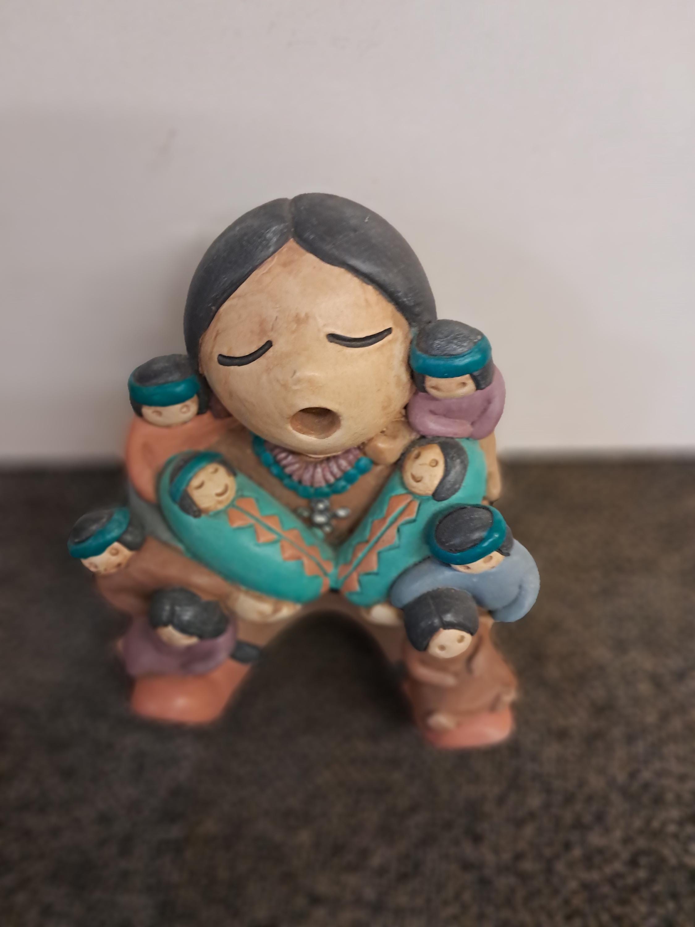 A Jemez Pueblo storyteller by Bonnie Fragua. This piece has a mother with eight children. This piece measures 6 inches in height, 4 inches in length and 5 inches wide.This piece is made traditionally with the clay and natural paint. It is signed on the bottom.