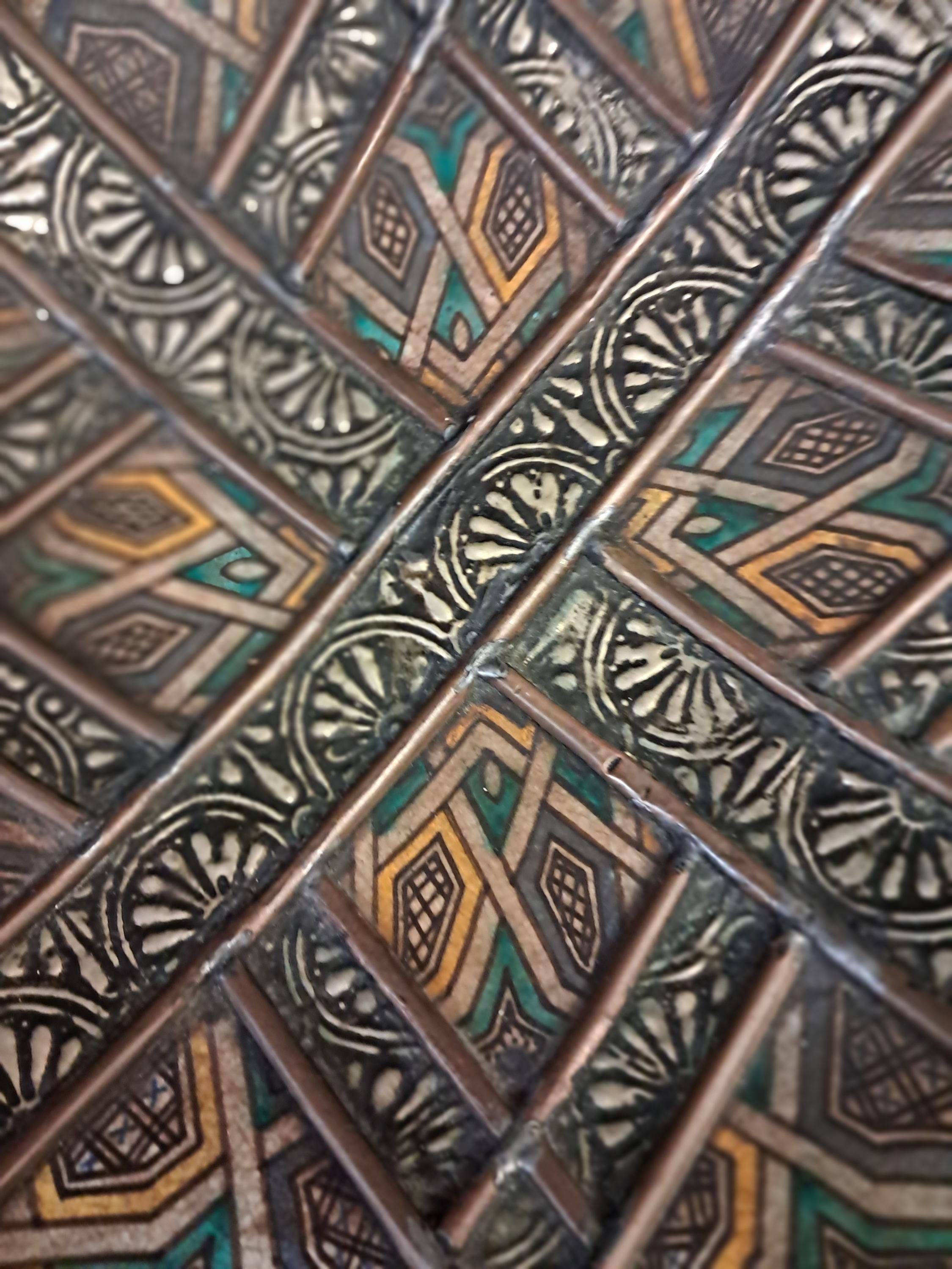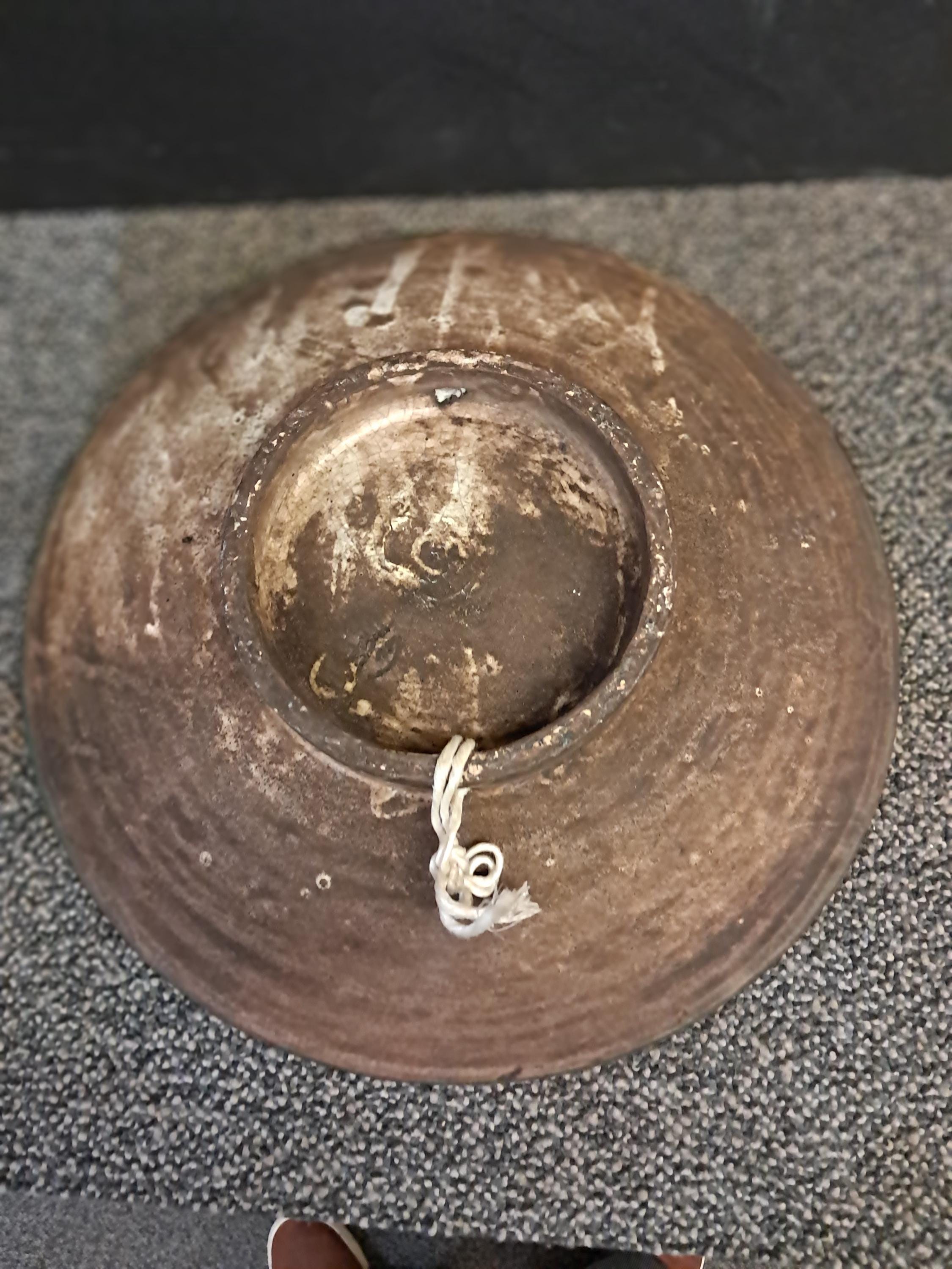 Absolutely stunning piece is marked on the bottom. It sems Aluminium is used toprotect the edges of the plate and Bronze is used in soldering the pieces in an artistic design.In between are Hand painted and hand craftyed designs