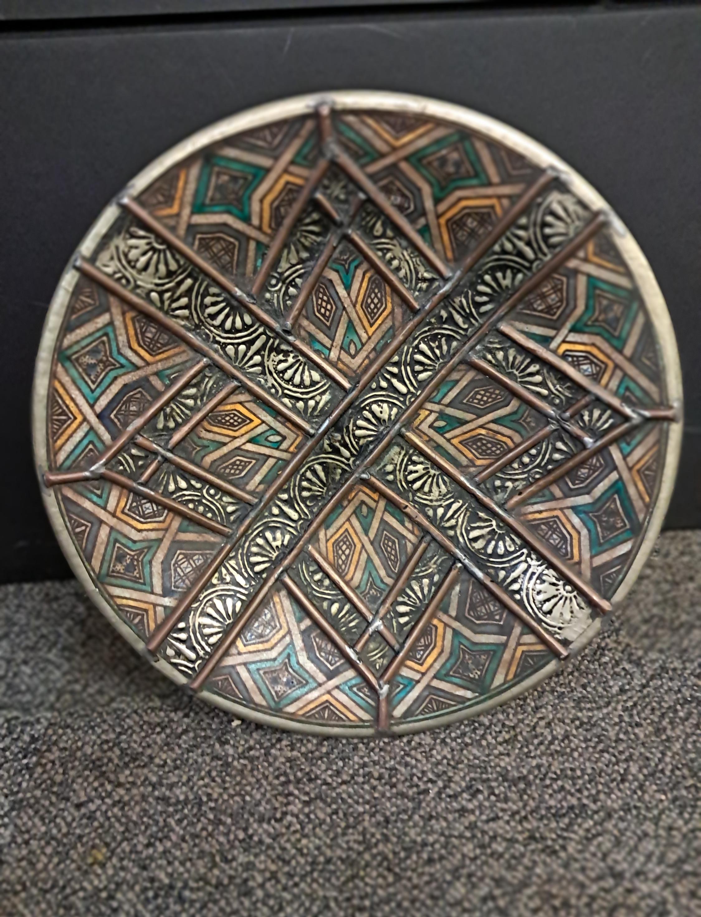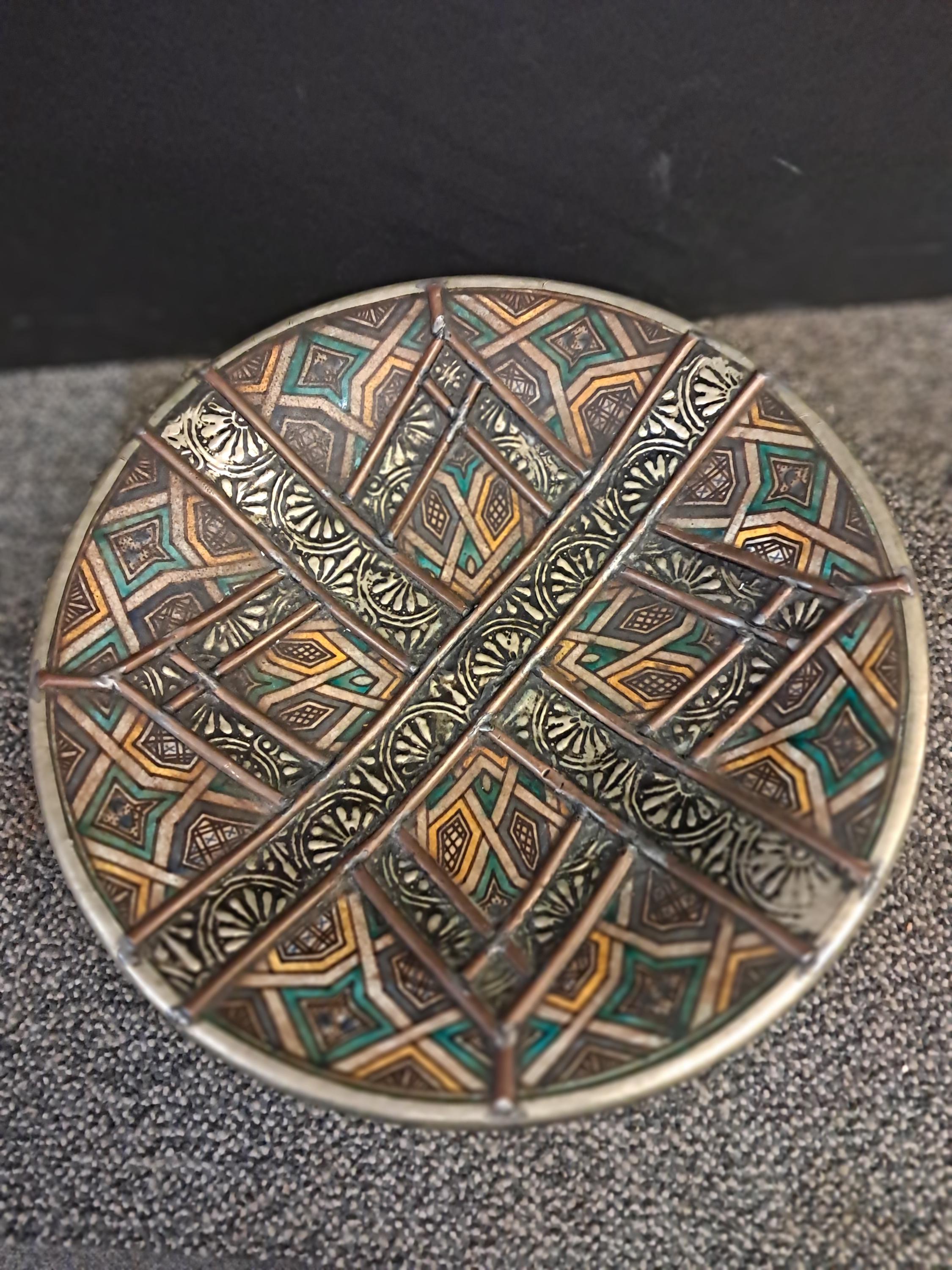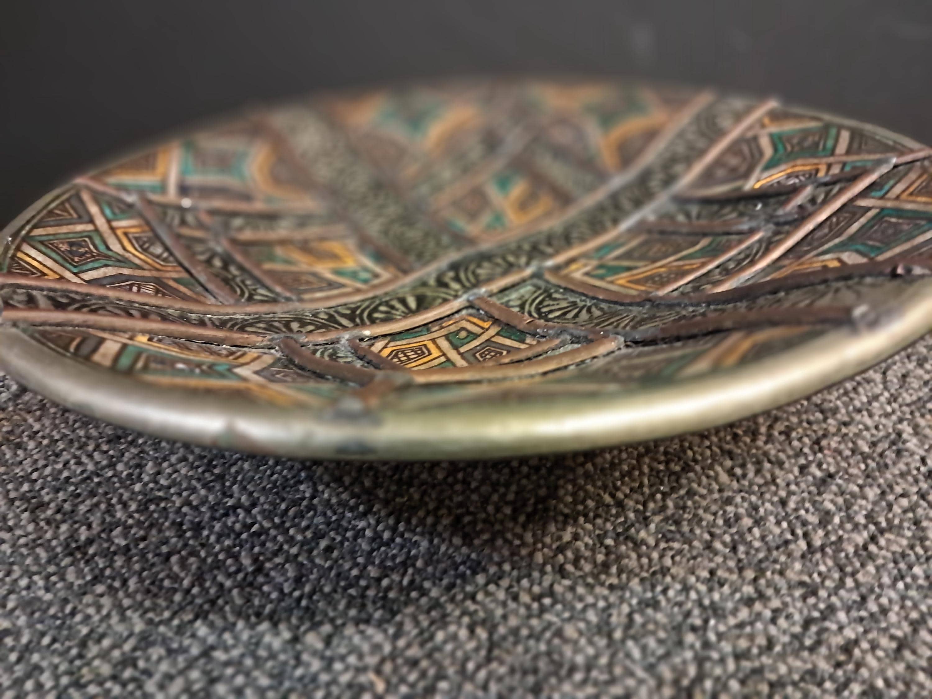 Vtg Large Ceramic & Metal Engraved Etched & Painted Plate