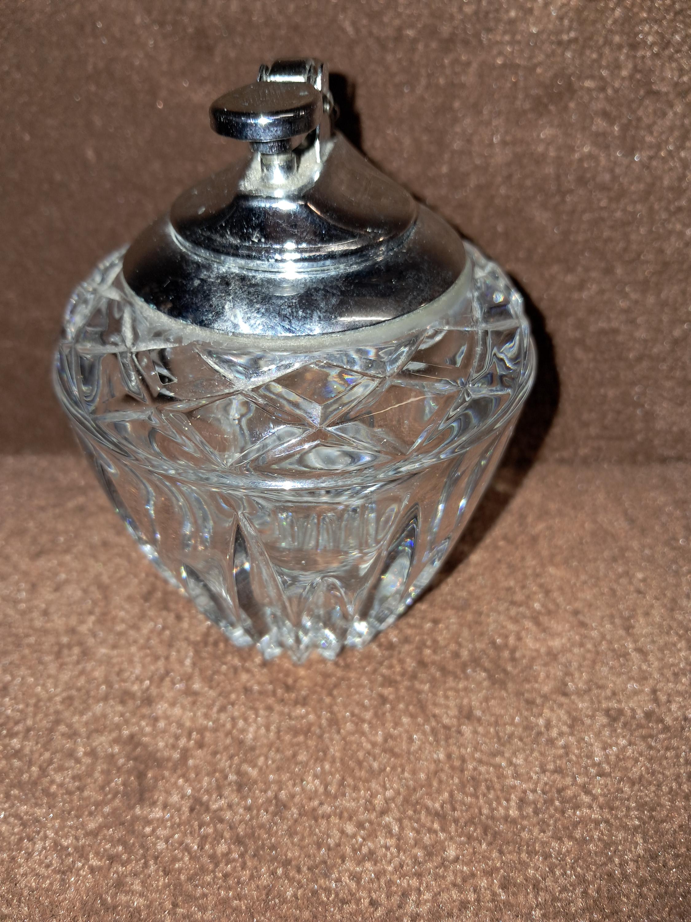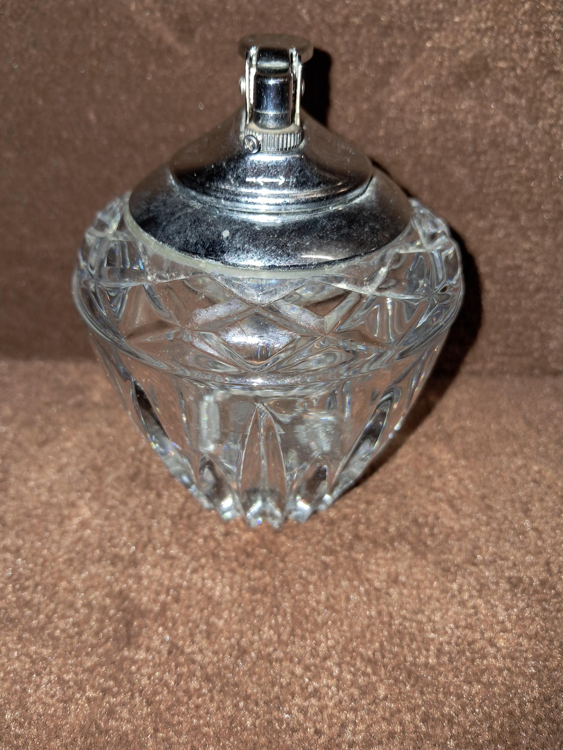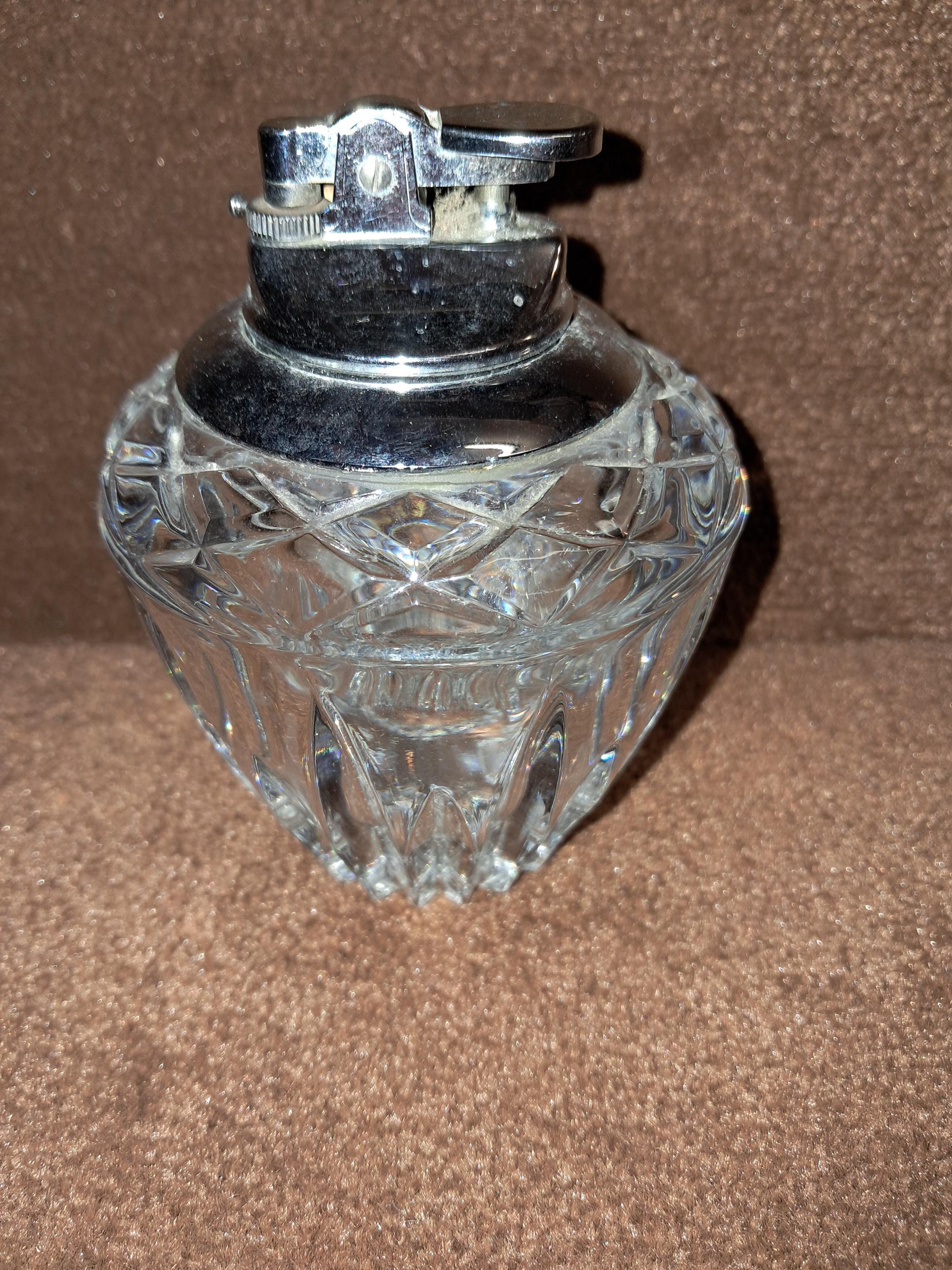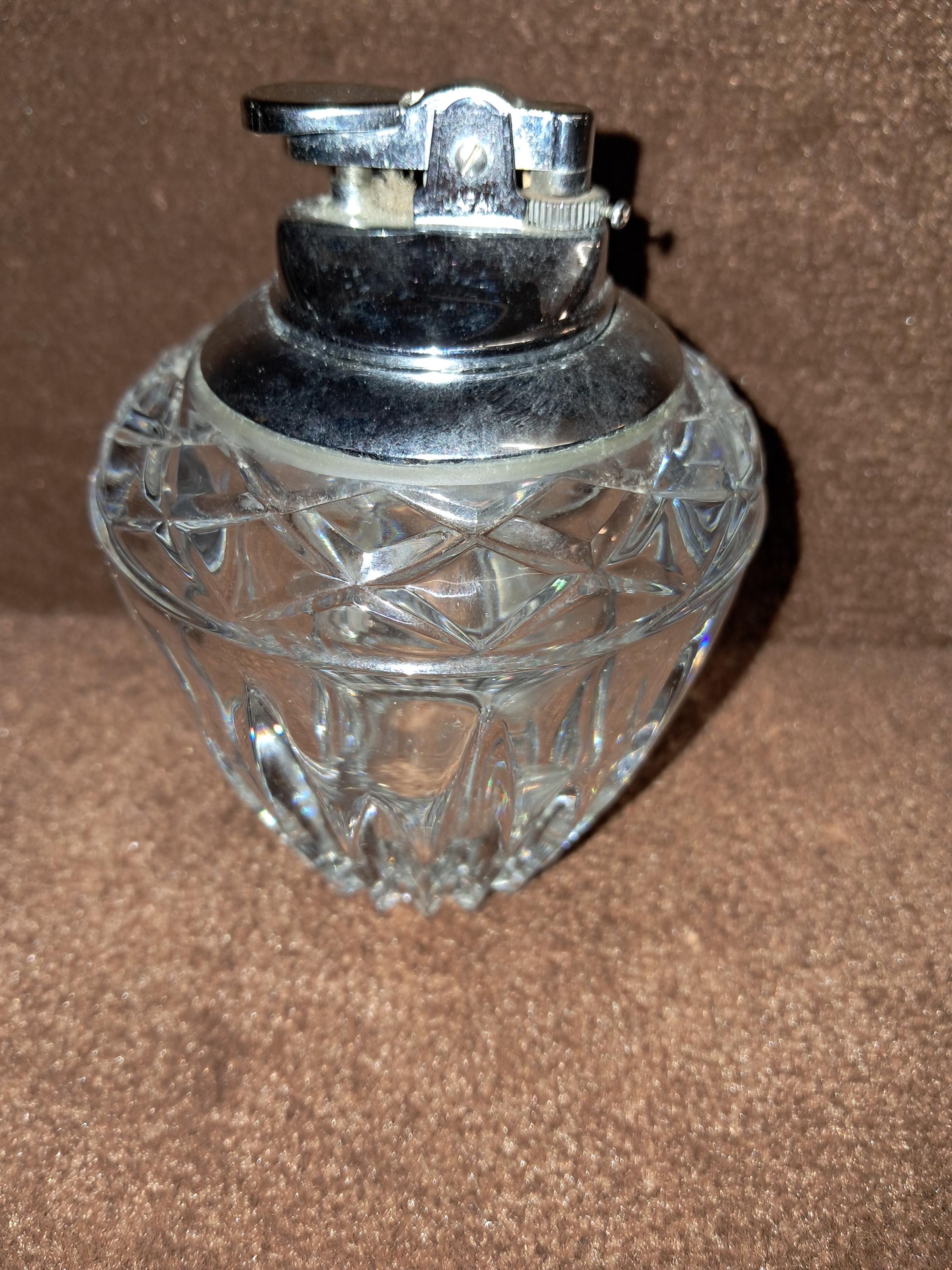 This vintage cigarette lighter is made of crystal It is a table top style. Whether used as its intended purpose or not, it is a beautiful piece of vintage art to use for your home décor or as an accent piece. It is made of the clear crystal glass, and the lighter hardware is a silver tone color. It has a beautifully cut design in the glass. The lighter top is marked 'gas', so I assume it is a gas lighter. It does not have a wick. I have not tested it, so I cannot guarantee its working condition; however, it is in excellent condition from a cosmetic perspective, which reflects that it has been well taken care of and probably not used much, if at all. It is a gorgeous lighter. It is very heavy and quite large in size. It measures 4.5" tall,3.25" in diameter , and the bottom base tapers to 2" in diameter. No Damages