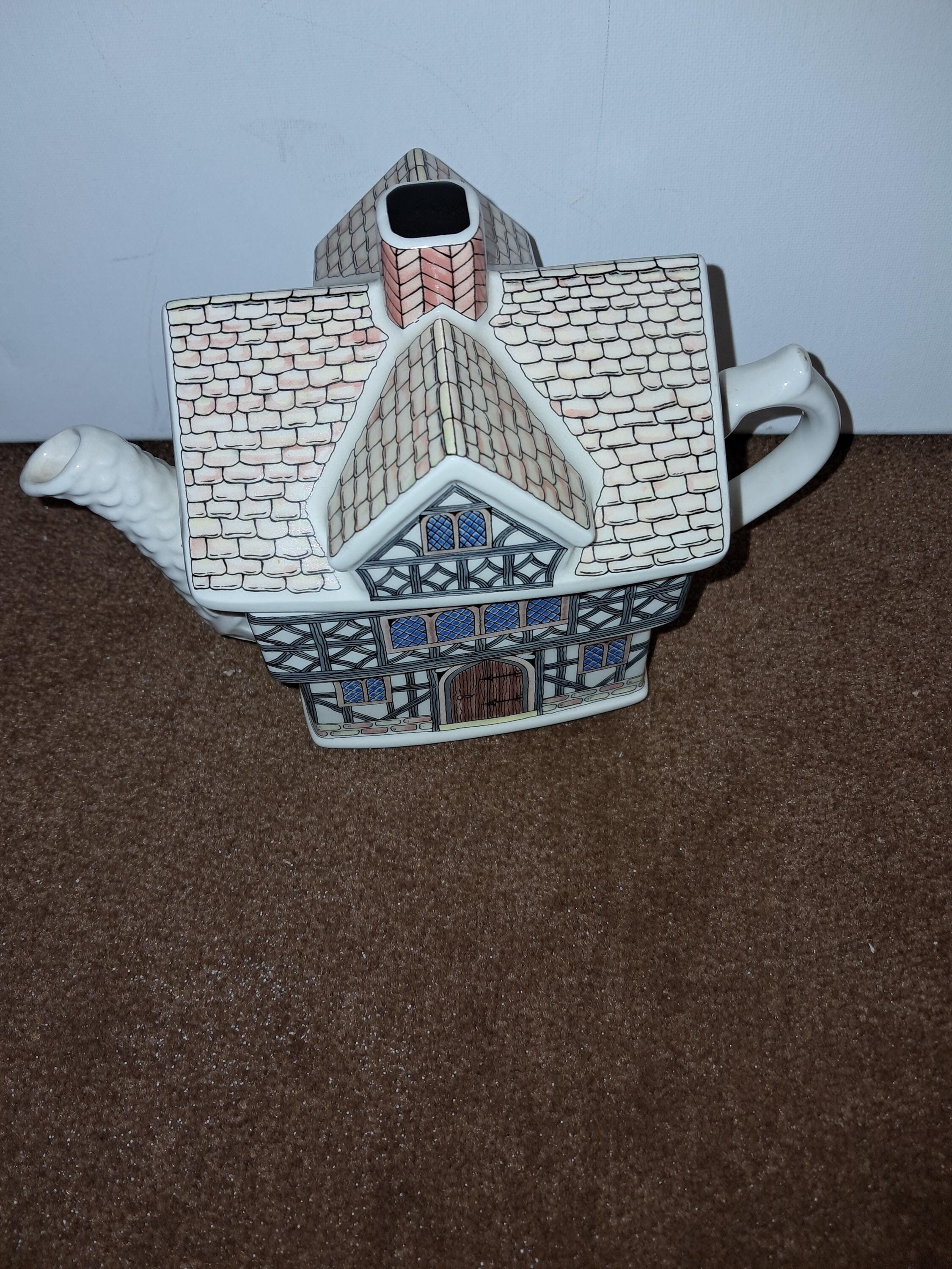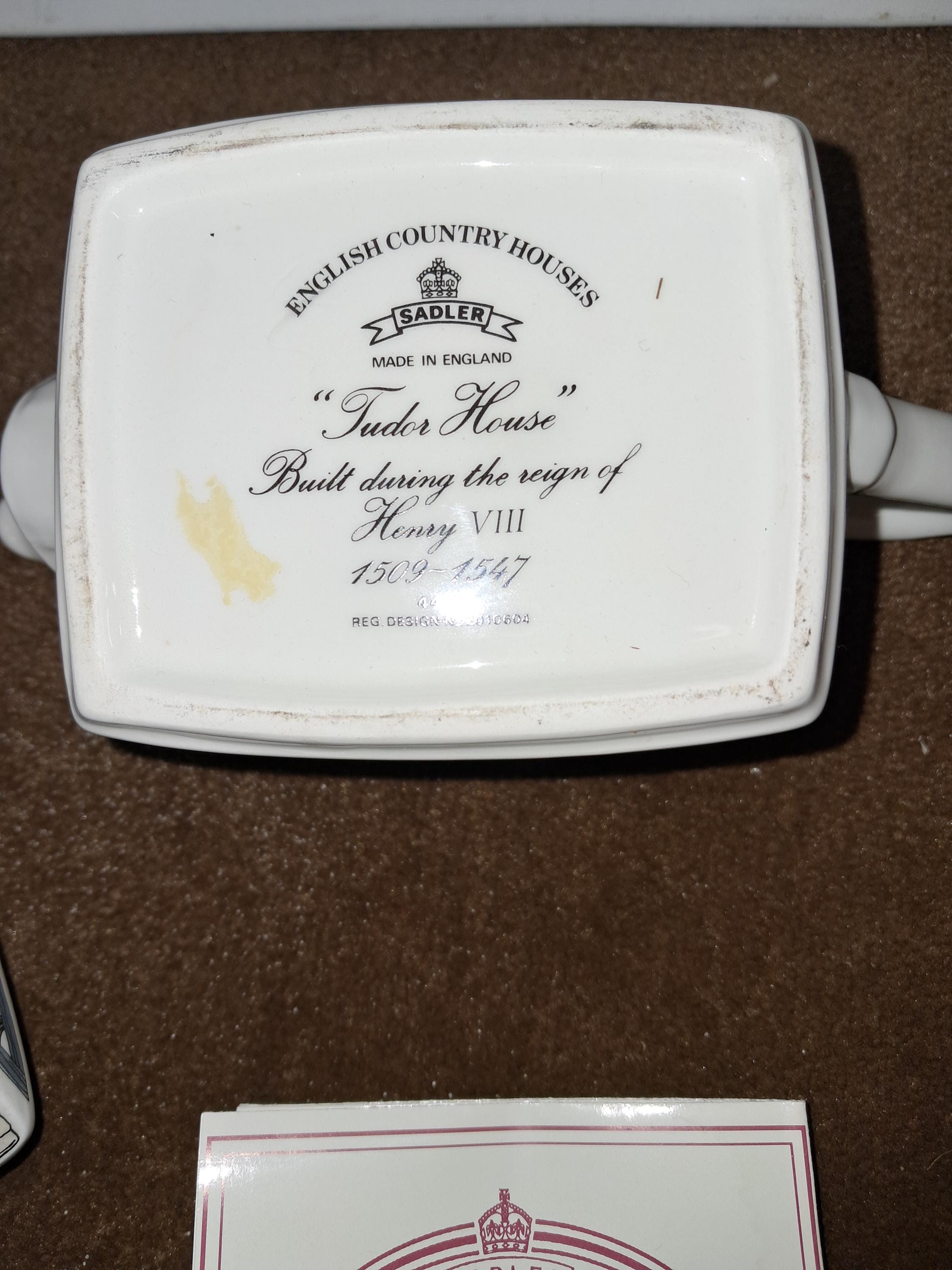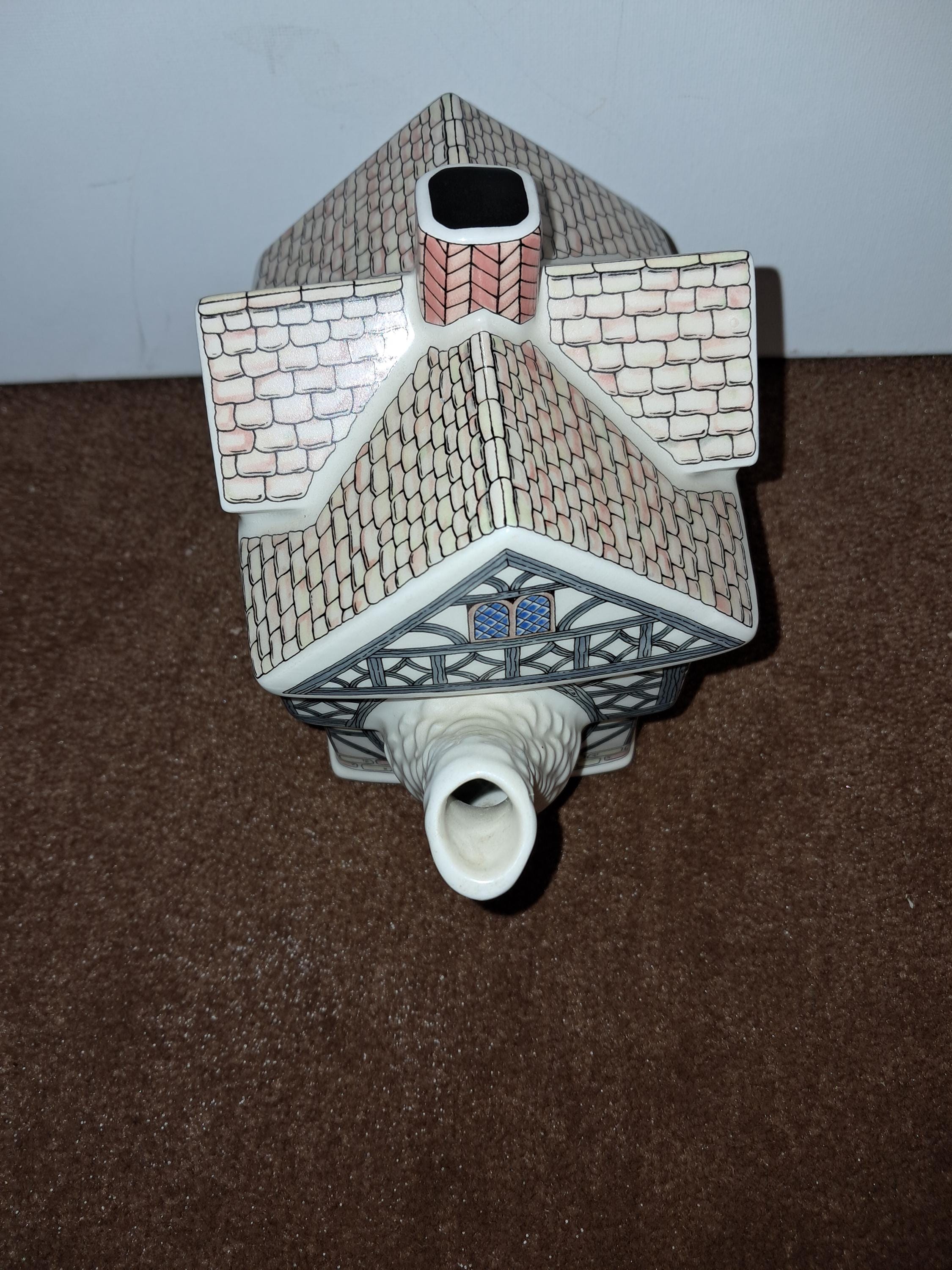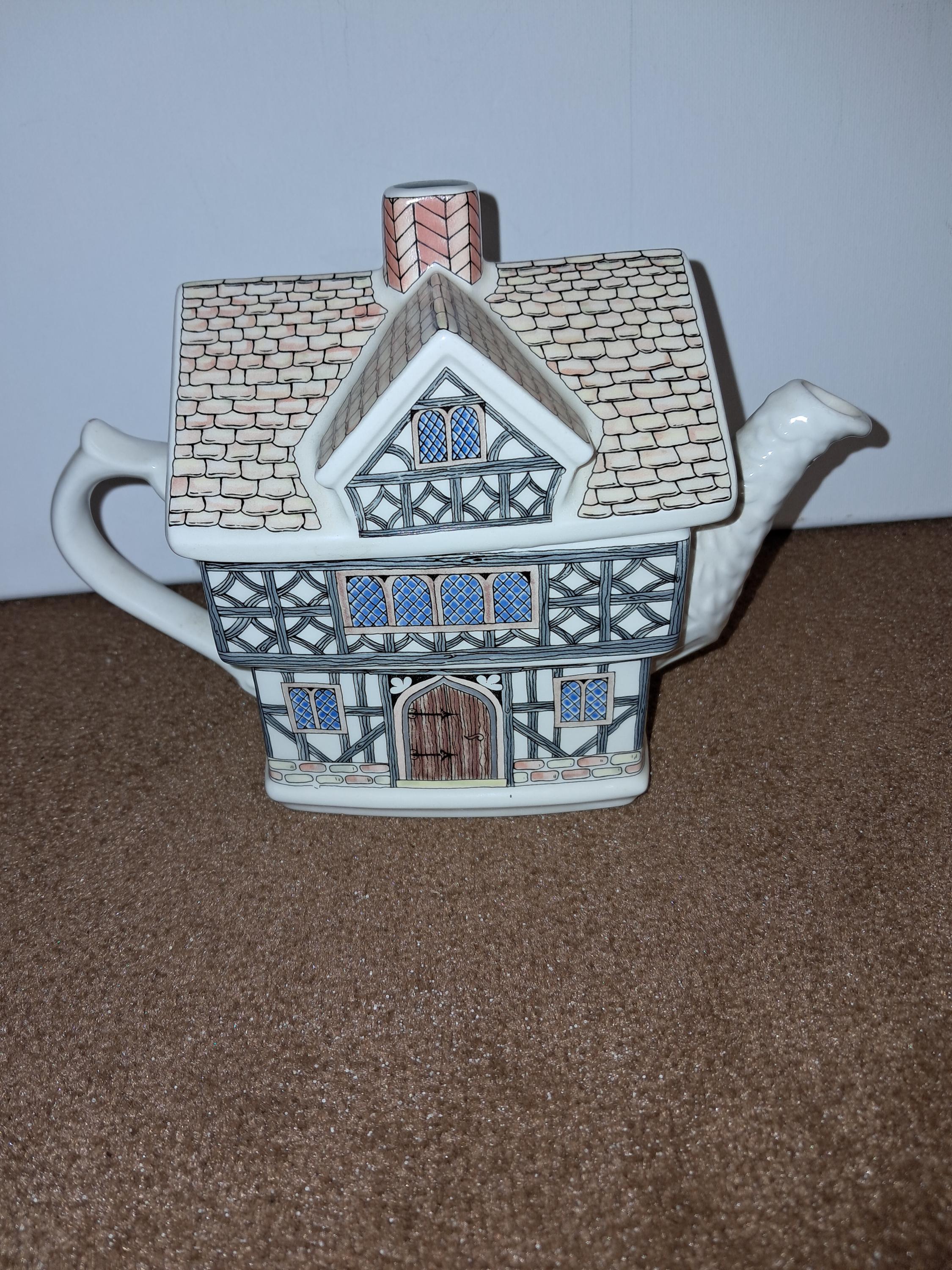 This teapot is part of Sadler's English Country Houses collection. It is a beautifully painted model of The Tudor House based on a manor house built during Henry VIII rein (1509-1547). The detailing is exquisite, from the chimney to the gables and leaded windows, it’s very much Tudor-inspired.
