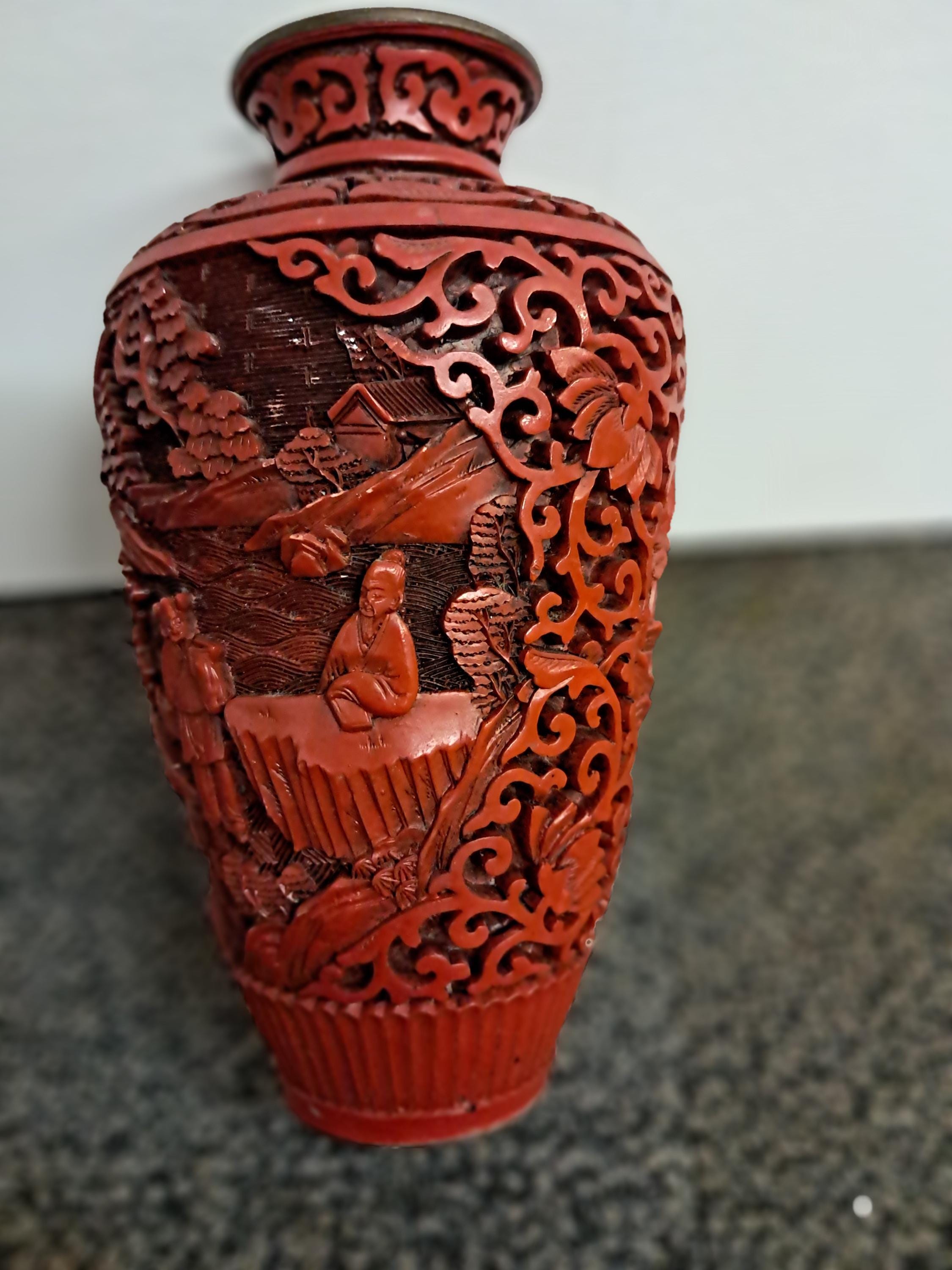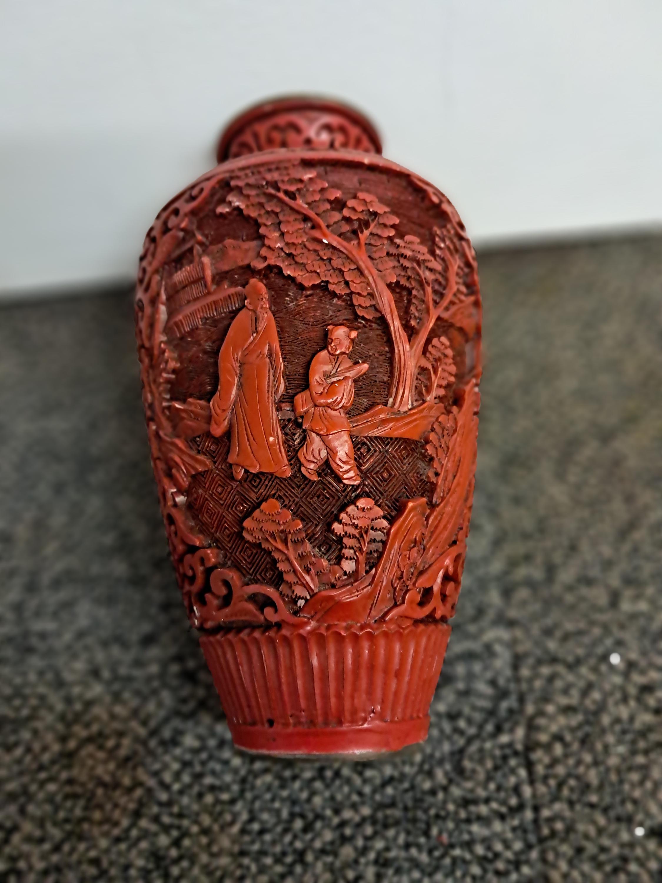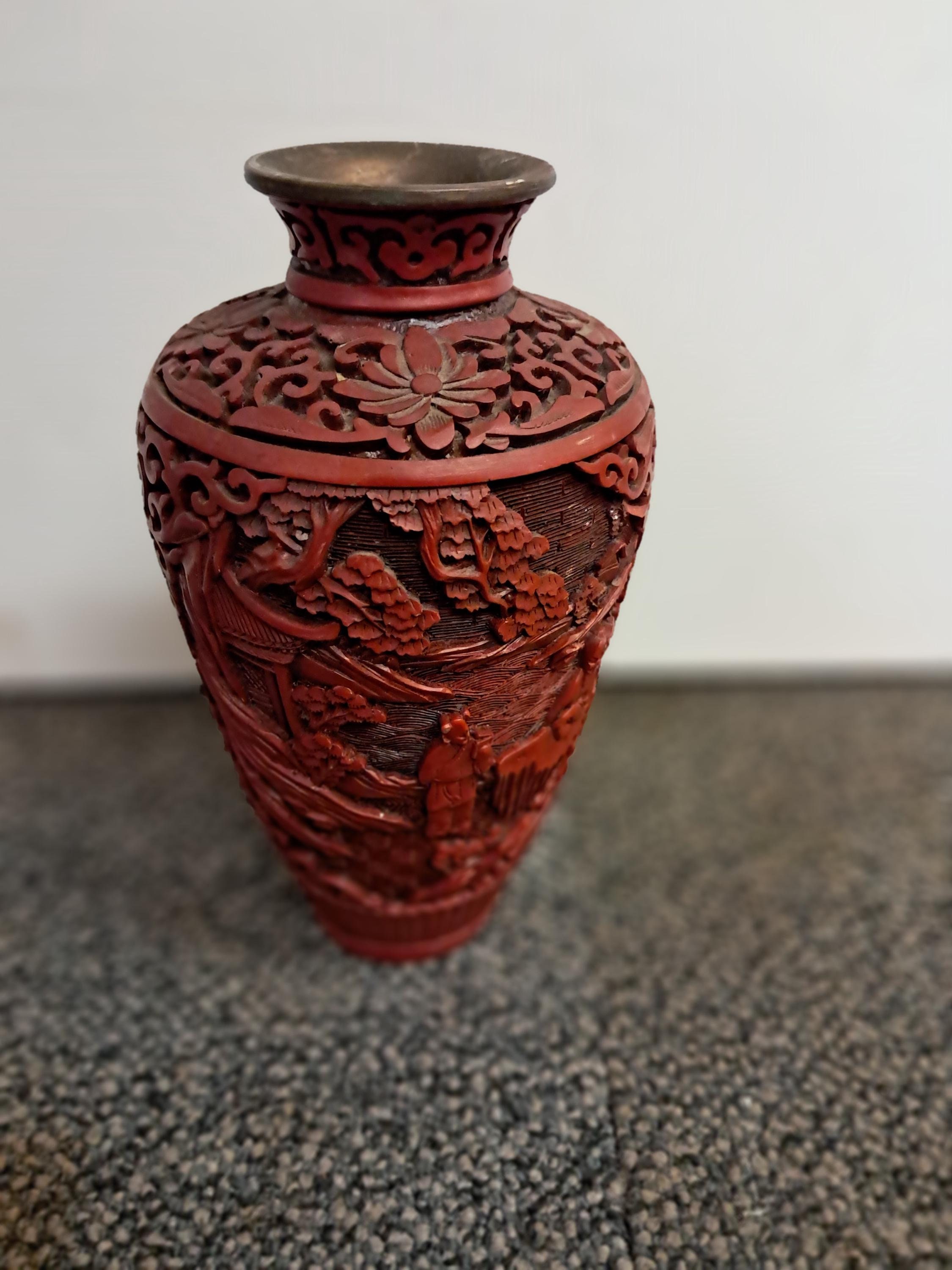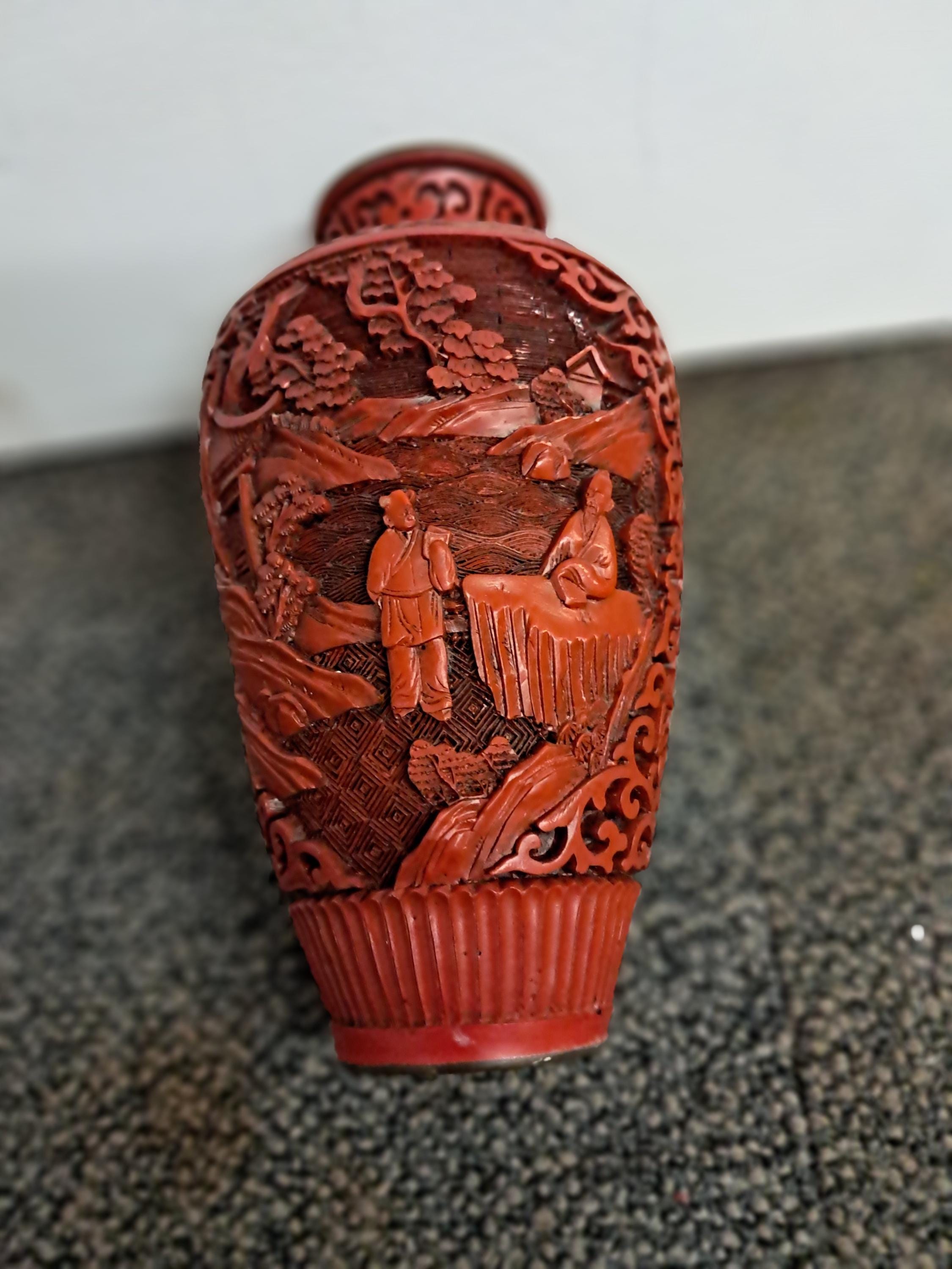 Antique Red Chinese Cinnabar Relief Lacquer Gourd Shaped Vase .Replica