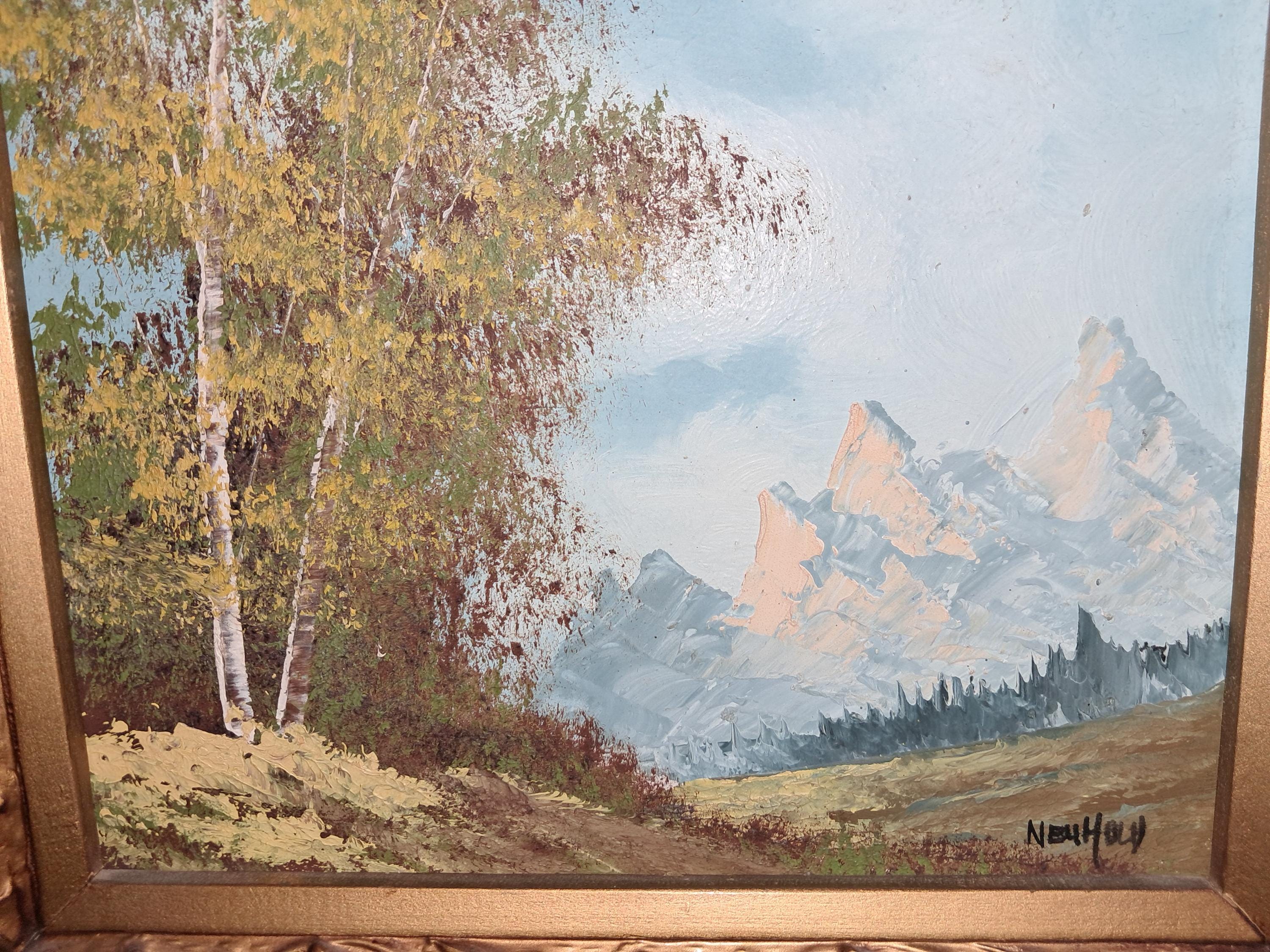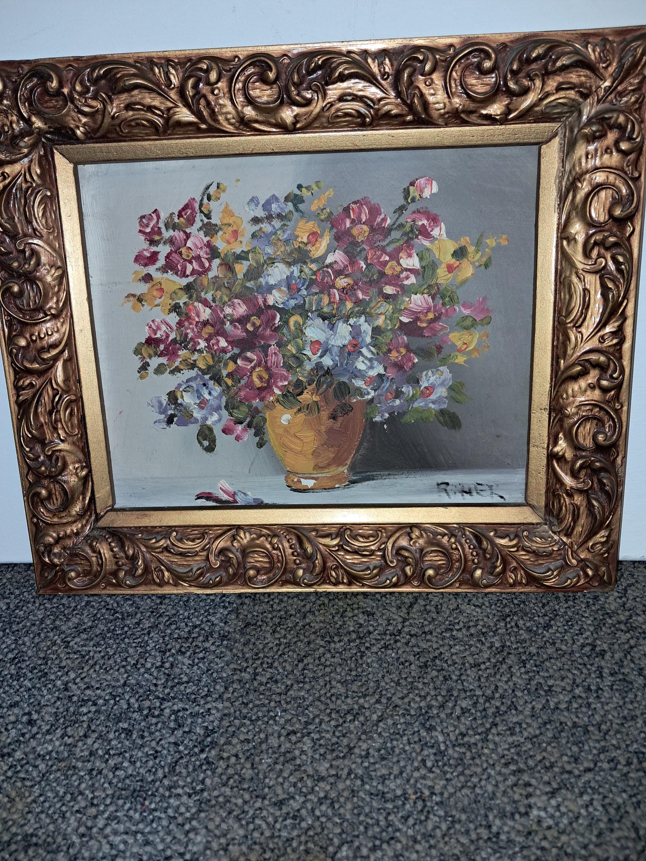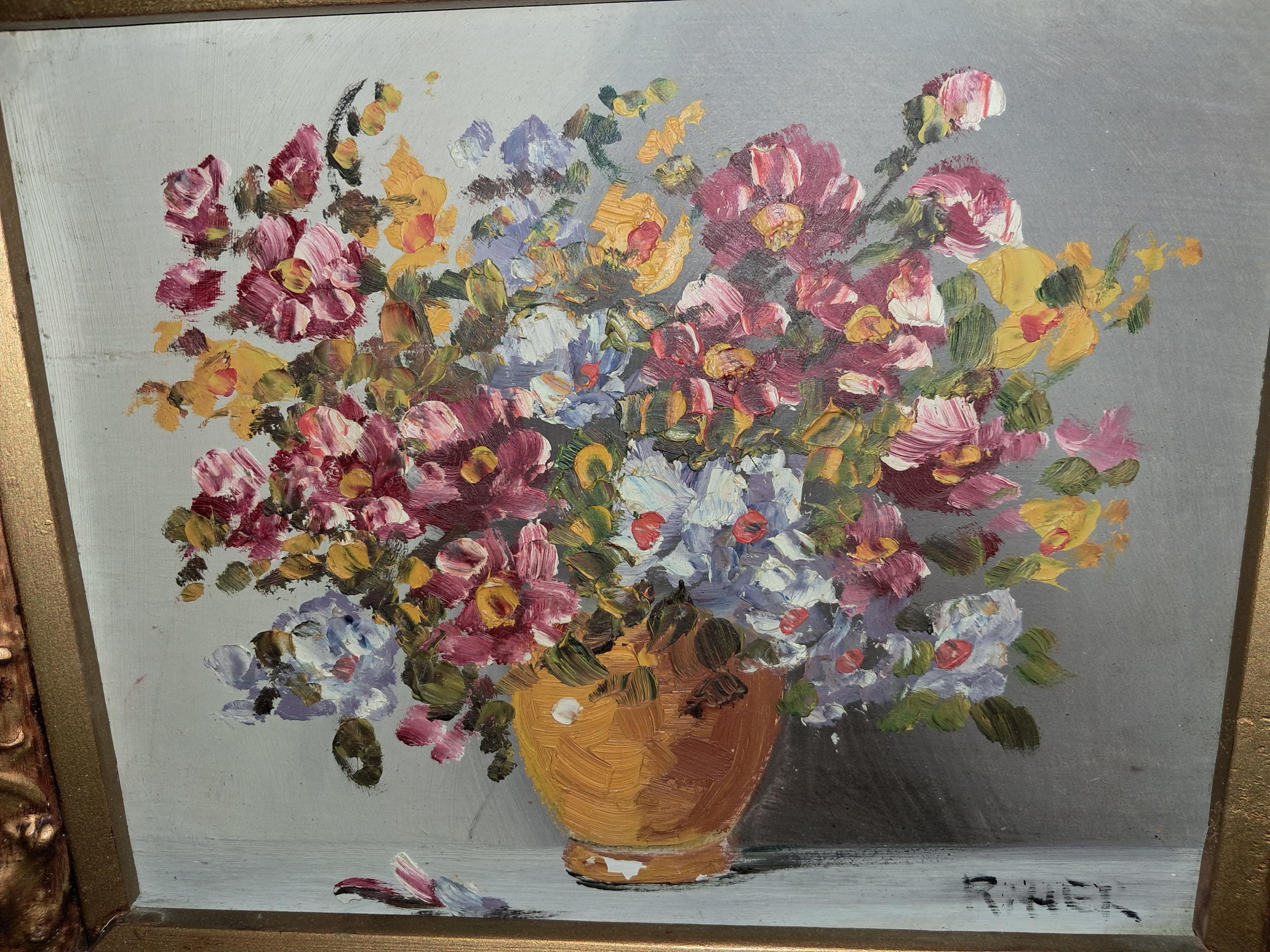 Bouquet of Flowers in Vase And Fall Landscape Oil Painting on Board
