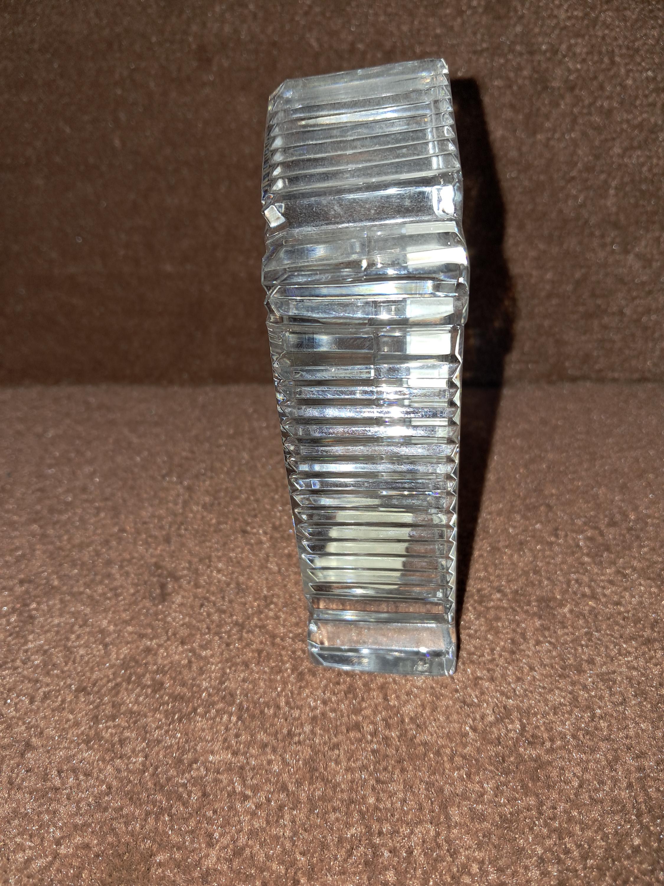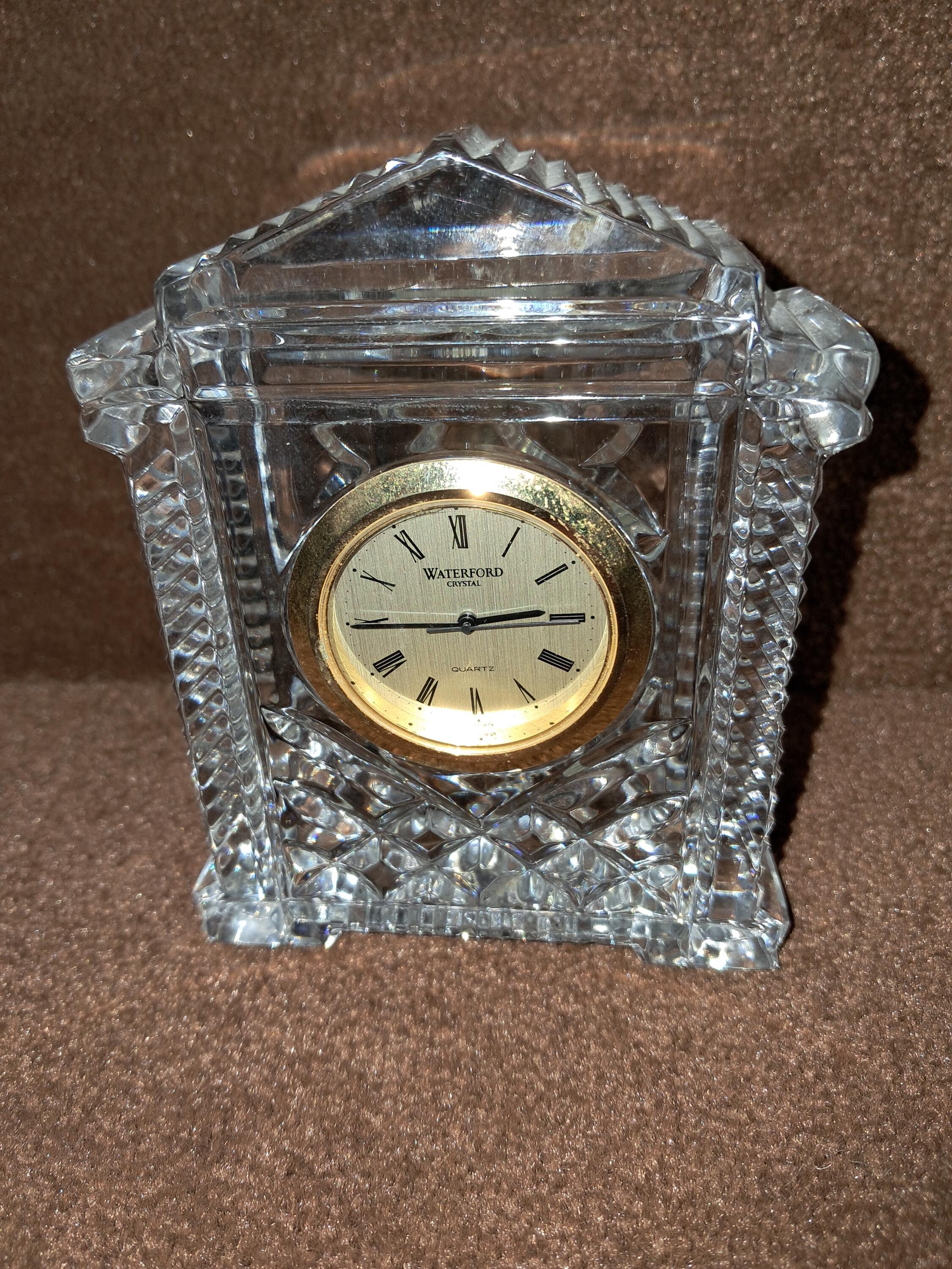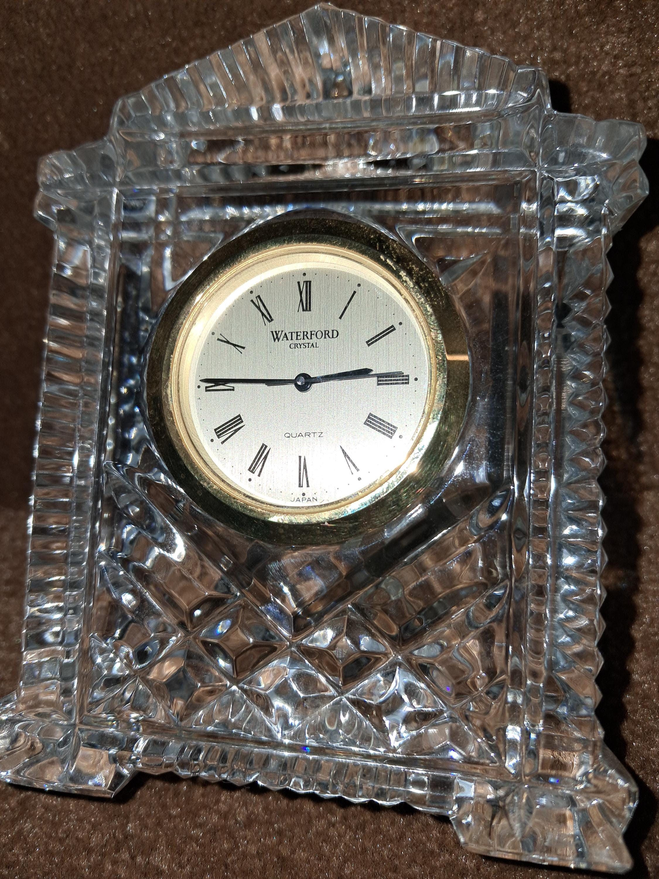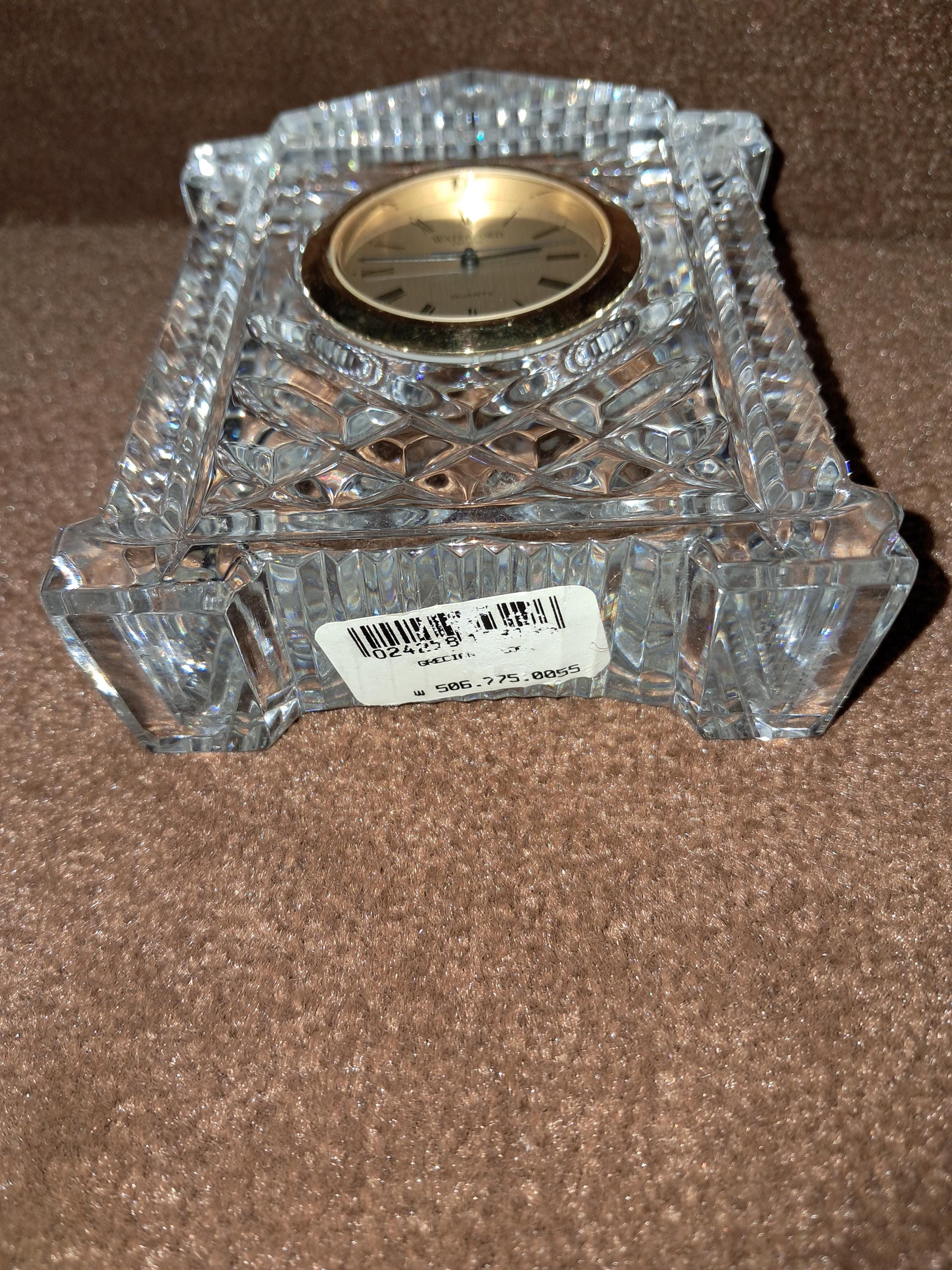 Waterford Crystal 'Lismore' desk clock having diamond & wedge cuts, with a Japanese rhythm watch movement. Stamped with an acid etched mark & with original sticker. Condition good, No sign of wear to the base, working order. 4.5" tall x 3.5 " wide x 1.25" deep