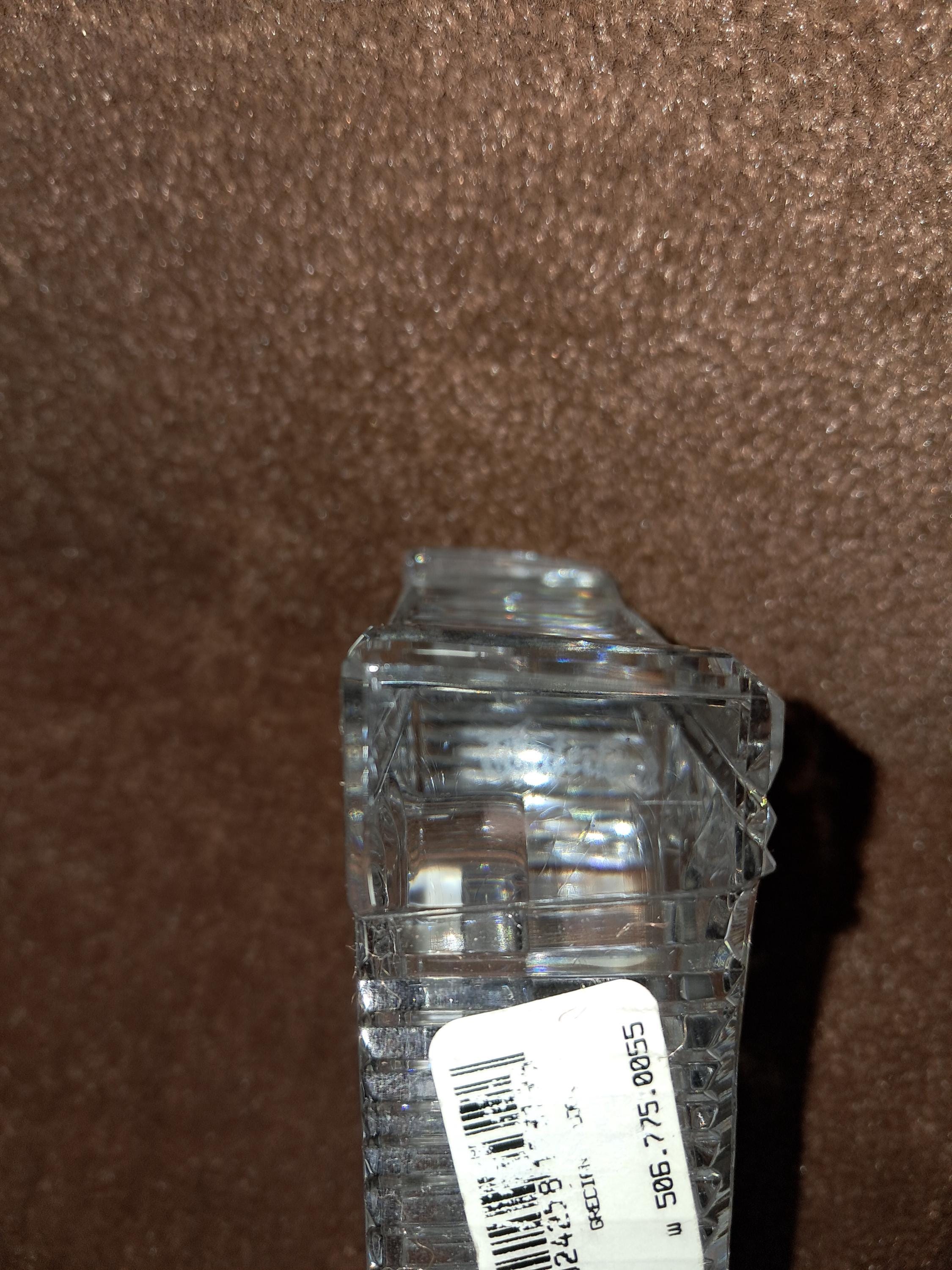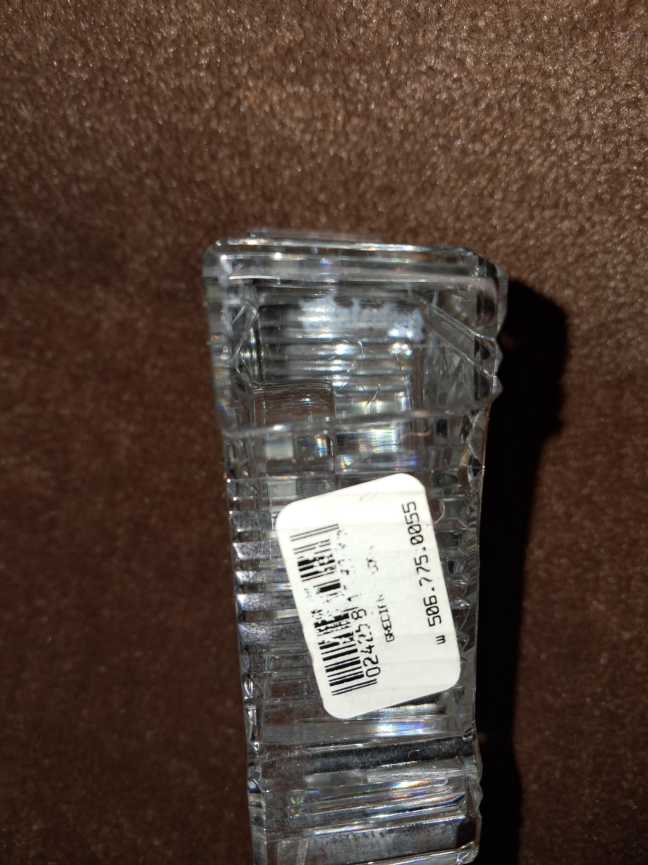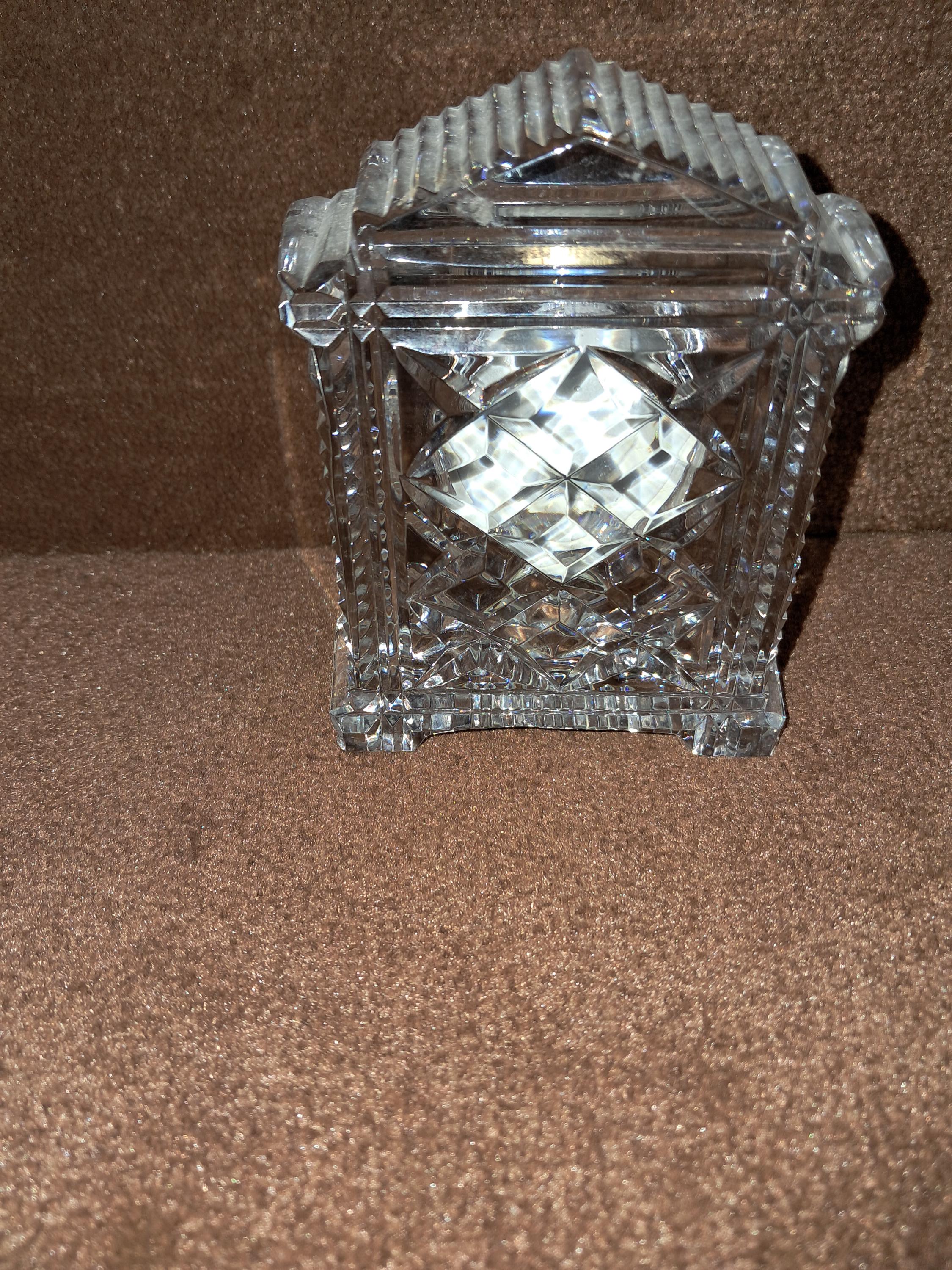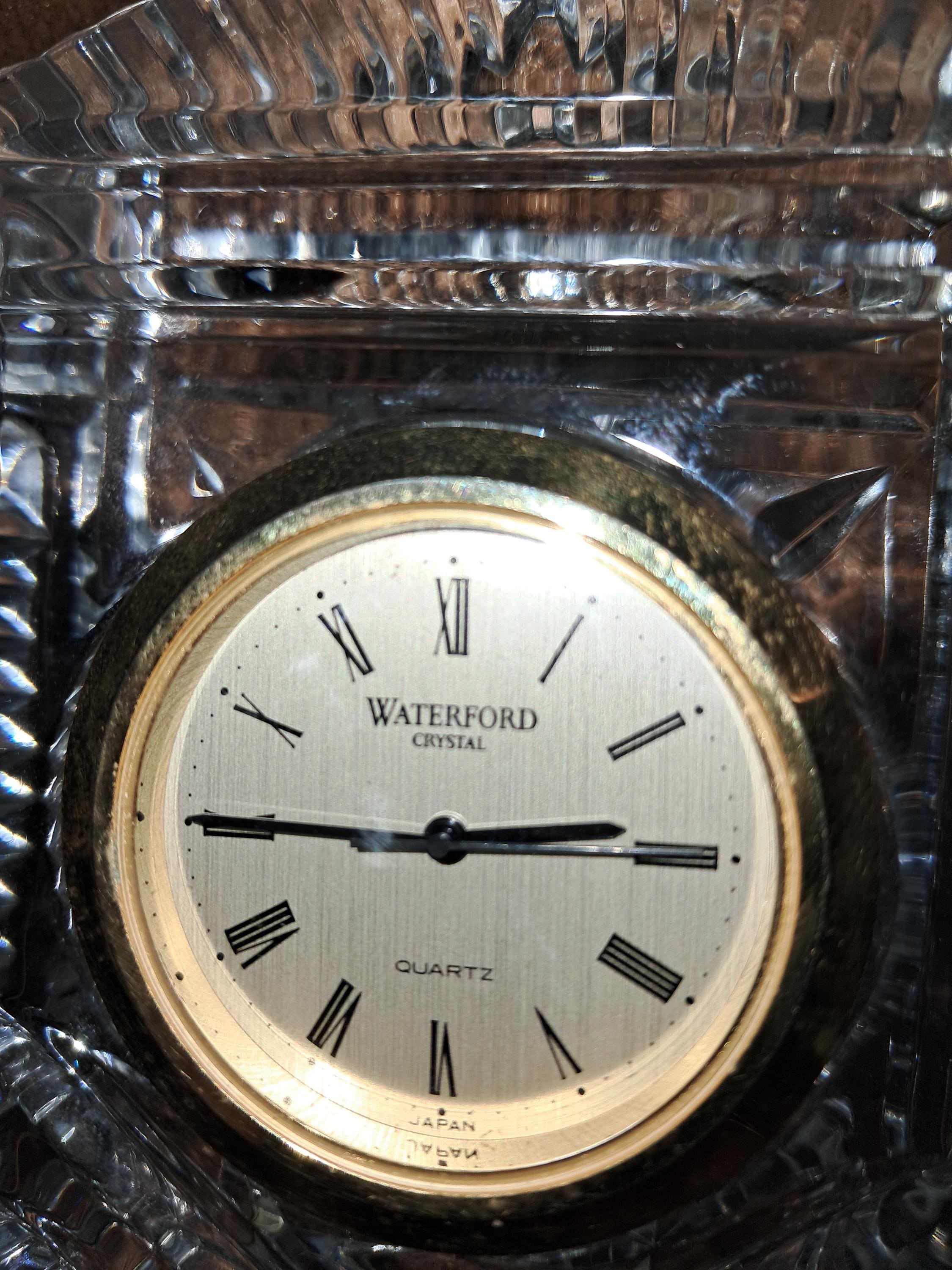 Waterford Crystal 'Lismore' desk clock having diamond & wedge cuts, with a Japanese rhythm watch movement. Stamped with an acid etched mark & with original sticker. Condition good, No sign of wear to the base, working order. 4.5" tall x 3.5 " wide x 1.25" deep