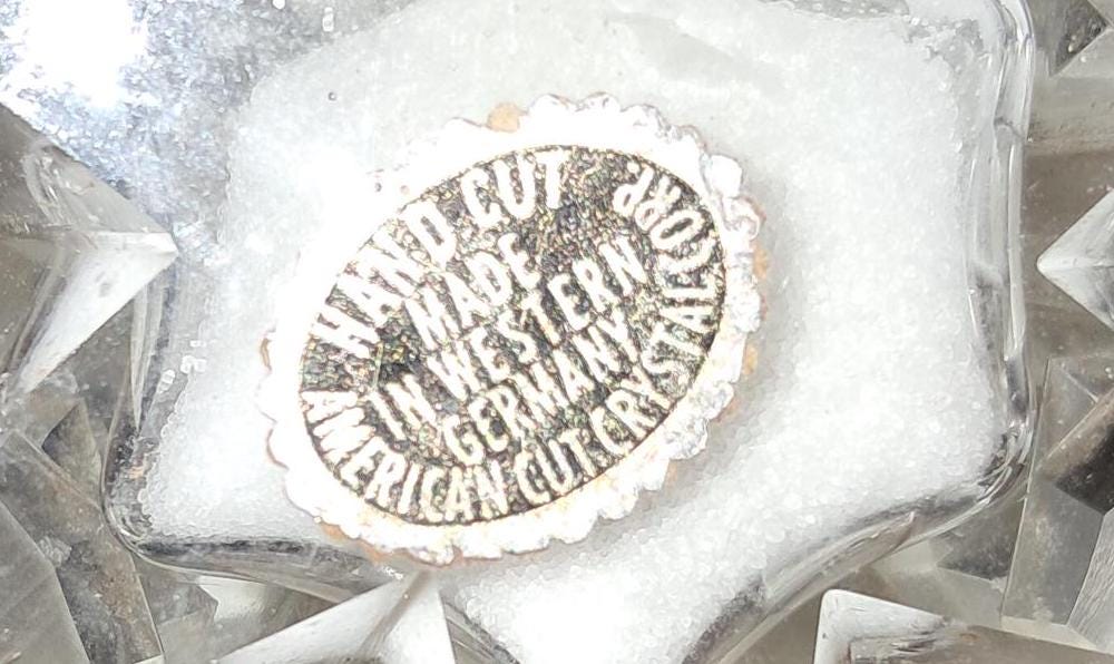 This set of hand cut clear glass salt and pepper shakers are from American Cut. They have an octagonal, star shaped base with a cross-hatch design to the glass. Metal screw on lids. Original foil stickers on each. Date to the late 1970s.