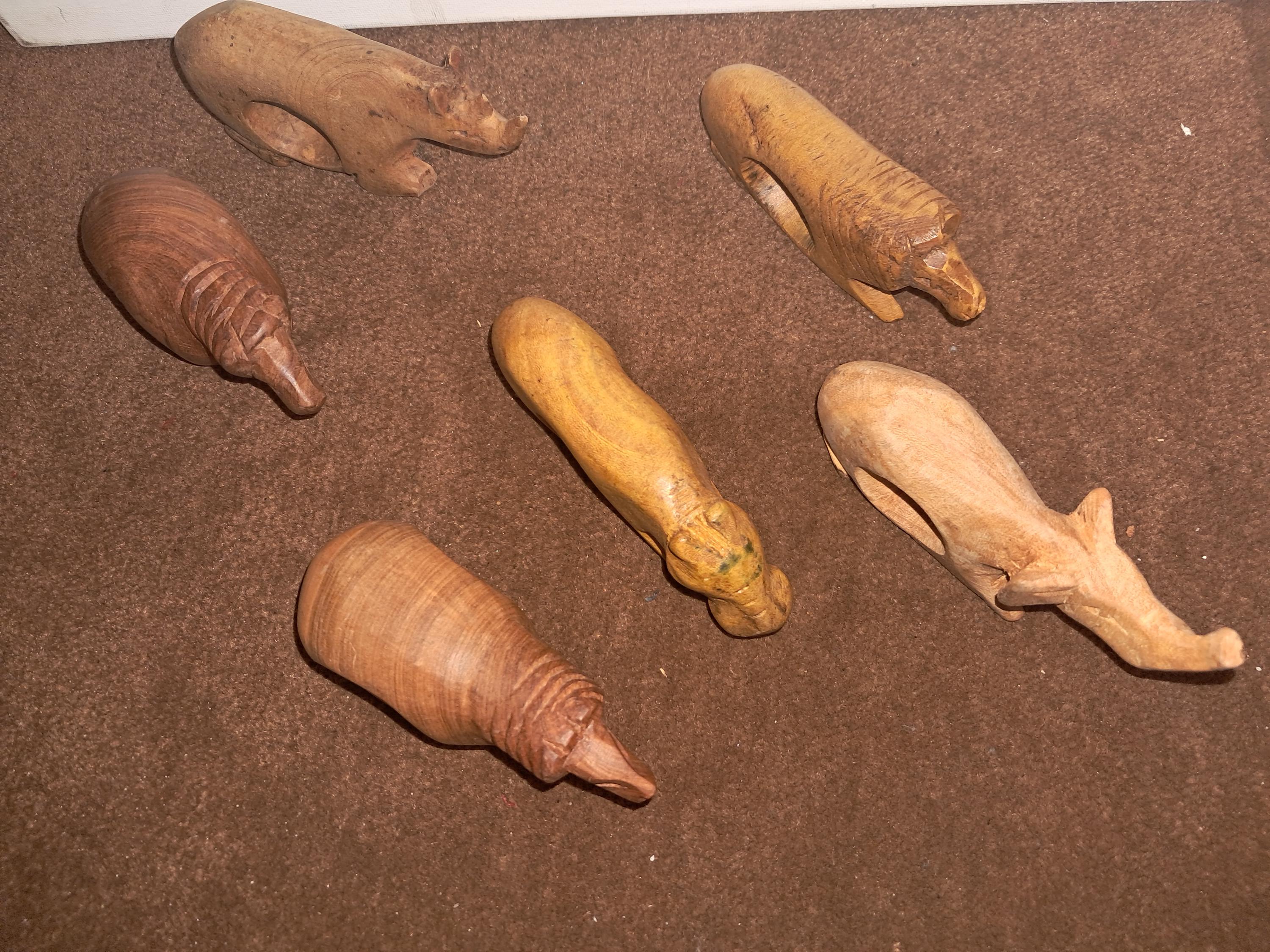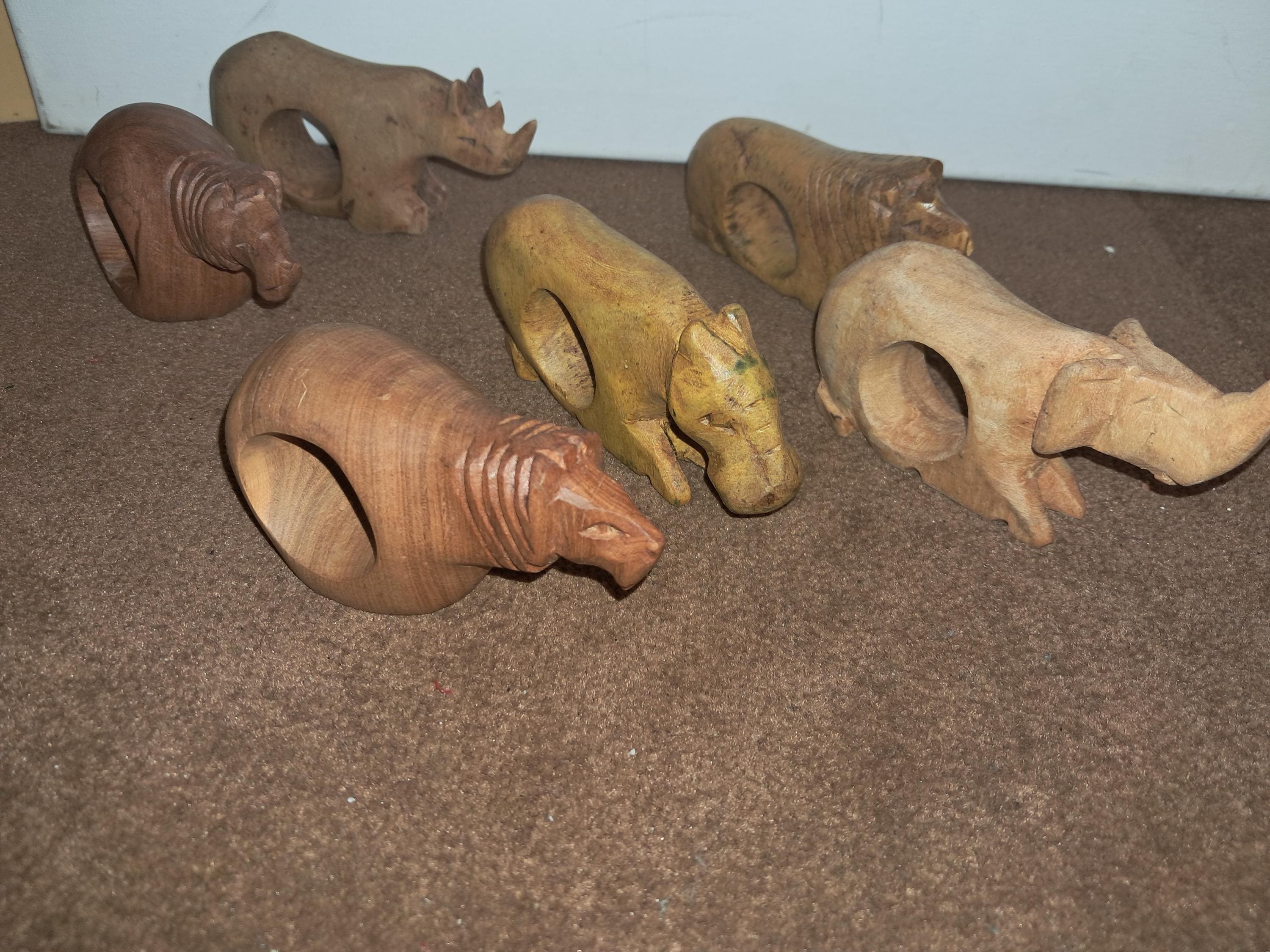 .Set of 6 vintage Hand Carved Wood African Safari Animal napkin ring holders. you get all 6 unique one of a kind wooden pieces '