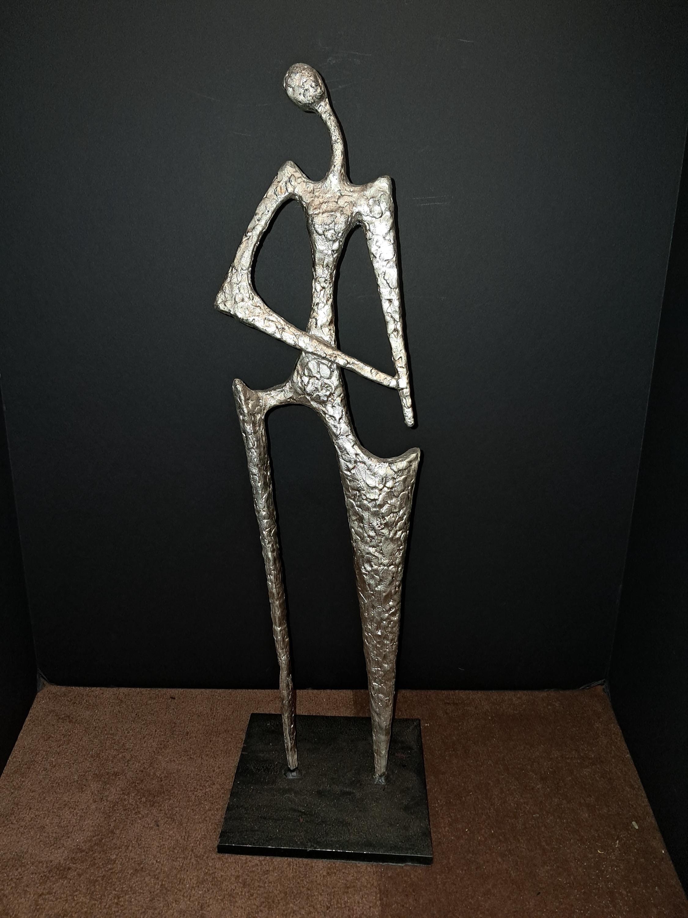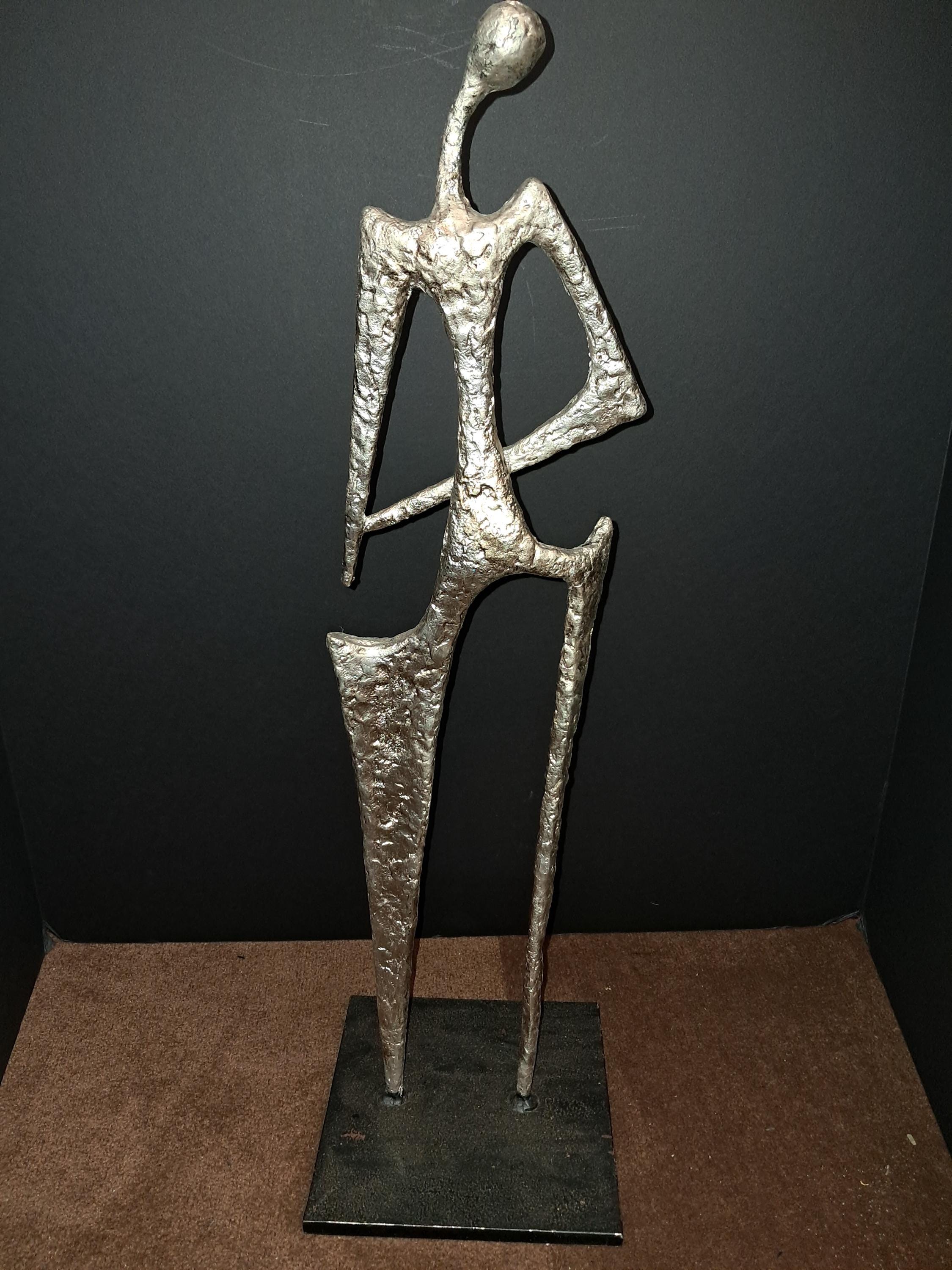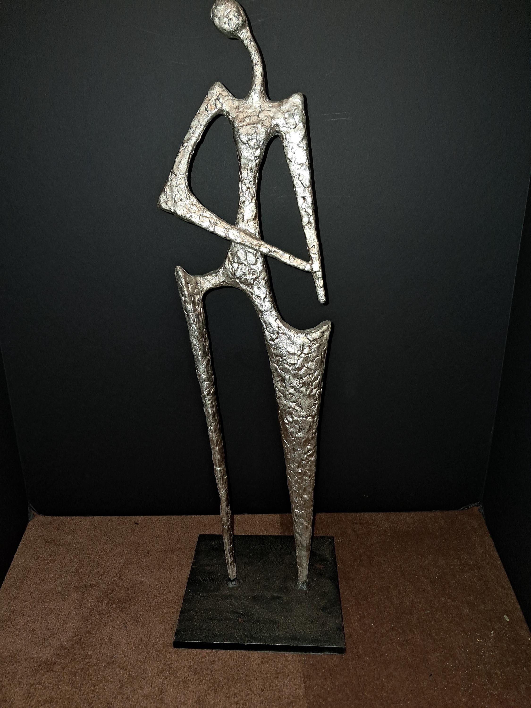 Hipster Lady Sculpture by Ann Conroy. in Silver PatinaHipster Lady Metal Sculpture Silver Finish Excellent Condition6.75W X 6.75D X 22.75H