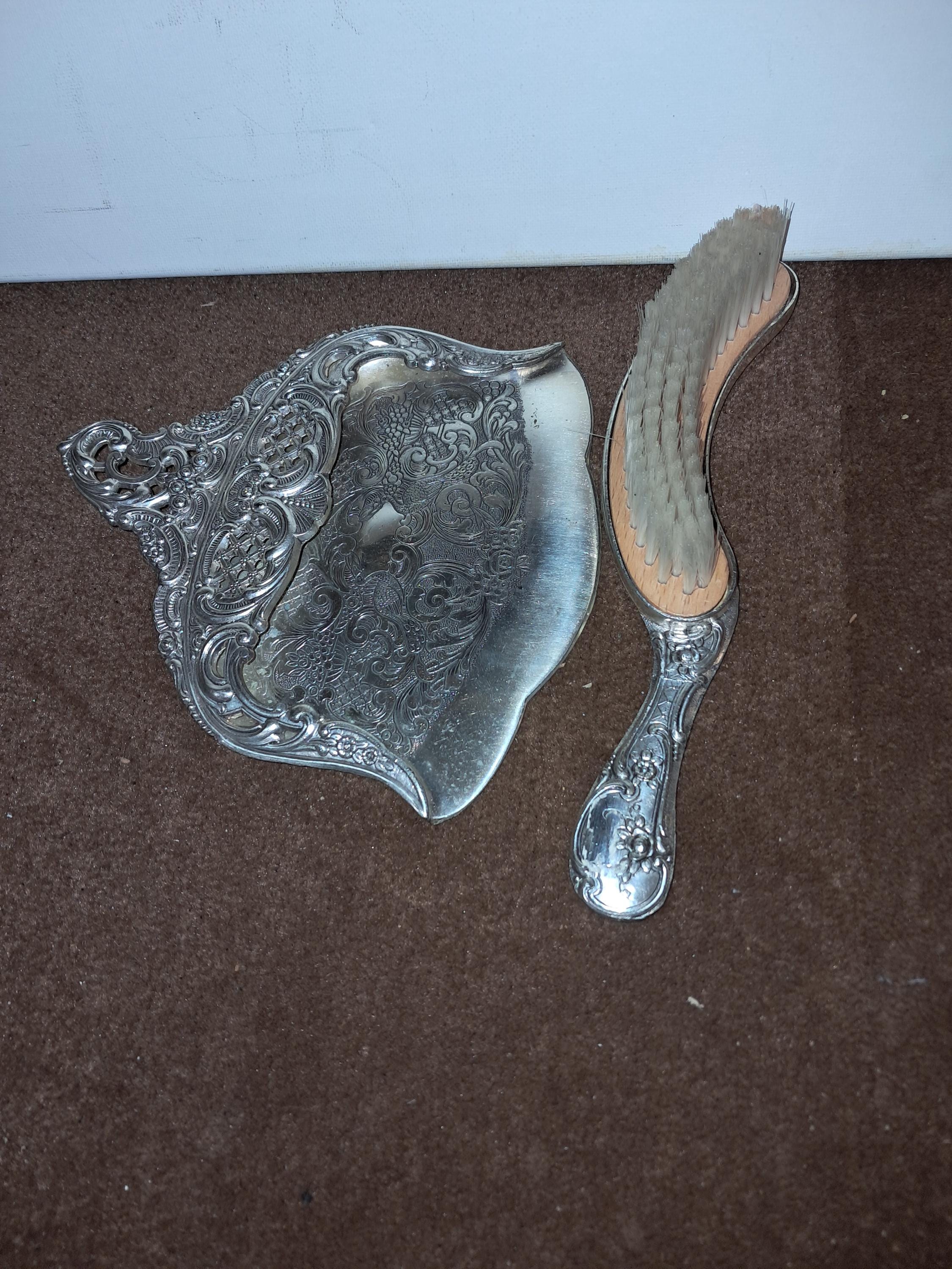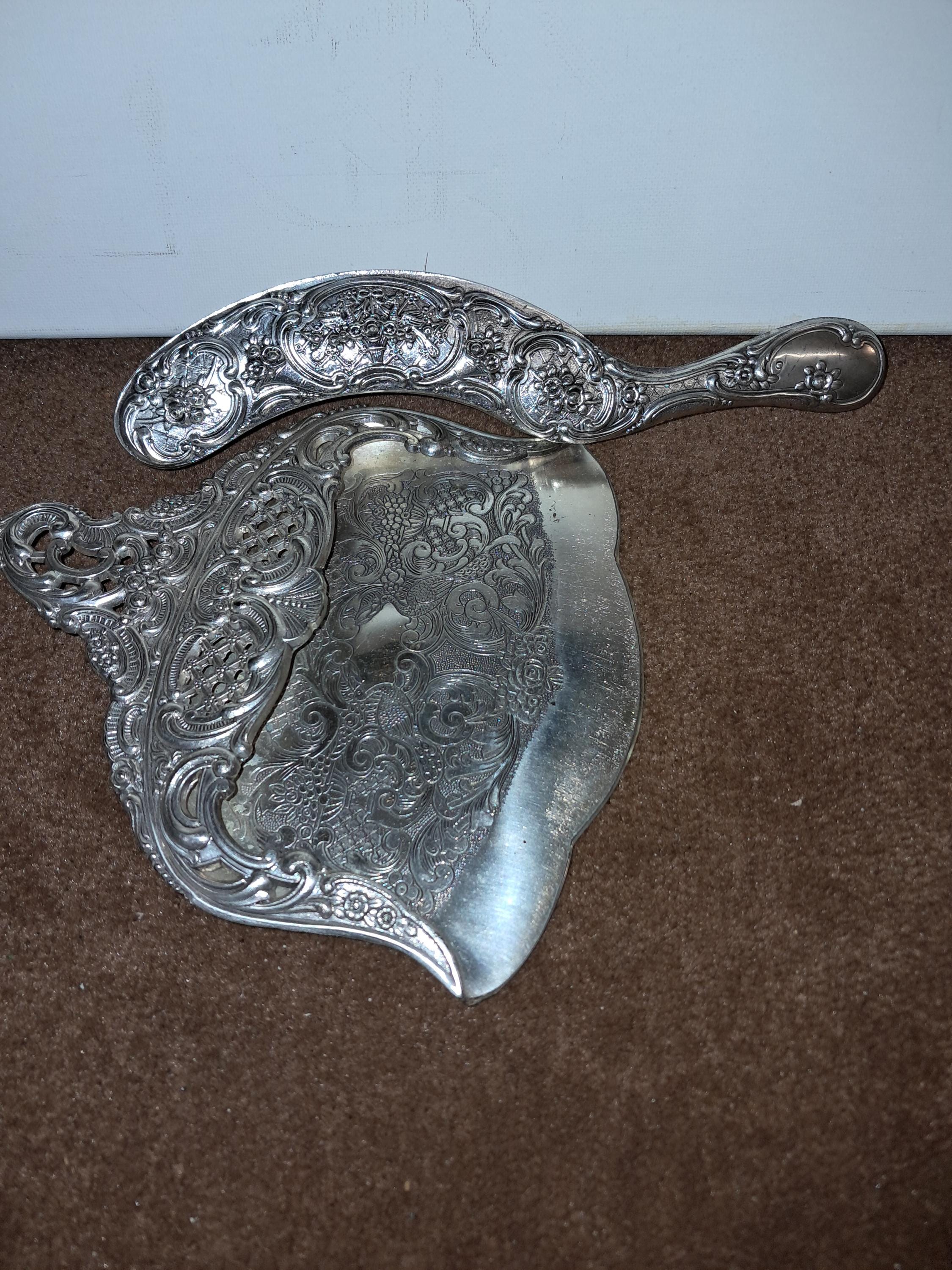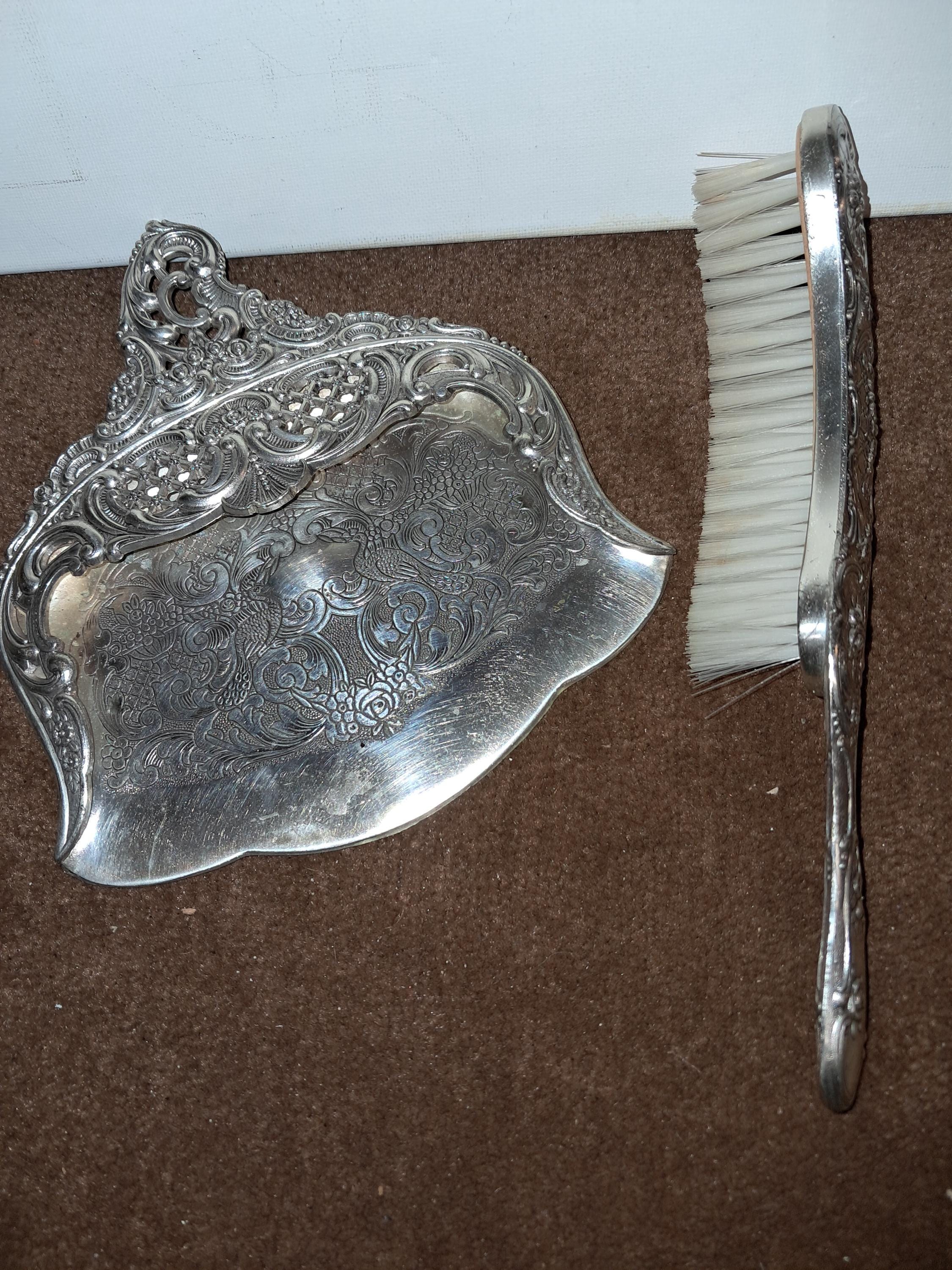 Antique Silver Plate Dustpan Tray & Brush for Crumbs Victorian Ornate Brush : 8.25" long x1.25" wide. 1: Brush Dustpan : 6" wide x 6.5" tall x 1" deep Made In Japan Condition : Excellent