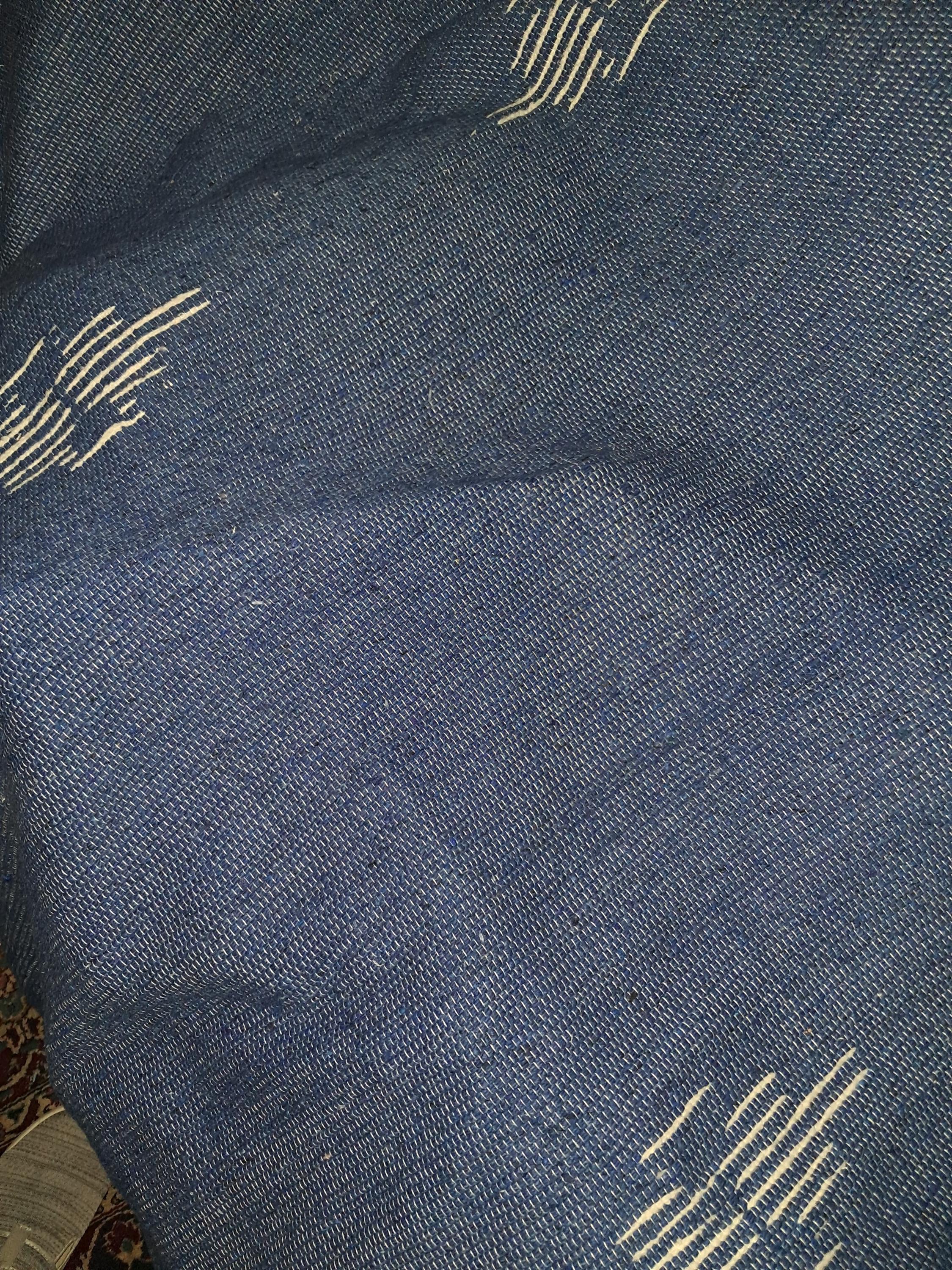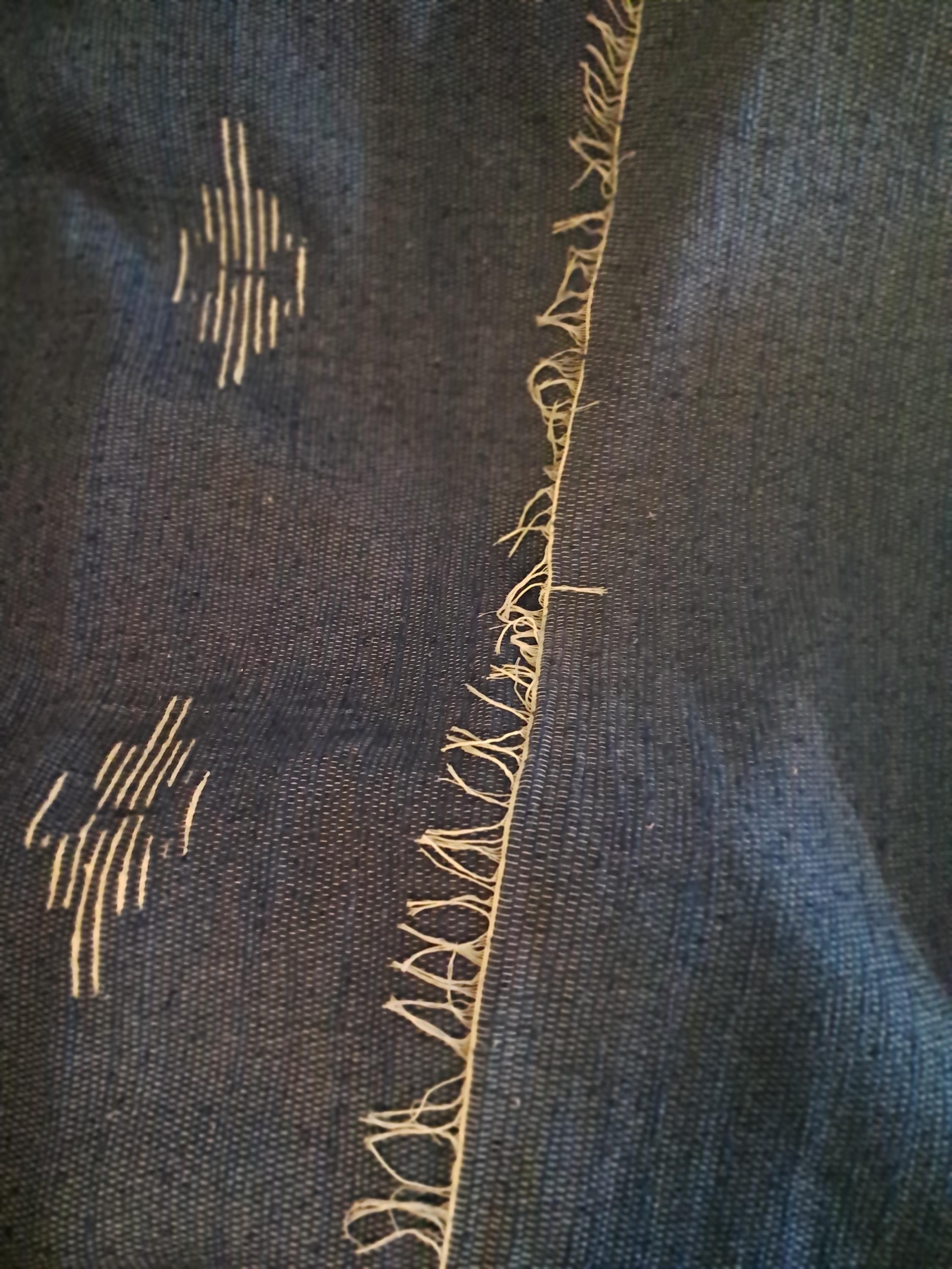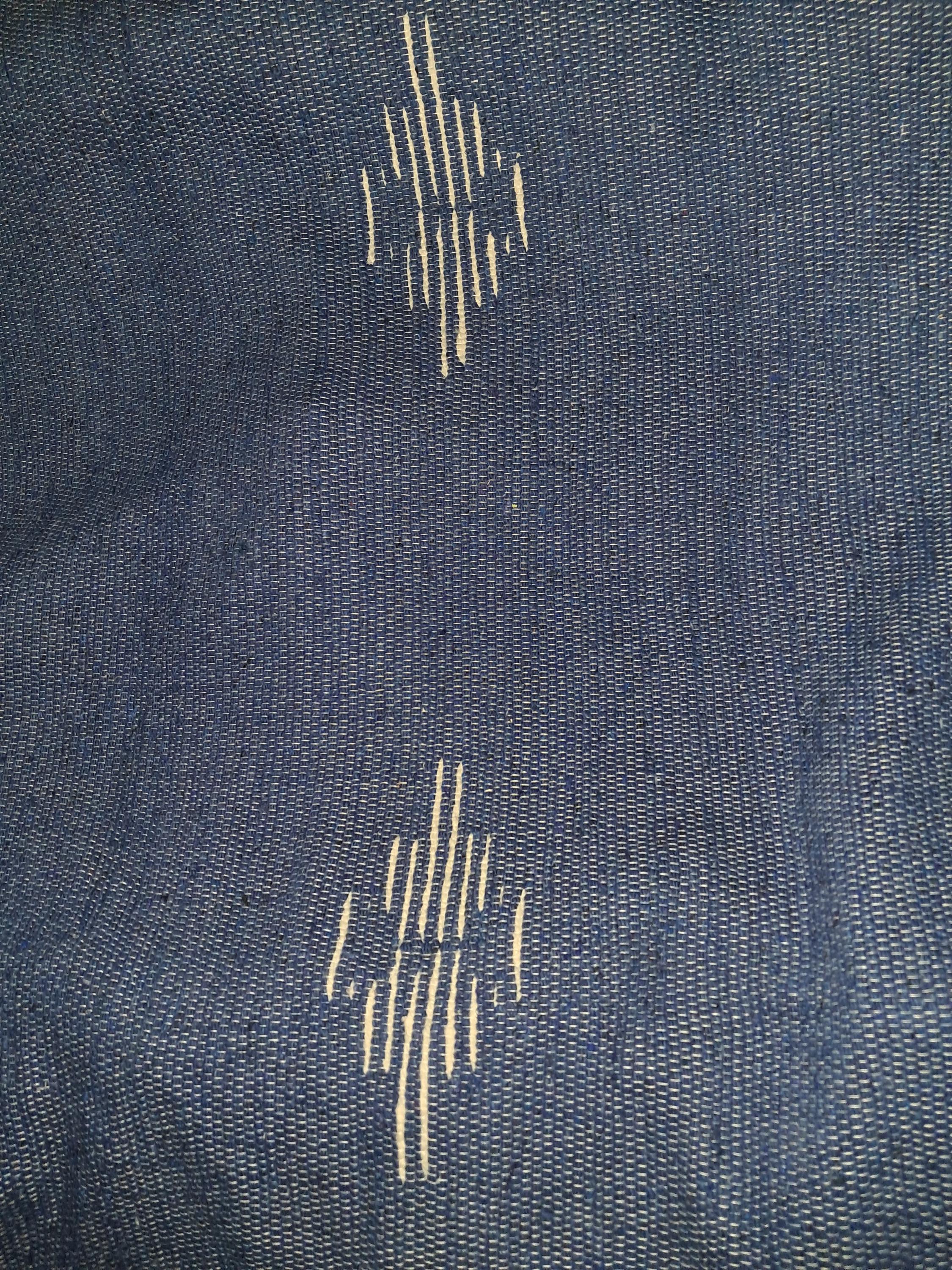 Kurume Kasuri is primarily woven using a basic weave called "Hiraori" (plain weave). Its defining feature lies in the expression of patterns through the "knotting" technique. To accentuate this technique, the weaving structure is kept simple. By introducing variations in the density of warp and weft threads within the framework of plain weave, the optimization of color between warp and weft threads is achieved. While typically warp threads reflect color more prominently, in this fabric, weft threads are designed to reflect color more vividly while the warp threads serve as accents, creating intricate color intersections. The warp threads incorporate "Kasuri" patterns created through knotting techniques, which led to a departure from the plain "Mix Slub" pattern, enabling greater freedom in pattern expression.