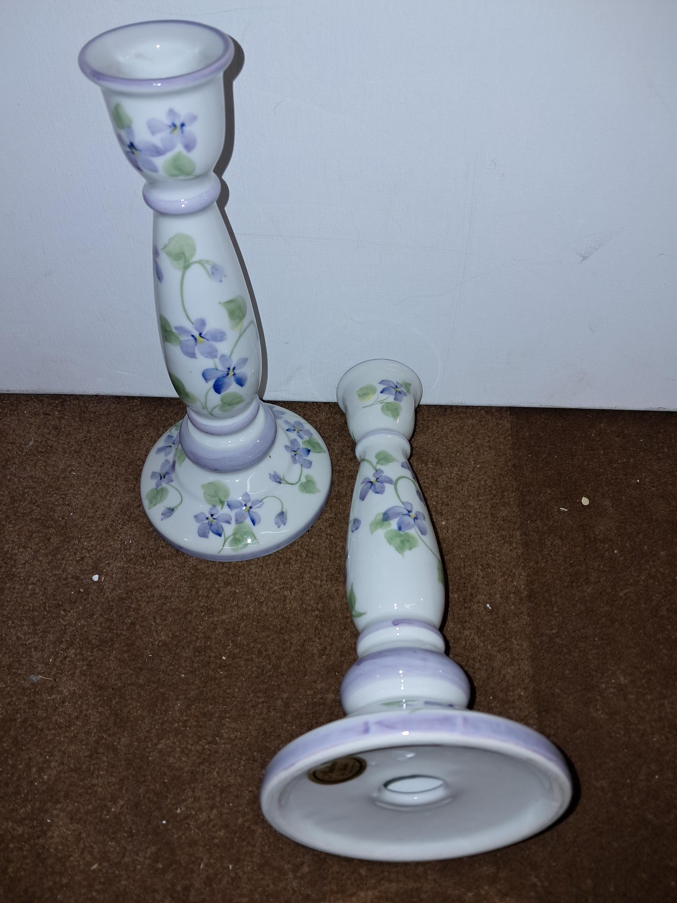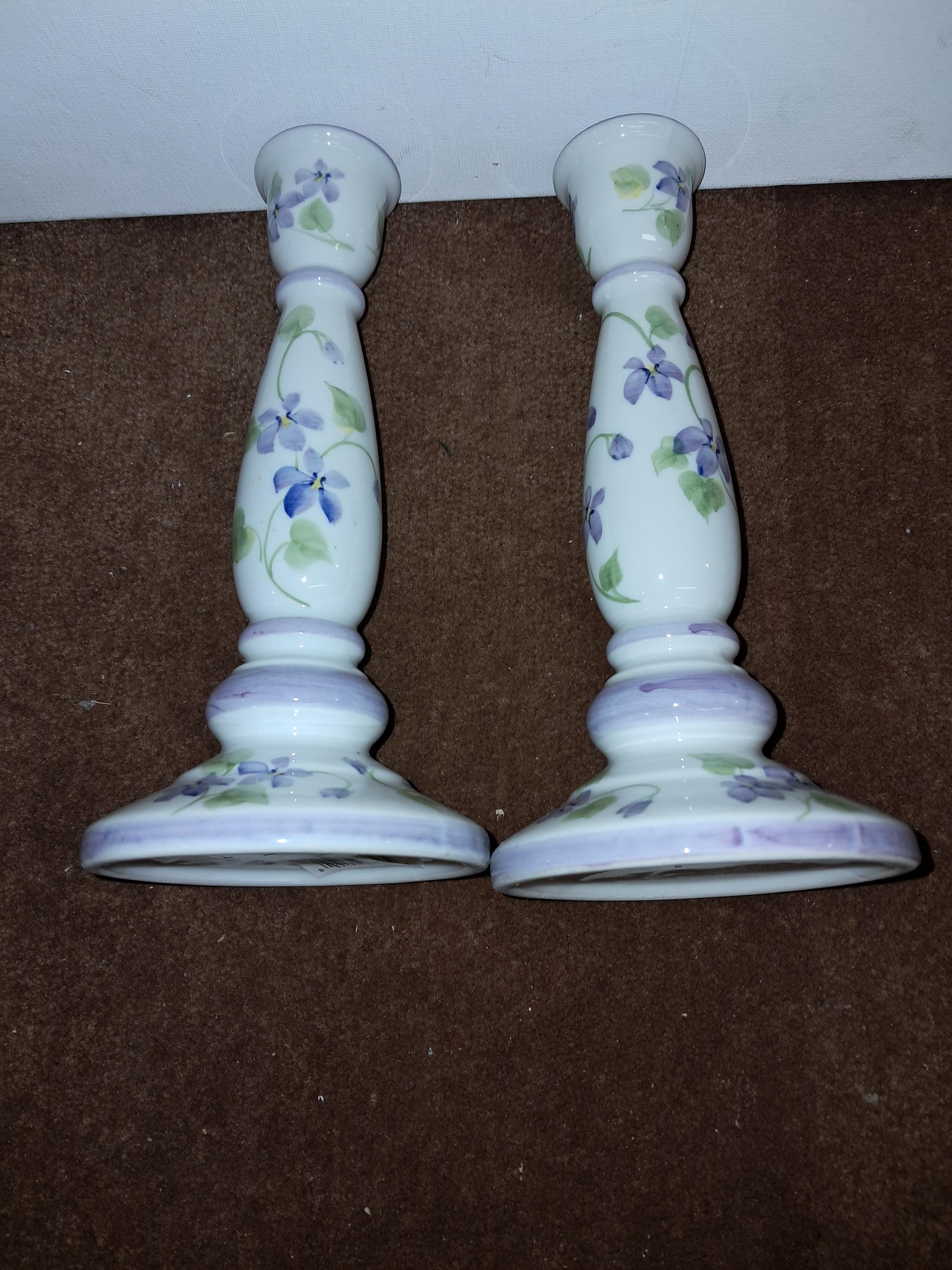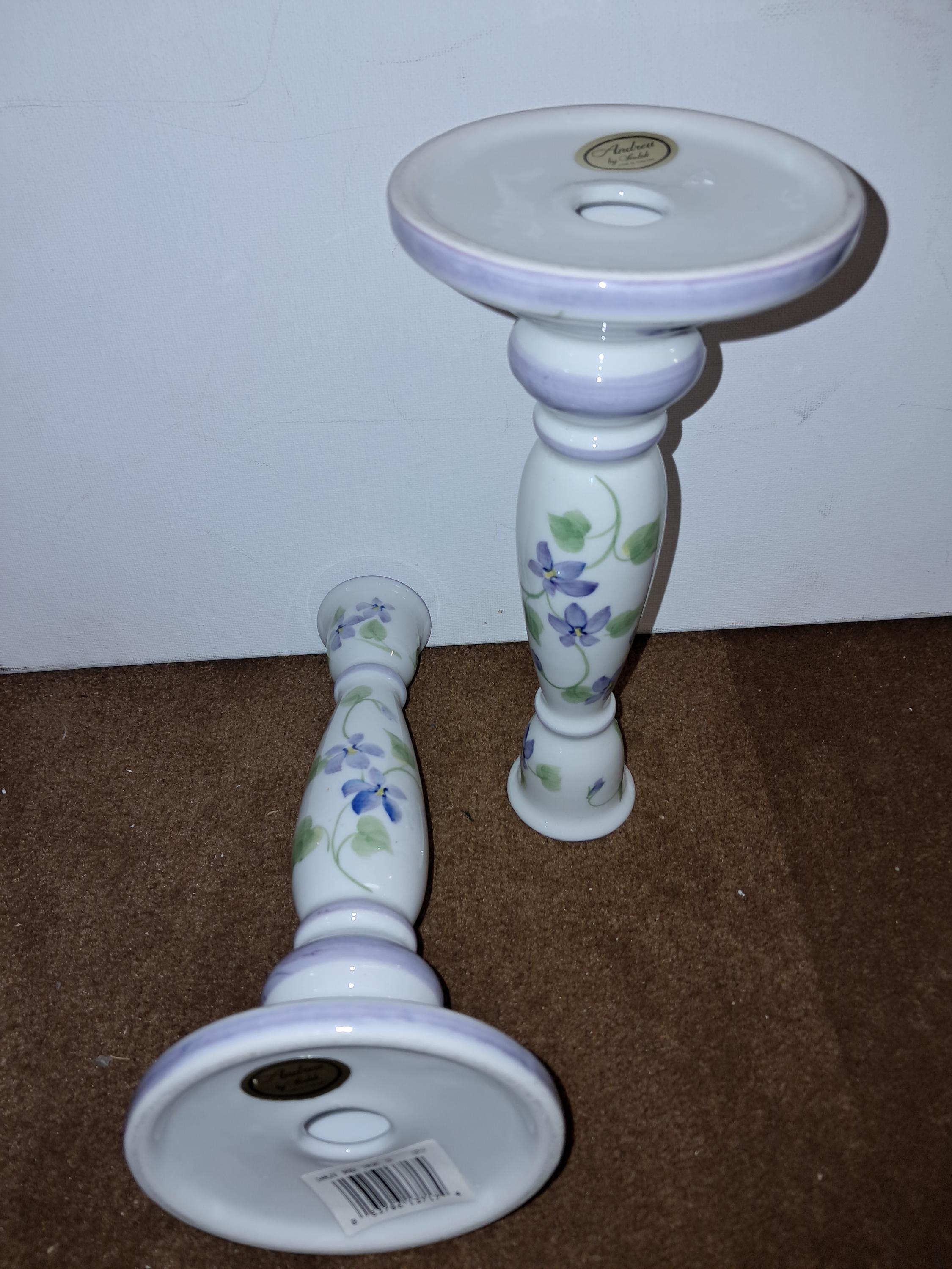 Andrea by Sadek Candle Holders White surface with Purple color flowers Ceramic8" tall x 3.75" at base Excellent Condition , Never used
