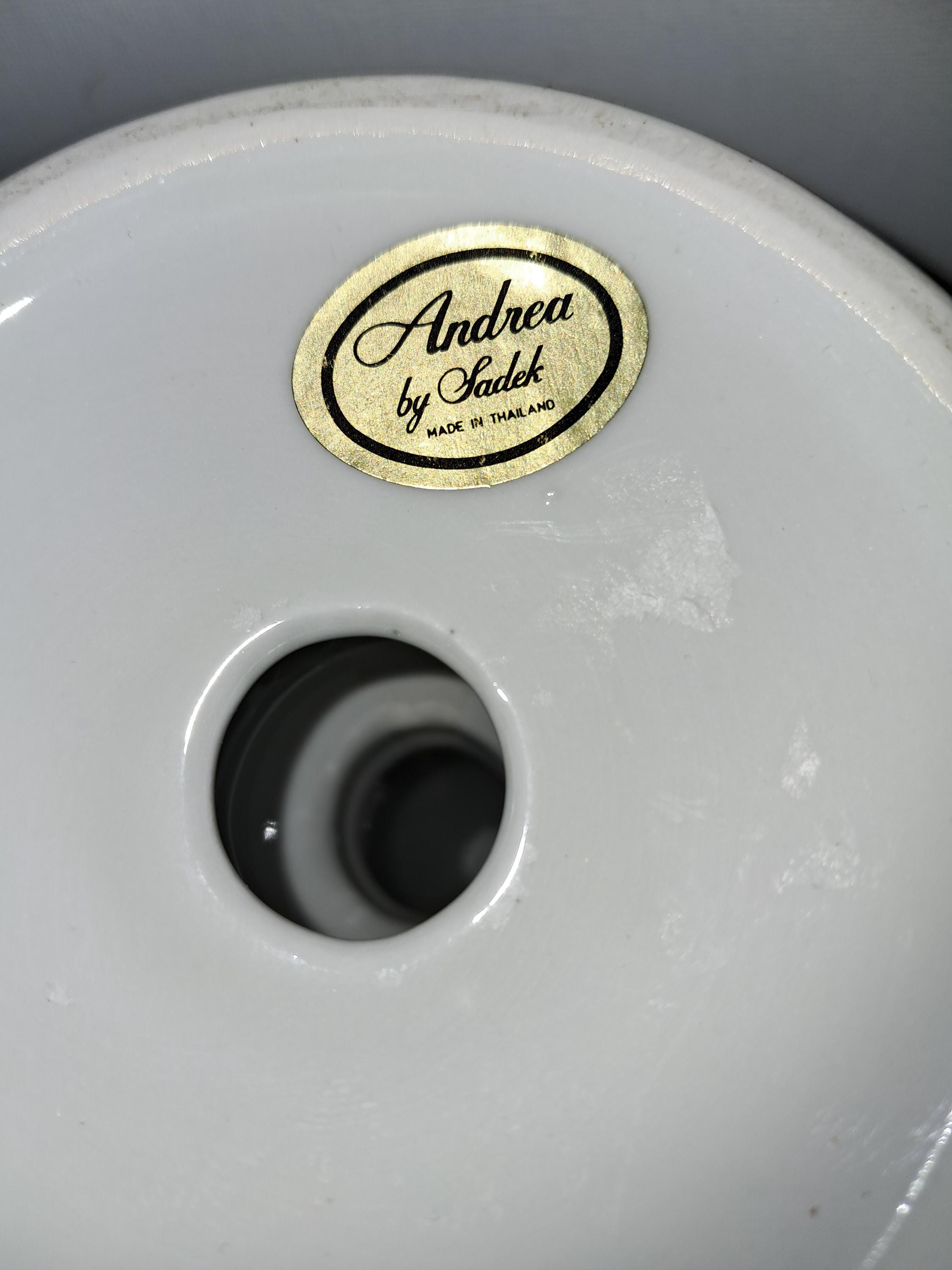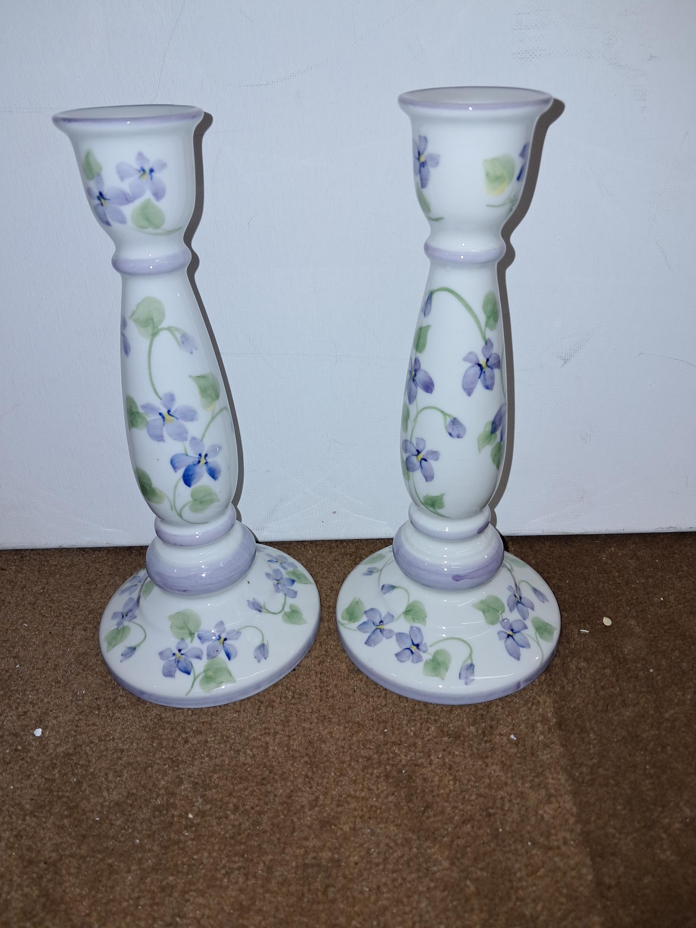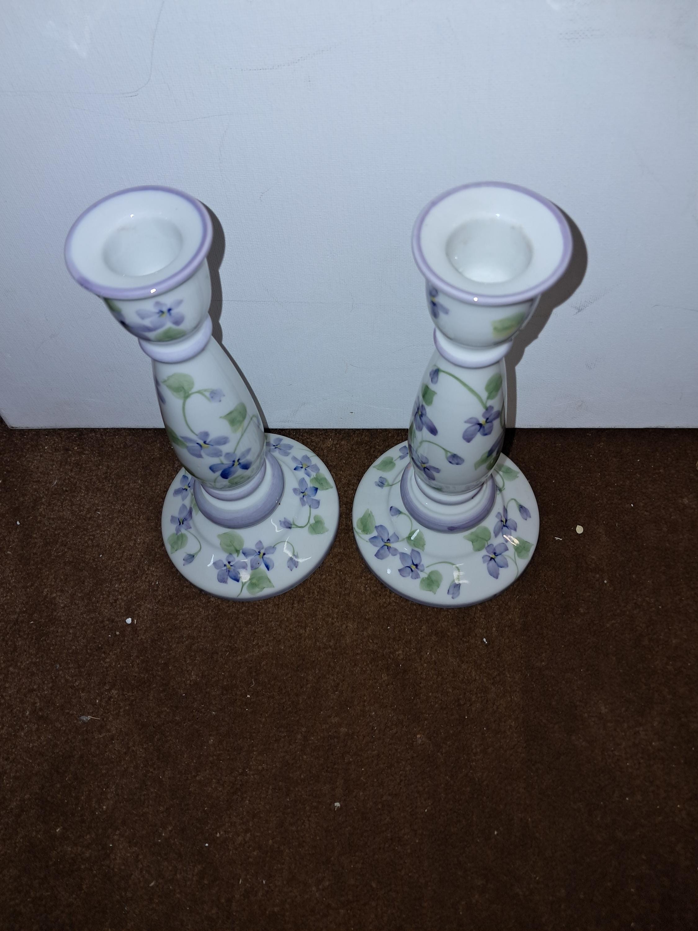 Andrea by Sadek Candle Holders White surface with Purple color flowers Ceramic8" tall x 3.75" at base Excellent Condition , Never used