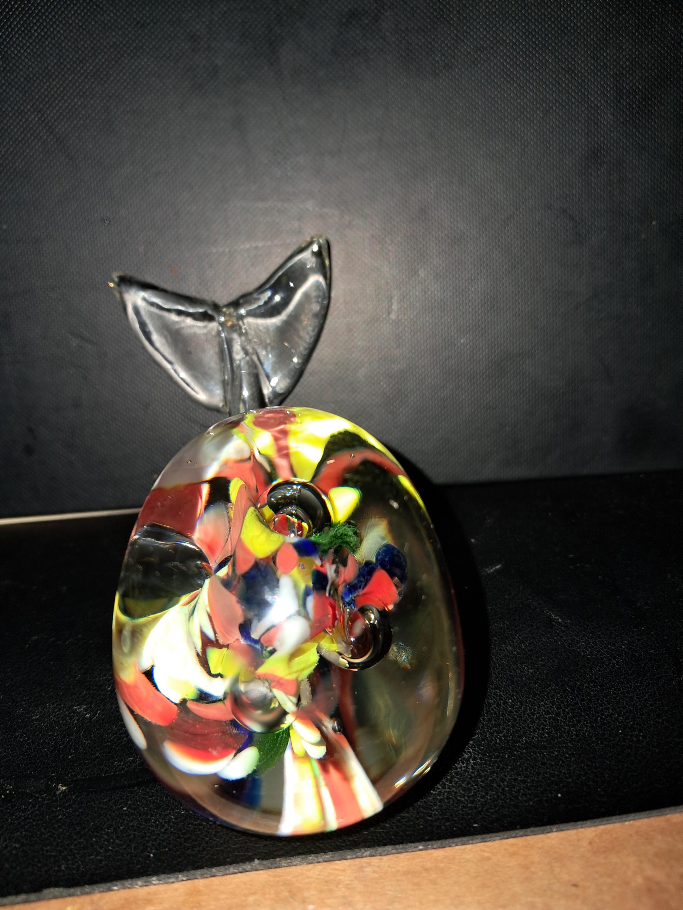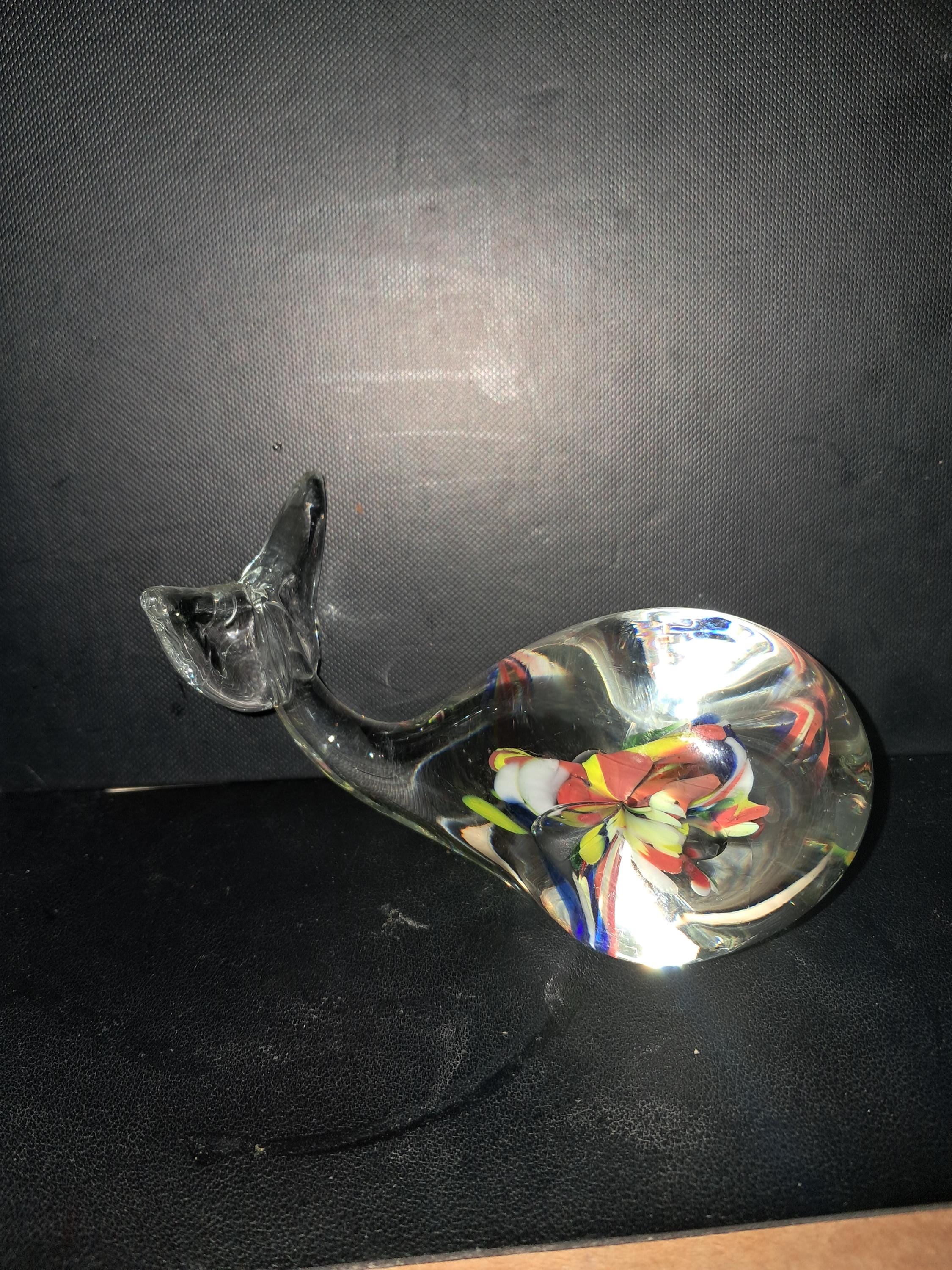 vintage glass whale paperweight Martha's VineyardArt Glass Whale paperweight with flower scene inside4.25 " wide x 1.75" deep x 2.25" tallExcellent condition with No damages