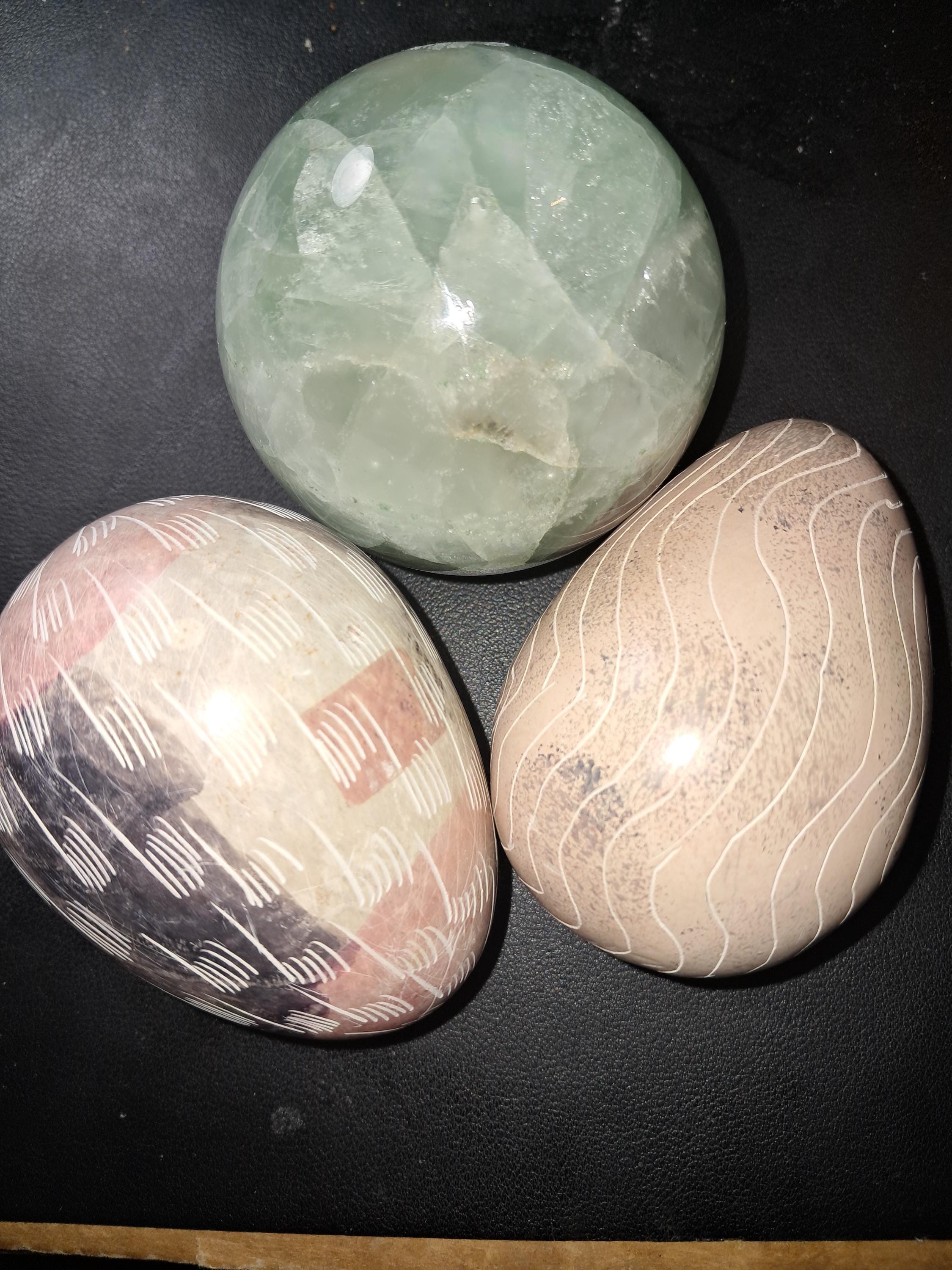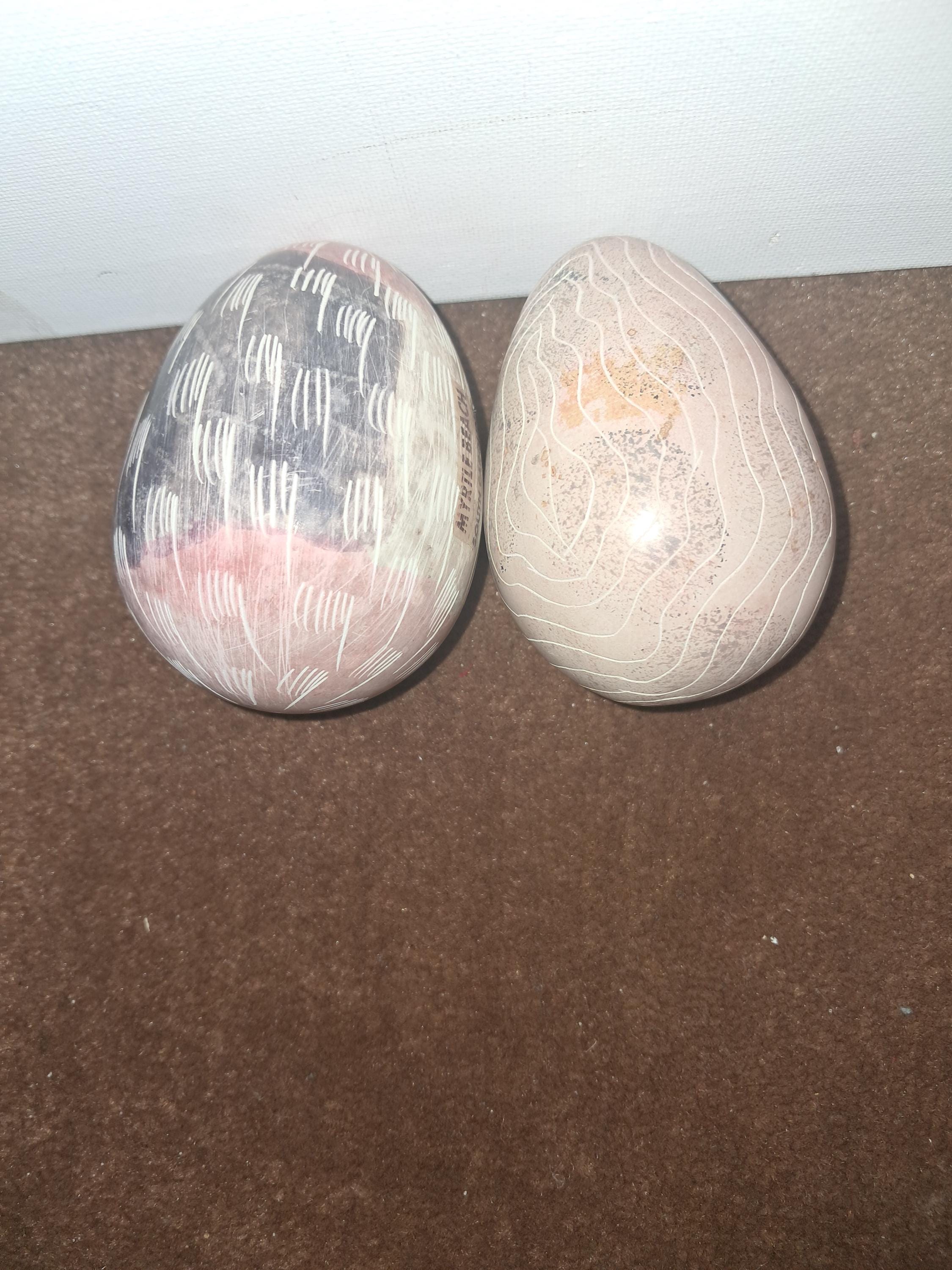 This set of two (2) hand carved African eggs are vintage carved stone eggs. The black , pink and off white egg has etched designs. One black egg with repeating design, and one pinkish red egg with a Wavy design. These African Folk Art eggs will make a beautiful accent in your vintage boho home decor. The black egg measures 2.50" tall, the pink egg measures 2.25" tall. Please look at the photos and contact with any questions you may have. No damages