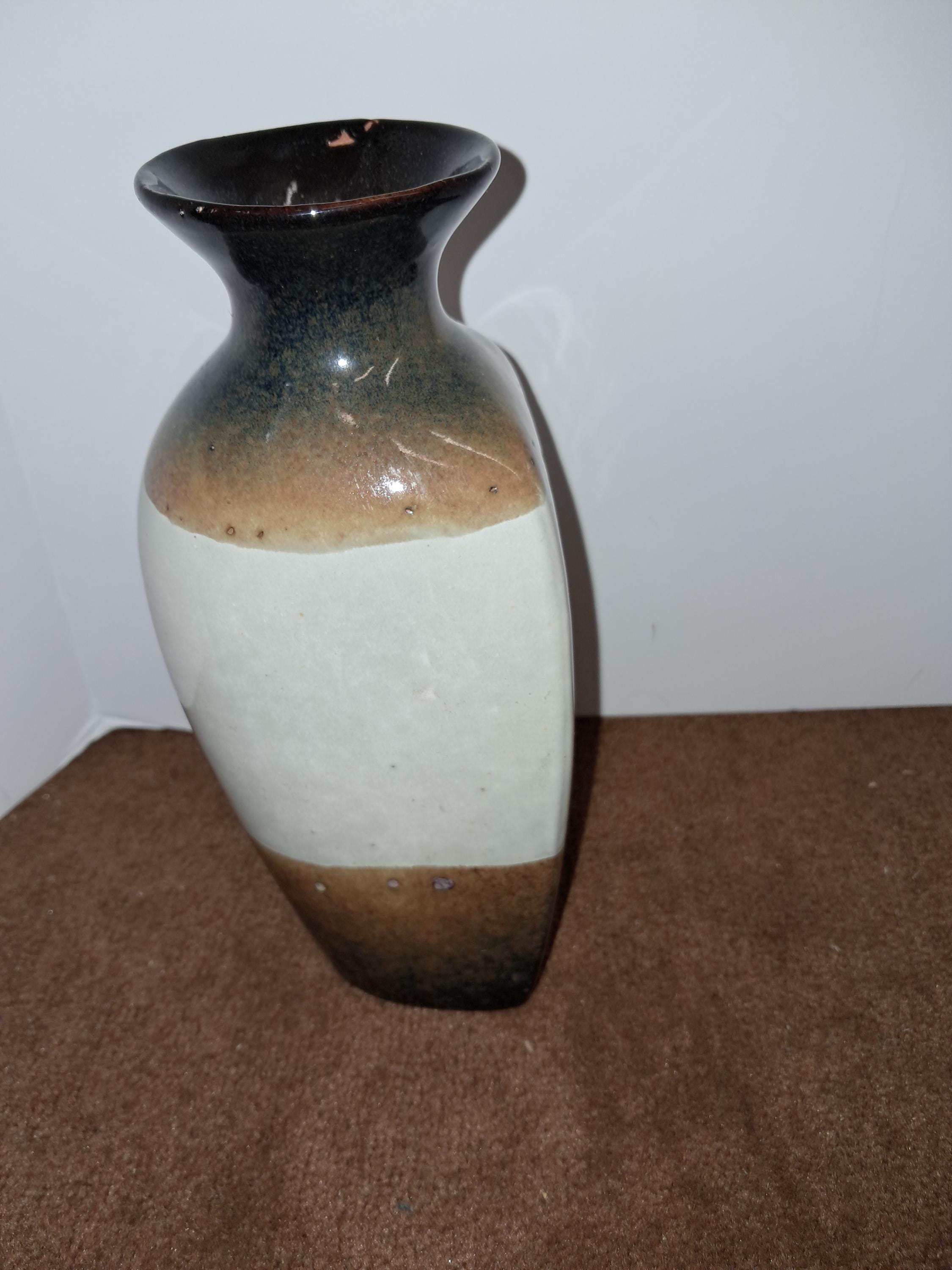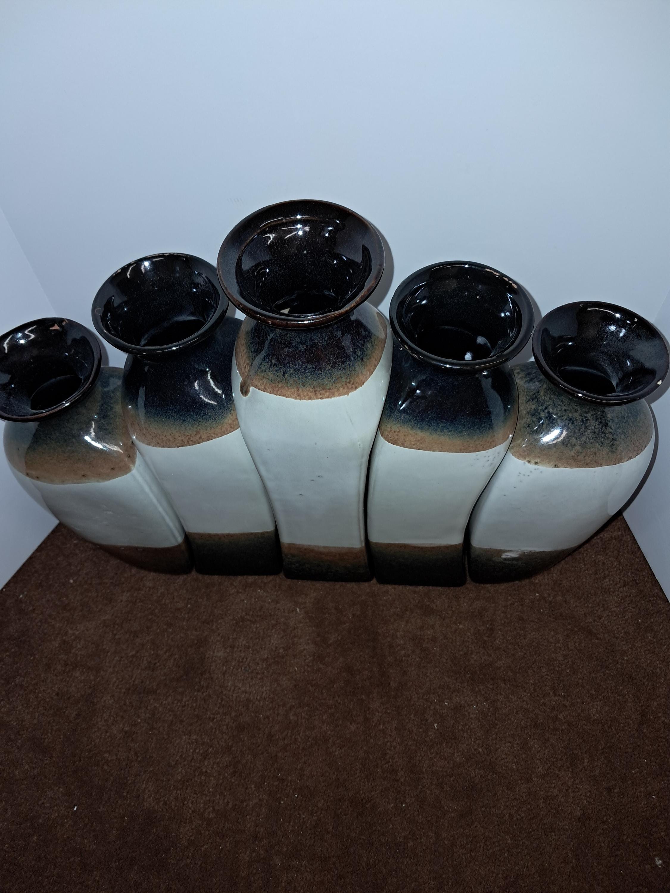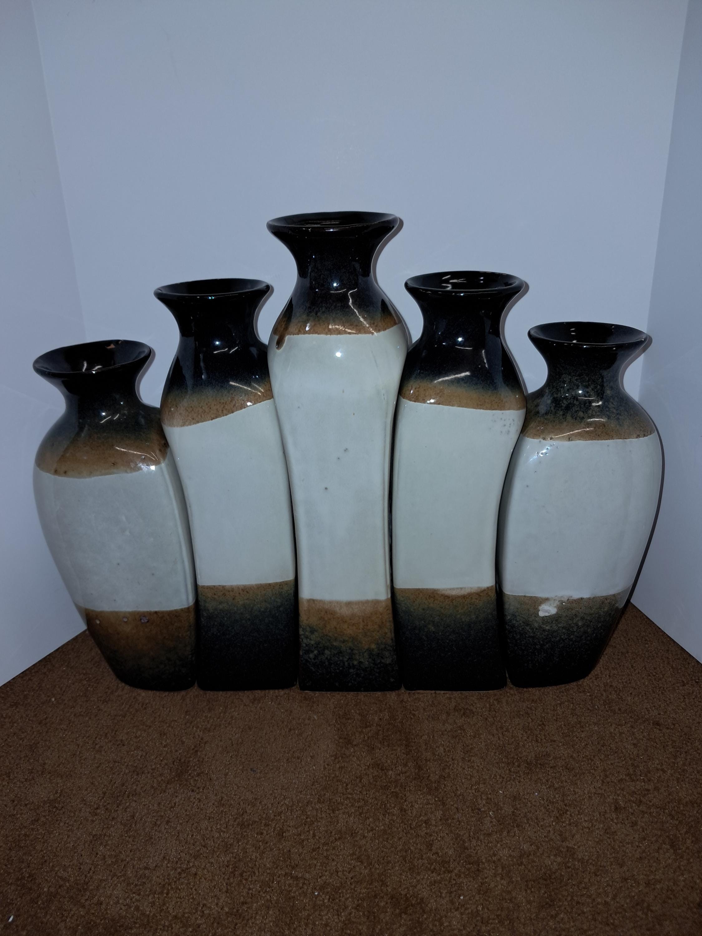 Elements Reactive Nesting Vases - set of 5 in beige and brown drip glaze style. Vases can be used as a unit nested or separated - really beautiful and interesting set. Vintage Elements Reactive Nesting Flower Vase 5 Set Beige Brown Ceramic Decorative
