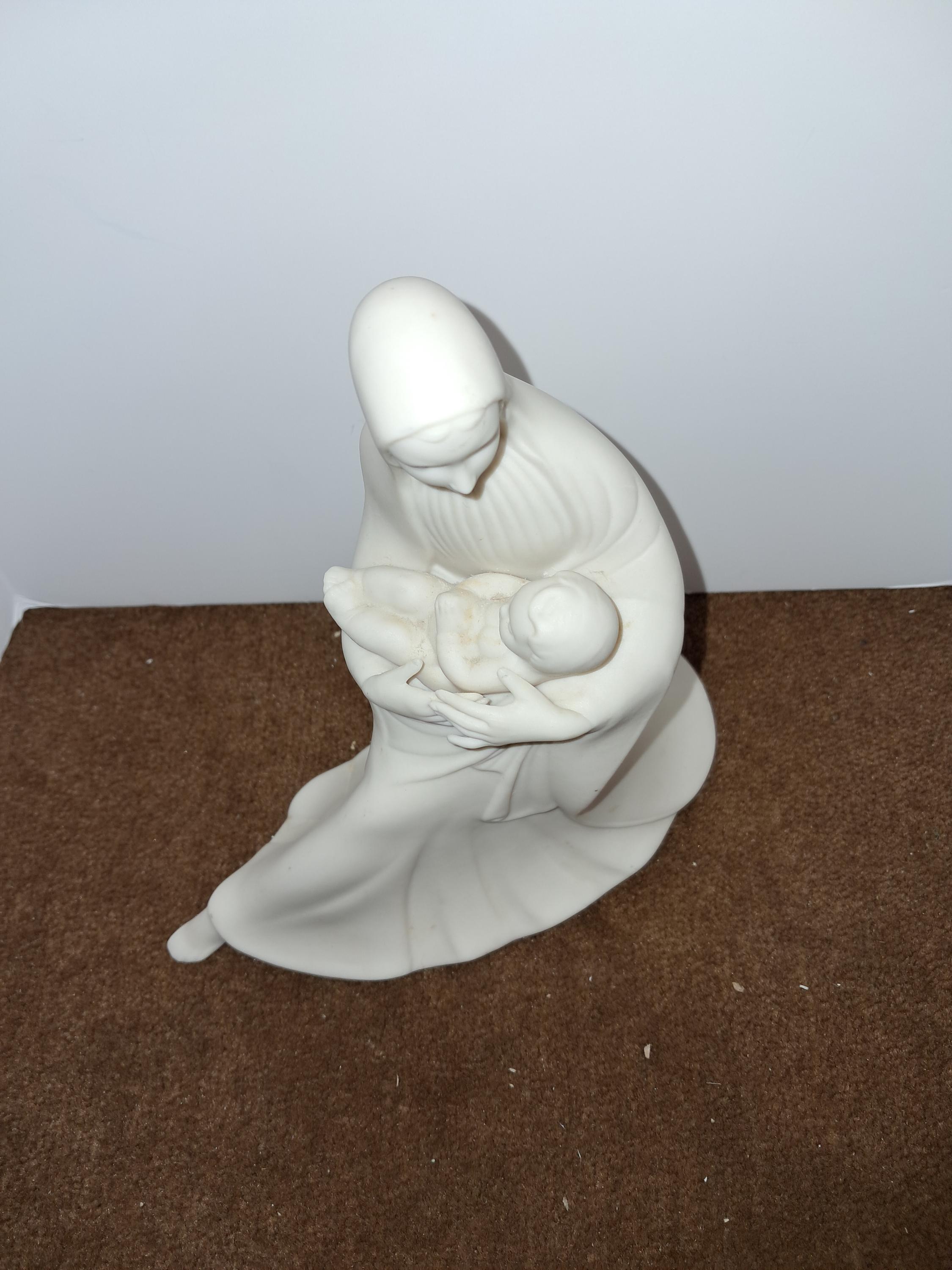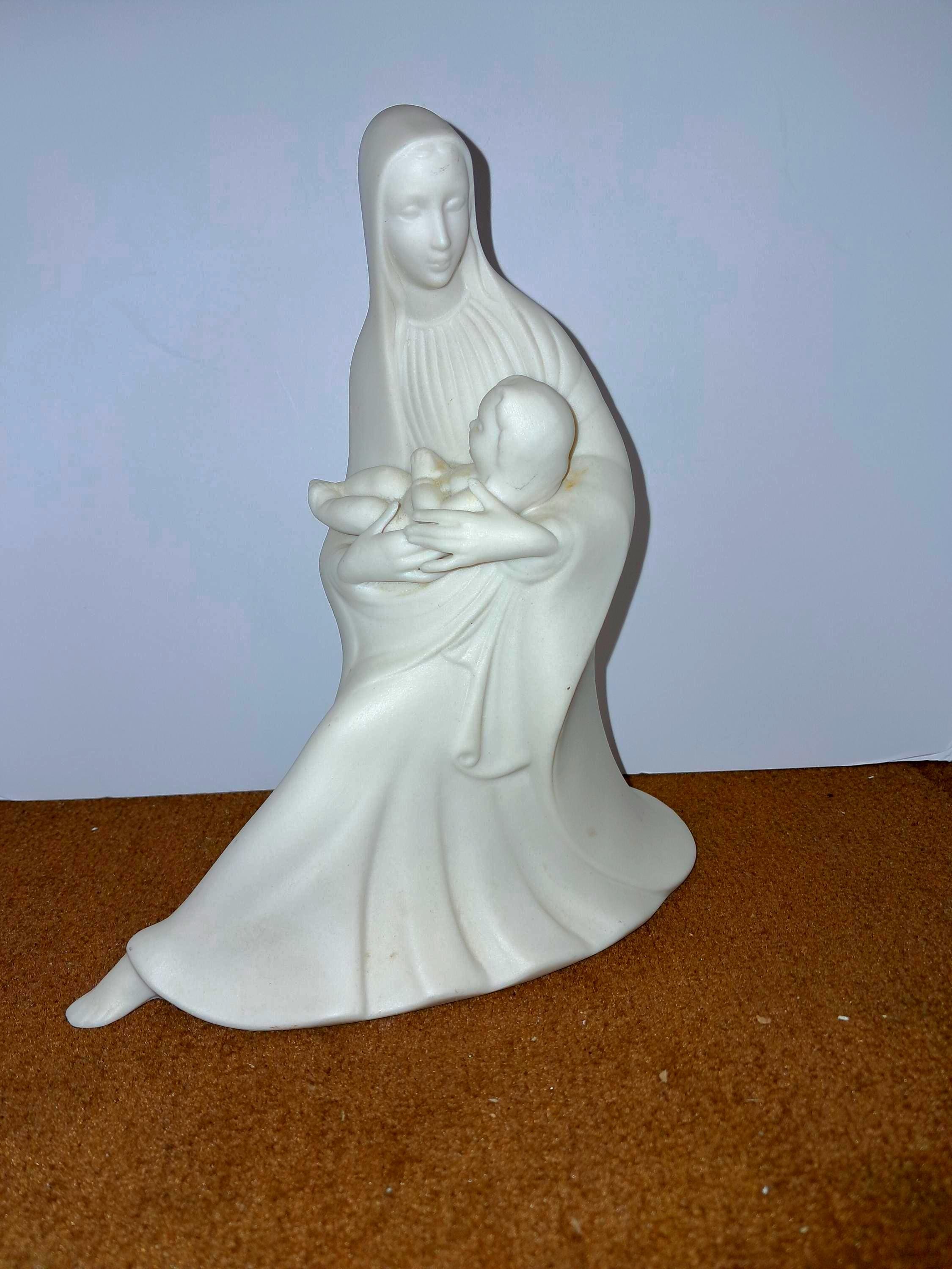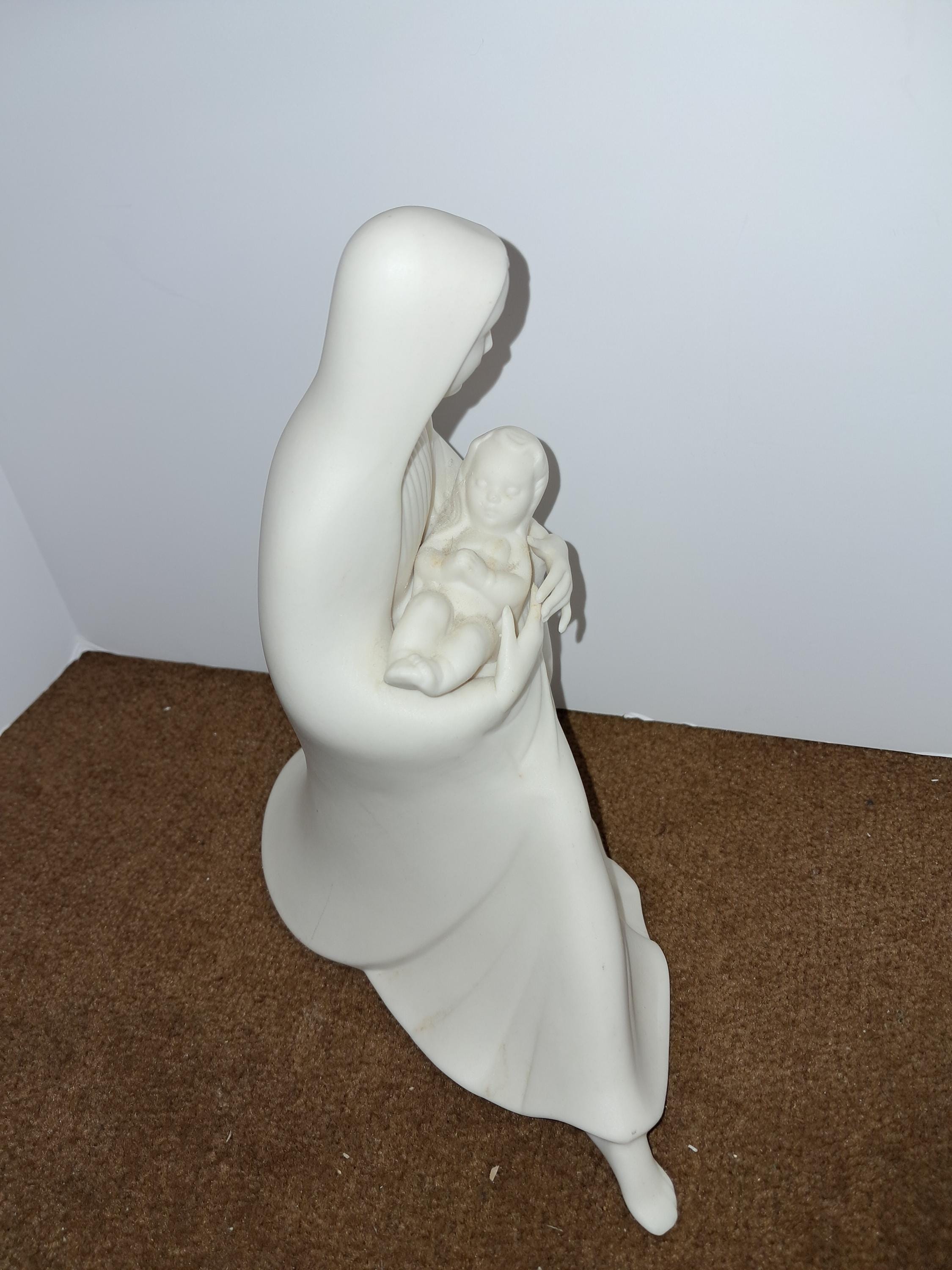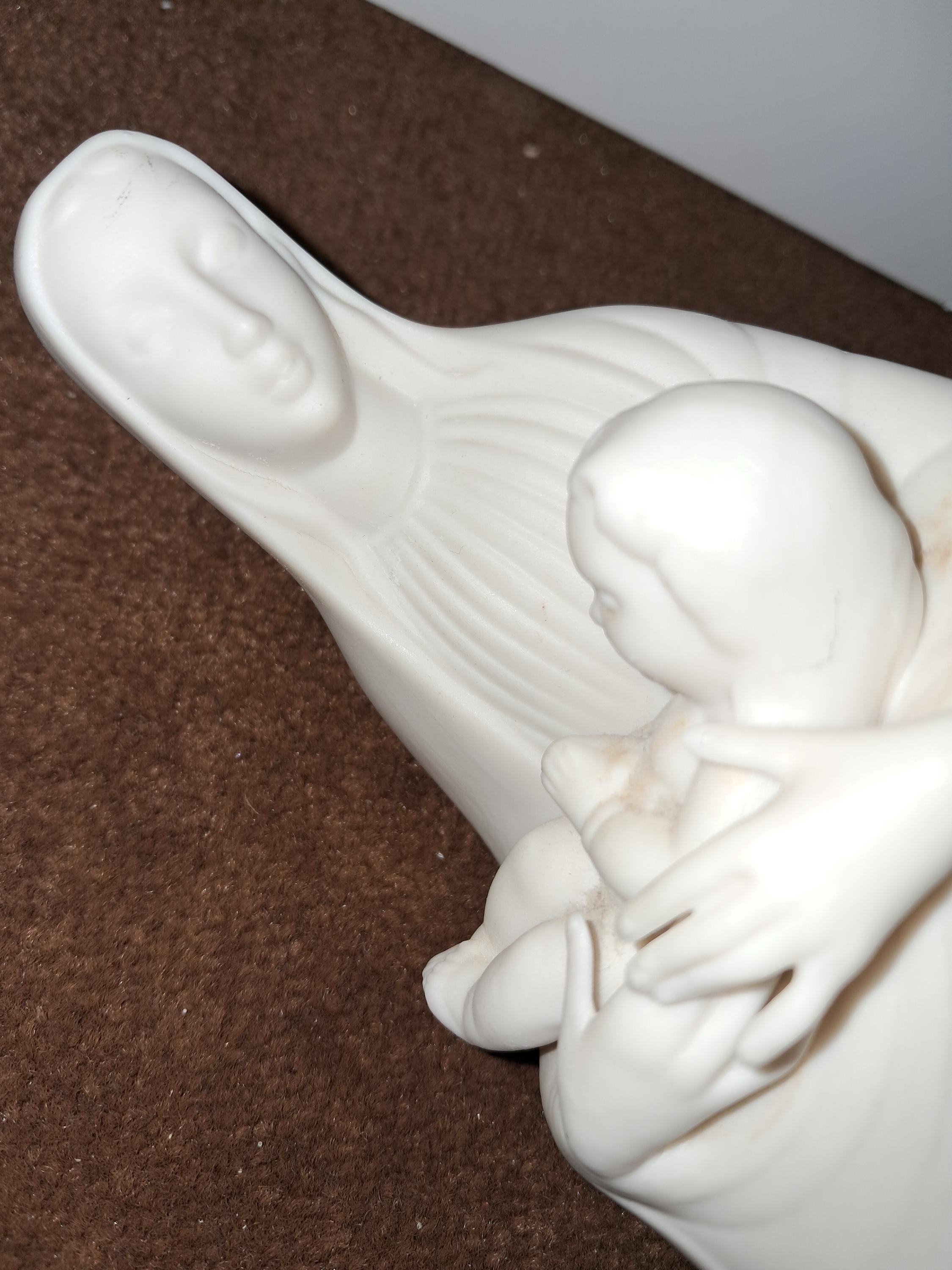 This vintage ceramic figurine depicts the Holy Virgin Mary and her baby, Jesus. Crafted by hand in the Holland, this piece is a beautiful addition to any collection of religious memorabilia. The figurine is made of high-quality ceramic and has not been modified in any way.