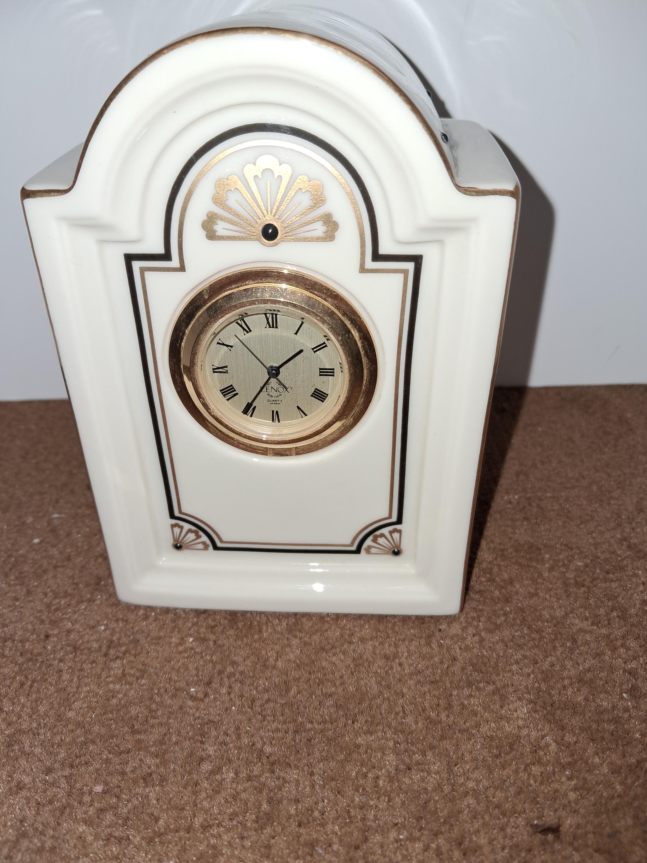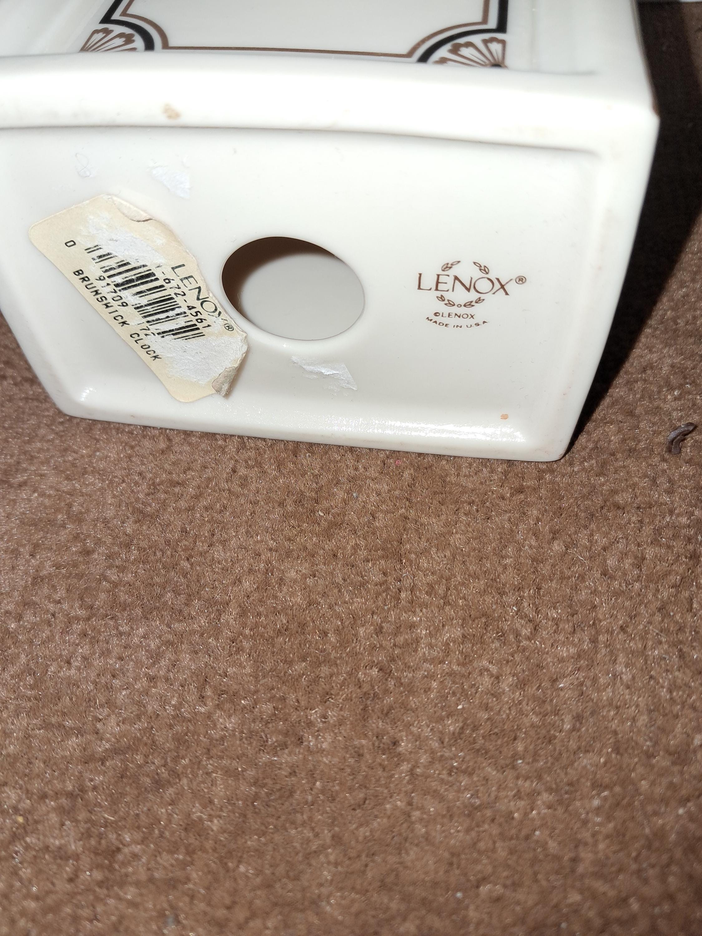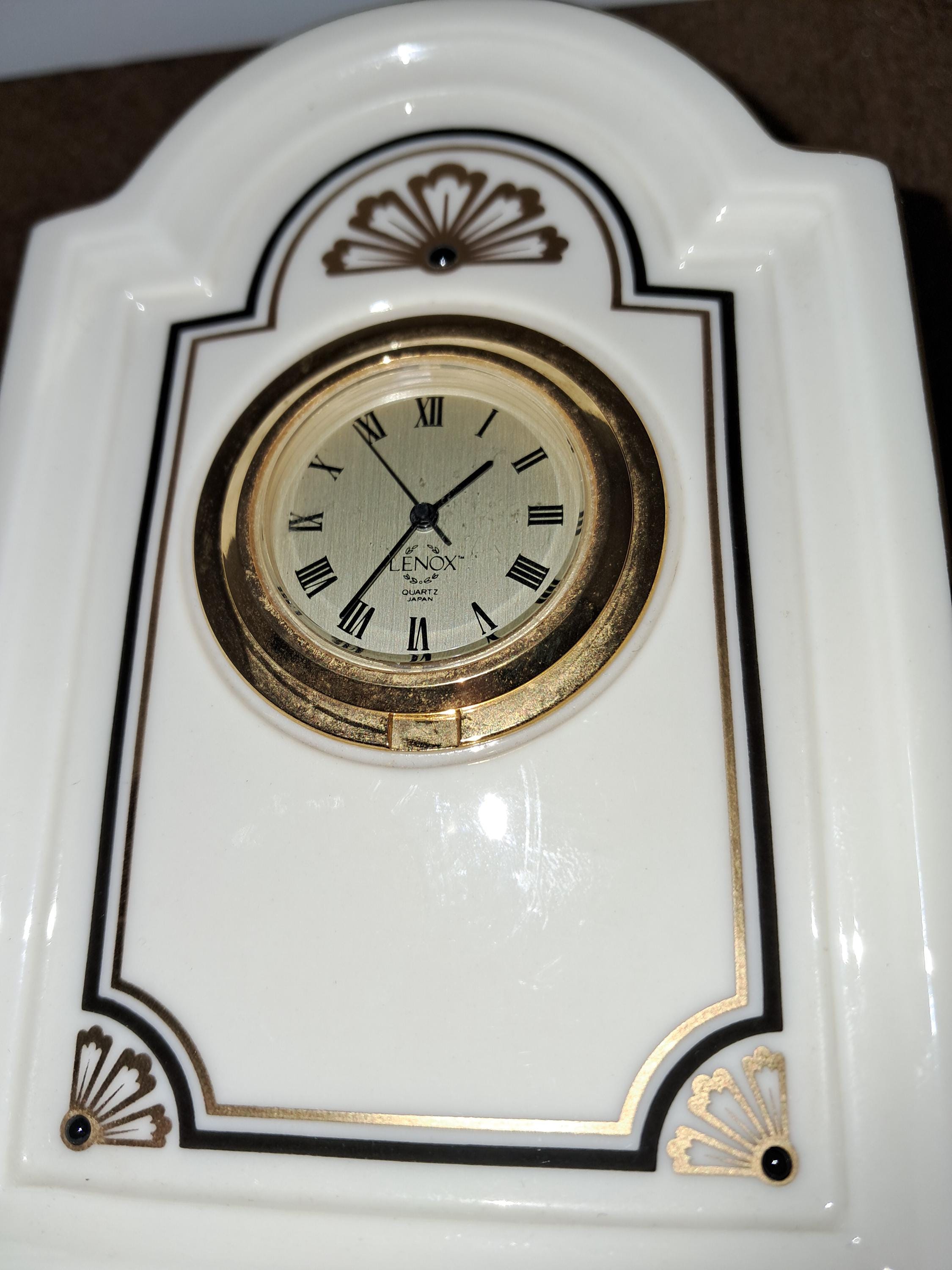 Lenox Porcelain Brunswick Quartz Desk ClockHeight: 5 inWidth: 3 3/8 inCrafted In USADiscontinued PiecePiece Code: CLOQCondition: Never UsedNeeds Battery