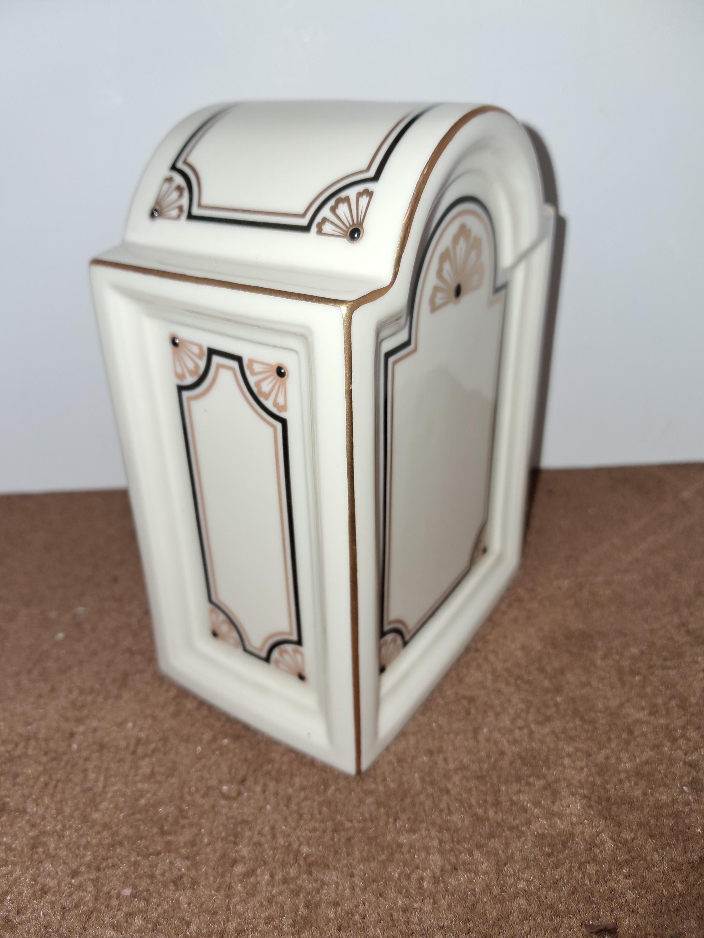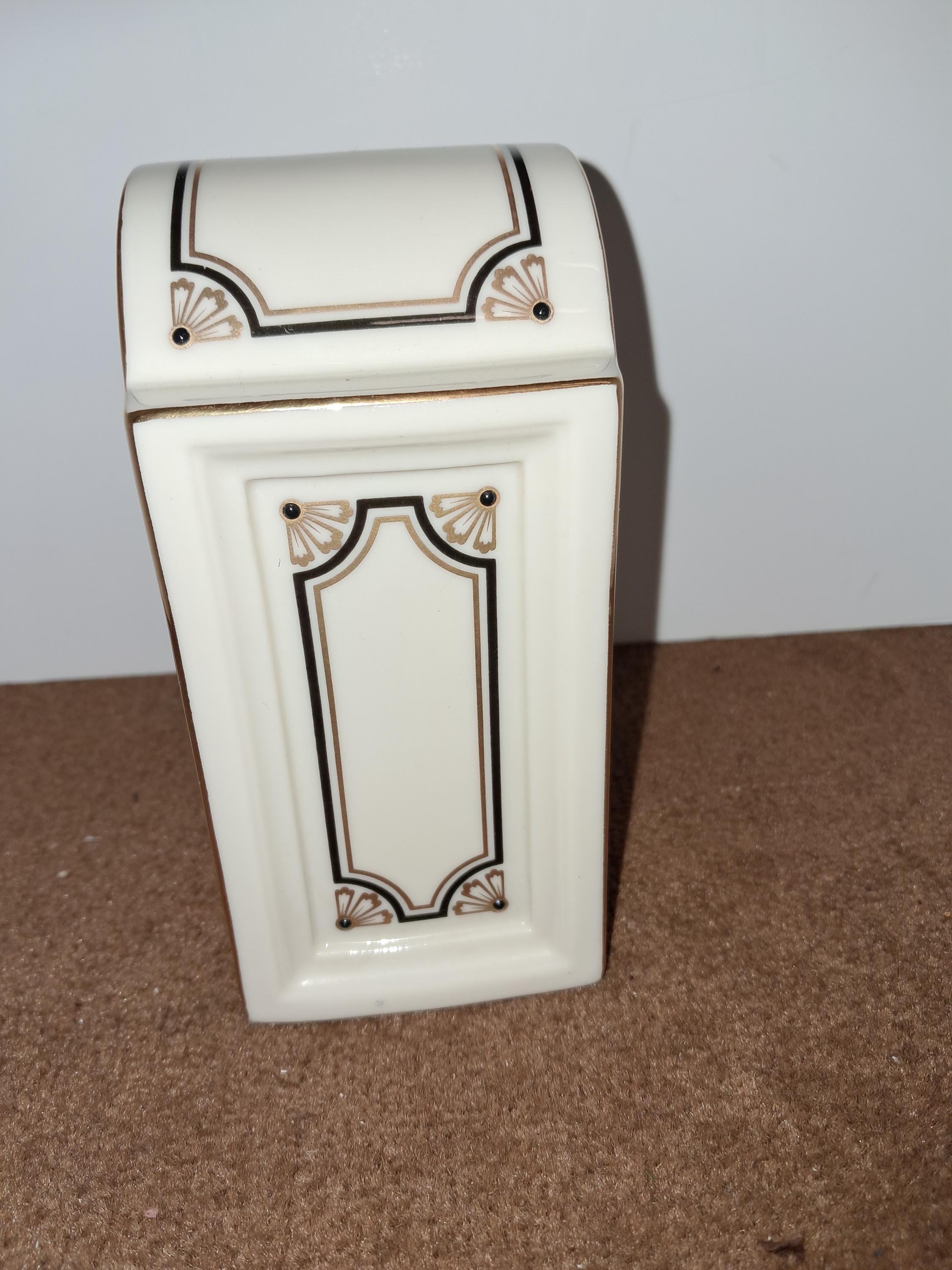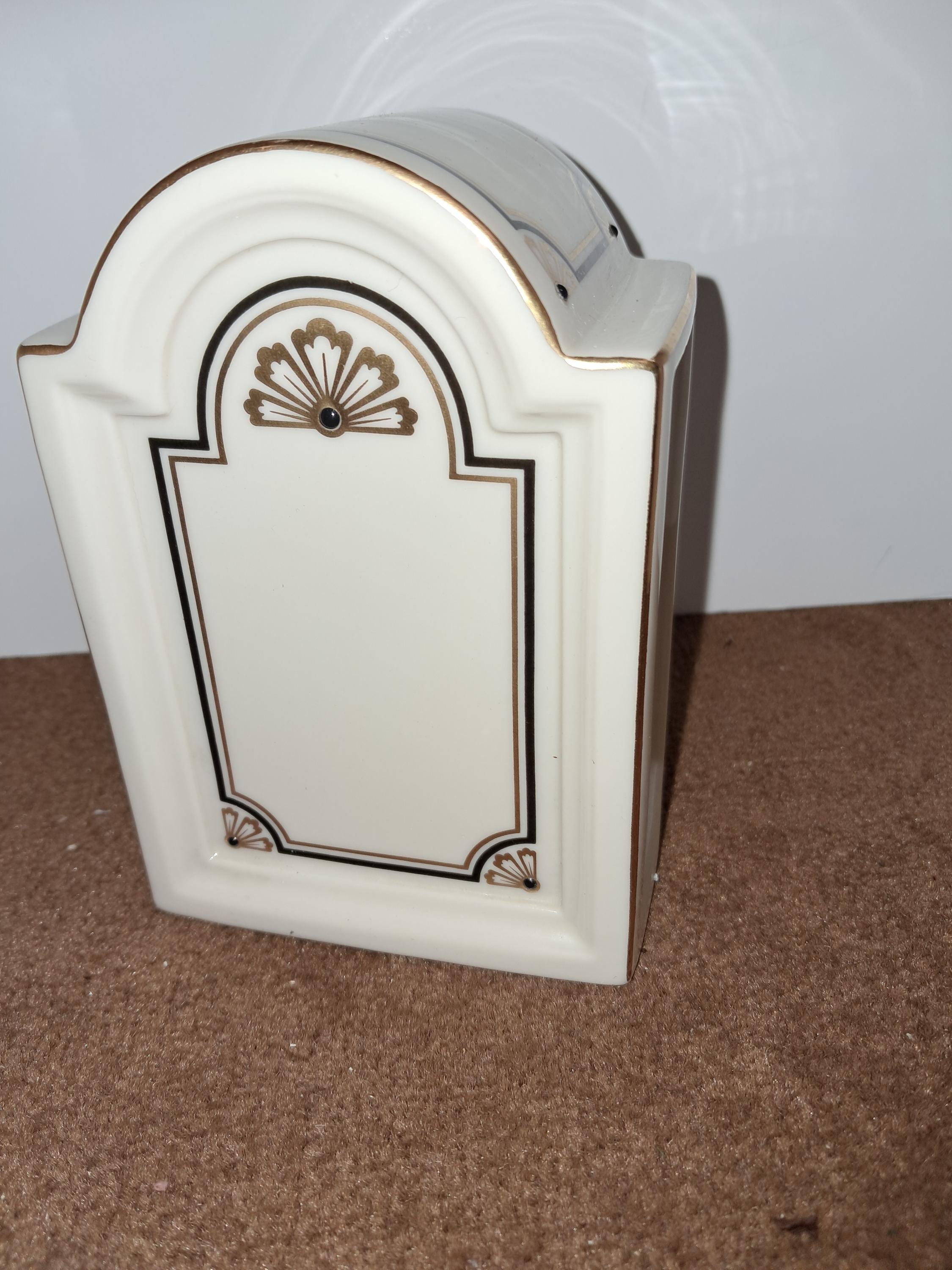 Lenox Porcelain Brunswick Quartz Desk ClockHeight: 5 inWidth: 3 3/8 inCrafted In USADiscontinued PiecePiece Code: CLOQCondition: Never UsedNeeds Battery