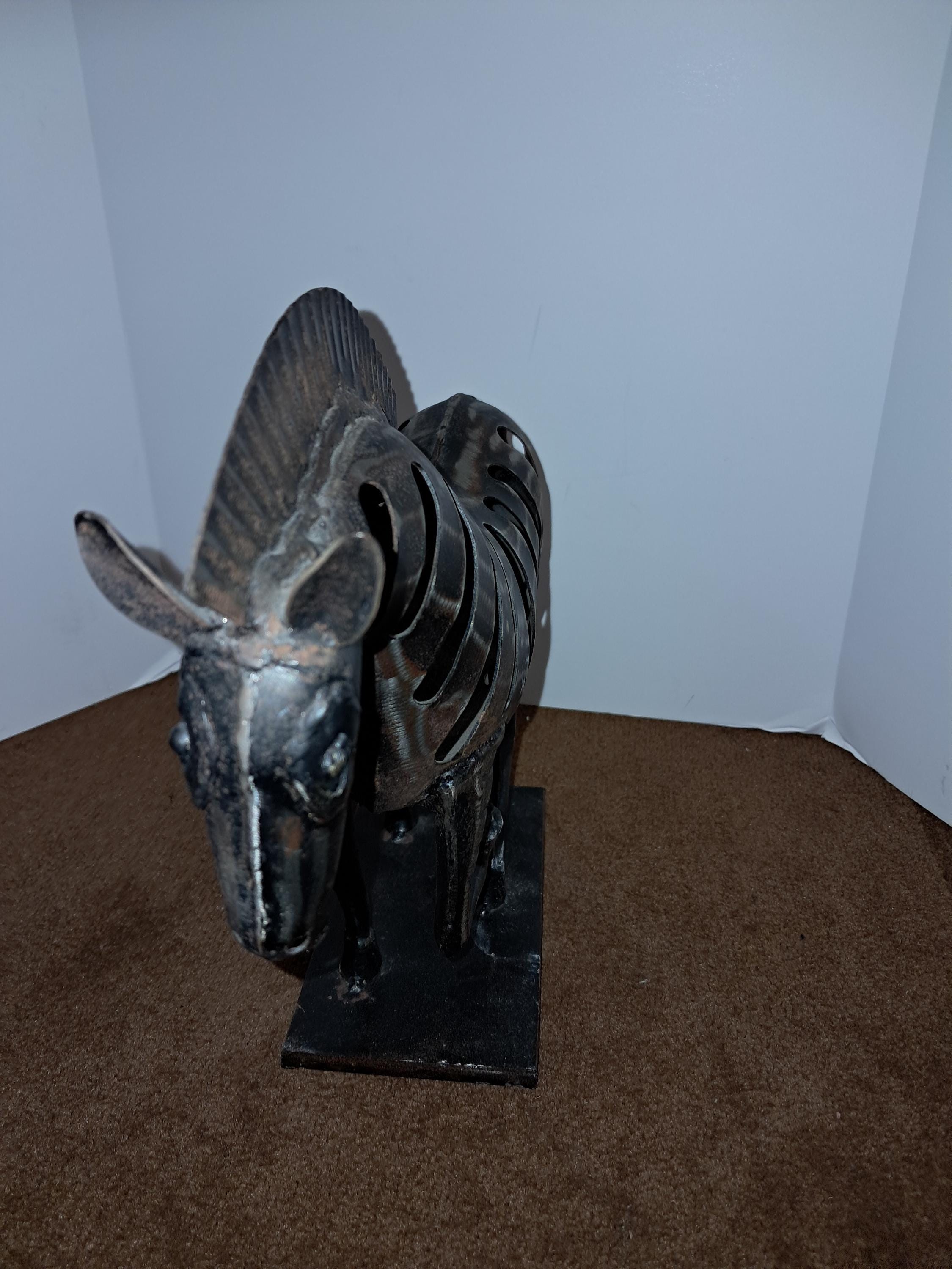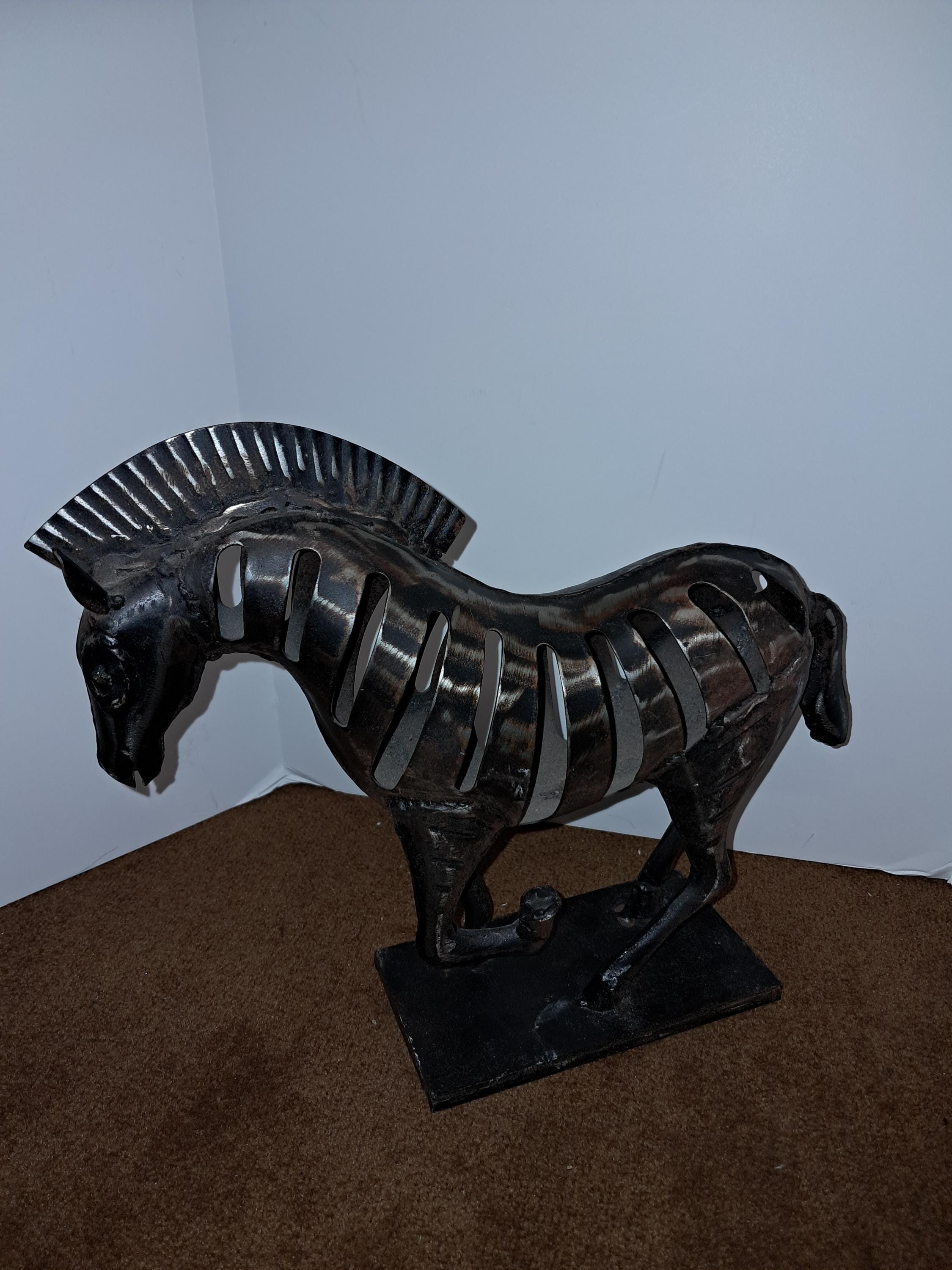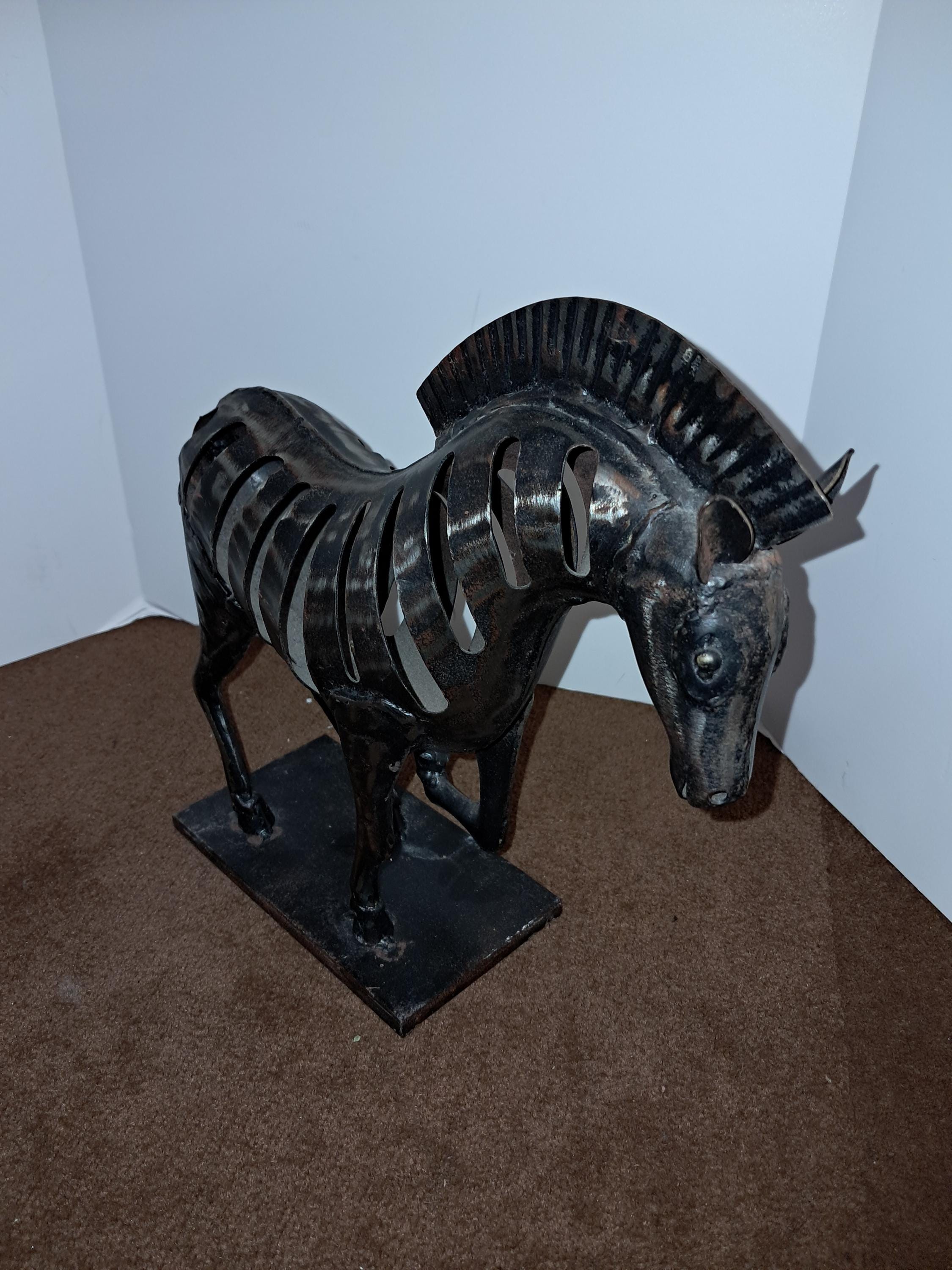 Metal zebra sculpture. Made entirely from welded pressed steel sheet stock. Black coated with deliberate brushed highlighting. Not signed but not new as evidenced by some light rust on the base.