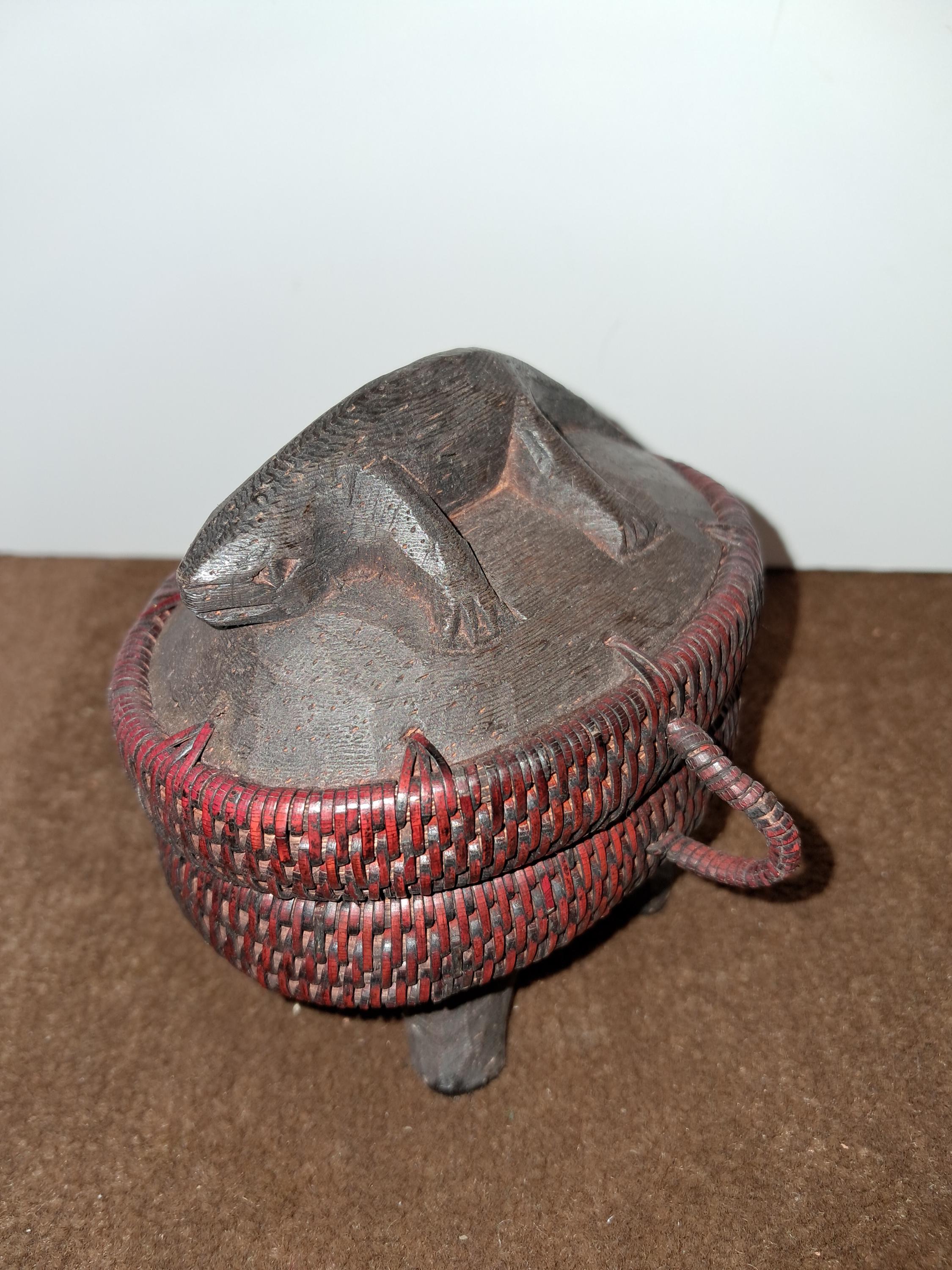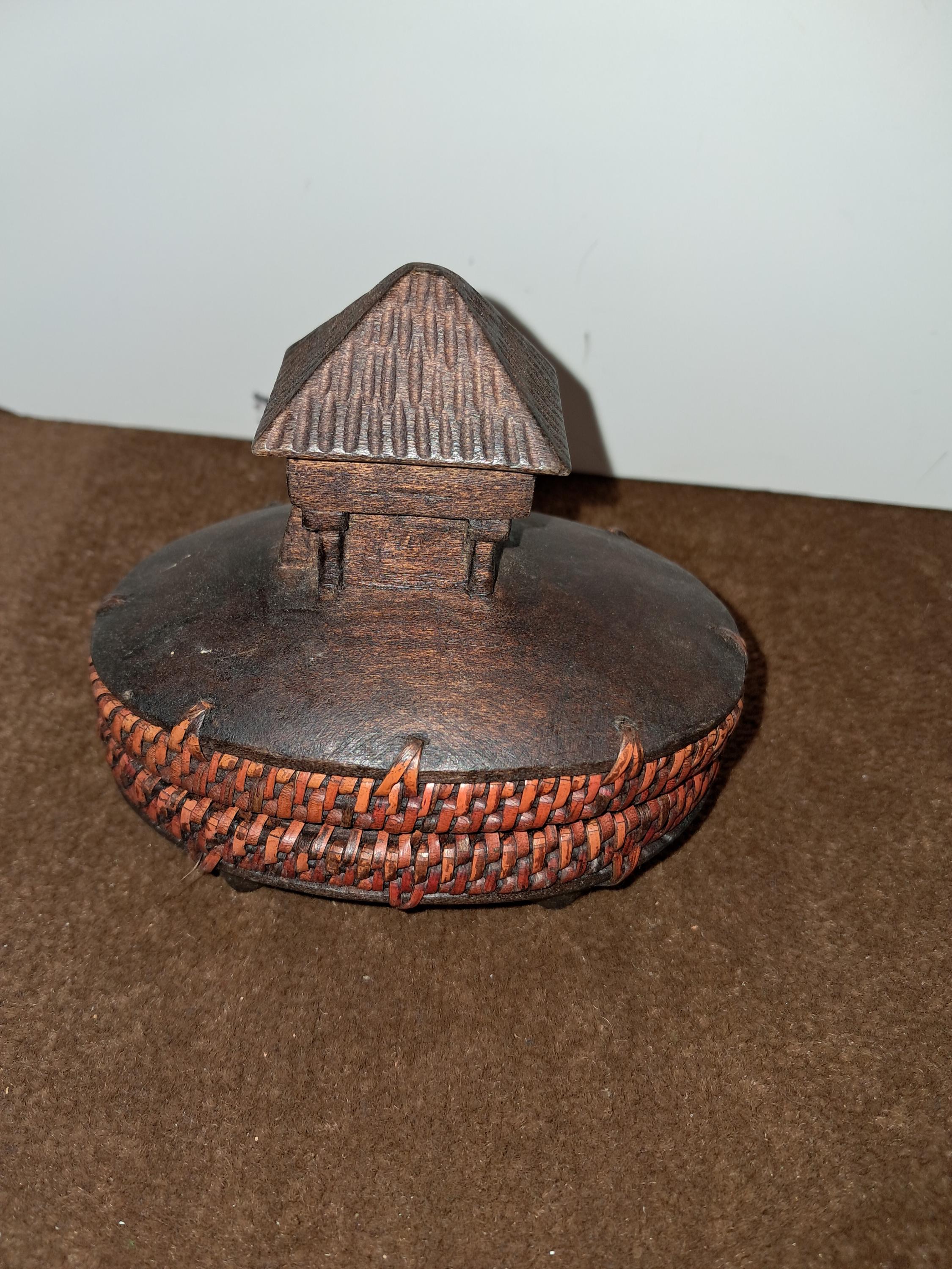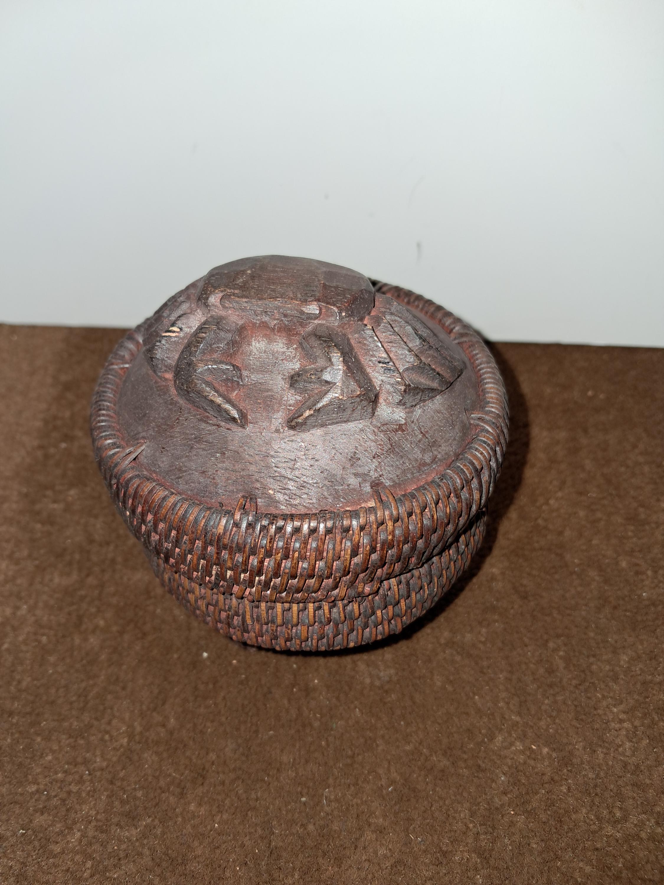 Set of Vintage Carved Lidded Woven Wicker and Wood Small Trinket Baskets