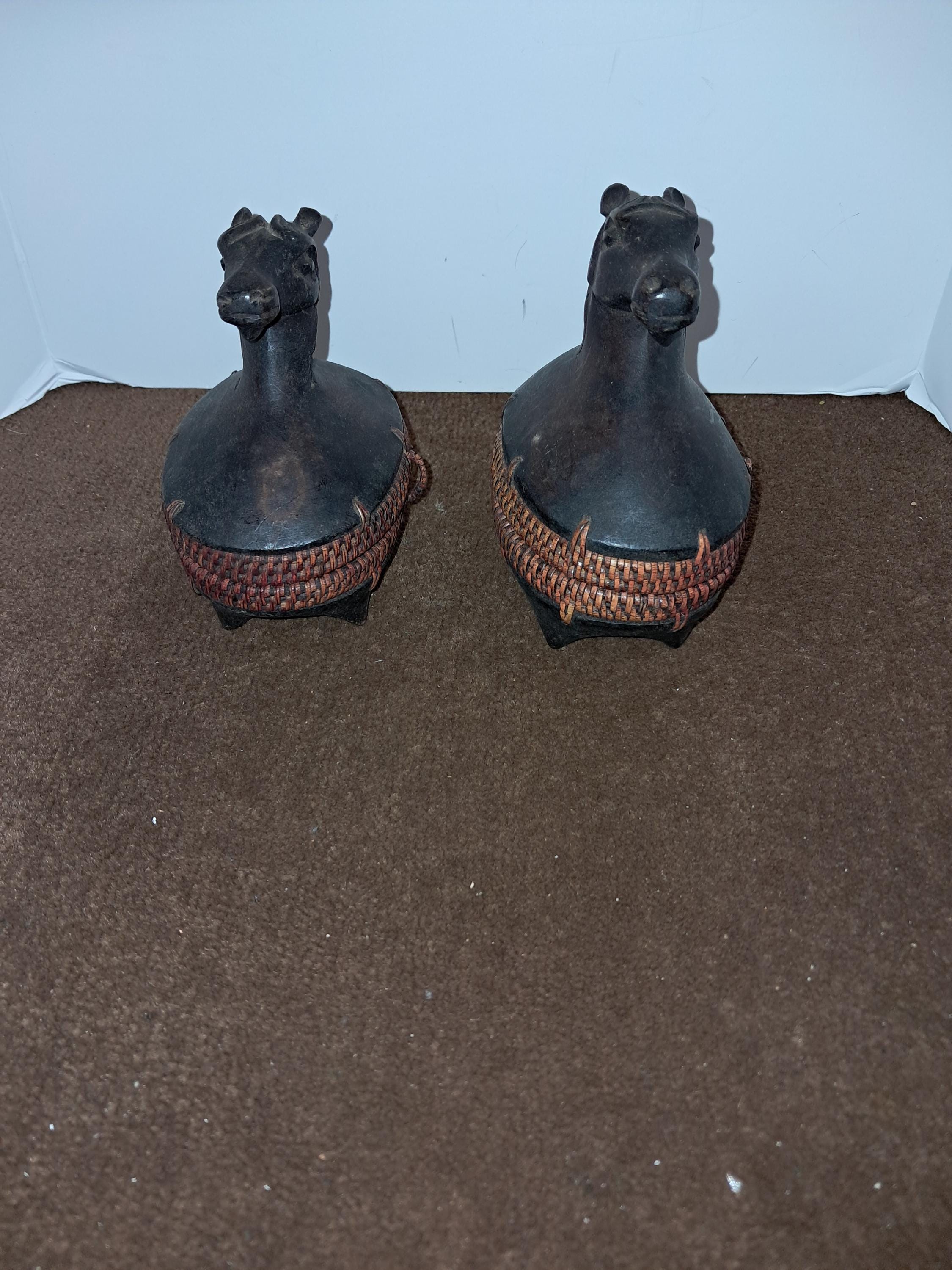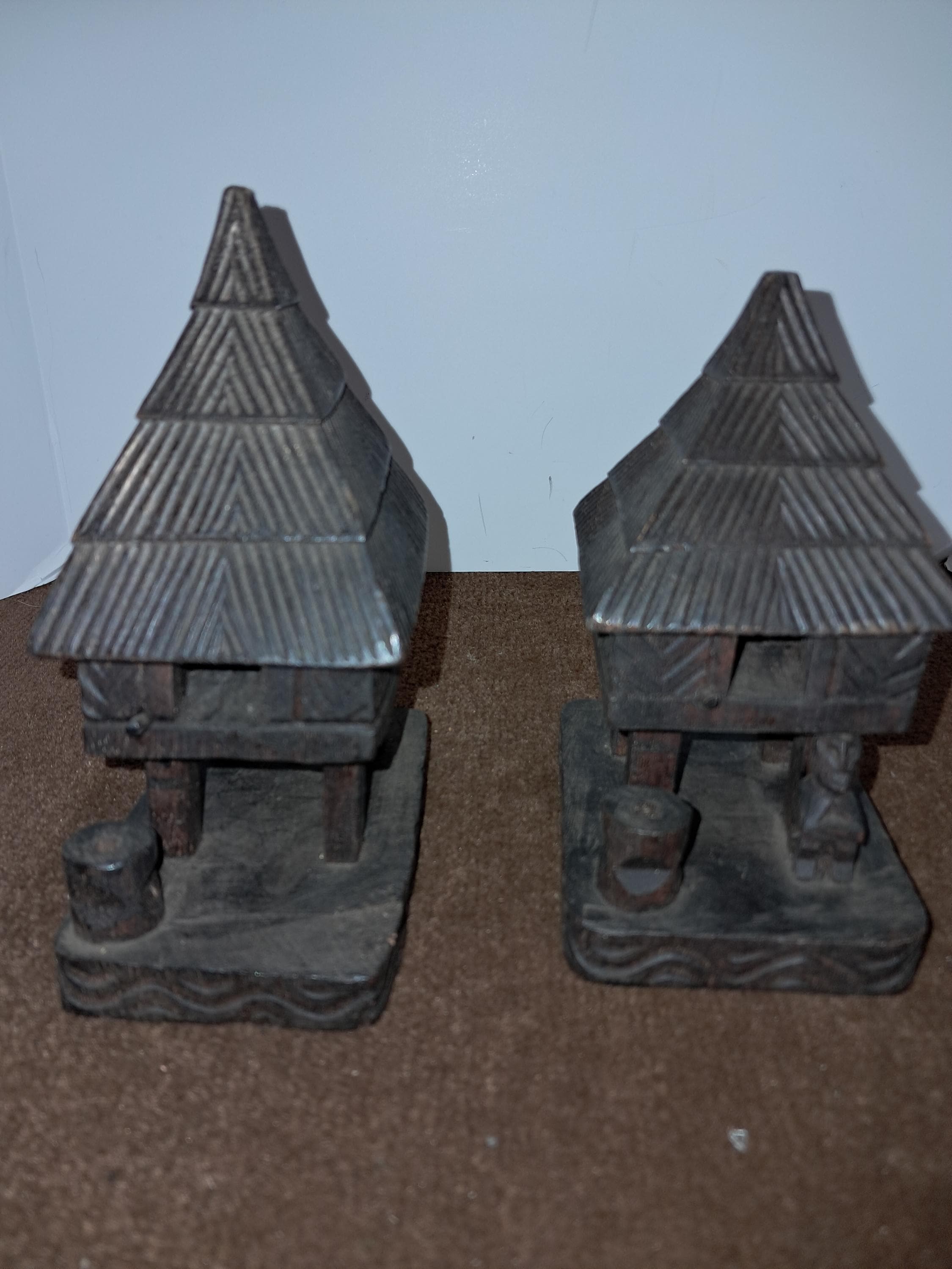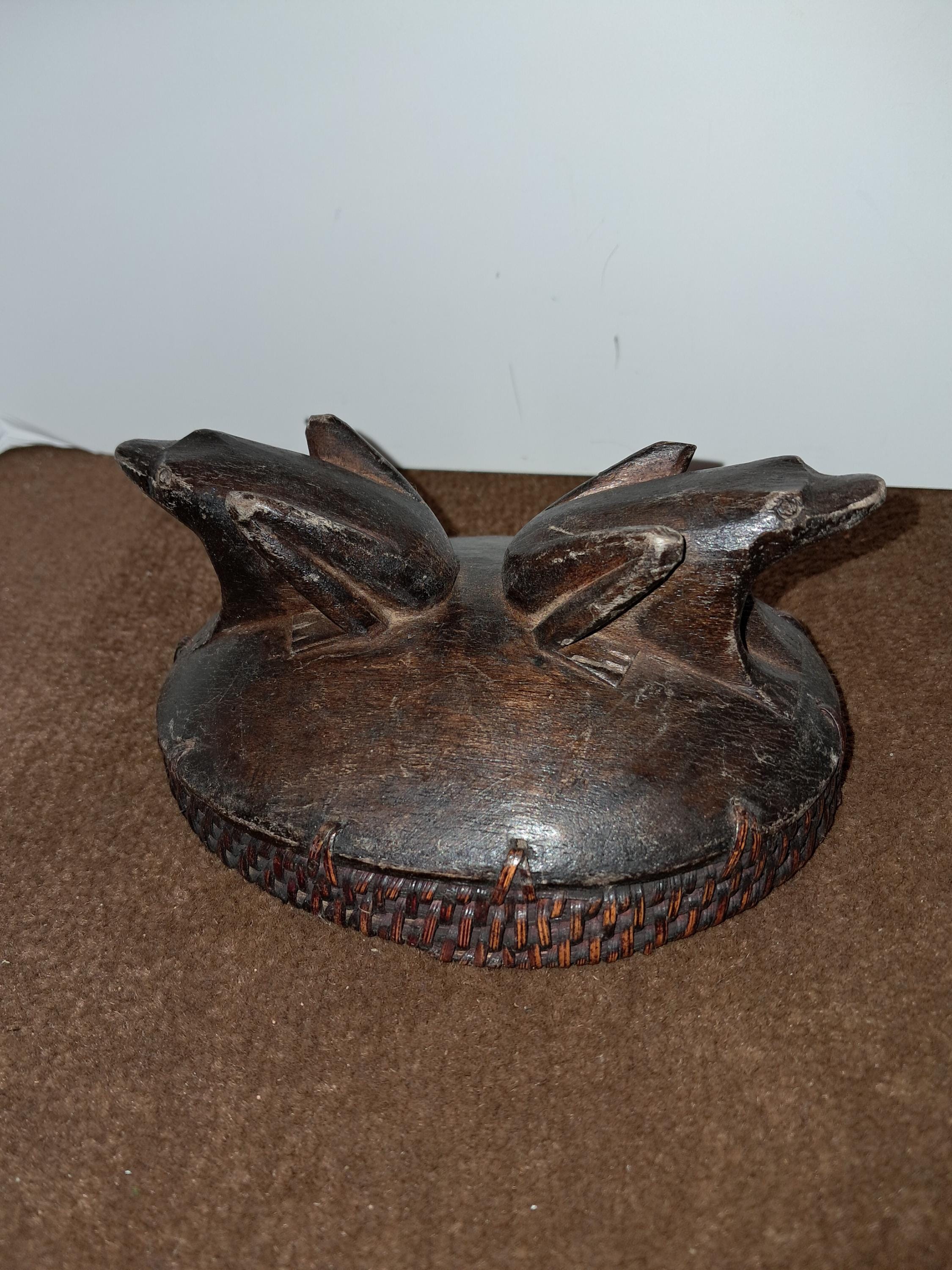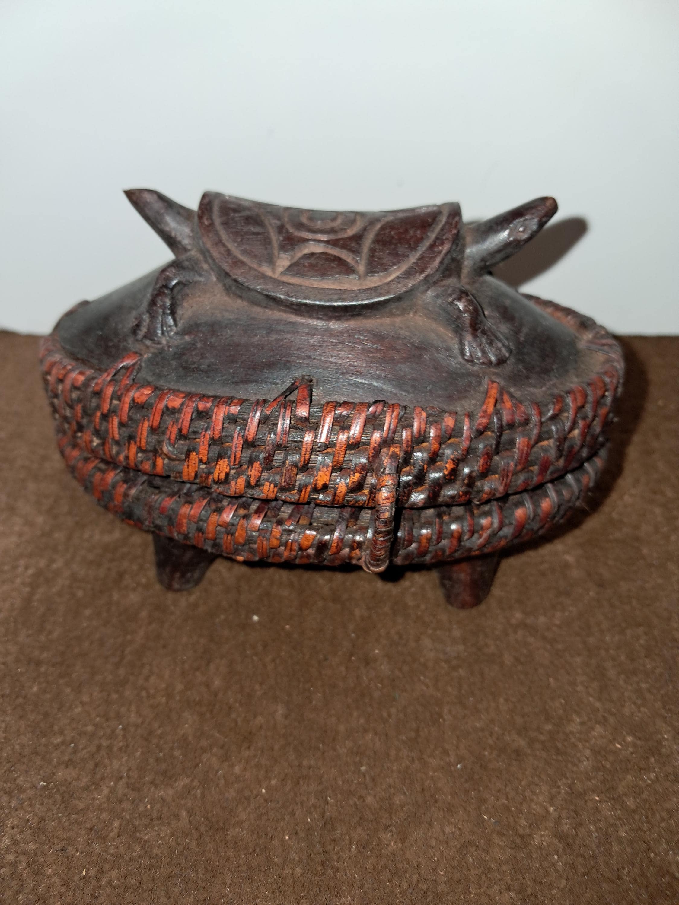 Set of Vintage Carved Lidded Woven Wicker and Wood Small Trinket Baskets