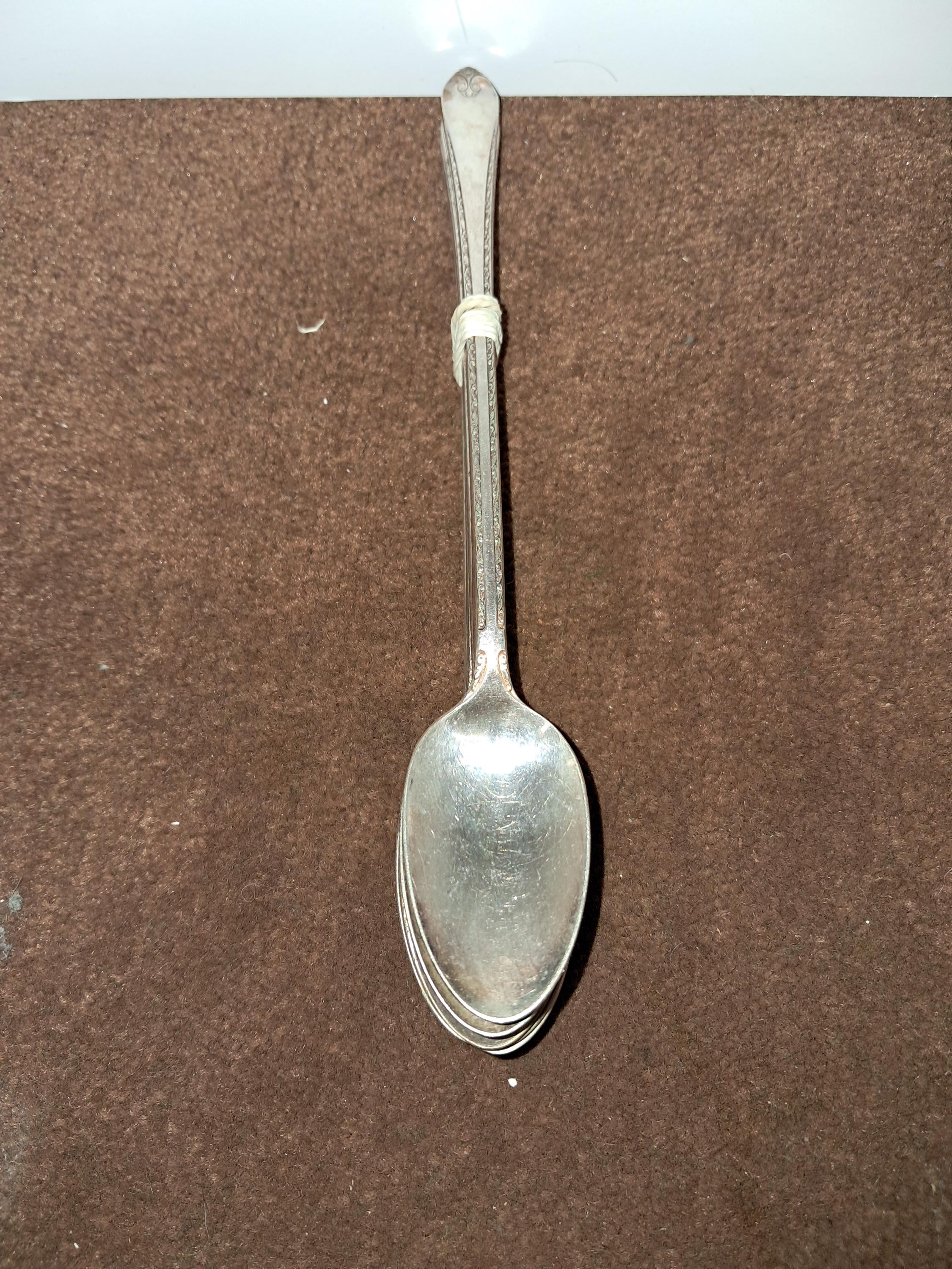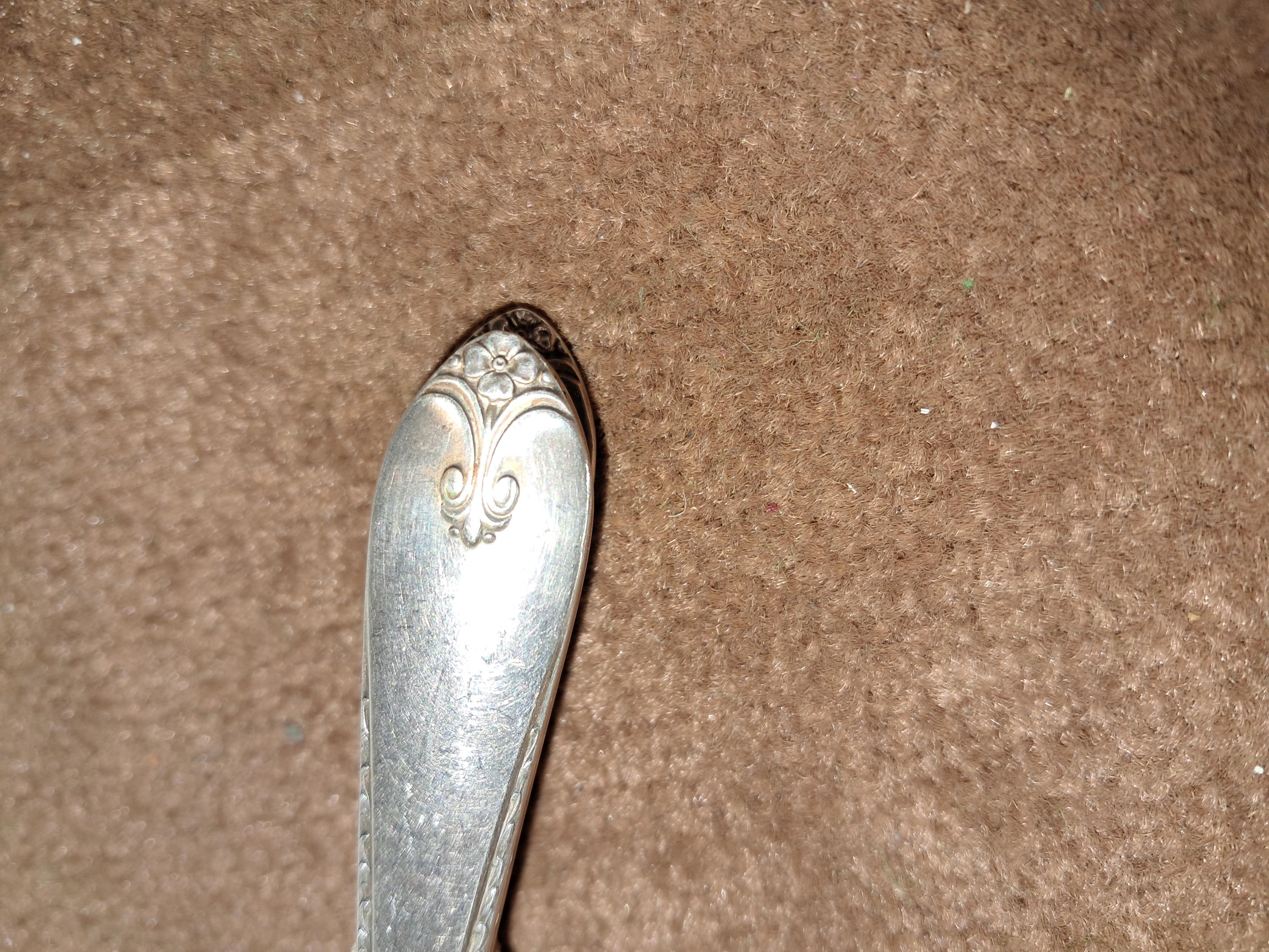 Exquisite silverplate pattern by Wm Rogers & Son IS, International Silver Co, is in excellent estate condition. The floral blossom top leads to a pleasant central geometric design. Wm Rogers & Son Became part of the International Silver Company in 1898, a firm that changed the style and popularity of 20th-century flatware worldwide.