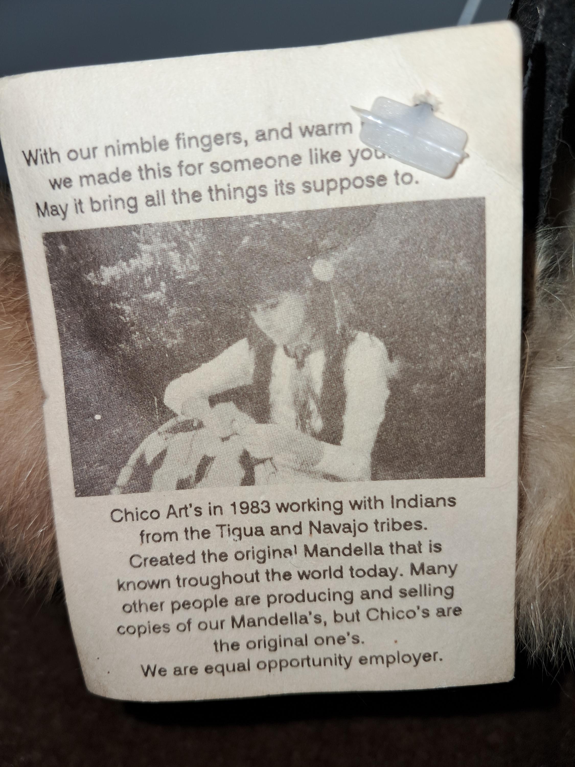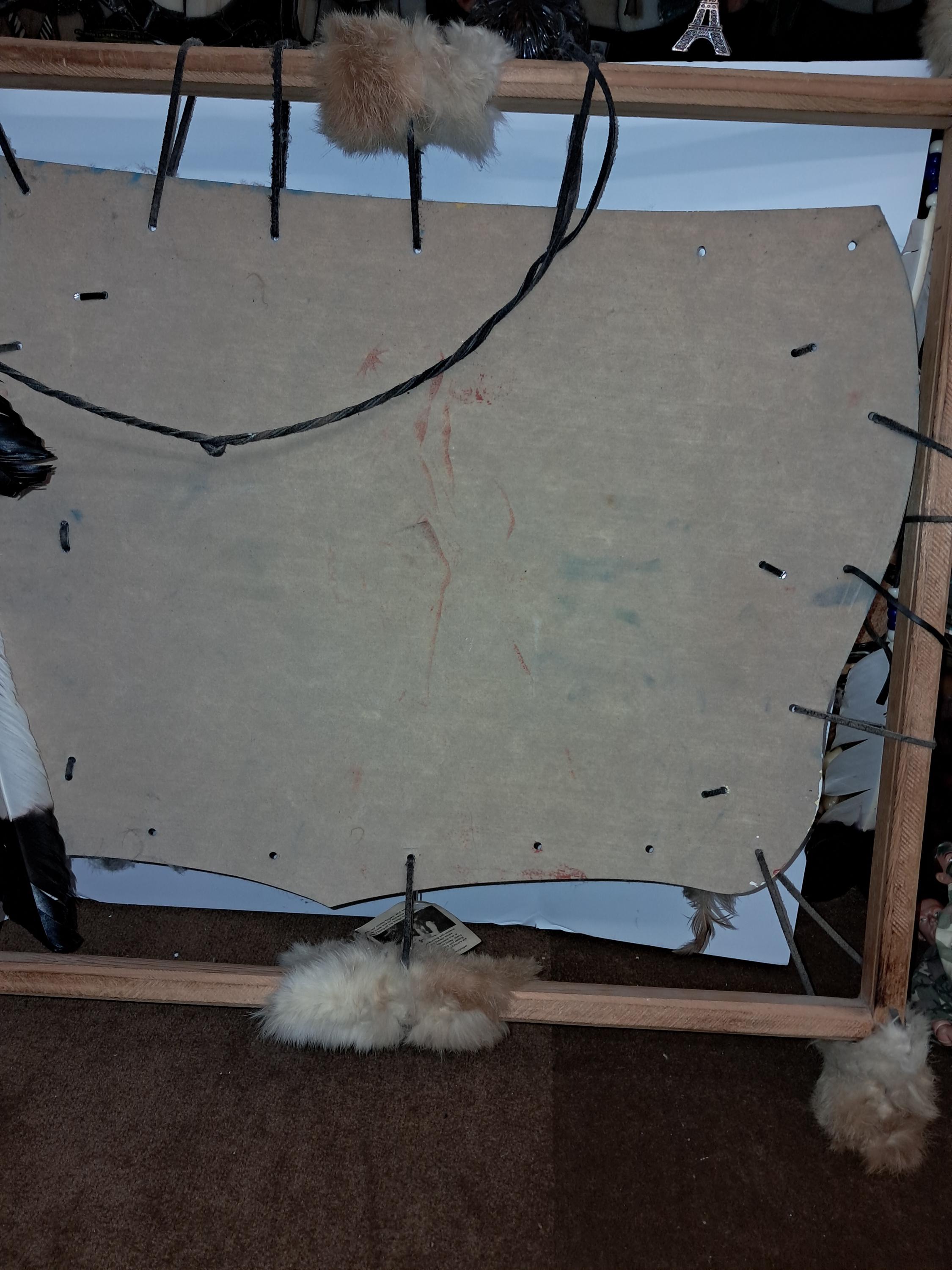 It is 23 inches wide nd 36 inches tall, hangs on a wooden Frame with fur skins and fethers.
