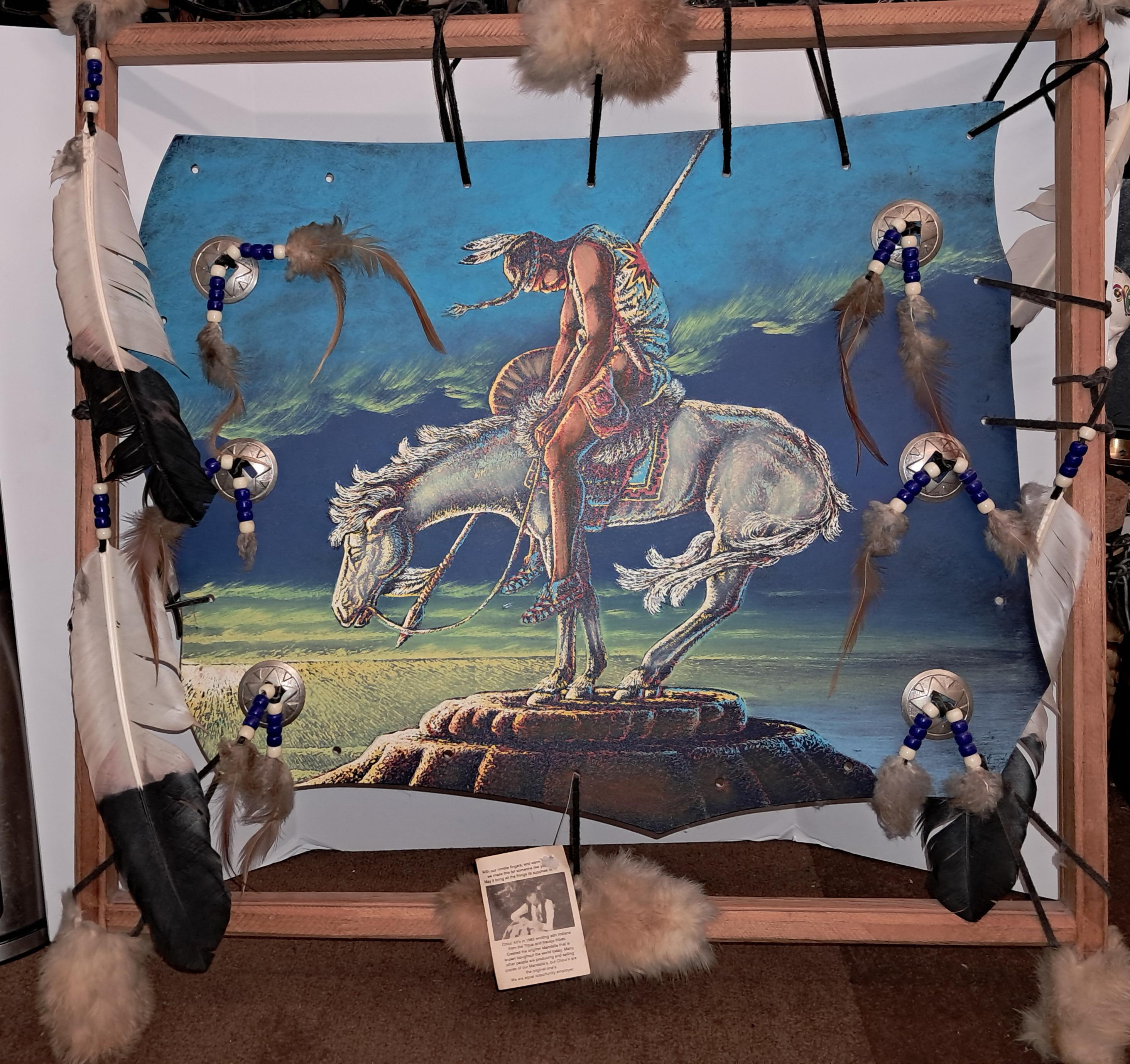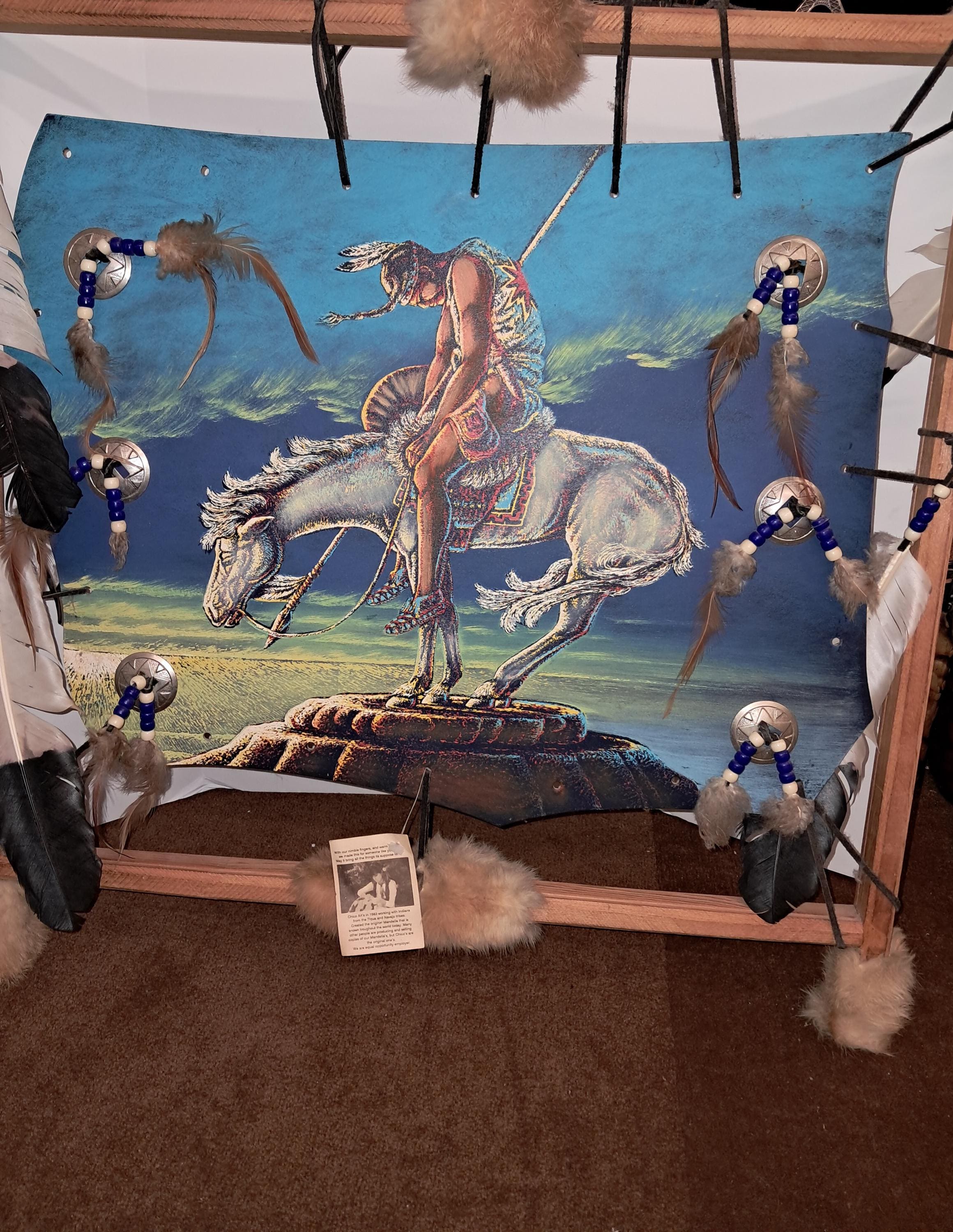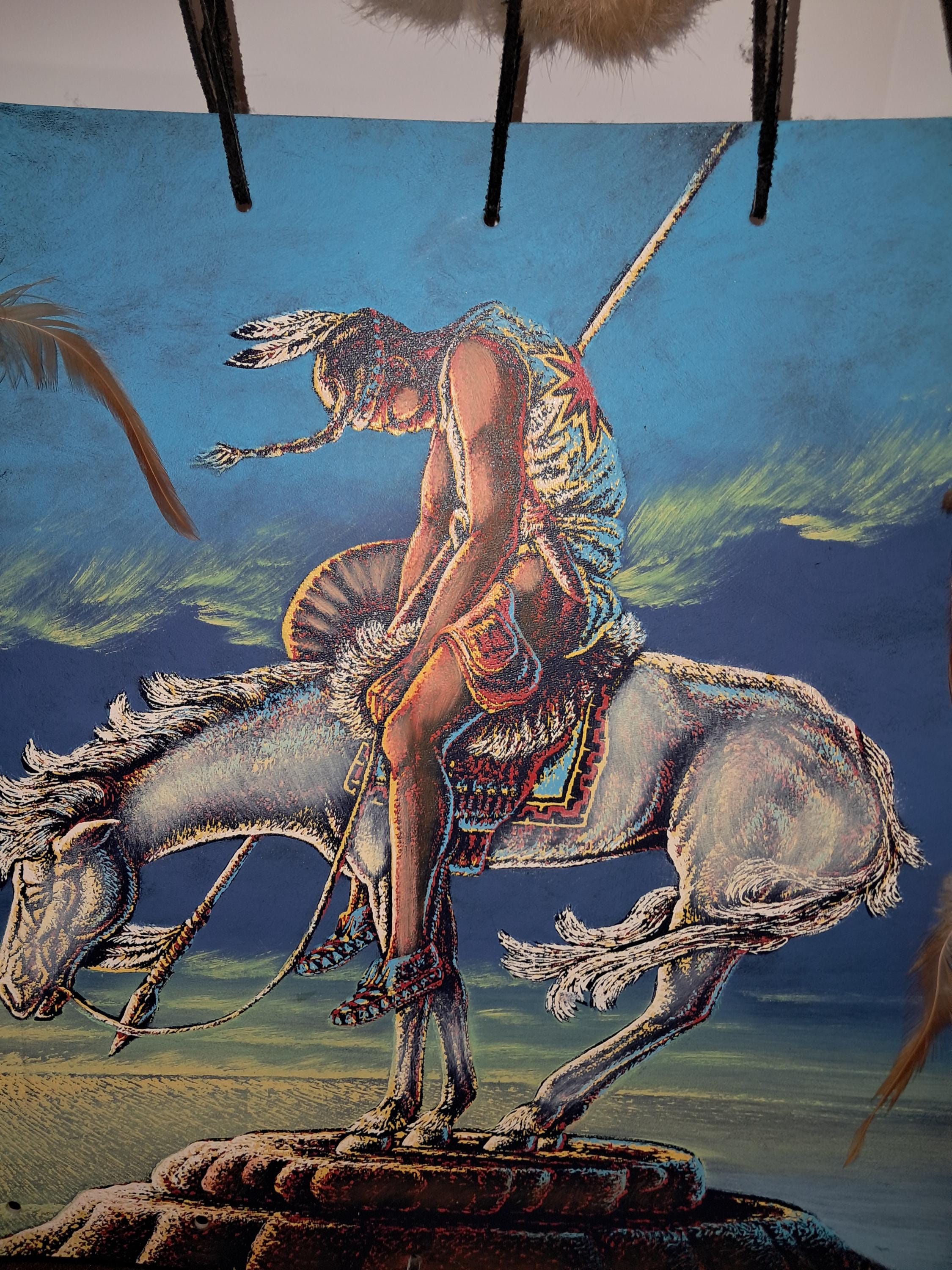 Enf of The Trail Native Indian Feather Embroided ,Painted on Leather Wall Hanging