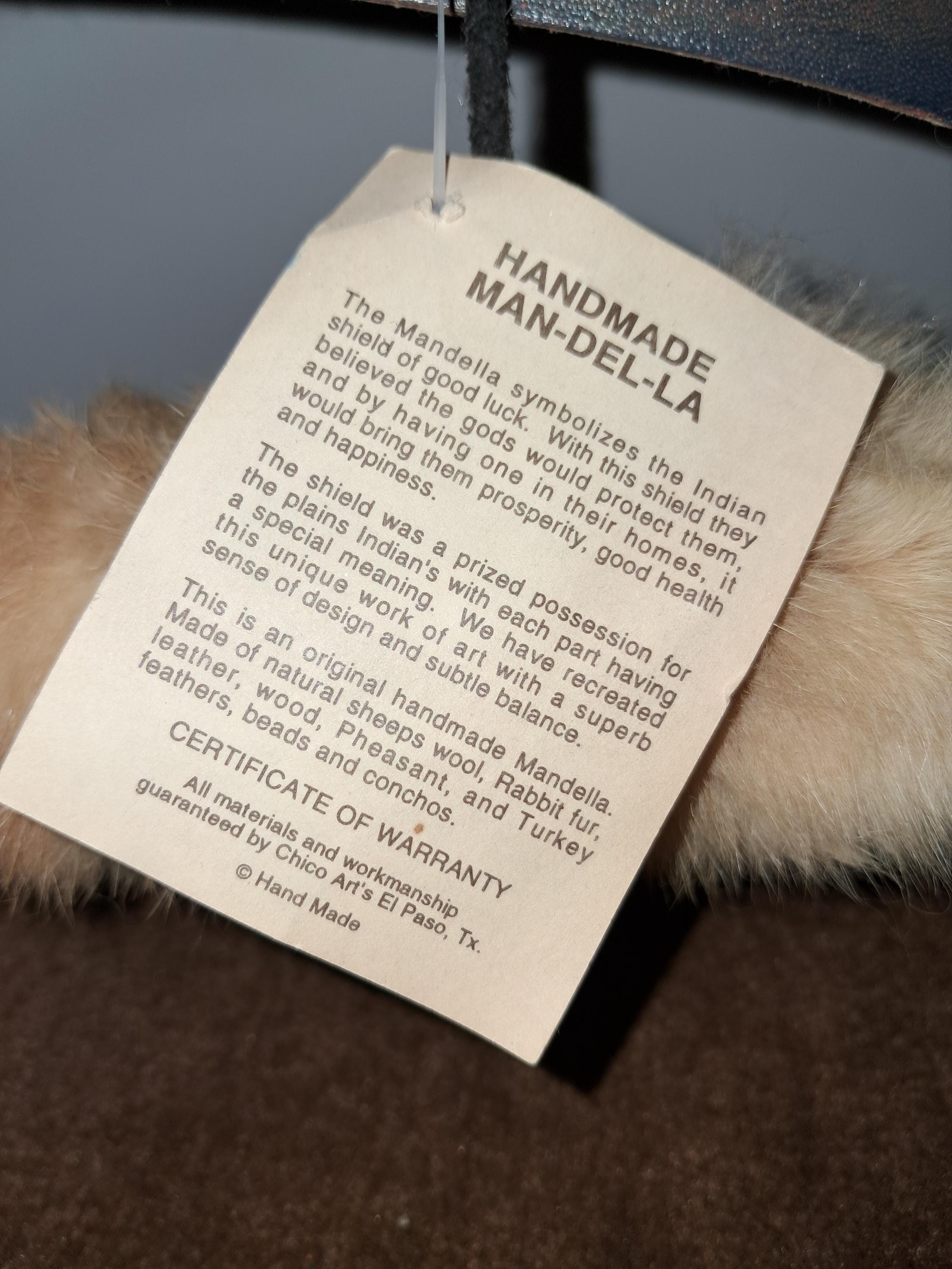 This beautiful looking Wall Hanging is top quality Leather. It features the classic native Indian "end of the trial" design with a tired Indian on a horse, sunset in the background on fabric that is tied to a circle with blue and white feathers on the side. The colors are bright with lots of details,