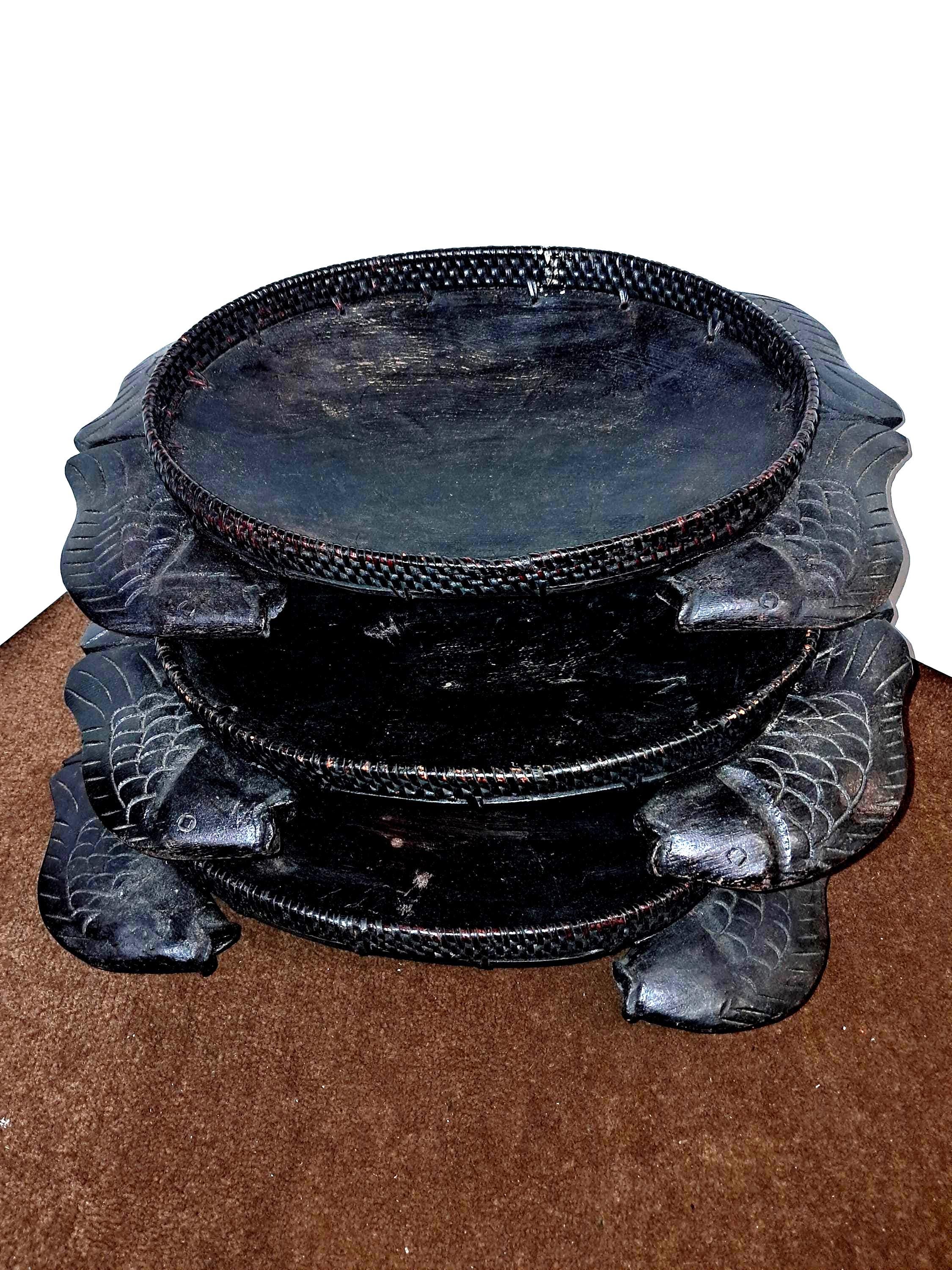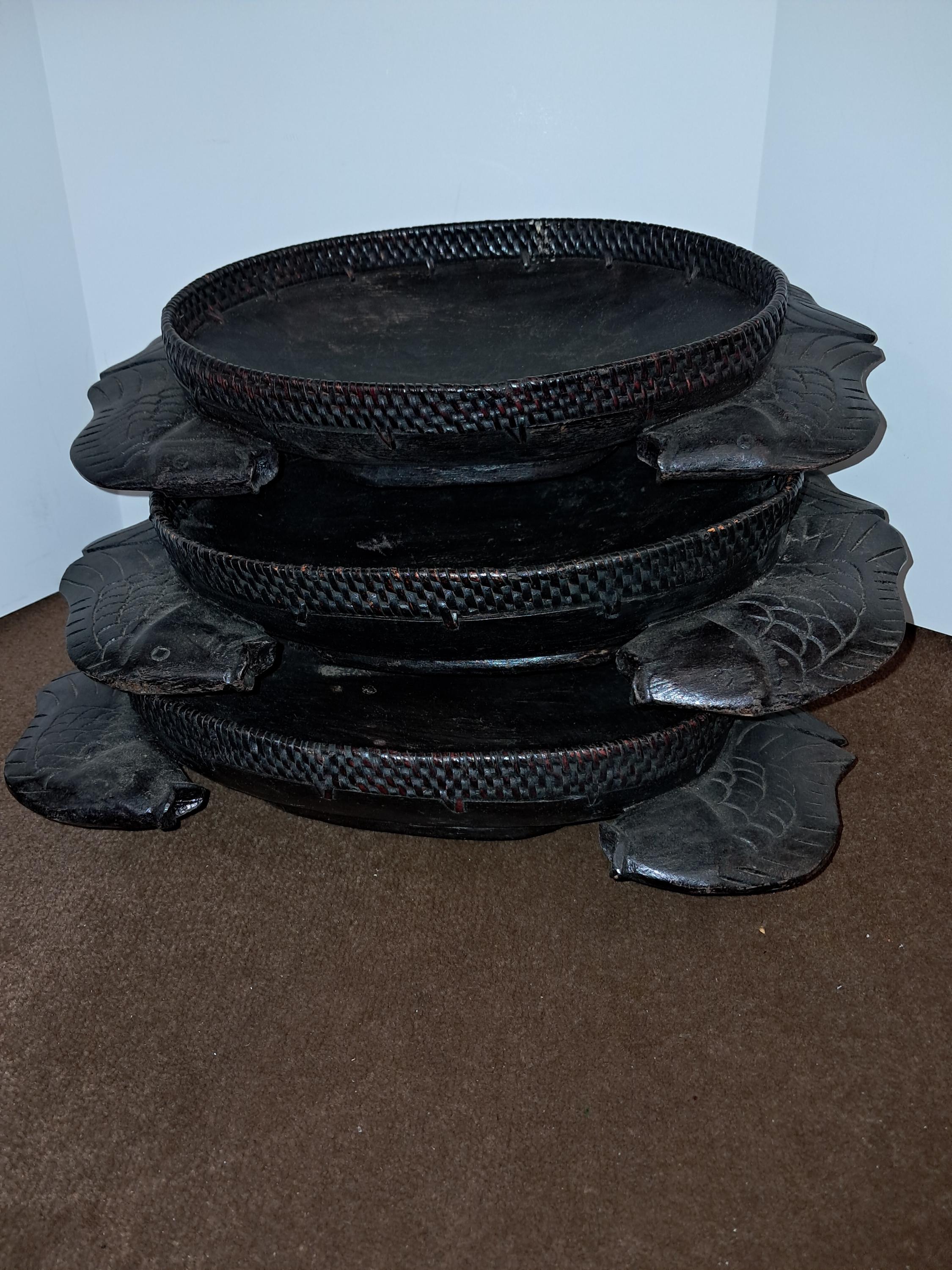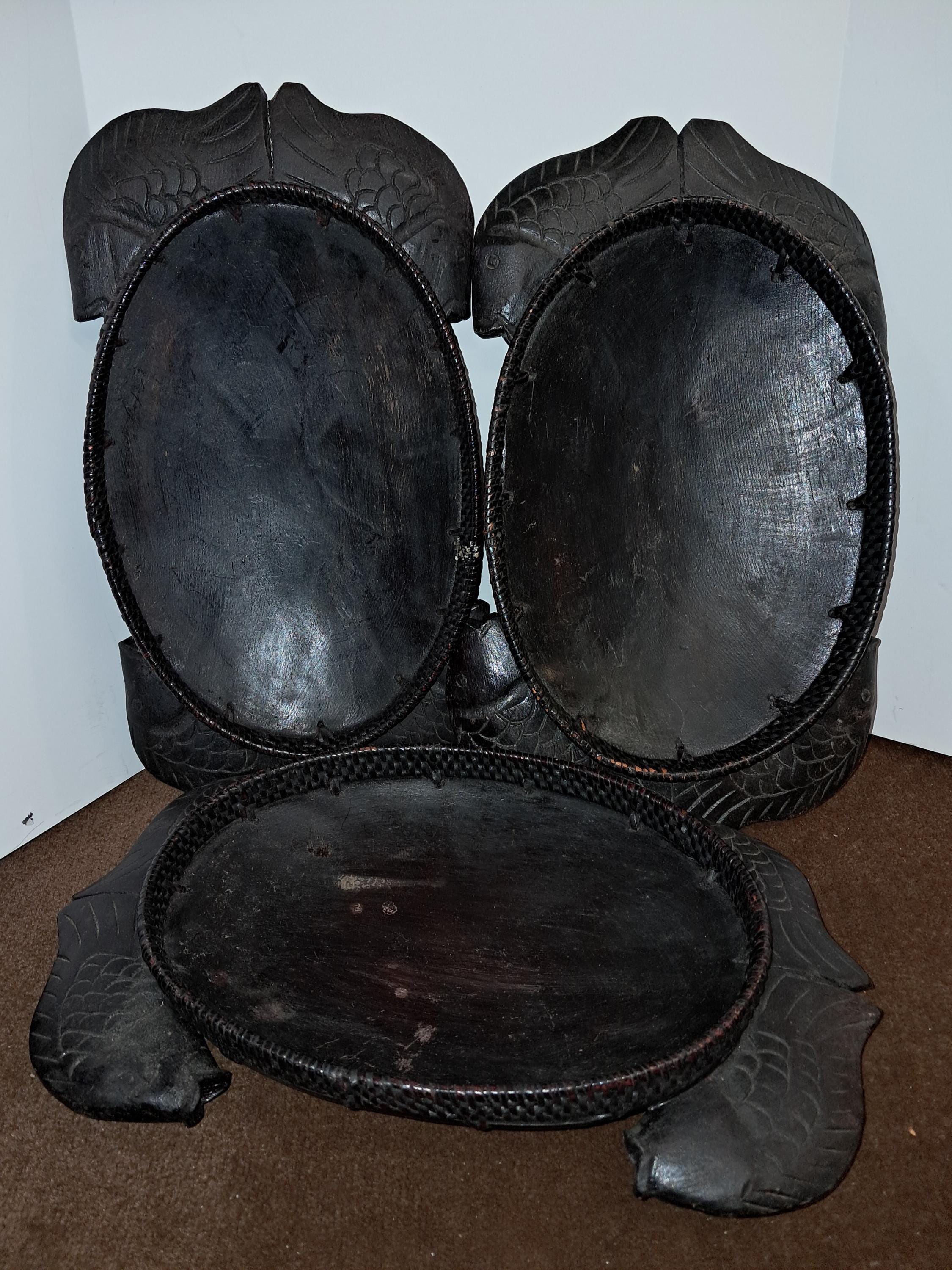 3 Serving Wood Bowls Carved Fish Handles Pisces Serving African Native Primitive
