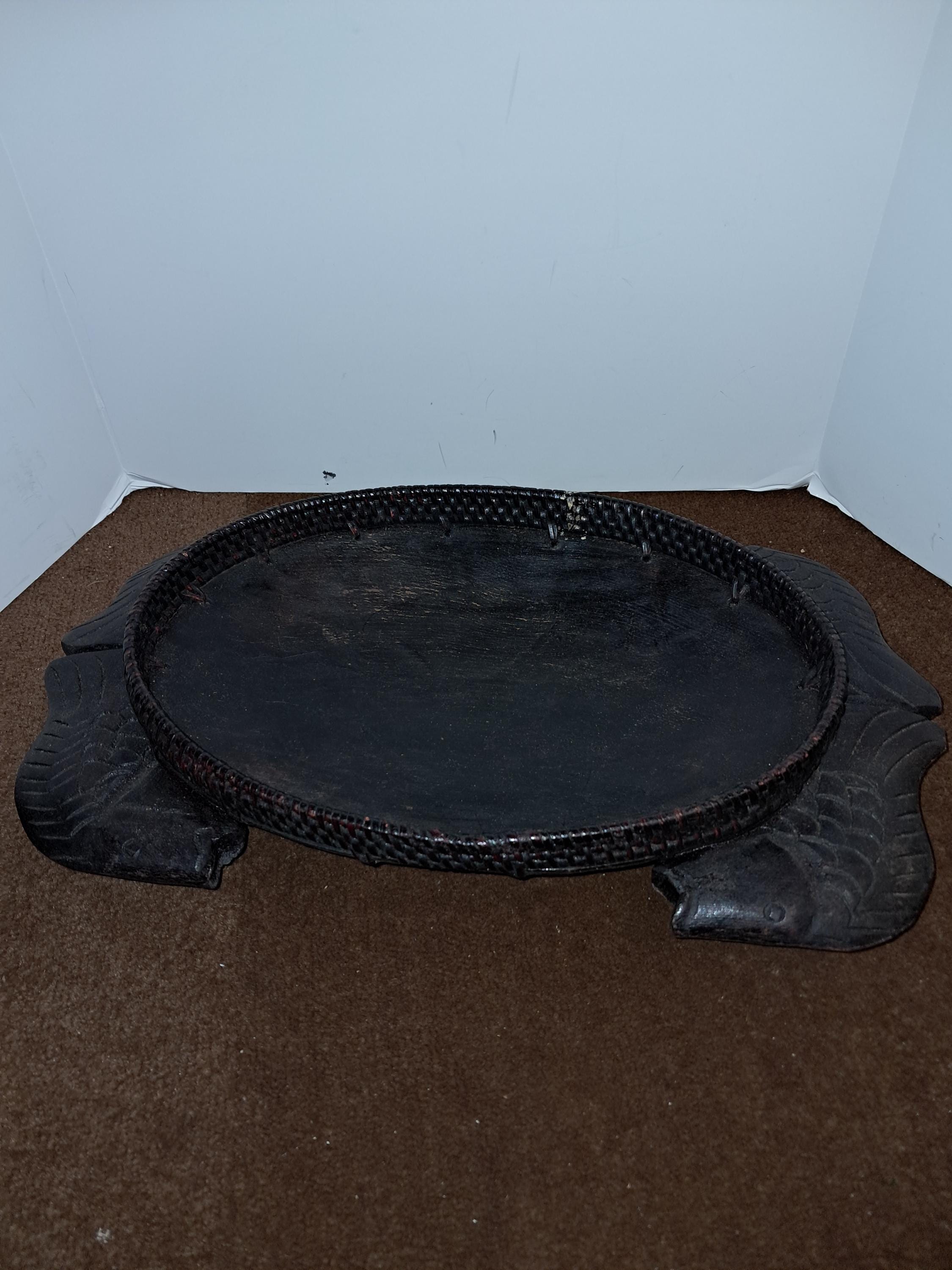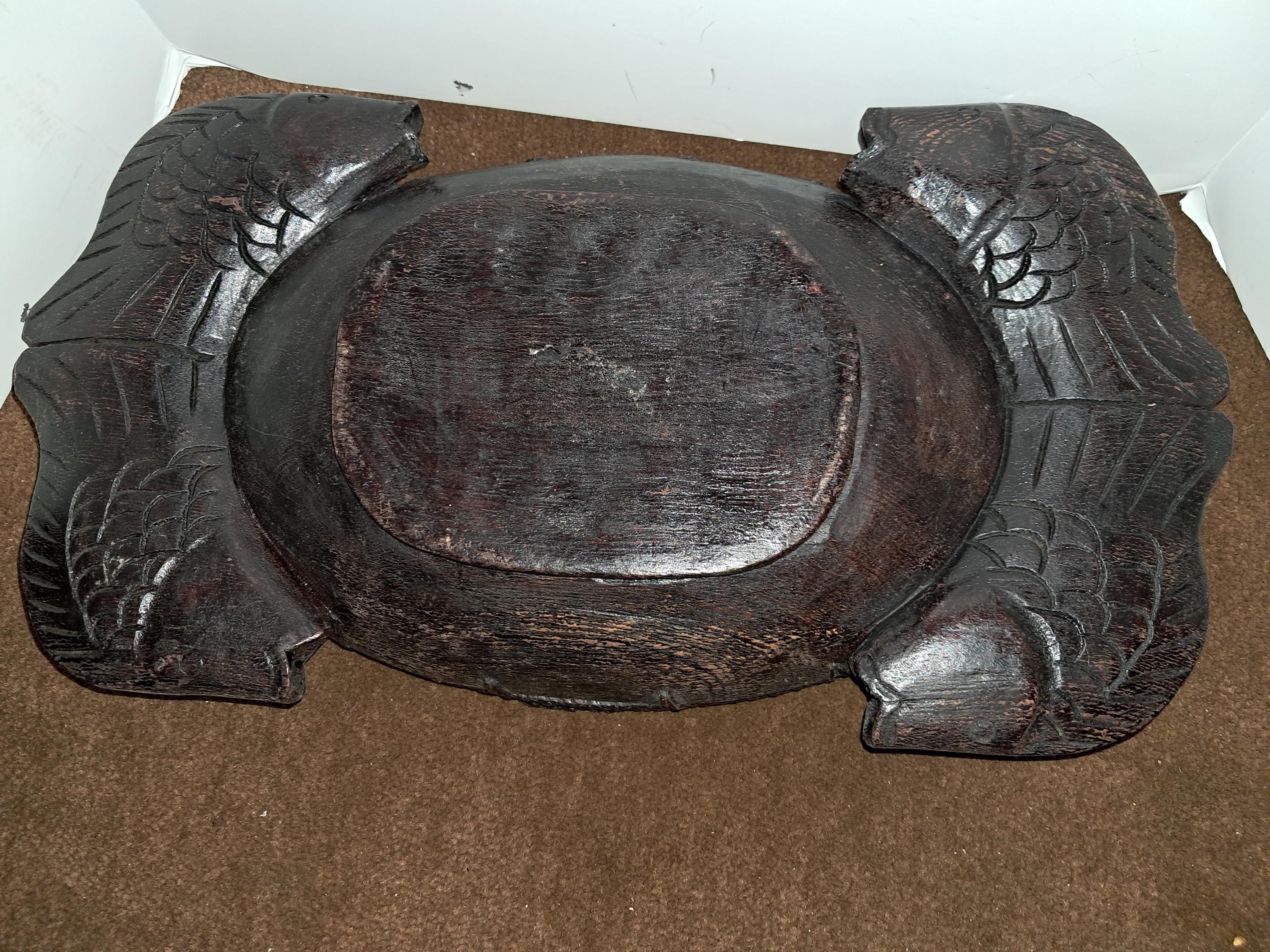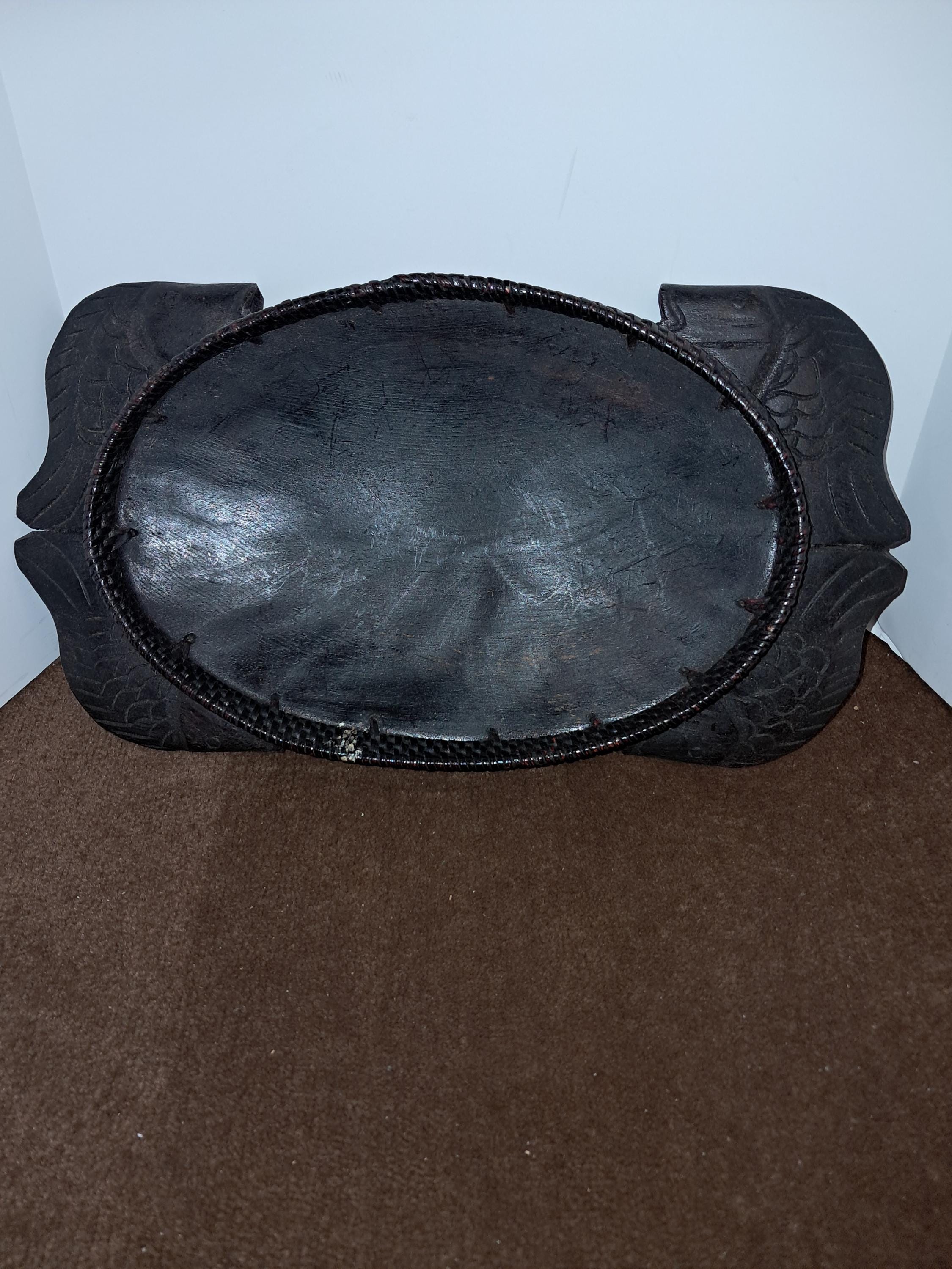 This unique serving bowl features a carved fish design with handles, perfect for serving your favorite dishes. The bowl measures approximately 13.5 inches by 9.00 inches and is made of wood. The African culture-inspired design adds a touch of primitiveness to your collection, making it a great addition to any ethnic or cultural display. The provenance of the item is not available, and it has not been modified. This collectible piece is perfect for anyone who loves to serve food in a stylish and meaningful way.