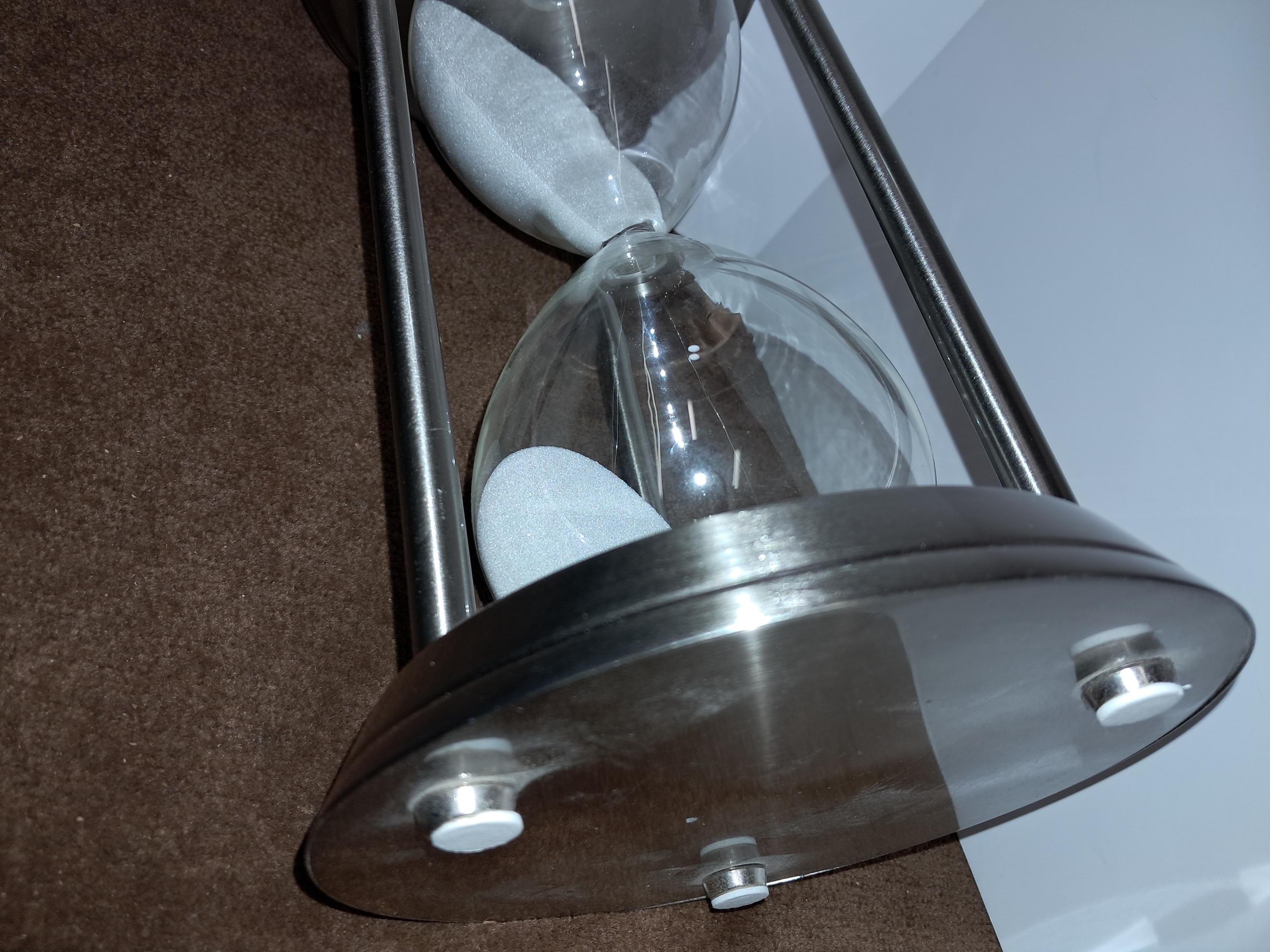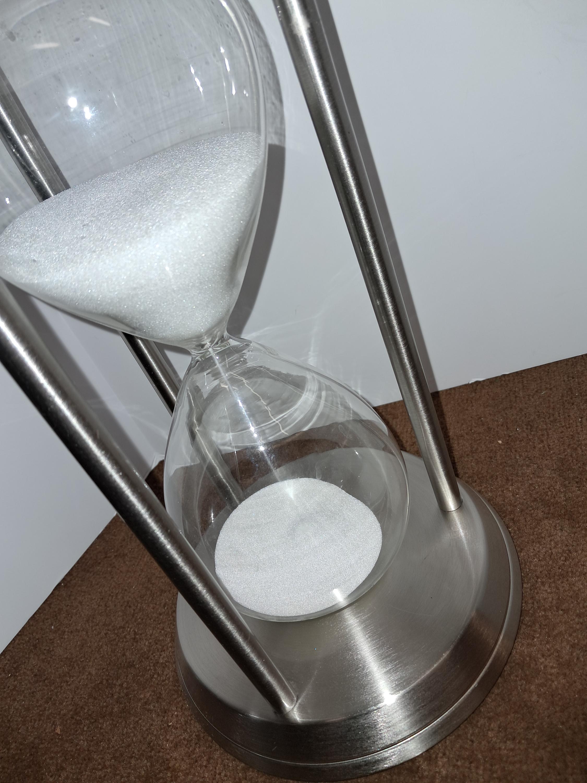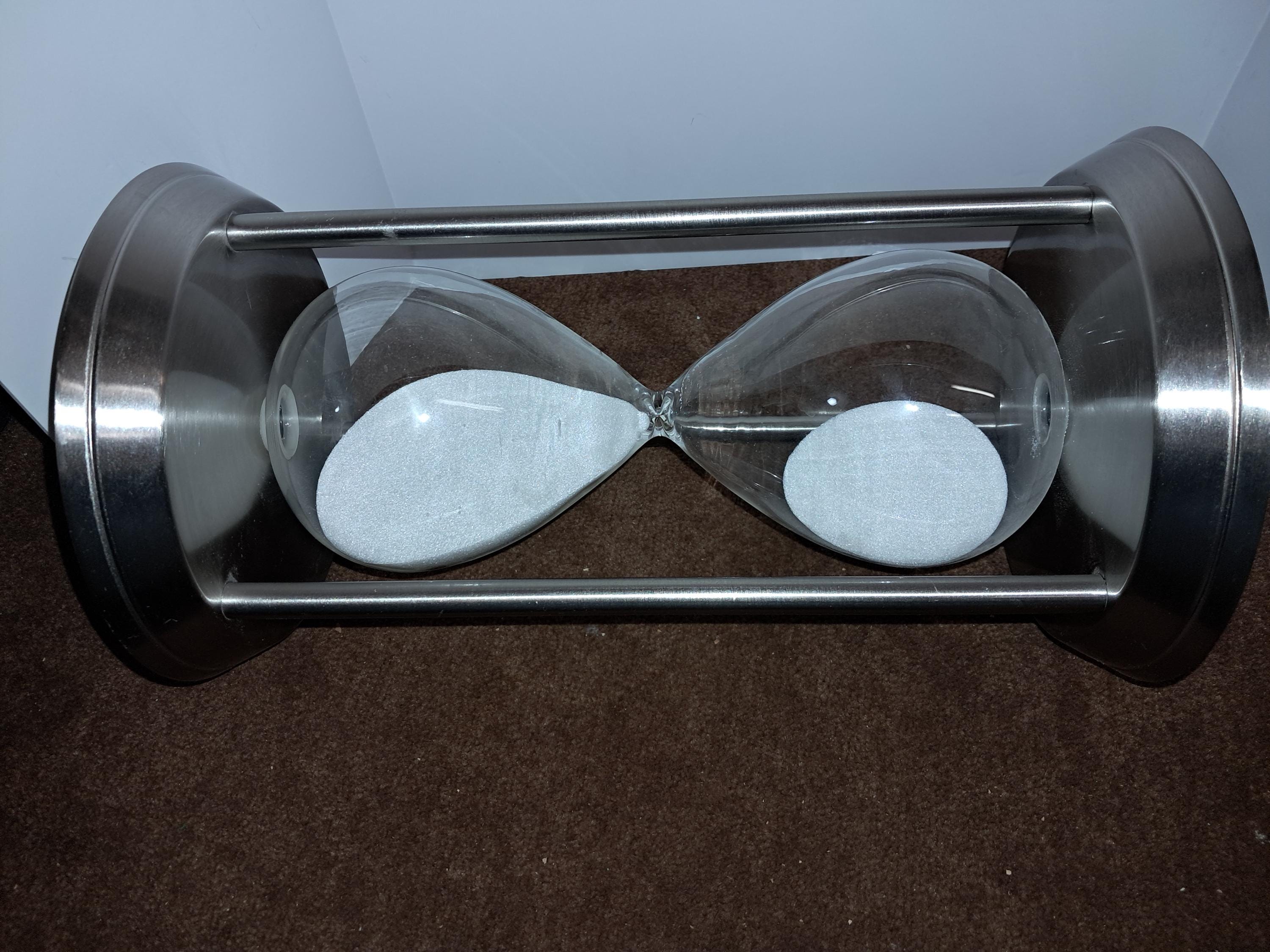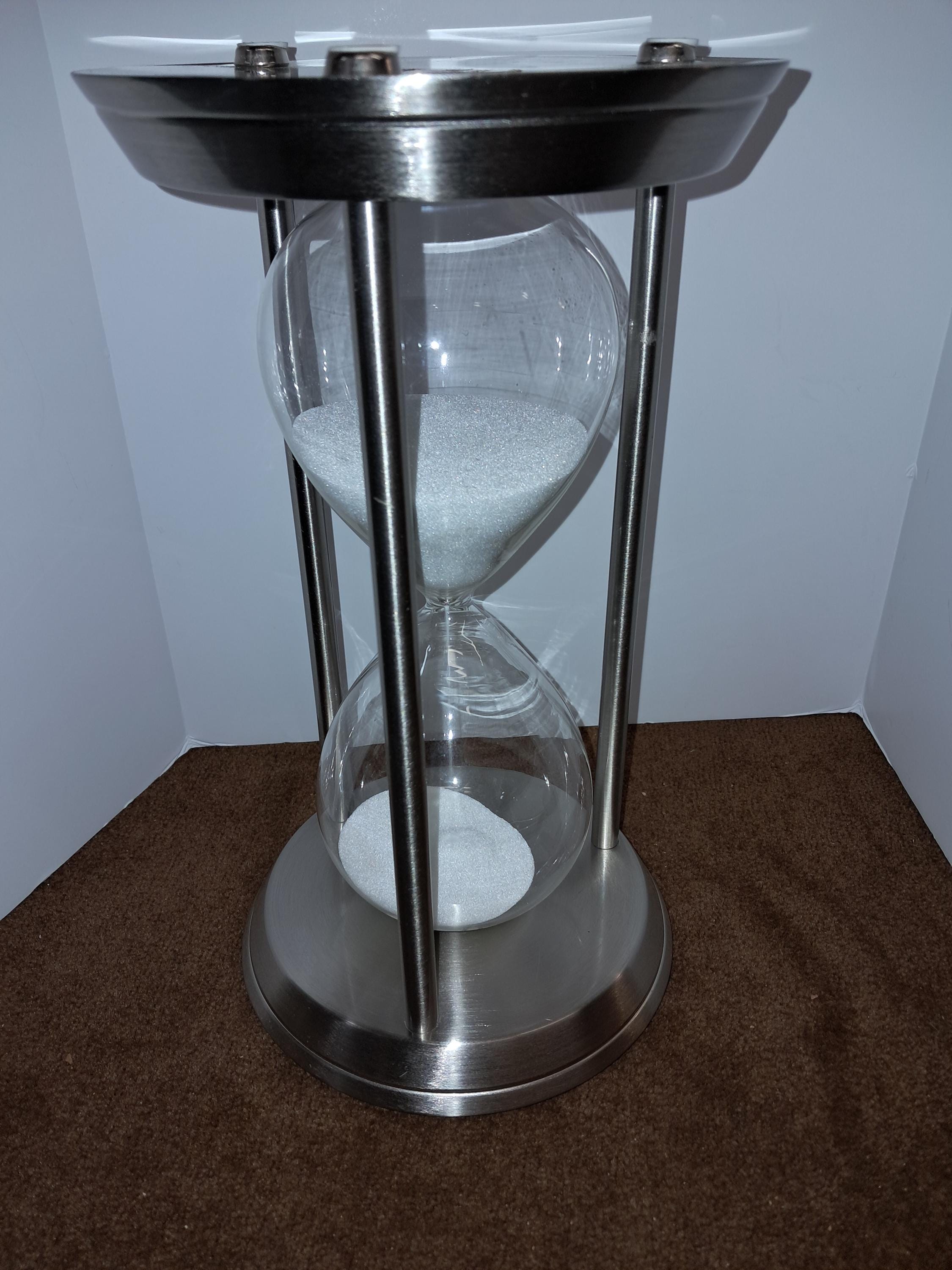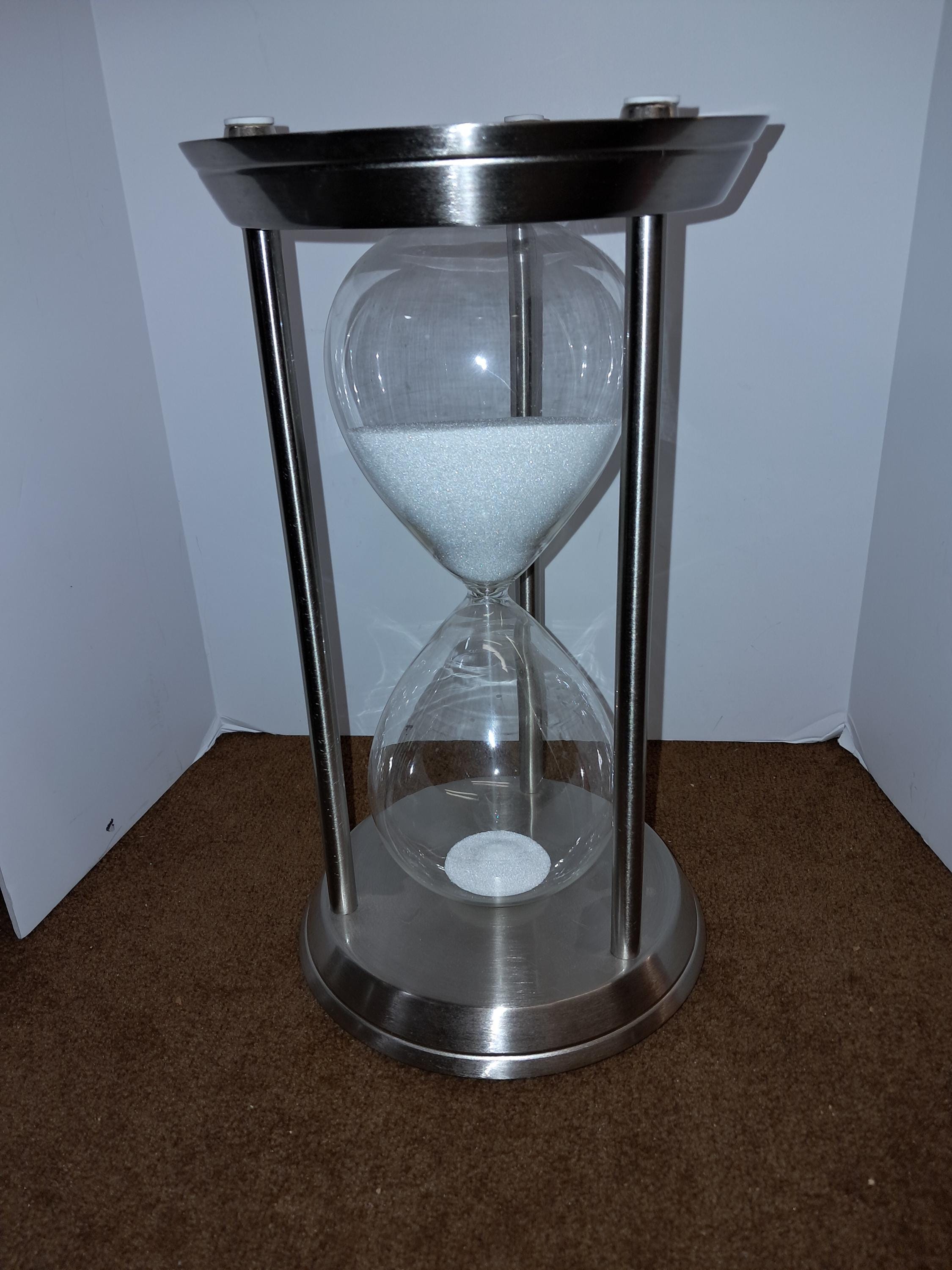 Hourglass Sand TimerOne Hour Timer12.25" tall x 7" wide x 7" deepMade of Glass and Sterling SteelExcellent condition with no damages