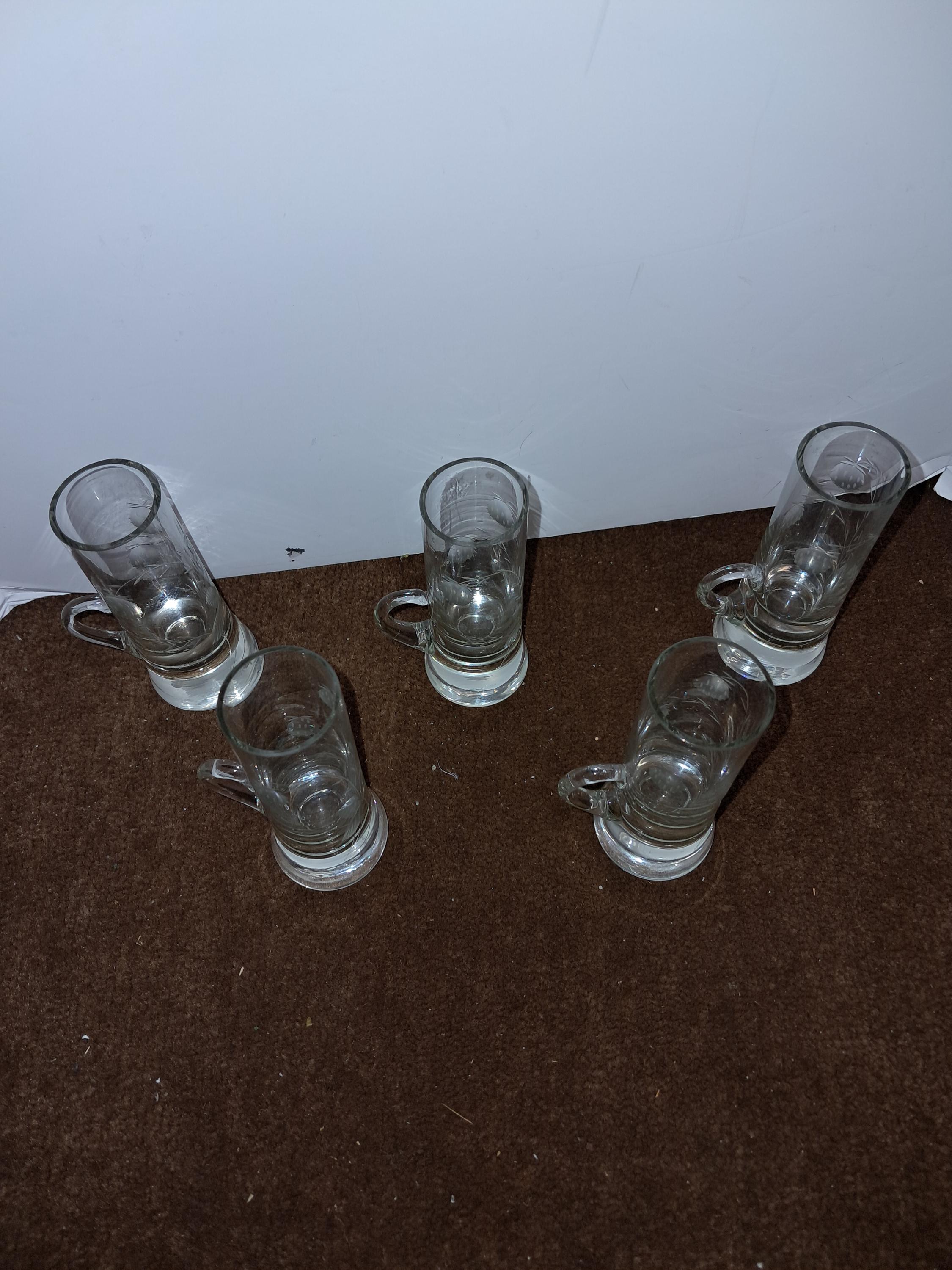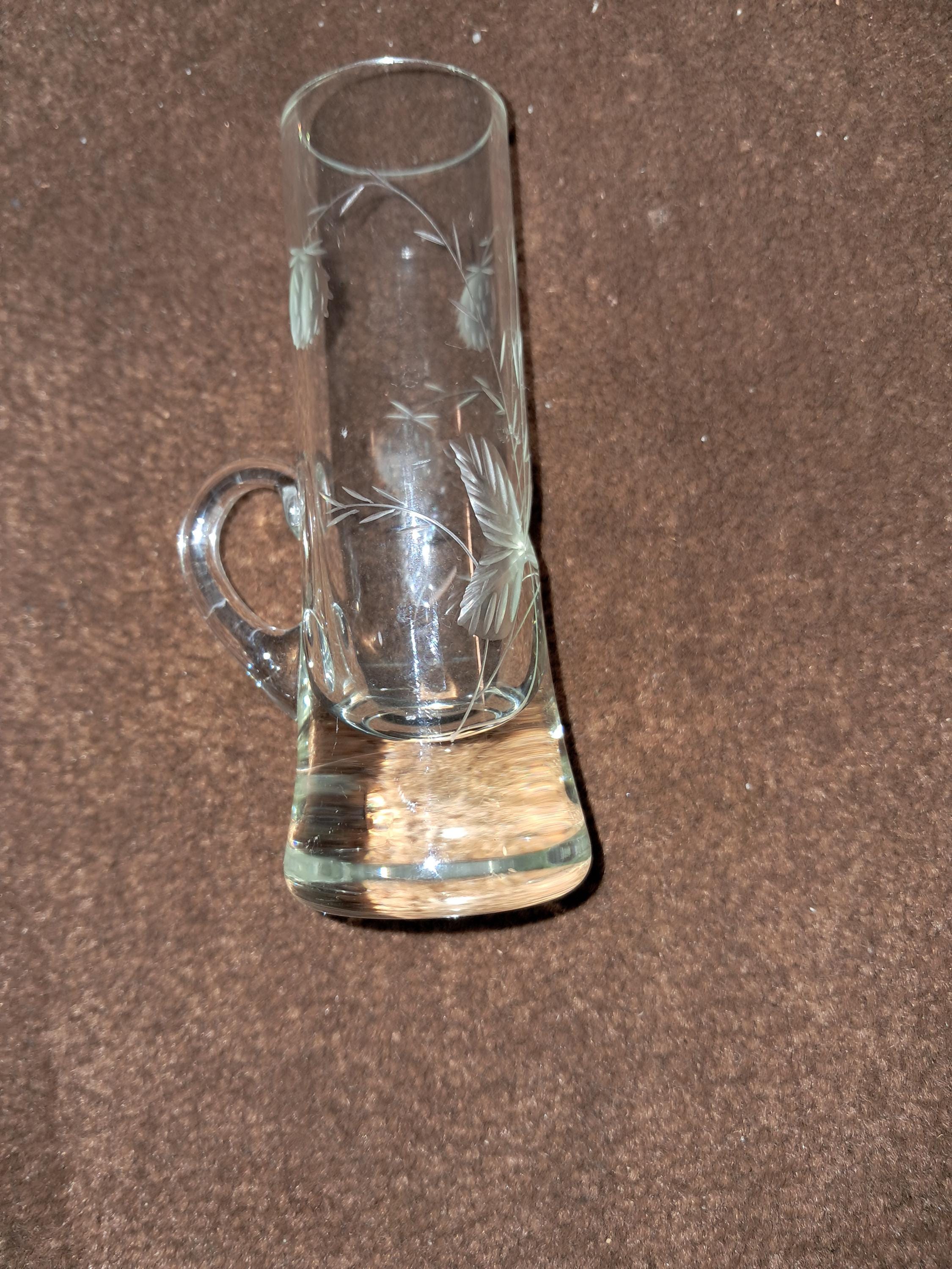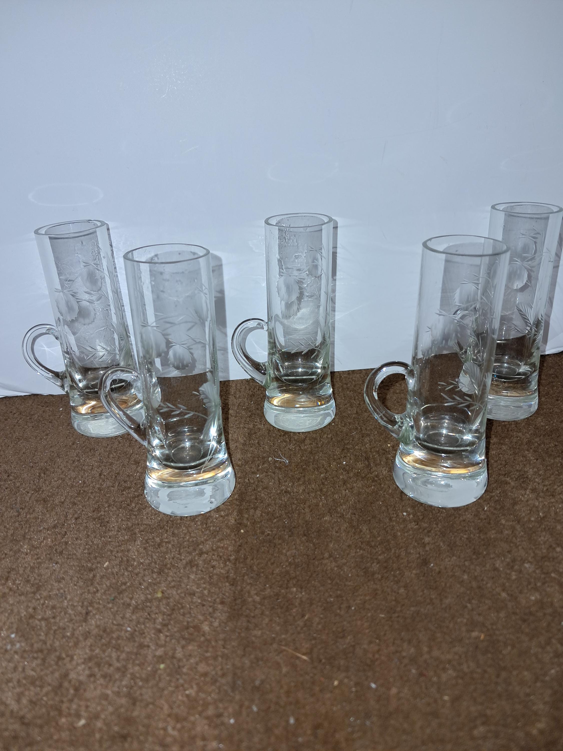5 Etched Shot Vintage Glasses Aperitif - Set of 5 Shot Hand blown Cordial - Retro Clear Glass Double Shot Glass Hand blown Floral Etched Mod4" TALL X 1.75" WIDE ( with handle) x 1.5" deep Great vintage condition