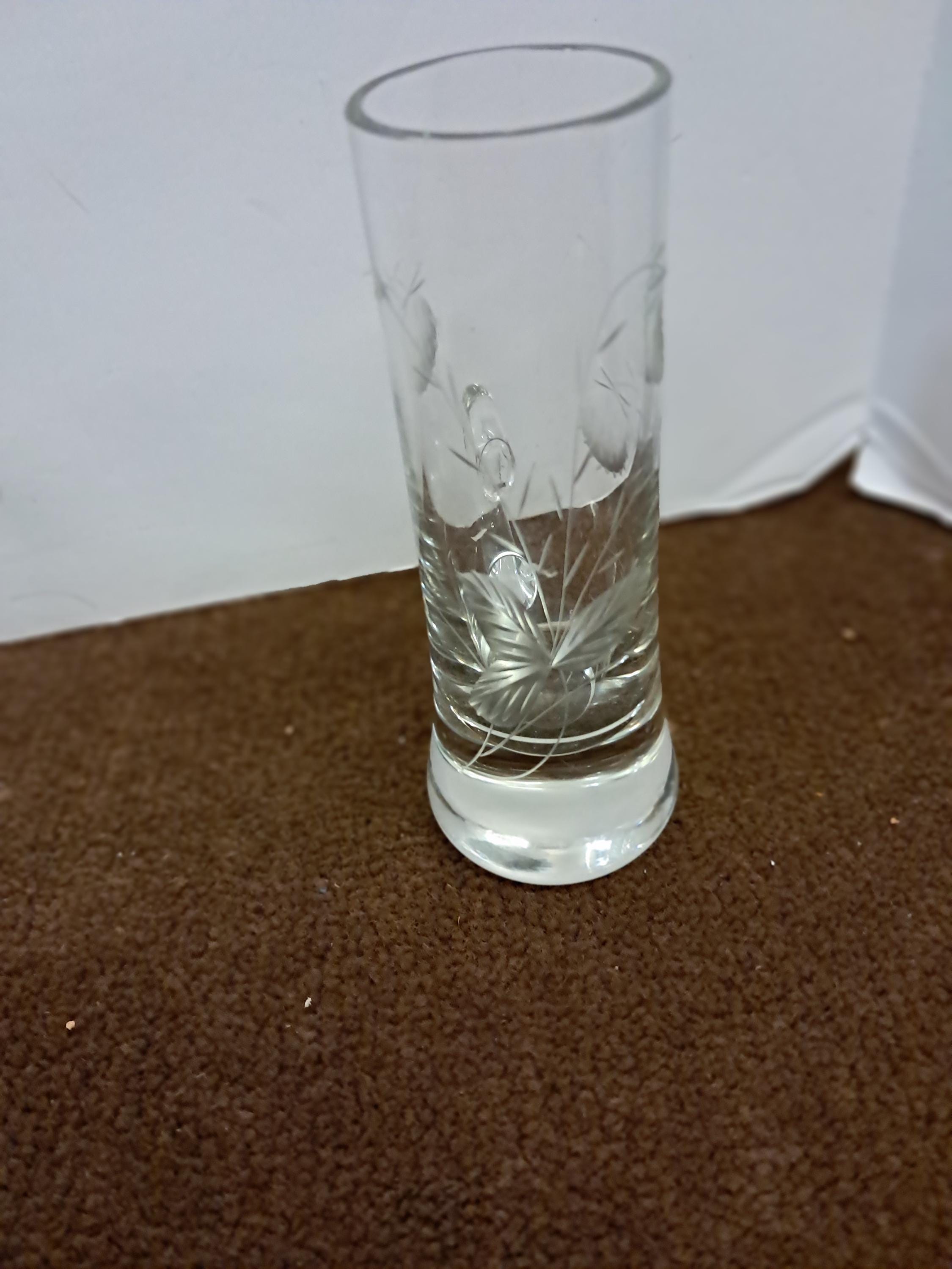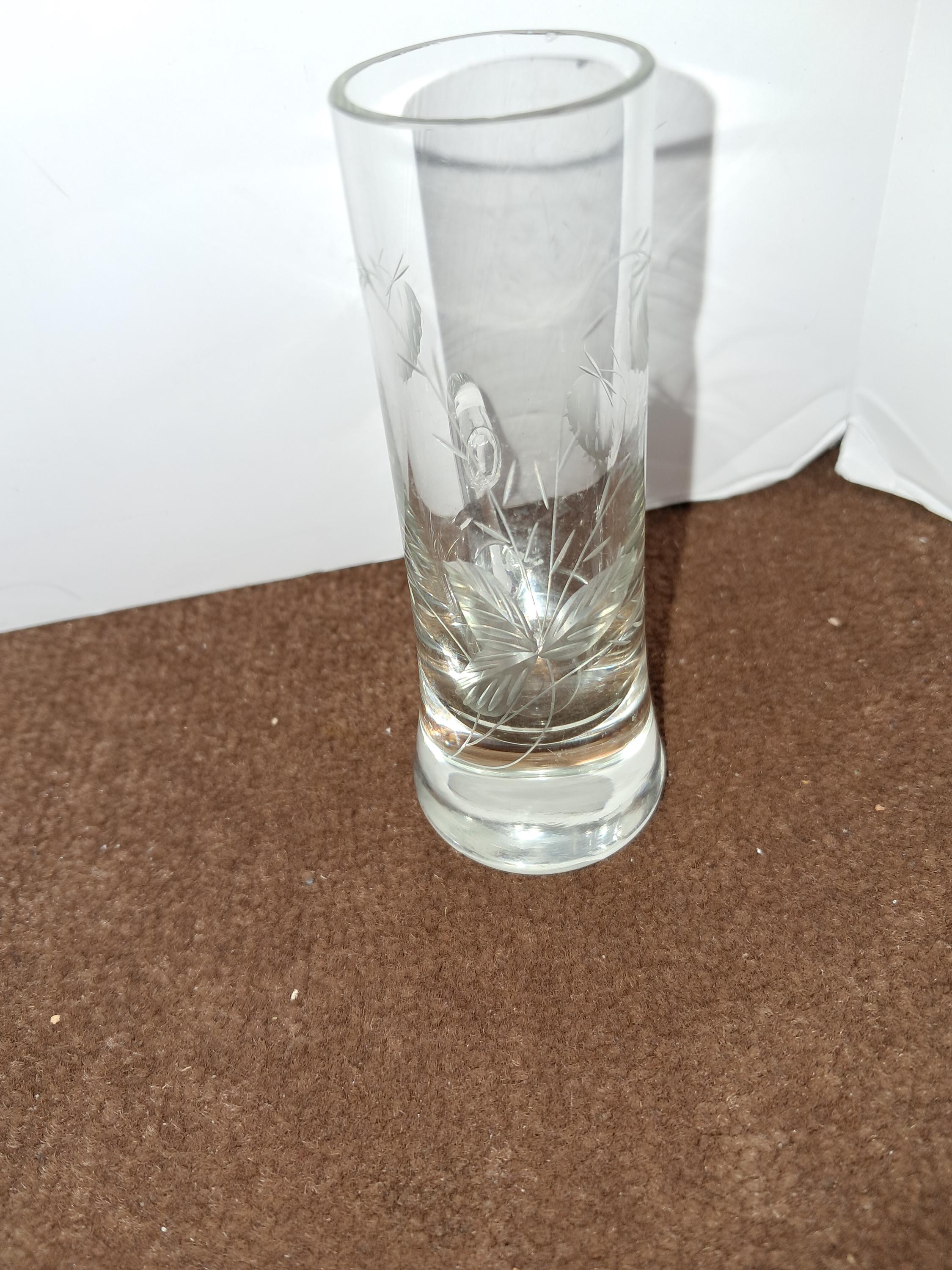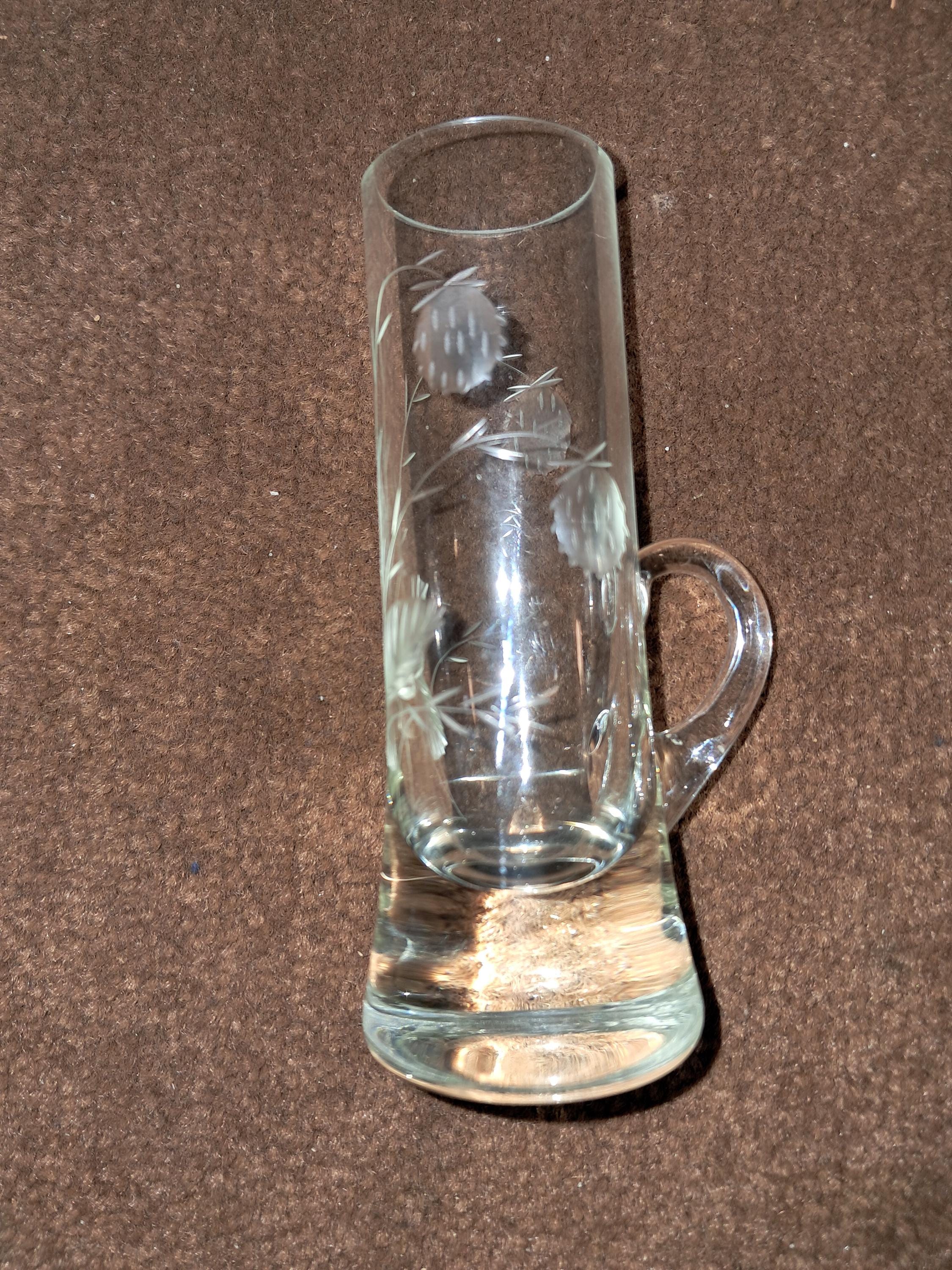 5 Etched Shot Vintage Glasses Aperitif - Set of 5 Shot Hand blown Cordial - Retro Clear Glass Double Shot Glass Hand blown Floral Etched Mod4" TALL X 1.75" WIDE ( with handle) x 1.5" deep Great vintage condition