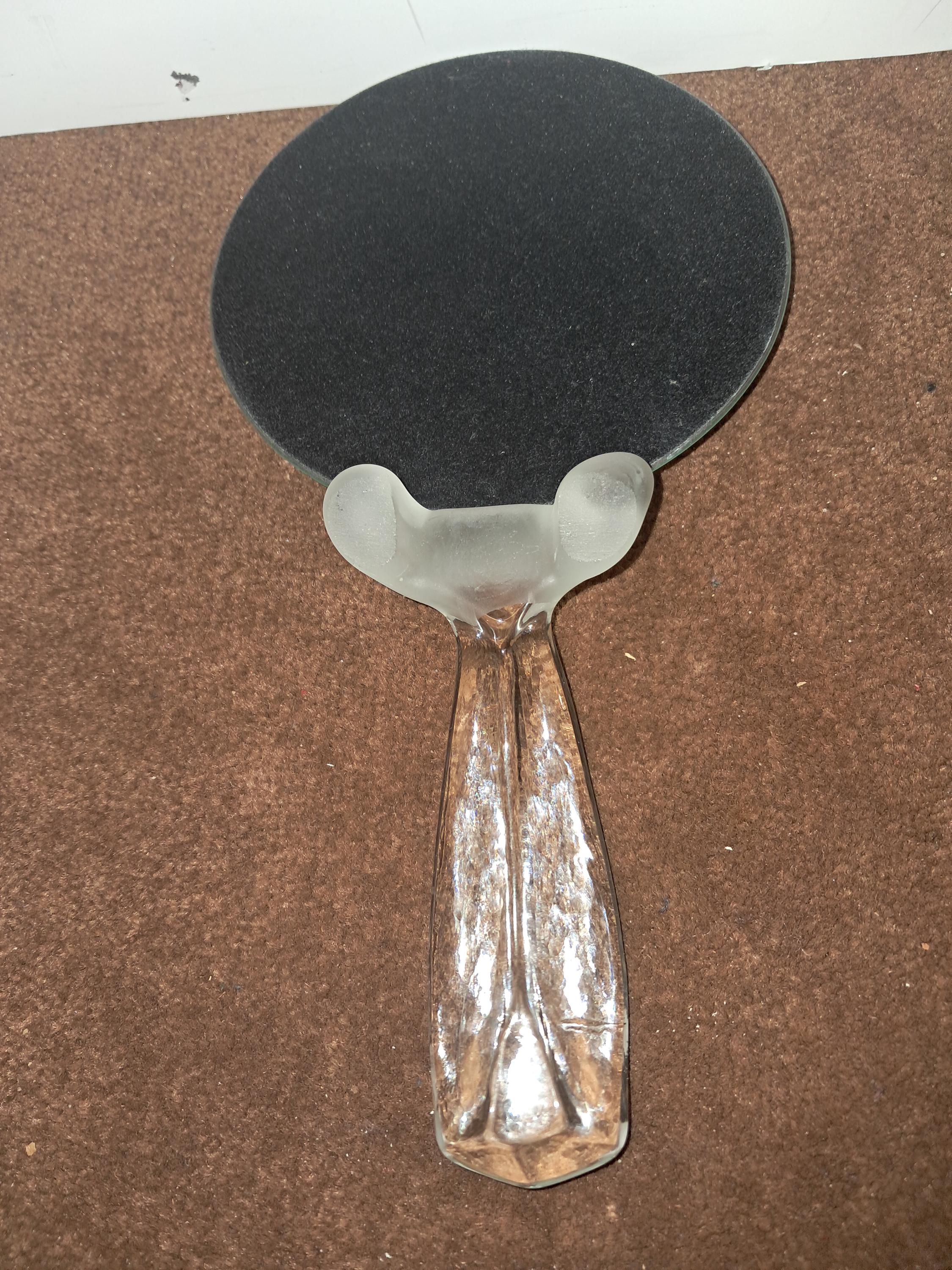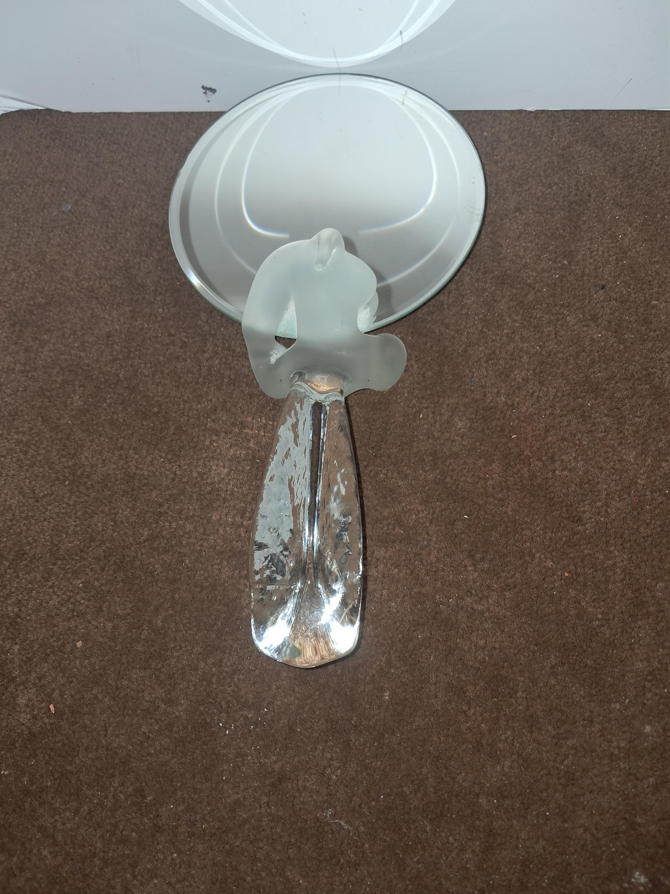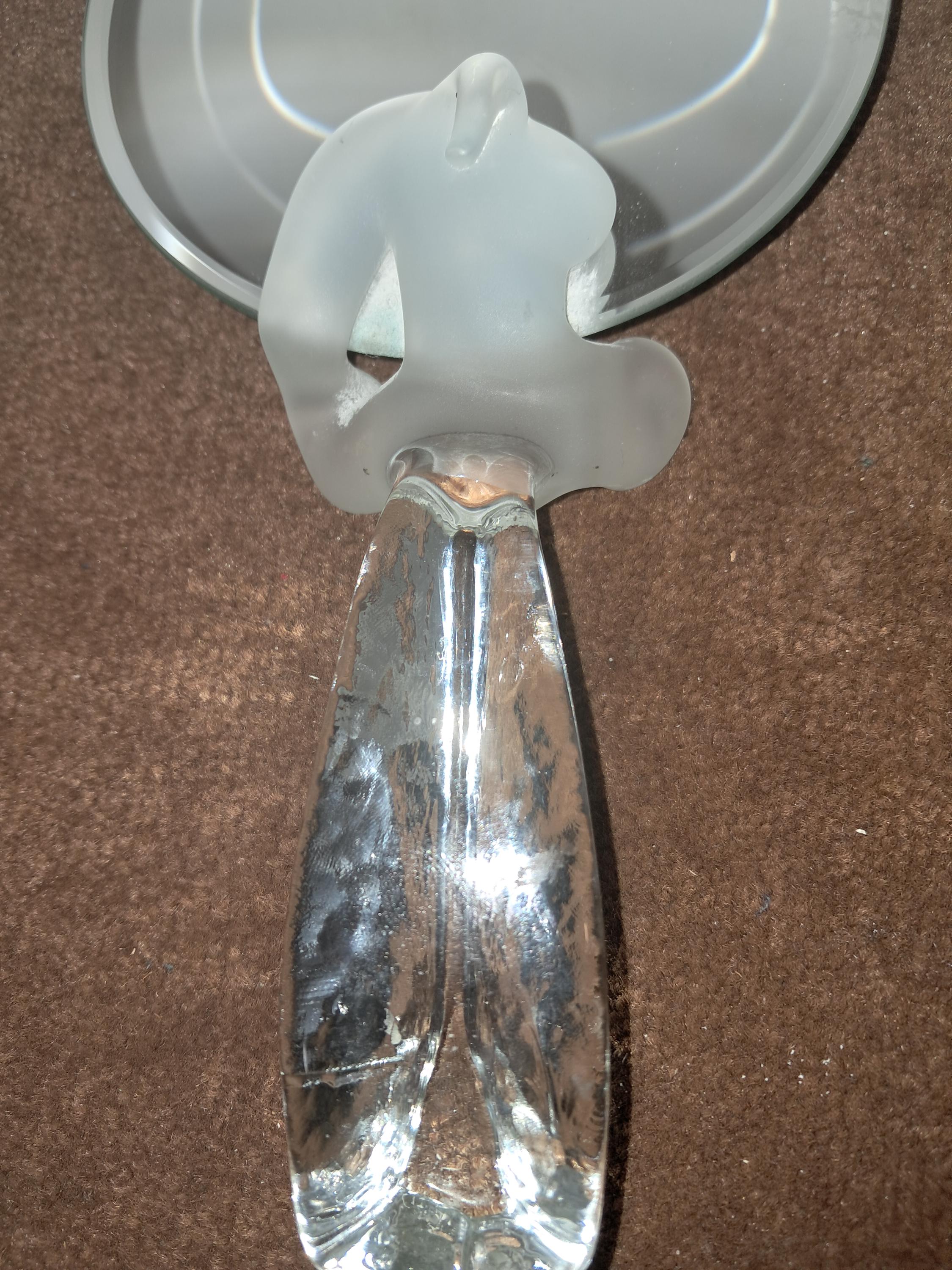 Unique Art Glass Hand Mirror. Circular one sided mirror, held up by a pulled and frosted piece of art glass attached to a prong-like translucent handle. Initialed indistinctly frosted piece.