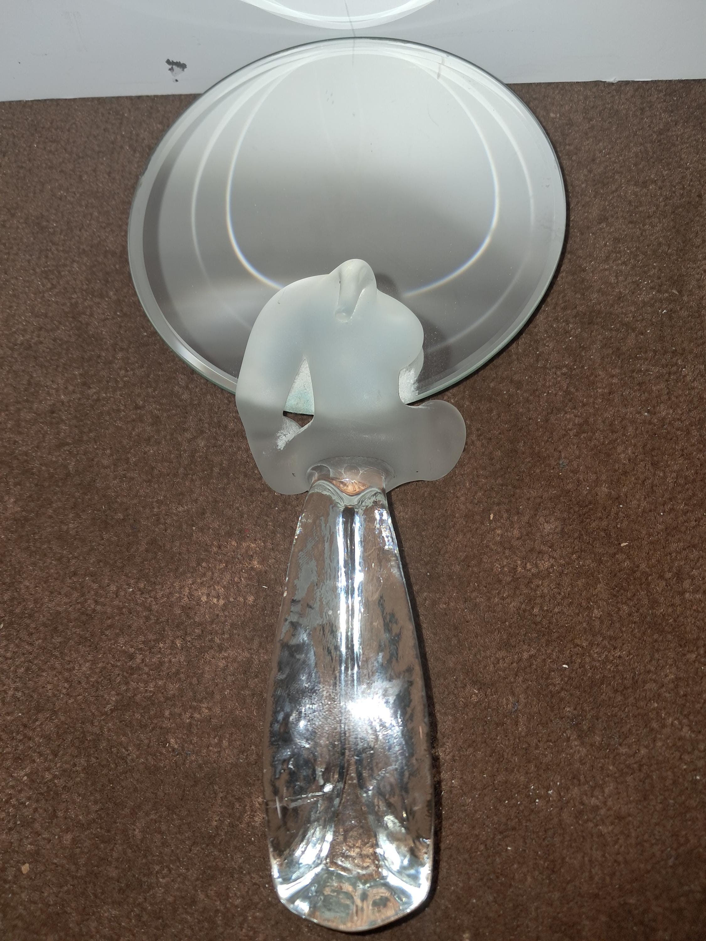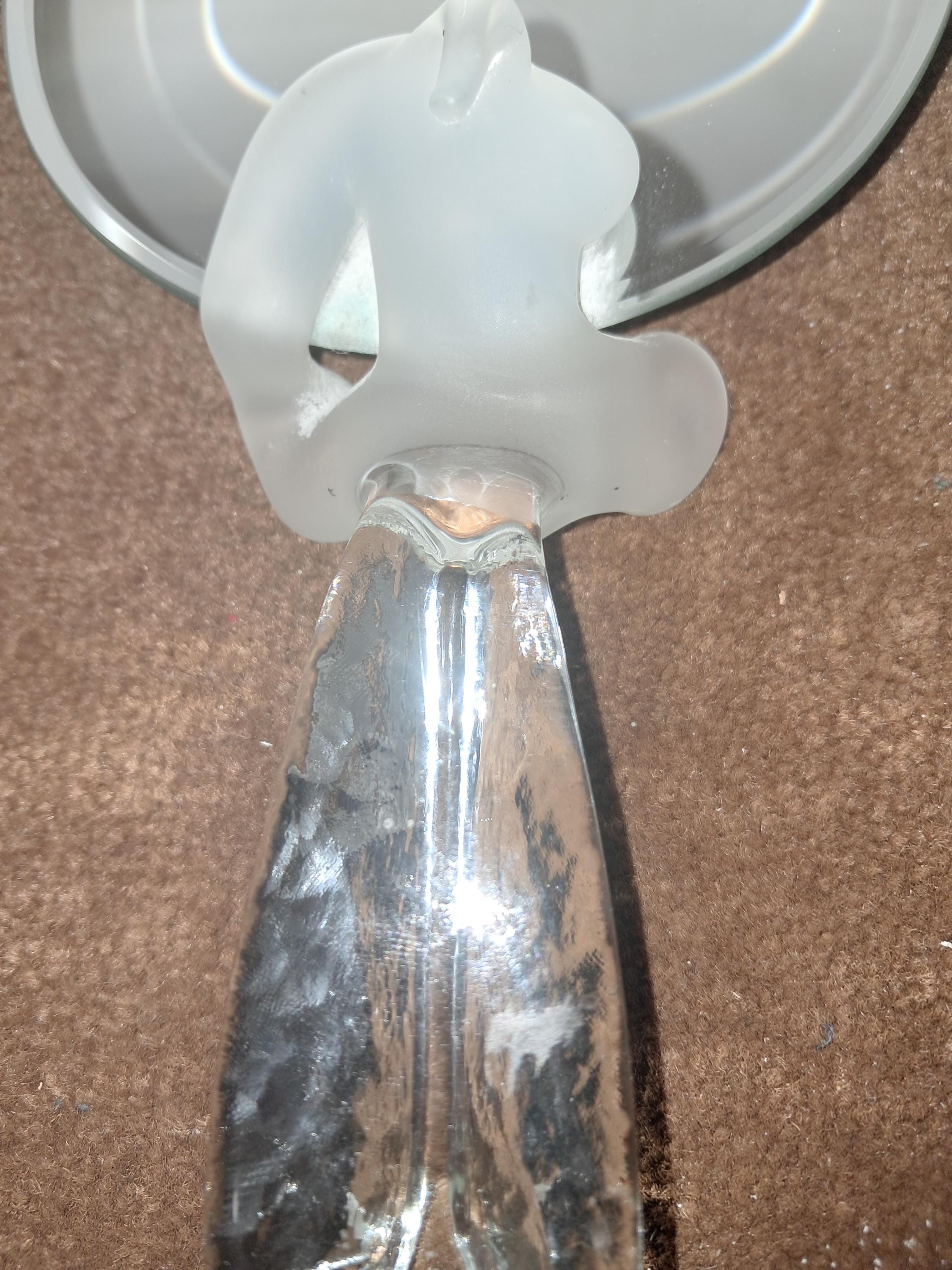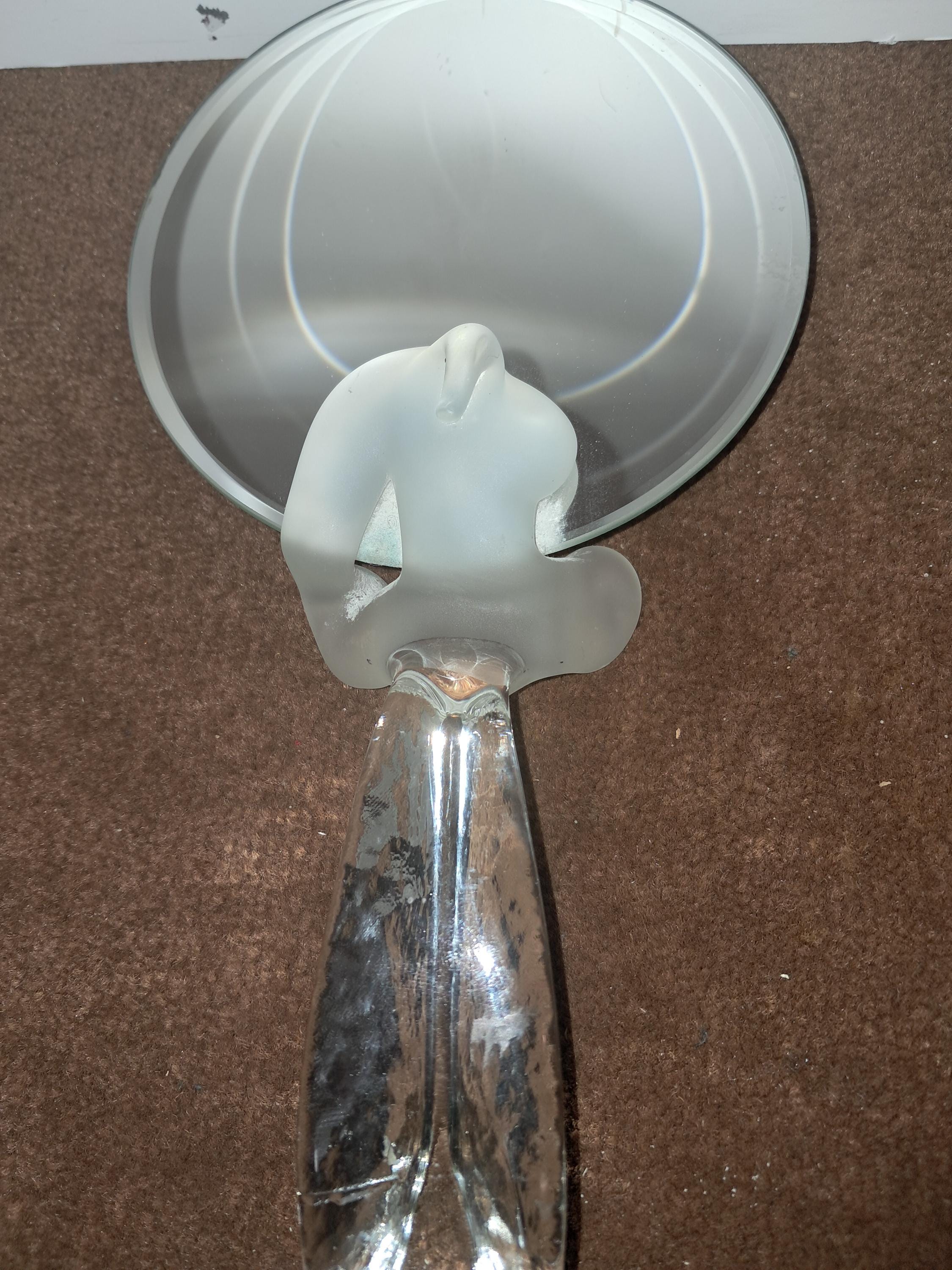 Unique Art Glass Hand Mirror. Circular one sided mirror, held up by a pulled and frosted piece of art glass attached to a prong-like translucent handle. Initialed indistinctly frosted piece.