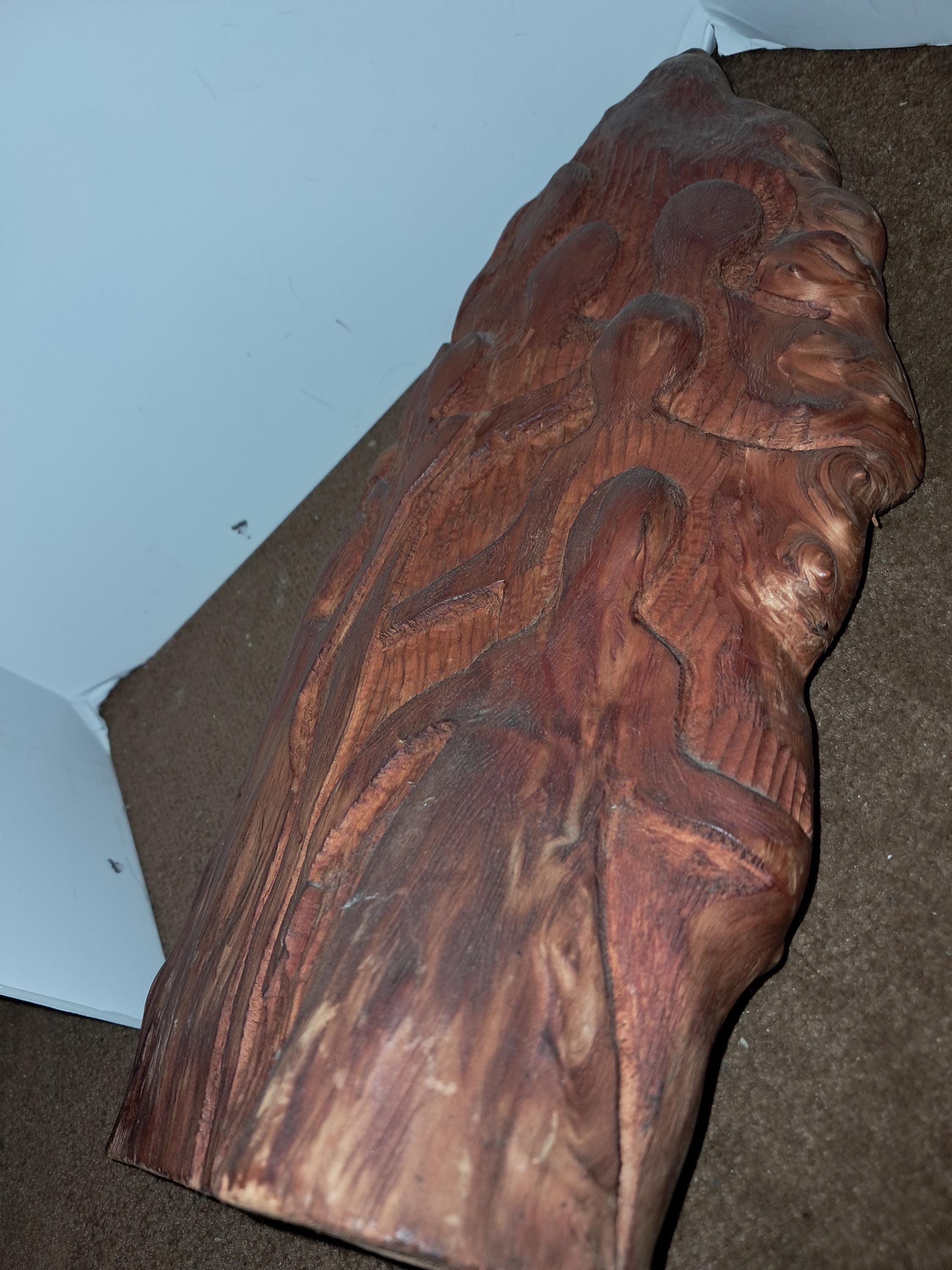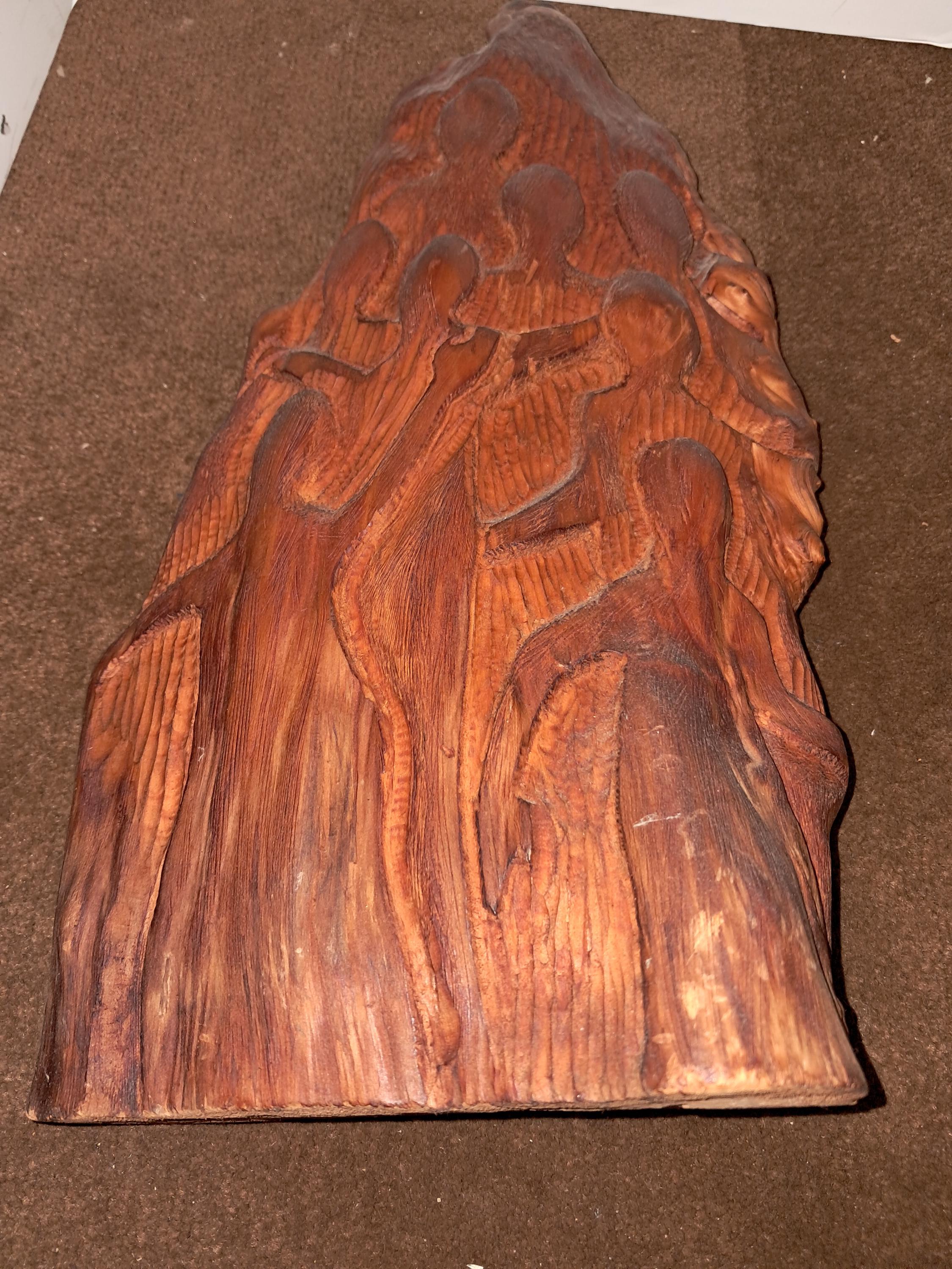 Wooden Hand Carved Sculpture featuring 8 figures of people14" tall x 7" wide x 3" deepExcellent Vintage ConditionVery Rare and UniqueLight WeightEstate Sale Find Circa 1960's