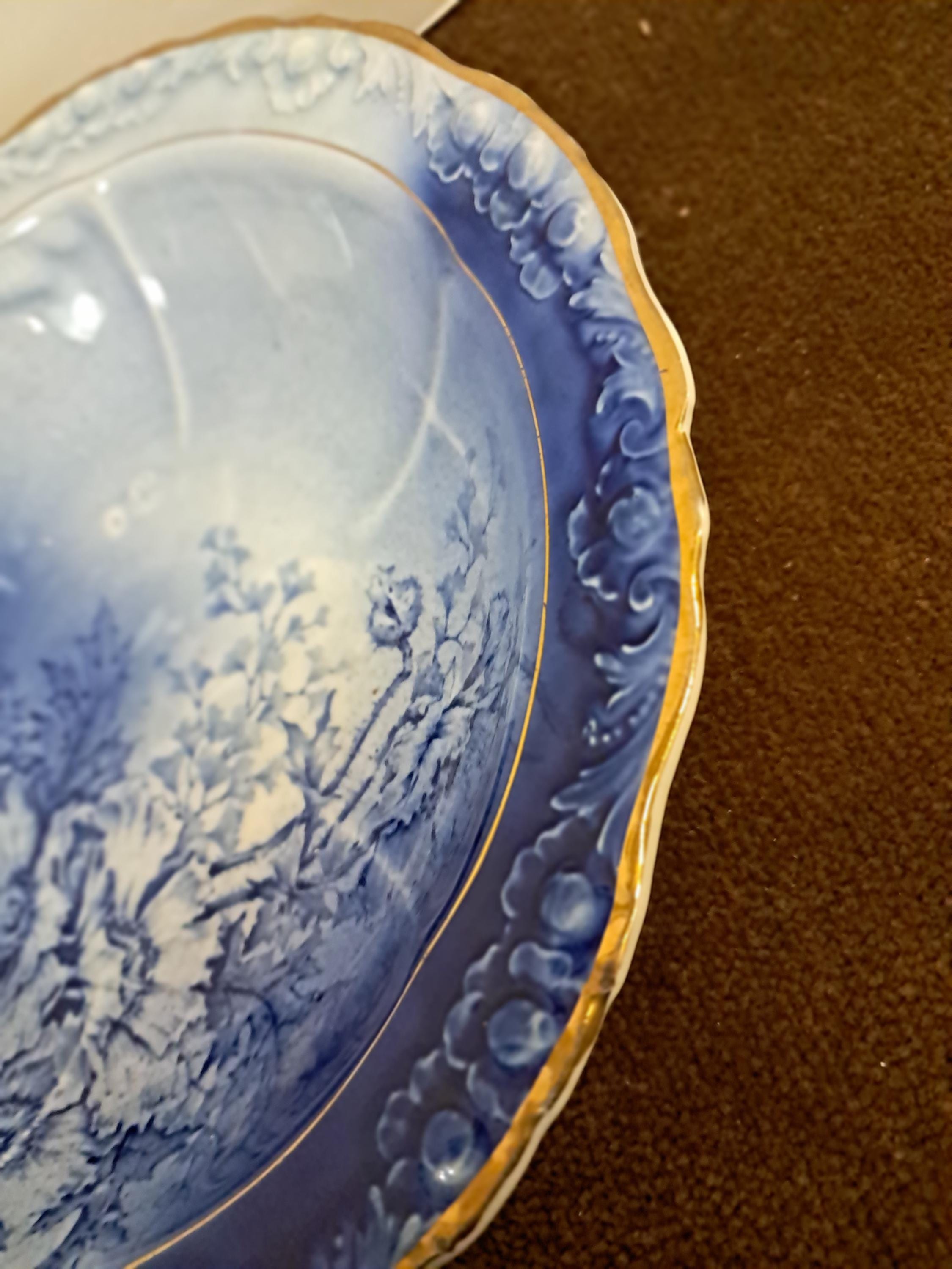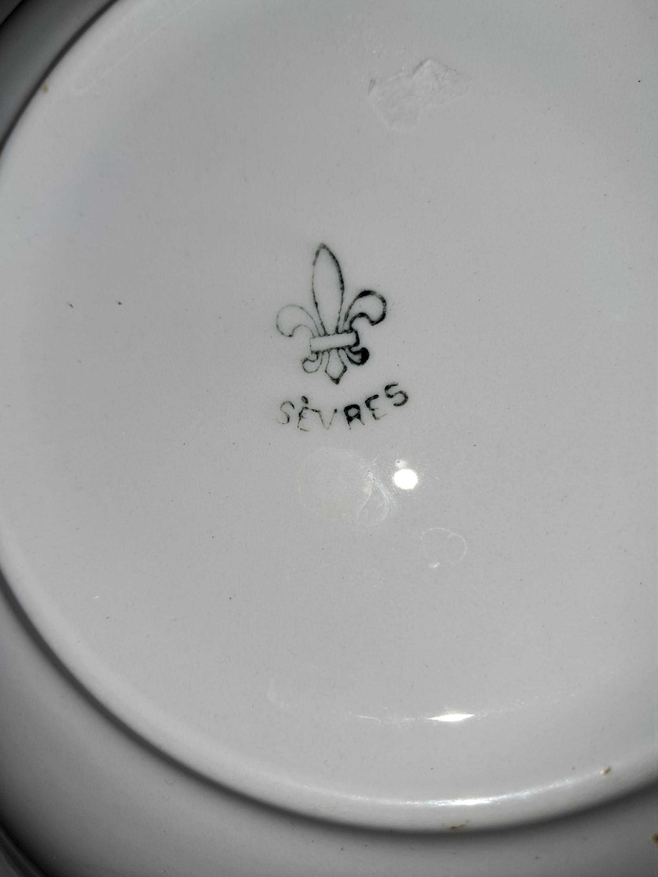 Rare Sevres, Manufacture Nationale de France, rare porcelain bowl with extensive gilded decoration of Nature in the center, gilded fillet, and marbled blue band that is similar to Iconographies Francois decoration. On the backside of the plate, there are two gold gilded rings.