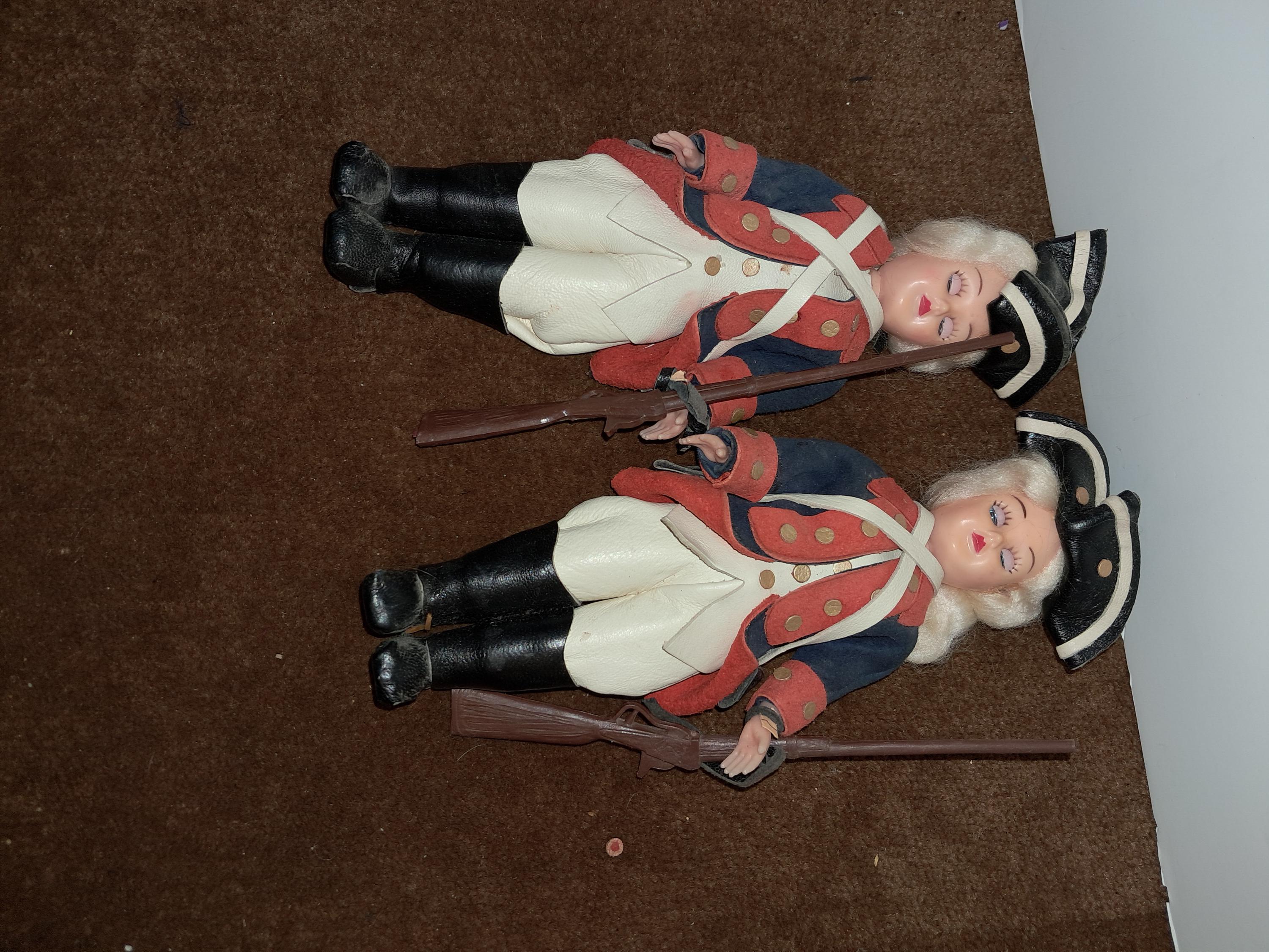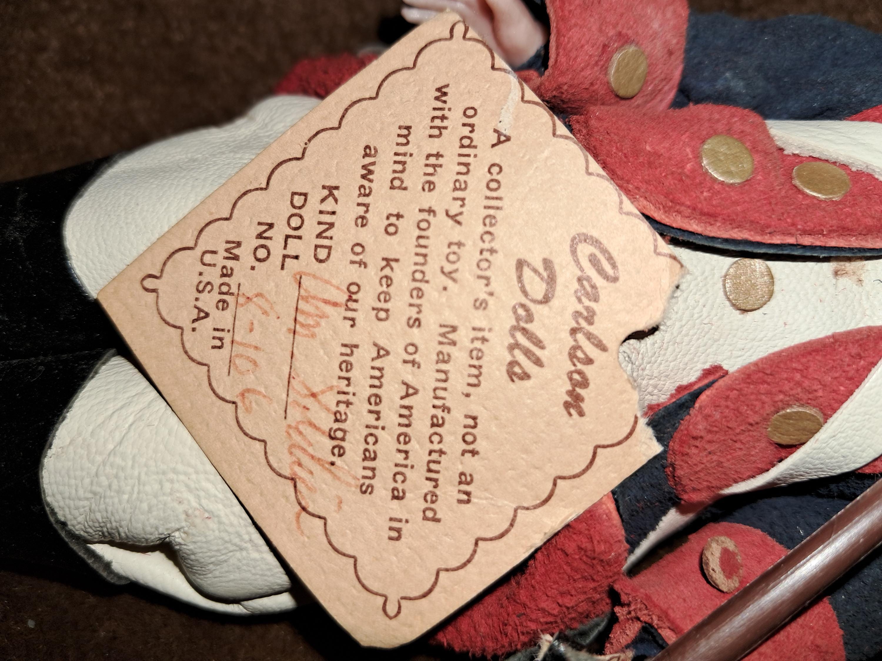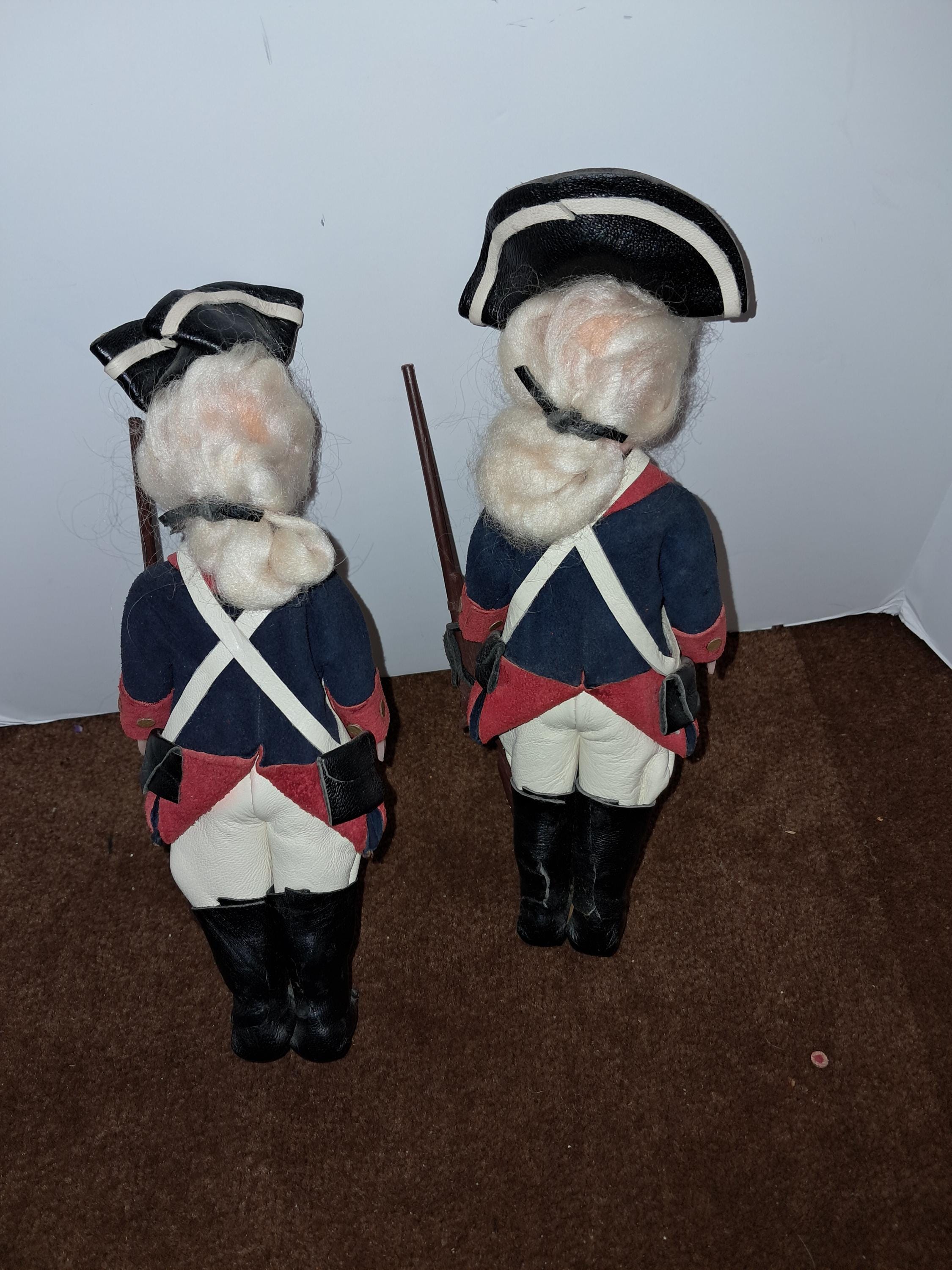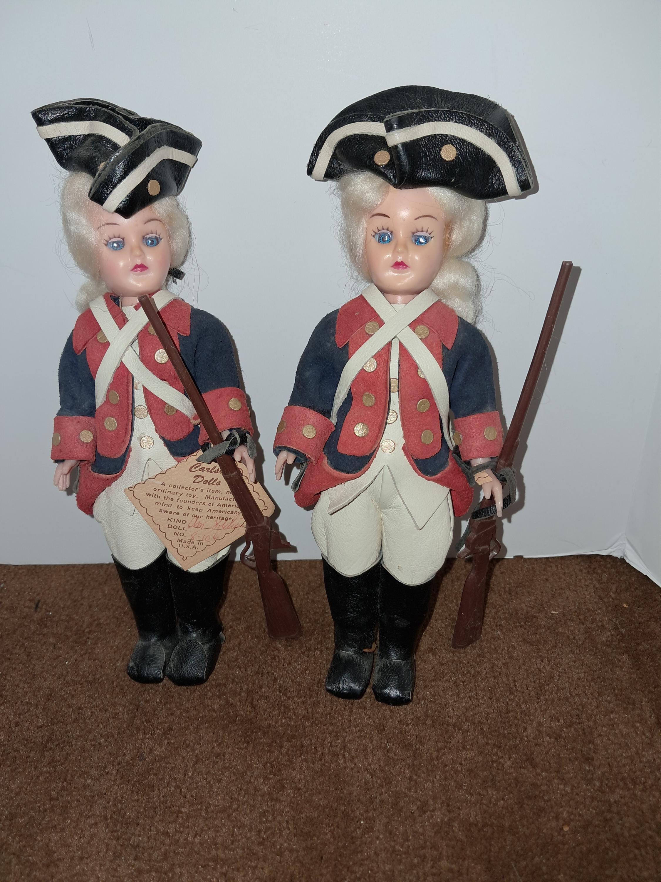Two Carlson Revolutionary, Colonial Dolls 8.5" tall x 3" wide x 1" deep Excellent Vintage Condition Leather Outfit Eyes open and closes