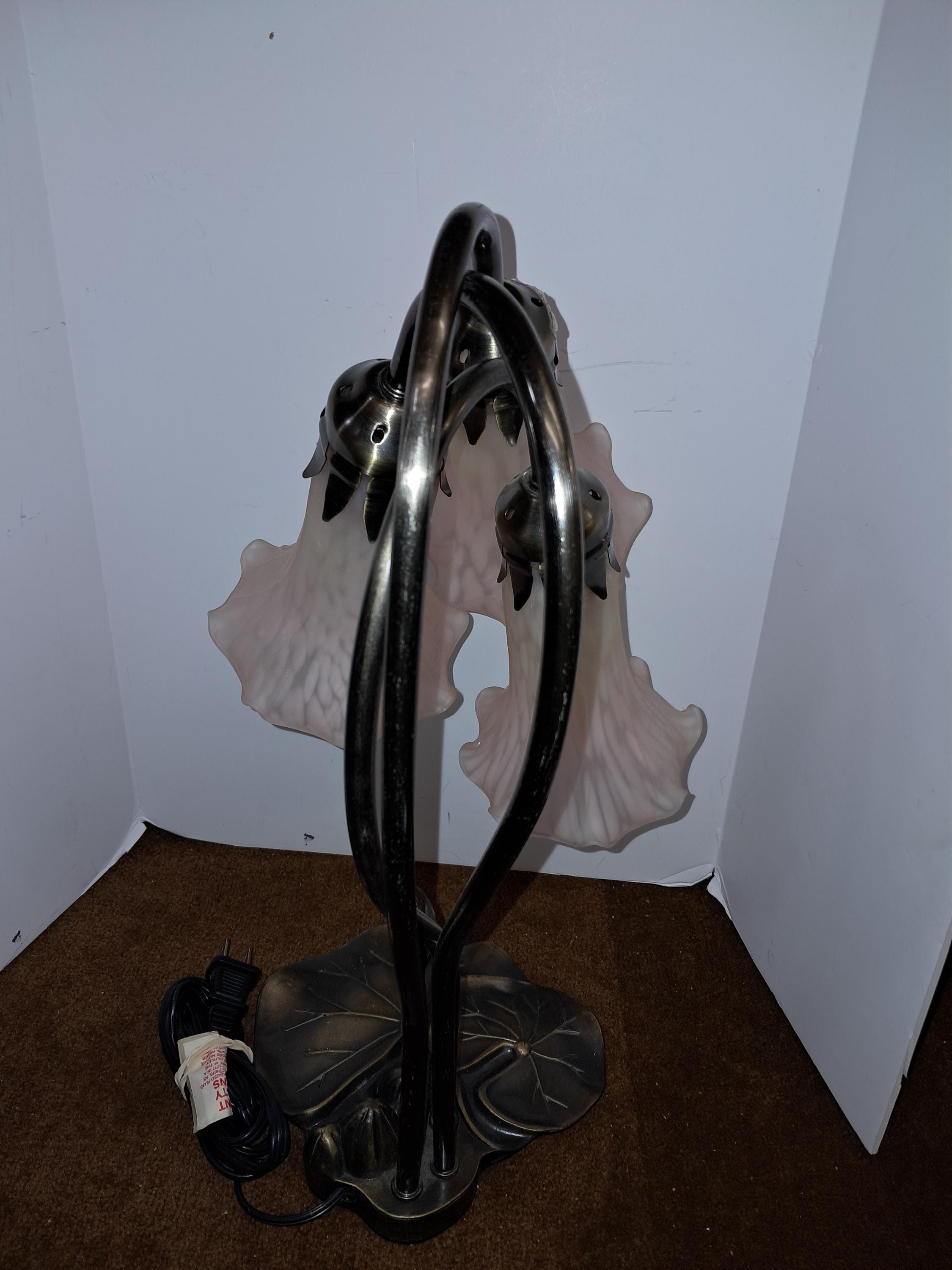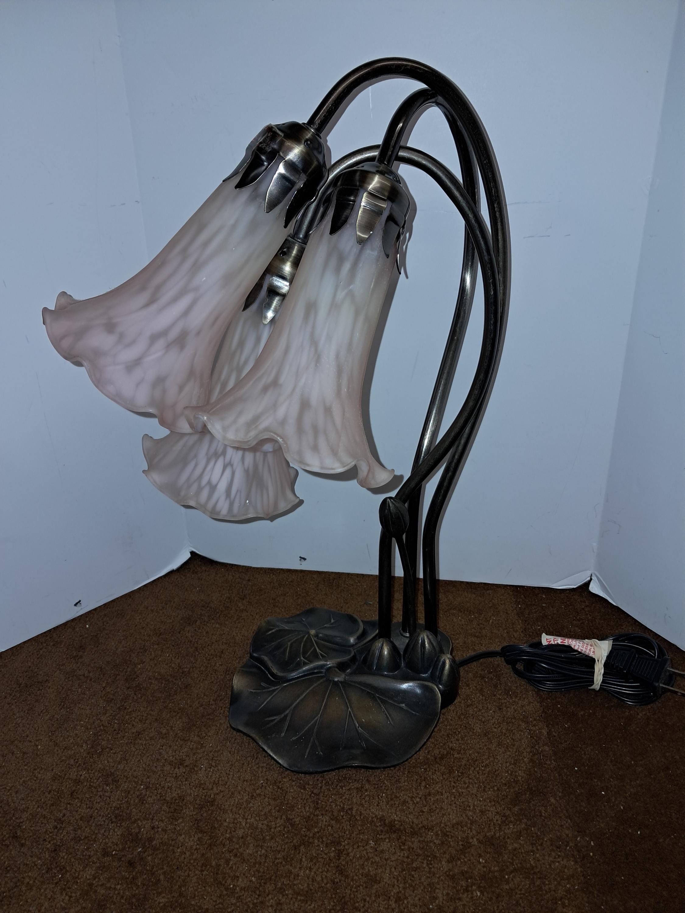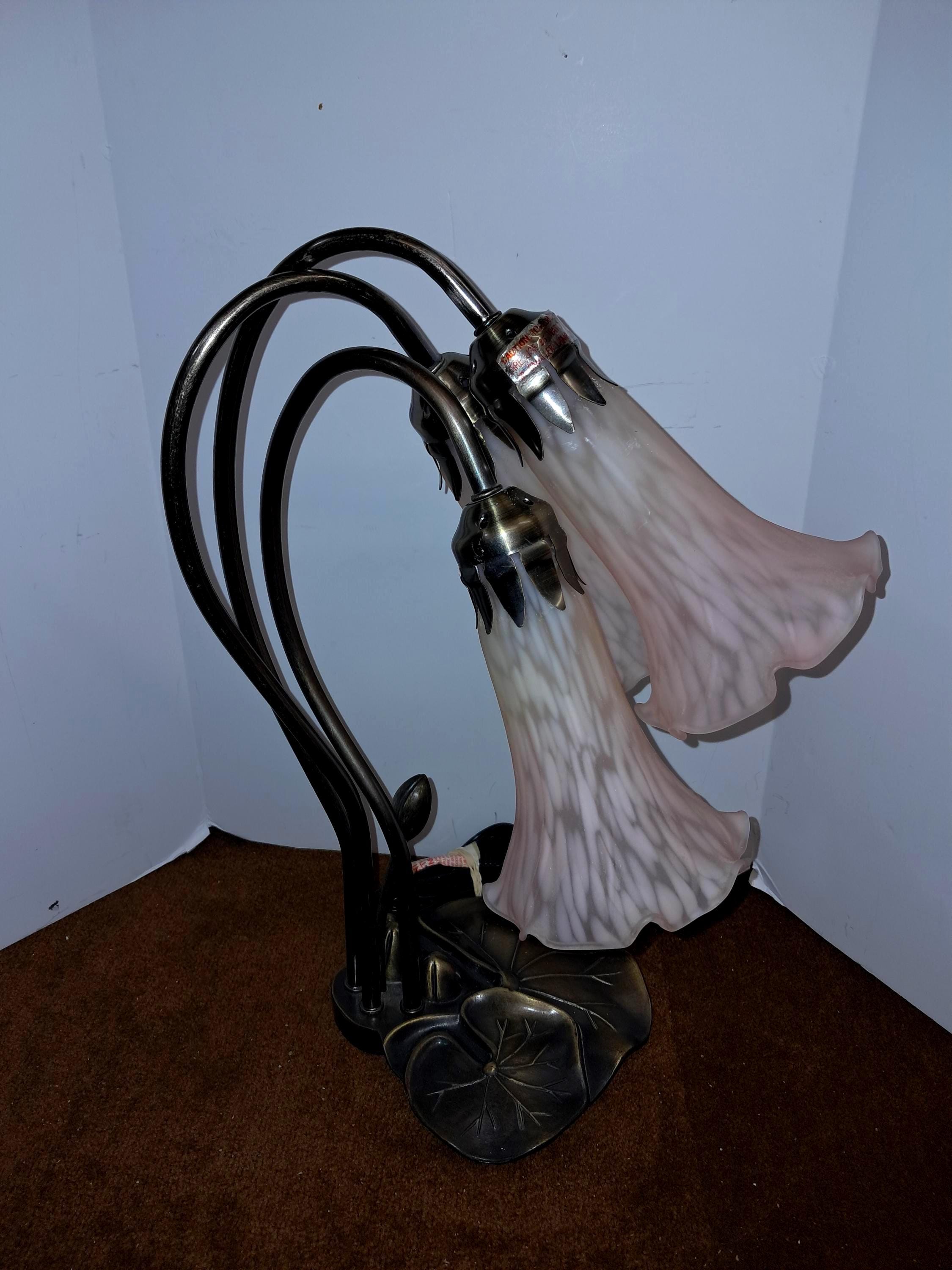 Recreating the famous Tiffany design from the early 1900s... This table lamp features three stunning Pink and Clear Design art glass shades that are embraced by an elegant Cast Metal Base featuring a rich Mahogany finish. The Pond Lily Table Lamp is included in our American designed; handcrafted Tiffany Reproduction Favrile Glass Lighting Collection. Each shade is a unique work of art with color variations based on natural ingredients inherent in the glass.