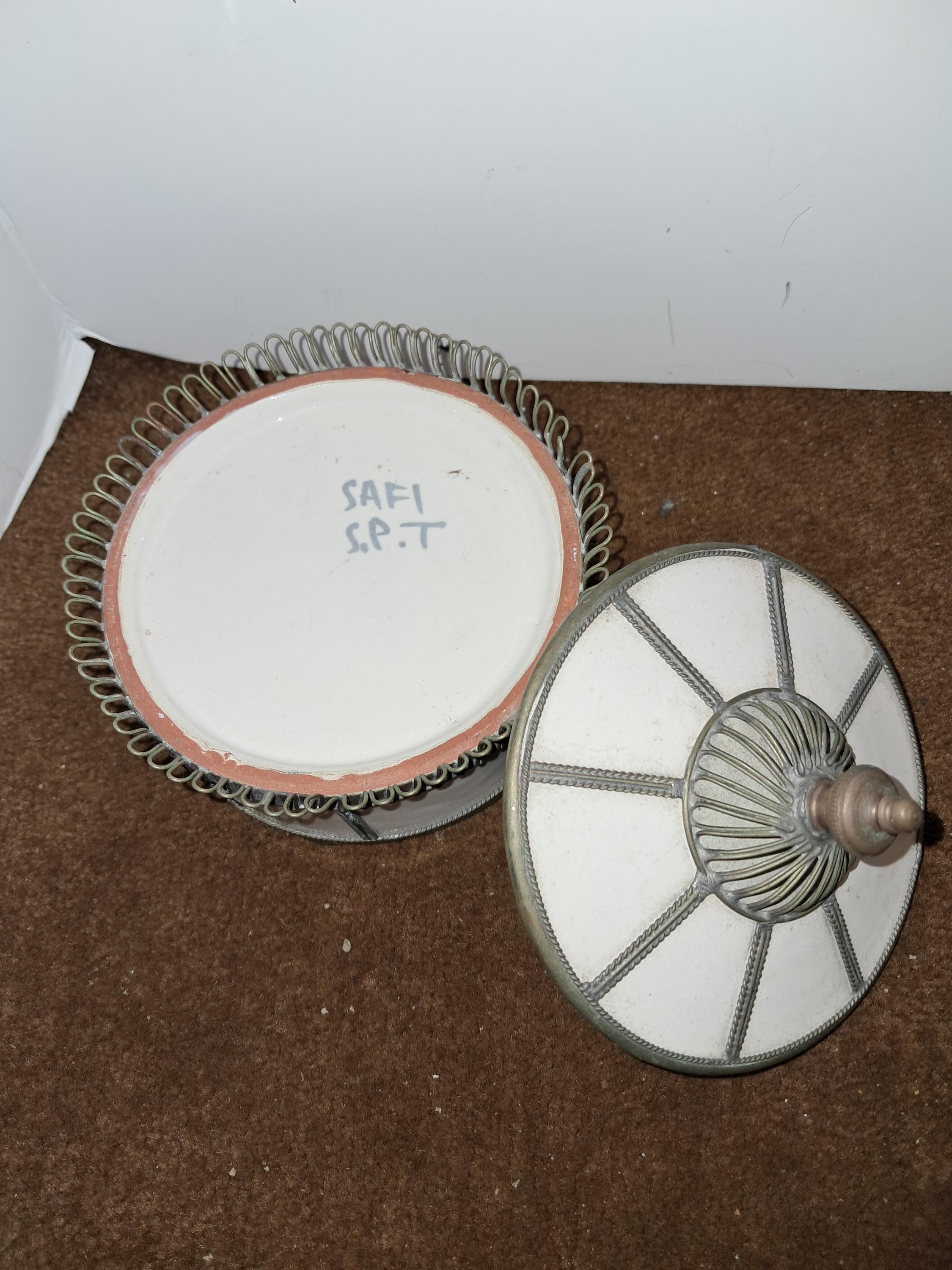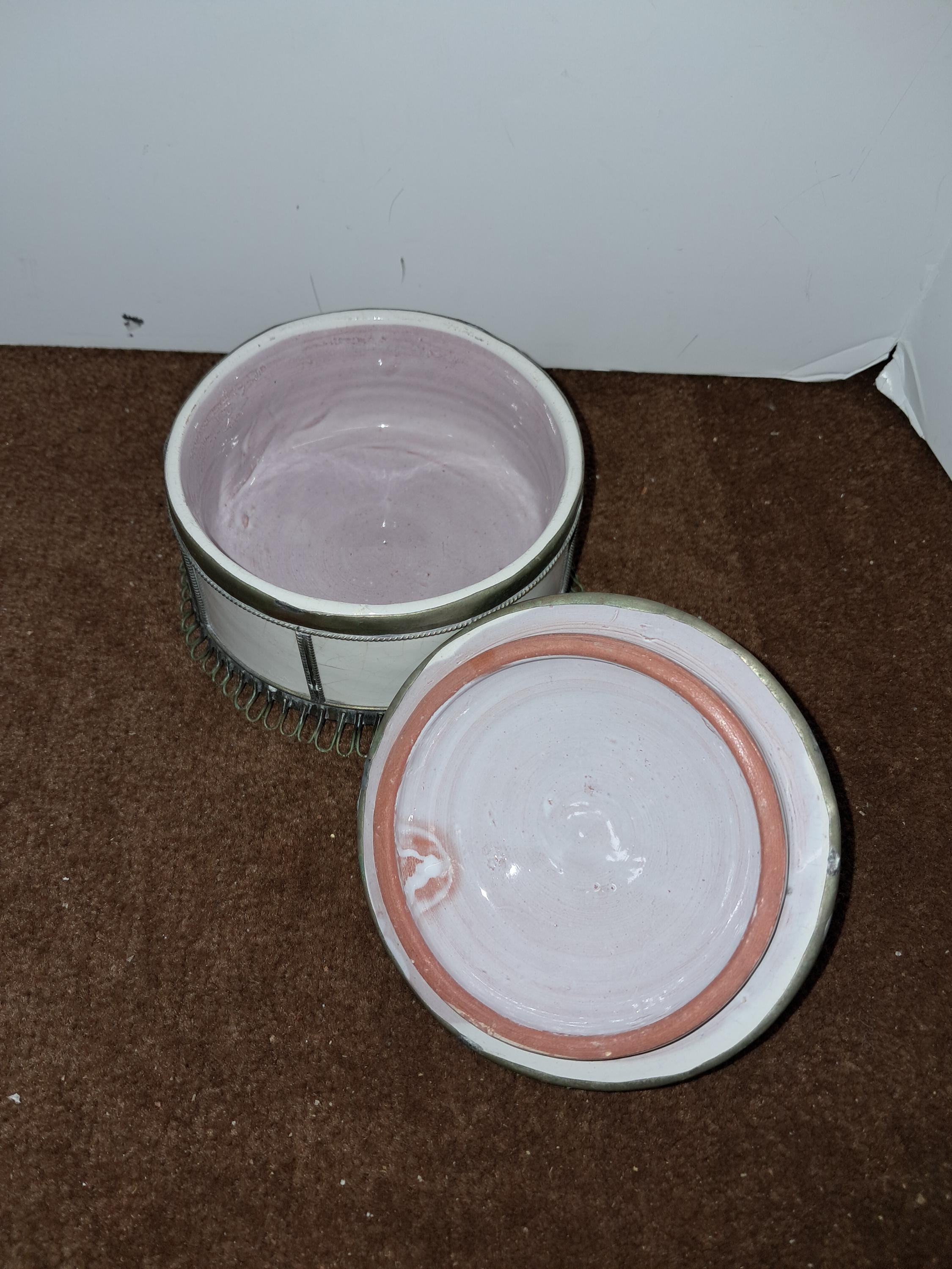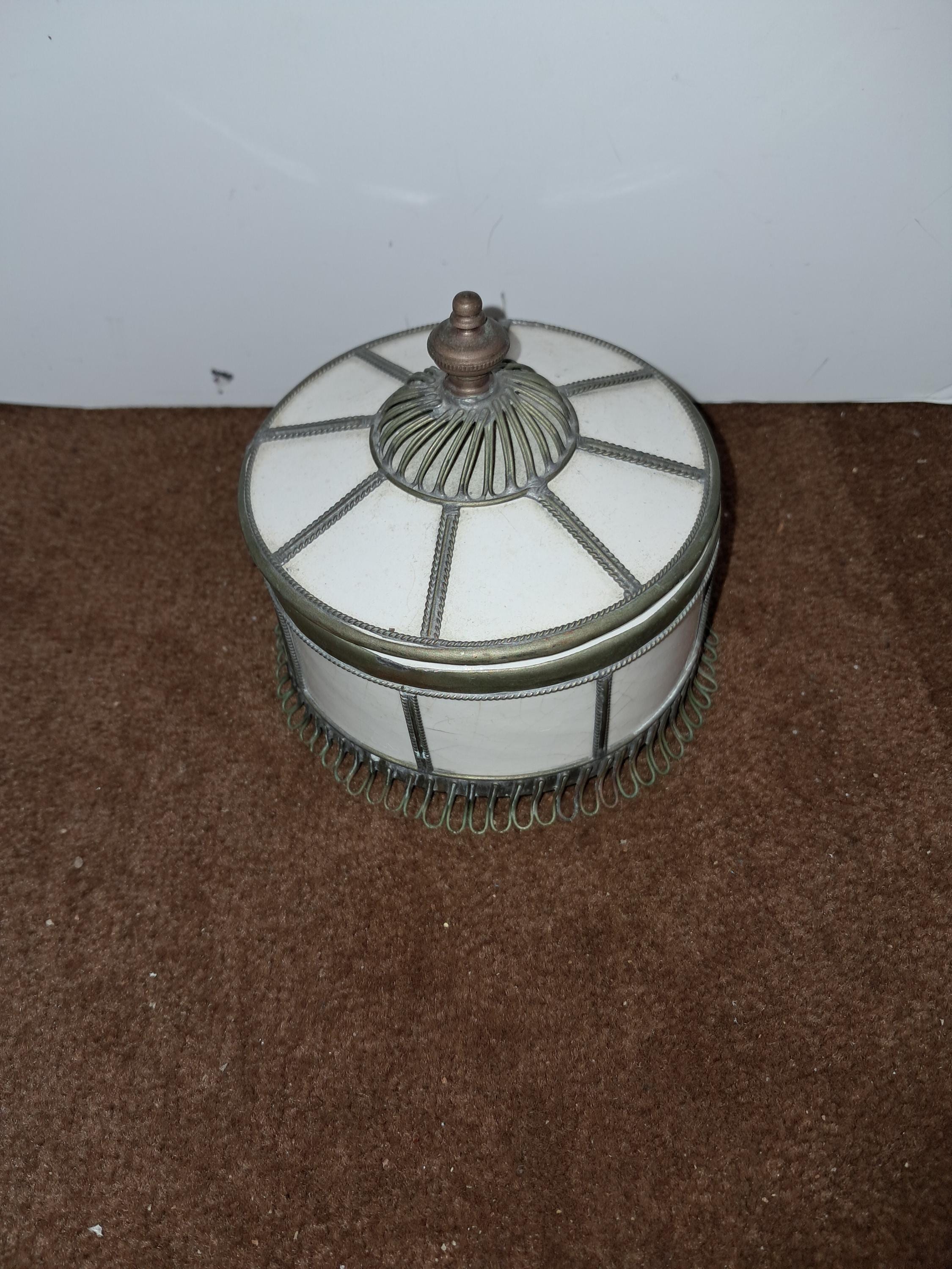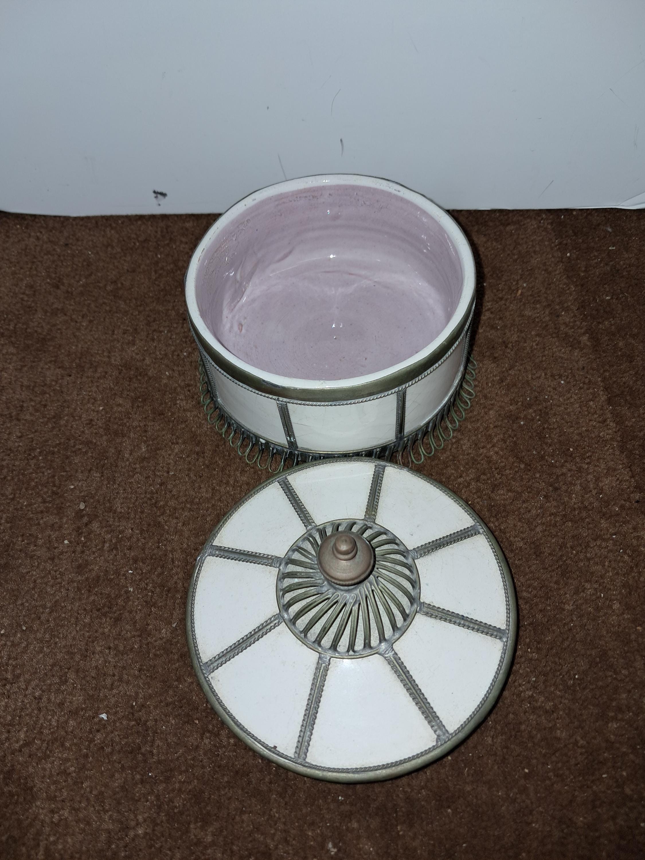 Vintage Porcelain Trinket Powder Box With Metal Trimming3.5" TALL X 4.5" WIDE X 4" DEEPMade In Italy. Circa 1960's Estate Sale FindExcellent Vintage Condition with no damages