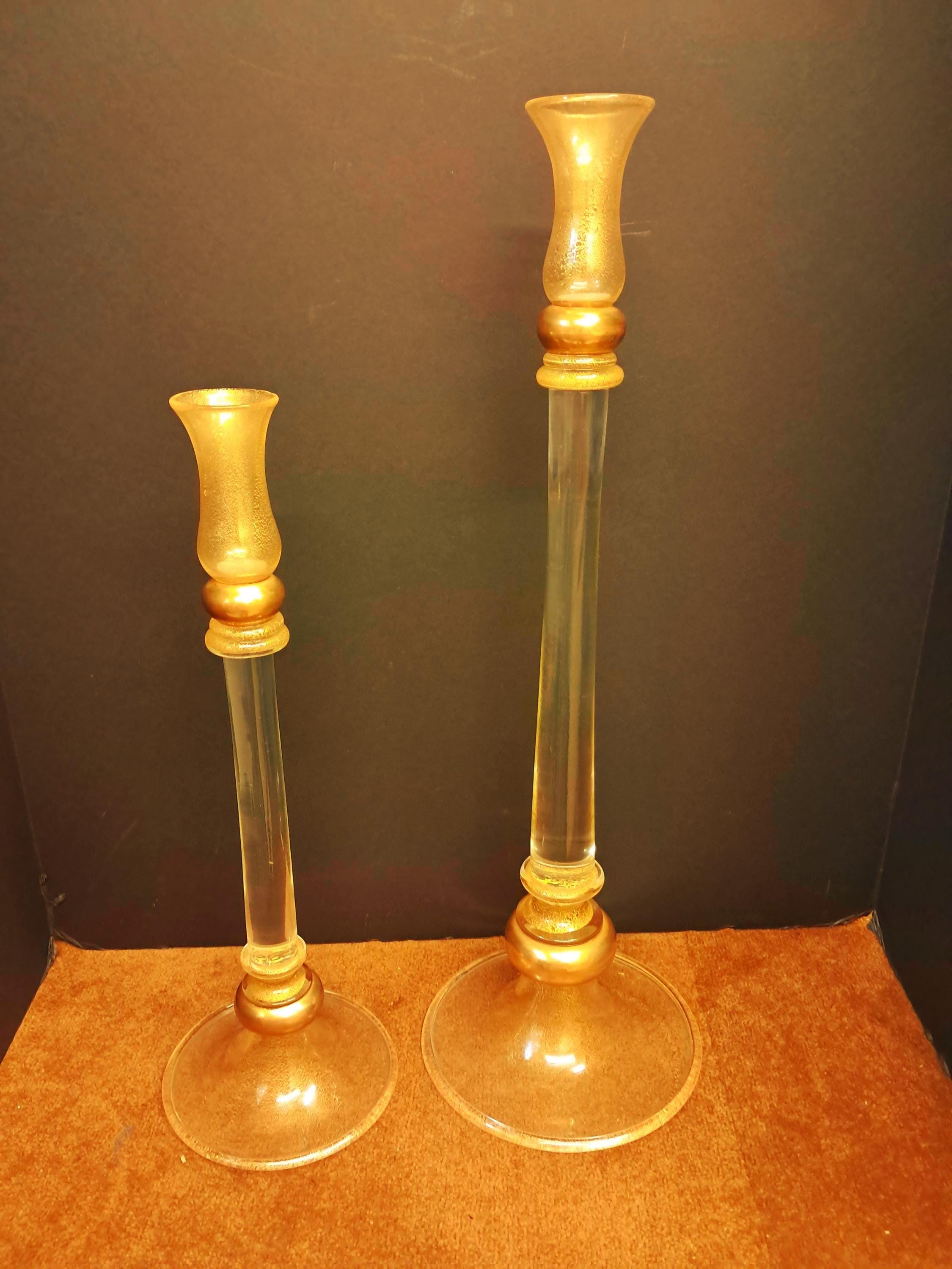 Monumental, tall and huge ensemble, group or set of colored Italian Murano glass candlestick holders by Seguso Vetri D'Arte. Beautiful craftsmanship and stunning color - clear glass all with gold dust fleck inclusions. Incredibly rare to come across such large examples